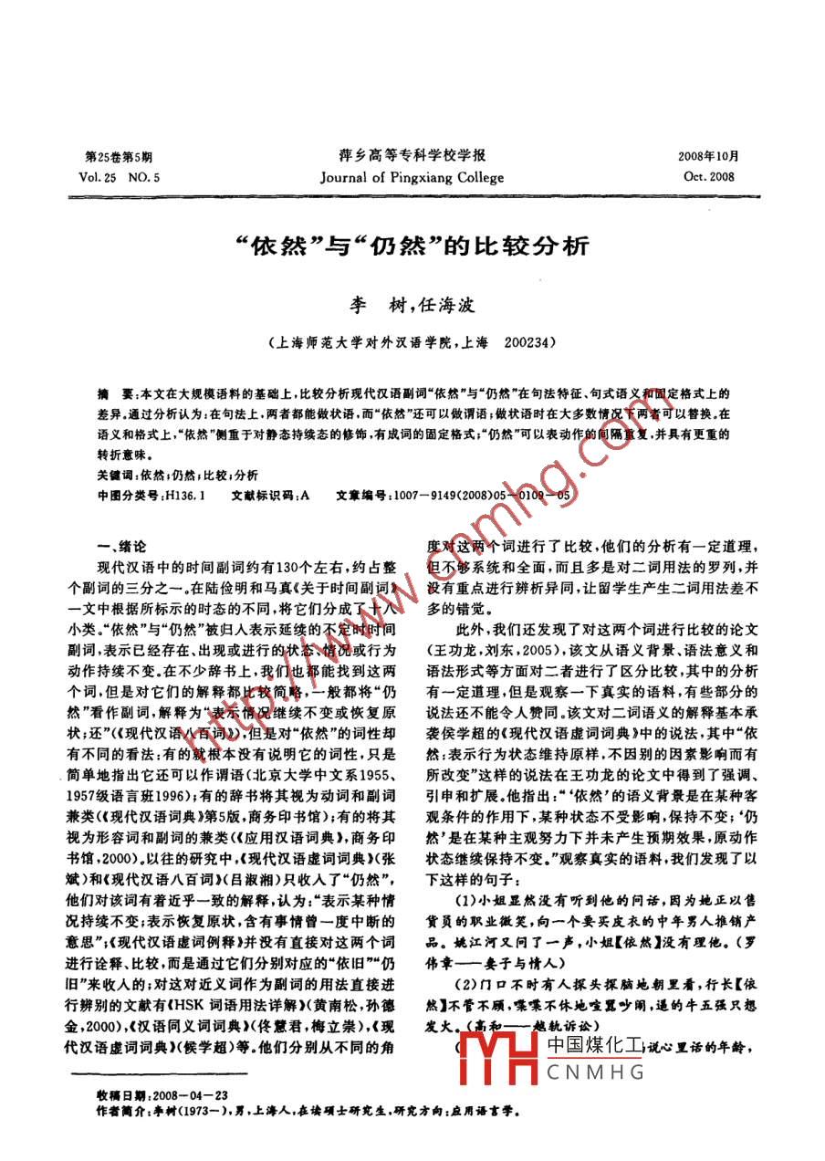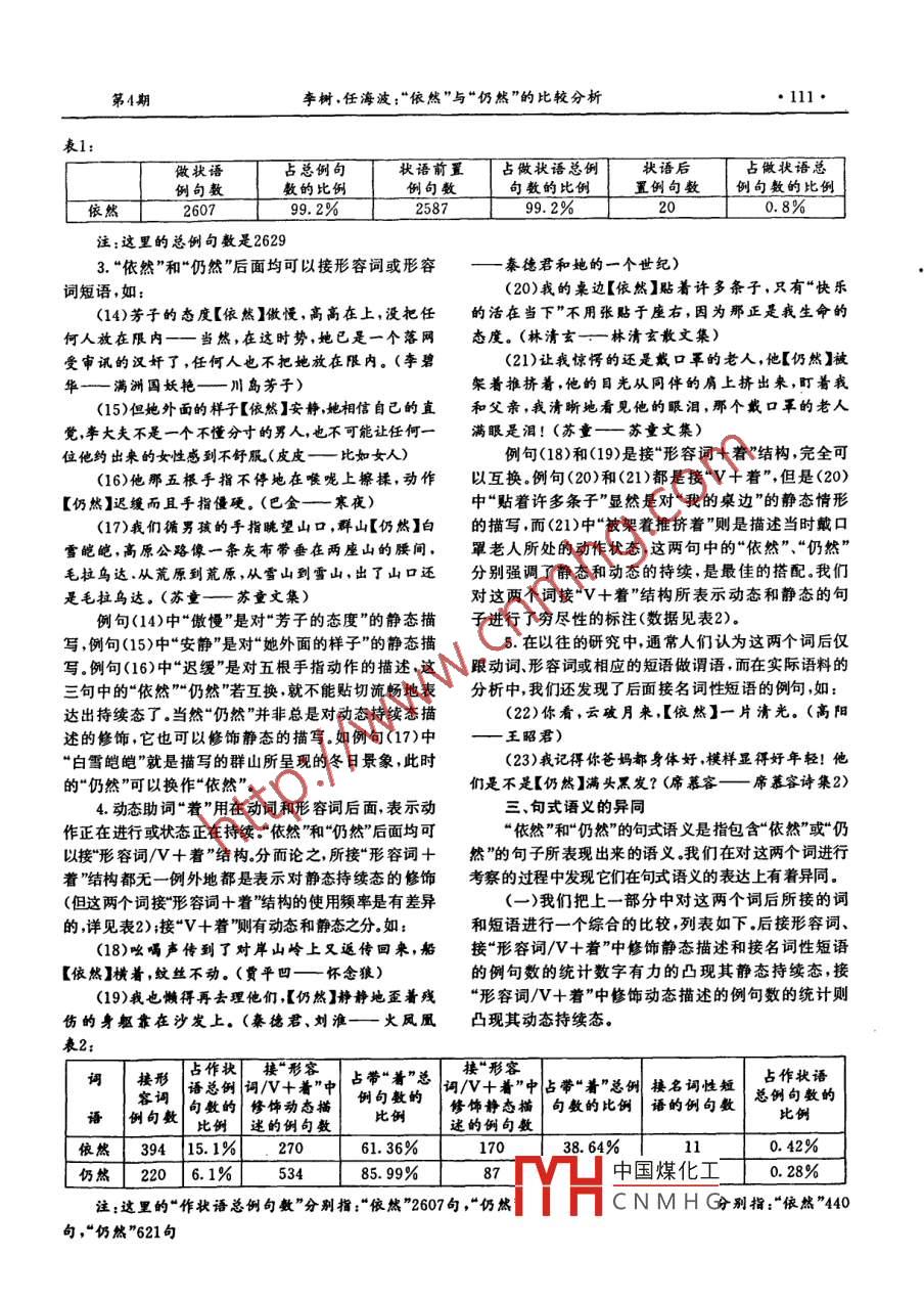 第25卷第5期萍鄉(xiāng)高等??茖W(xué)校學(xué)報2008年10月Vol. 25 NO. 5Journal of Pingxiang CollegeOct.2008“依然”與“仍然”的比較分析李樹,任海波(上海師范大學(xué)對外漢語學(xué)院,上海200234)摘要:本文在大規(guī)模語料 的基礎(chǔ)上,比較分析現(xiàn)代漢語副詞“依然"與“仍然”在句法特征.句式語義和固定格式上的差異.通過分析認(rèn)為:在句法上。兩者都能做狀語,而“依然”還可以做謂語;做狀語時在大多數(shù)情況下兩者可以答換.在語義和格式上,“依然”側(cè)重于對靜態(tài)持續(xù)態(tài)的修飾,有成詞的固定格式;“仍然”可以表動作的間隔重復(fù),并具有更重的轉(zhuǎn)折意味。關(guān)鍵詞:依然;仍然;比較;分析中圈分類號;H136.1文獻(xiàn)標(biāo)識碼:A文章編 號:1007-9149(2008)05 -0109- 05一.緒論度對這兩個詞進(jìn)行了比較,他們的分析有- -定道理, .現(xiàn)代漢語中的時間副詞約有130個左右,約占整但不夠系統(tǒng)和全面,而且多是對二詞用法的羅列,并個副詞的三分之一在陸儉明和馬真《關(guān)于時間副詞》沒有重點(diǎn)進(jìn)行辨析異同,讓留學(xué)生產(chǎn)生二詞用法差不.-文中根據(jù)所標(biāo)示的時態(tài)的不同,將它們分成了十八多的錯覺。小類.“依然”與“仍然”被歸人表示延續(xù)的不定時時間此外,我們還發(fā)現(xiàn)了對這兩個詞進(jìn)行比較的論文副詞,表示已經(jīng)存在、出現(xiàn)或進(jìn)行的狀態(tài)、情況或行為(王功龍,劉東,2005),該文從語義背景、語法意義和動作持續(xù)不變.在不少辭書上,我們也都能找到這兩語法形式等方面對二者進(jìn)行了區(qū)分比較,其中的分析個詞,但是對它們的解釋都比較簡略,一般都將“仍有一定道理,但是觀察一下真實(shí)的語料,有些部分的然”看作副詞,解釋為“表示情況繼續(xù)不變或恢復(fù)原說法還不能令人贊同.該文對二詞語義的解釋基本承狀;還"《現(xiàn)代漢語八百詞》) ,但是對“依然”的詞性卻襲侯學(xué)超的《現(xiàn)代漢語虛詞詞典)仲的說法,其中“依有不同的看法:有的就根本沒有說明它的詞性,只是然:表示行為狀態(tài)維持原樣,不因別的因素影響而有簡單地指出它還可以作謂語(北京大學(xué)中文系1955.所改變”這樣的說法在王功龍的論文中得到了強(qiáng)調(diào)、1957級語言班1996);有的辭書將其視為動詞和副詞引申和擴(kuò)展。他指出:“‘依然'的語義背景是在某種客兼類(現(xiàn)代漢語詞典}>第5版,商務(wù)印書館);有的將其觀條件的作用下,某種狀態(tài)不受影響,保持不變;‘仍視為形容詞和副詞的兼類(《應(yīng)用漢語詞典),商務(wù)印然'是在某種主觀努力下并未產(chǎn)生預(yù)期效果,原動作書館,2000).以往的研究中,《現(xiàn)代漢語虛詞詞典>(張狀態(tài)繼續(xù)保持不變.”觀察真實(shí)的語料,我們發(fā)現(xiàn)了以.斌)和(現(xiàn)代漢語八百詞)(目淑湘)只收入了“仍然”,下這樣的句子:他們對該詞有著近乎一致的解釋,認(rèn)為:“表示某種情(1)小姐顯然沒有聽到他的問話,因?yàn)樗允蹧r持續(xù)不變;表示恢復(fù)原狀,含有事情曾一度中斷的貨員的職業(yè)微笑,向一個要買皮衣的中年男人推銷產(chǎn)意思”;《現(xiàn)代漢語虛詞例釋>并沒有直接對這兩個詞品。姚江河又問了一聲,小姐[依然]沒有理他。(羅進(jìn)行詮釋、比較,而是通過它們分別對應(yīng)的“依舊”“仍偉章一- 妻子與情人)舊”來收人的;對這對近義詞作為副詞的用法直接進(jìn)(2)門口不時有人探頭探腦地朝里看,行長[依行辨別的文獻(xiàn)有(HSK詞語用法詳解>(黃南松,孫德然]不管不顧,喋喋不休地喧囂吵鬧,逼的牛五強(qiáng)只想金,2000) ,《漢語同義詞詞典)(佟慧君,梅立崇),《現(xiàn)發(fā)火。(高和一-越軌訴訟)代漢語虛詞詞典)(侯學(xué)超)等.他們分別從不同的角中國煤化工說心里話的年齡,YHCNMHG收稿日期:2008-04-23作者簡介:事樹(1973-),男,上海人,在讀碩士研究生.研究方向:應(yīng)用語言學(xué). .●110.萍鄉(xiāng)高等??茖W(xué)校學(xué)報2008年尹初石[仍然]把自己遇到的事情說給媽媽聽,地從不于“依”的動作性不強(qiáng),上述意義在句中可虛化為介多加評論,有時挖苦兩句,有時開個捉弄幾子的小玩詞。由介詞“依”和助詞“然”復(fù)合而成,約始見于漢代,笑,大部分時間是聽兒子說。(皮皮一渴望激情 )后世沿用(《古代漢語虛詞詞典》商務(wù)印書館1999)。(4)原來他竟是真的愛我。不論他身邊有沒有其而有的辭書認(rèn)為“它此時的詞性是動詞,指和原來一他的女人,他[仍然]把自己的一切都交給了我,我是樣”《現(xiàn)代漢語詞典》第5版),這樣的處理是否妥當(dāng),他今生今世的妻。(葉傾城--原 配)仍有待商榷。例(1)中的“又問了一聲”希望得到售貨員答理的(二)在我們的真實(shí)文本語料中,“依然”的例句中預(yù)期效果,結(jié)果是“依然沒有理他";例(2)“有人探頭99.2%都是作狀語(見表1),“仍然”所充當(dāng)?shù)木浞ǔ商侥X地朝里看”,希望行長能收斂些,降低吵鬧聲,可分總是狀語,所以,這兩個詞的副詞特征表現(xiàn)得十分結(jié)果還是“依然不管不顧”。按照王功龍的論文,這兩充分.因此,我們考察這兩者的句法特征,主要是要考個例句恰恰是體現(xiàn)的“仍然”的語義背景。例(3)中“在察它們作狀語的位置和與其他詞語、短語一起使用的男孩兒長