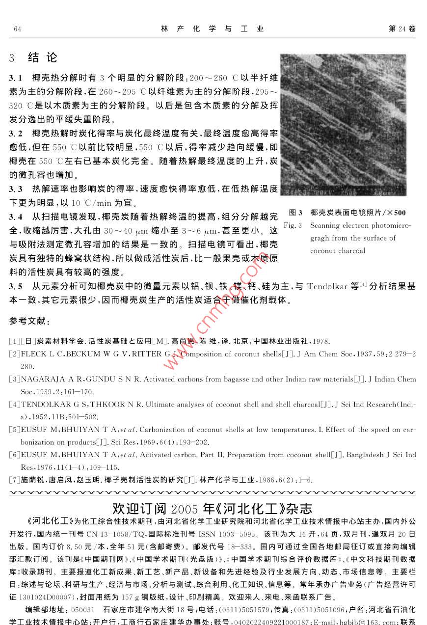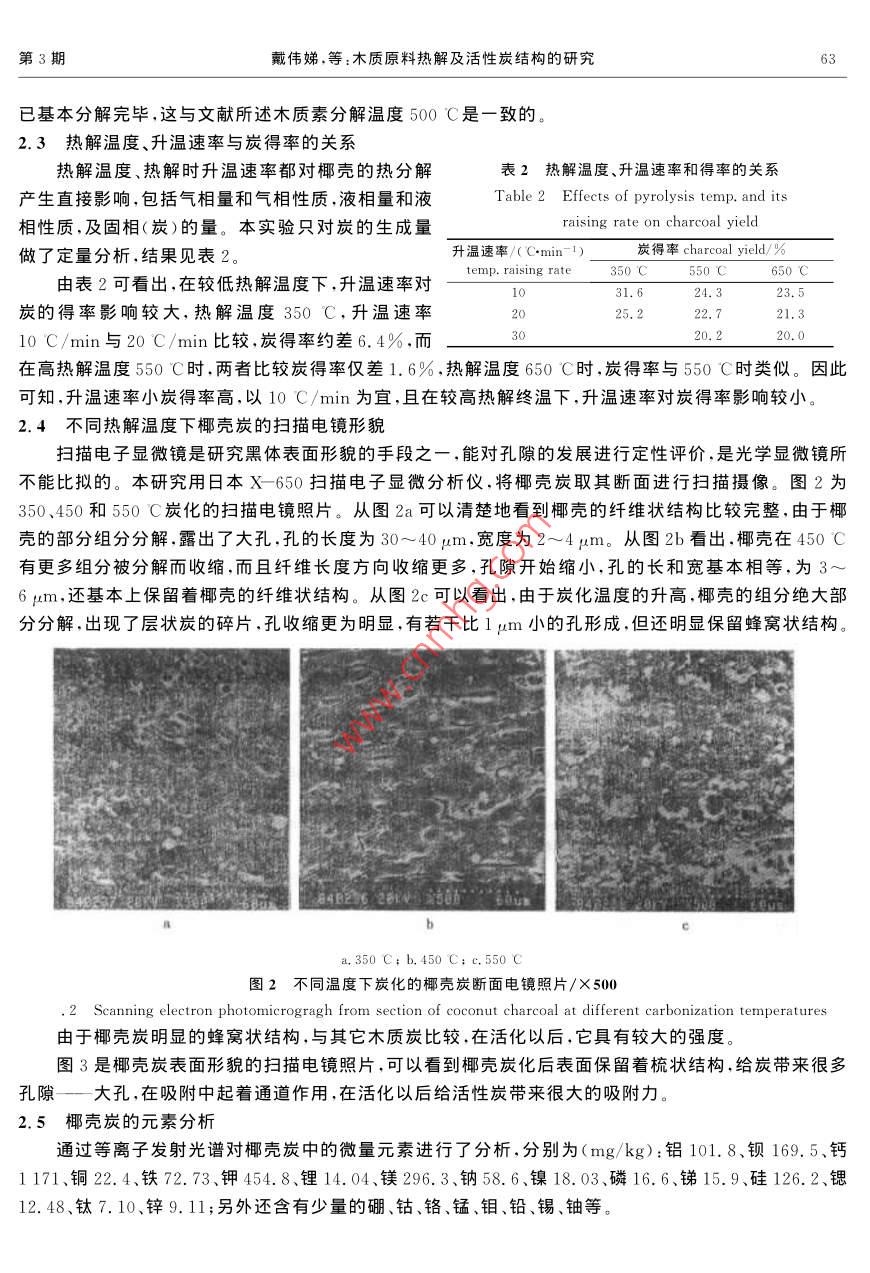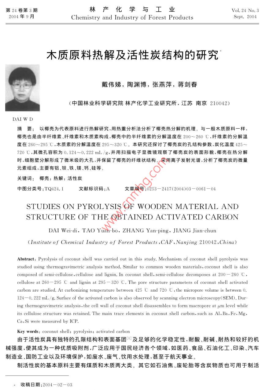 第24卷第3期林產(chǎn)化學(xué)與工業(yè)VoL 24 No. 32004年9月Chemistry and industry of forest productsSept. 2004木質(zhì)原料熱解及活性炭結(jié)構(gòu)的研究戴偉娣,陶淵博,張燕萍,蔣劍春(中國林業(yè)科學(xué)研究院林產(chǎn)化學(xué)工業(yè)研究所,江蘇南京210042)DAI WD摘要:以椰殼為代表原料進(jìn)行熱解研究,用熱重分析法分析了椰殼熱分解的機(jī)理。與一般木質(zhì)原料一樣,椰殼也是由半纖維素、纖維素和木質(zhì)素構(gòu)成,椰殼中的半纖維素的分解溫度在200~260C,纖維素的分解溫度在260~295℃,木質(zhì)素的分解溫度在295~320℃。本研究還探討了椰殼炭的孔結(jié)構(gòu)參數(shù),炭化溫度42520℃,其微孔容積為0.124~0.222mL/g,并用掃描電子顯微鏡觀察了椰殼炭的表面形貌,椰殼在熱分解時,細(xì)胞壁分解形成了微米級的大孔,并保留了椰殼的纖維狀結(jié)構(gòu)。采用離子發(fā)射光譜,分析了椰殼炭的微量元素組成,主要有鋁、鋇、鐵、鎂、鈣、硅等關(guān)鍵詞:椰殼;熱解;活性炭中圖分類號:TQ424.1文獻(xiàn)標(biāo)識碼:A文章編號:0253-2417(2004)03-0061-04STUDIES ON PYROLYSIS OF WOODEN MATERIAL ANDSTRUCTURE OF THE OBTAINED ACTIVATED CARBONDAI Wei-di, TAO Yuan-bo, ZHANG Yan-ping, JIANG Jian-chun(Institute of Chemical Industry of Forest Products, CAF, Nanjing 210042. China)Abstract: Pyrolysis of coconut shell was carried out in this study. Mechanism of coconut shell pyrolysis wasstudied using thermogravimetric analysis method. Similar to common wooden materials, coconut shell is alsocomposed of semi-cellulose, cellulose and lignin. In coconut shell, semi-cellulose decomposes at 200-260 Ccellulose at 260--295 C and lignin at 295-320 C. The pore structure parameters of coconut shell activatedcarbon are studied. At carbonizing temperature between 425 C and 720 C. the micropore volume is between 0.124-0. 222 mL /g Surface of the activated carbon is also observed by scanning electron microscopy(SEM). Dur-ing thermogravimetric analysis, the cell wall of coconut shell disassembles to form macropore at um level whileits cellulose structure was retained. The main trace elements in coconut shell carbon, such as Al, Ba Fe. MgCa, Si were measured by ICPKey words: coconut shell; pyrolysis; activated carbon由于活性炭具有獨特的孔隙結(jié)構(gòu)和表面基團(tuán)及足夠旳化學(xué)穩(wěn)定性,耐酸、耐堿、耐熱和較好的機(jī)械強(qiáng)度,使其成為一種優(yōu)質(zhì)吸附劑廣泛應(yīng)用于國民經(jīng)濟(jì)各個領(lǐng)域,如醫(yī)藥、食品、石油化工、印染、汽車制造業(yè)、國防工業(yè)以及環(huán)境保護(hù),如廢水、廢氣、飲用水處理,甚至于航天事業(yè)。制活性炭的基本原料主要有煤質(zhì)和木質(zhì)兩大類。其它如石油焦、廢輪胎等含炭物質(zhì)也可用于制活收稿日期:2004-02-03林產(chǎn)化學(xué)與工業(yè)第24卷性炭。木質(zhì)活性炭的主要原料為木炭按生產(chǎn)方法和原料不同可分為物理法和化學(xué)法2種,化學(xué)法用木屑可生產(chǎn)粉狀炭,用果殼、果核可生產(chǎn)不定型顆?;钚蕴?。在果殼中又以椰殼為上等原料,其次為欖核、杏核等印度、巴基斯坦、菲律賓、斯里蘭卡、泰國、越南等國~以及我國海南島盛產(chǎn)椰子,椰子的汁用于生產(chǎn)飲料,椰肉廣泛用于制造食品,椰殼除小部分用于制作工藝品外,大部分用于制造活性炭,所以椰殼是用之不竭的活性炭原料。椰殼是一種優(yōu)質(zhì)活性炭原料,椰殼活性炭具有岀色的吸附性能。本研究以椰殼為原料,對其熱解(炭化)進(jìn)行了熱重分析研究,并對炭的結(jié)構(gòu)及元素進(jìn)行了分析。1實驗部分實驗設(shè)備:熱解實驗在ASR711熱重天平上進(jìn)行,靈敏度為0.1mg。將粉碎成一定粒度的椰殼約7o0mg置于鉑吊藍(lán)內(nèi),加熱條件由程序控制,加熱時通N2氣保護(hù),當(dāng)達(dá)到溫度后,自動保溫直到恒重,熱重天平示意圖見文獻(xiàn)[7];孔徑孔容分布由AS703孔徑分布儀測定,以甲醇為吸附質(zhì),修正開爾文方程計算孔徑孔容分布;不同溫度下的椰殼炭化料的表面形態(tài),由日本產(chǎn)Ⅹ-650掃描電鏡分析;椰殼炭的微量元素用等離子發(fā)射光譜進(jìn)行分析。2結(jié)果和討論溫度/℃02004006008002.1椰殼熱分解的機(jī)理木質(zhì)原料一般由半纖維素、纖維素和木質(zhì)素構(gòu)成。木材熱630℃分解一般認(rèn)為最激烈的分解溫度如下:半纖維素180~300℃,纖維素240~400℃,木質(zhì)素280~500℃。本研究中的椰殼在熱重天平上的熱分解過程中的分解行為如圖1所示(升溫速率2.33C/min,熱解終溫630C,恒溫3h)由圖1可以看出椰殼熱分解分為3個階段:室溫→A點320℃295℃120℃為干燥階段,A→B點120~200℃為恒重階段,B→C點200~260℃(虛線部分)為第一熱分解階段,即半纖維素為主的200分解階段;C→D點260~295C為第二階段,即纖維素分解階120℃EDCBA段;D→E點295~320C(虛線部分)為第三分解階段,即以木質(zhì)素為主的分解階段,以后的平緩失重,包含了木質(zhì)素繼續(xù)分解與炭化物中揮發(fā)分的逸出。樣品質(zhì)量/mg2.2熱分解的最終溫度與炭得率、孔容的關(guān)系圖1椰子殼熱重分析圖979年 Brunner等曾詳細(xì)研究過纖維素?zé)岱纸馑俣葘μ康肨hermogravimetric anal率和炭性質(zhì)的影響.由于椰殼是一種組分復(fù)雜的生物質(zhì),它的熱diagram of coconut she分解階段性、炭得率和微孔容積、形貌及其它參數(shù),必然受熱解條件的影響。不同熱解條件下,椰殼熱分解所得炭的得率和微