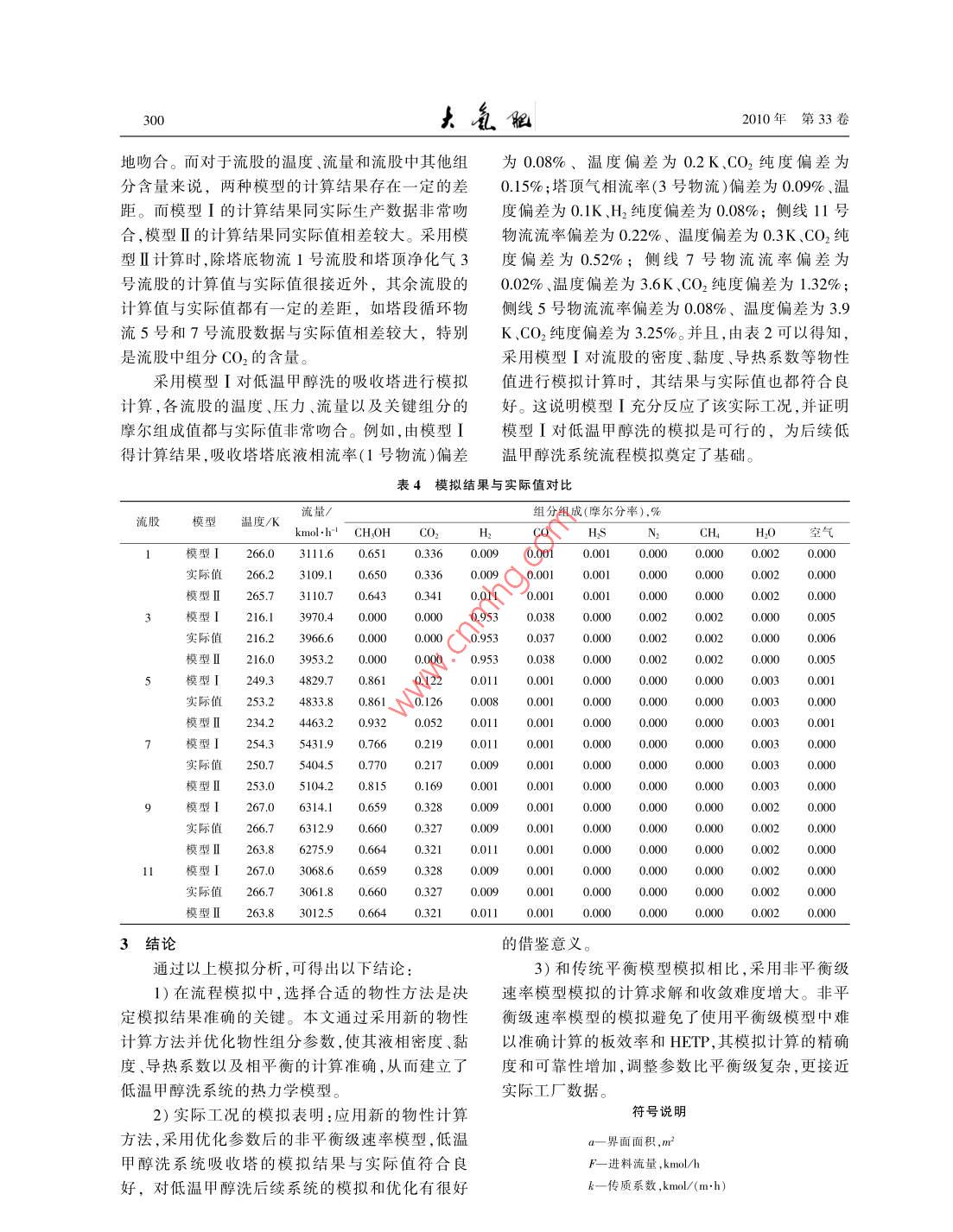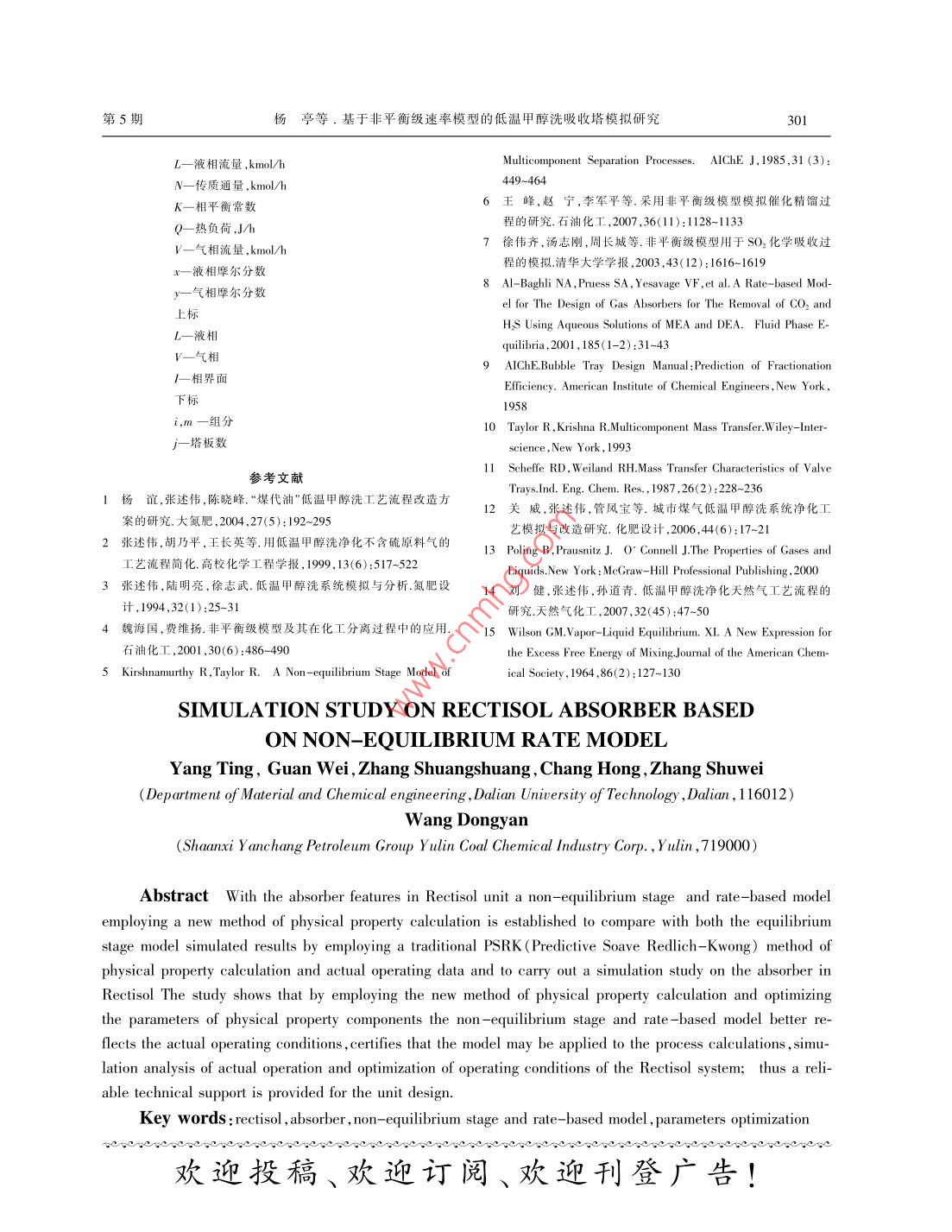 2010年10月Oct 2010第33卷第5期Large Scale Nitrogenous Fertilizer IndustryVol, 33 No5基于非平衡級(jí)速率模型的低溫甲醇洗吸收塔模擬研究楊亭1王東巖2關(guān)威1張雙雙1常虹張述偉1(1.大連理工大學(xué)化工學(xué)院遼寧大連,116012;2陜西延長(zhǎng)石油集團(tuán)榆林煤化公司陜西榆林,719000)摘要針對(duì)低溫甲醇洗吸收塔的特點(diǎn)建立了采用新物性計(jì)算方法的非平衡級(jí)速率模型,與傳統(tǒng)采用PSRK( Predictive soave-Rich- Kwong)物性計(jì)算方法的平衡級(jí)模型模擬結(jié)果和實(shí)際生產(chǎn)數(shù)據(jù)進(jìn)行對(duì)比,對(duì)低溫甲醇洗吸收塔進(jìn)行模擬研究。研究表明:通過(guò)采用新的物性計(jì)算方法并優(yōu)化物性組分參數(shù),非平衡級(jí)速率模型較好地反映了實(shí)際工況,證明該模型可以應(yīng)用于低溫甲醇洗系統(tǒng)的工藝計(jì)算、實(shí)際生產(chǎn)的模擬分析以及操作條件的優(yōu)化,為此裝置設(shè)計(jì)提供可靠技術(shù)支持。關(guān)鍵詞低溫甲醇洗吸收塔非平衡級(jí)速率模型參數(shù)優(yōu)化近年來(lái),隨著我國(guó)煤化工熱潮的掀起,工業(yè)上有收斂速度快適應(yīng)強(qiáng)非理想系物系的特點(diǎn),但對(duì)脫硫脫碳的方法很多,其中冷法以低溫甲醇洗迭代初值有嚴(yán)格的要求,且計(jì)算量大。非平衡級(jí)Rectisol為代表,熱法以聚乙二醇二甲醚法 Selexol速率模型將分離過(guò)程視為一個(gè)速率過(guò)程,取代了工藝最為著名低溫甲醇洗技術(shù)是20世紀(jì)50年平衡過(guò)程,基本假設(shè)是在塔板上氣液相主體并不代由德國(guó)林德公司和魯奇公司共同開(kāi)發(fā)的一種氣處于平衡狀態(tài),相平衡僅存在于氣液相界面處。該體凈化方法,目前全世界共有低溫甲醇洗裝置幾模型直接用傳質(zhì)、傳熱速率方程表征傳遞過(guò)程,從十佘套。低溫甲醇洗工藝凈化方法是一種典型的內(nèi)在的傳遞過(guò)程機(jī)理來(lái)揭示精餾特性,避免使用物理吸收酸性組分的方法,其優(yōu)點(diǎn)如下:吸收能級(jí)效率和等板高度(HETP)等難以確定的量,可更力大,可以同時(shí)脫除HS、CO2等多種有害組分;凈準(zhǔn)確預(yù)測(cè)塔內(nèi)的濃度、流量和溫度分布,為精餾分化度高凈化氣體中含硫量小于0000%,C02含離過(guò)程的設(shè)計(jì)和模擬開(kāi)辟了新的道路們。本文以某量小于000%;吸收選擇性好,低溫時(shí)HS和CO2廠低溫甲醇洗吸收塔實(shí)際生產(chǎn)數(shù)據(jù)為依據(jù),采用在甲醇中的溶解度大,吸收溶液的循環(huán)量小;甲醇非平衡級(jí)速率模型,并采用新的物性計(jì)算方法及的熱穩(wěn)定性和化學(xué)穩(wěn)定性很好,吸收酸性氣體后修正物性組分參數(shù),準(zhǔn)確地模擬了低溫甲醇洗工不發(fā)生降解;在低溫下甲醇黏度小,具有良好的傳藝系統(tǒng)的吸收塔,為該系統(tǒng)的工藝模擬提供了重?zé)岷蛡髻|(zhì)性能。低溫甲醇洗工藝凈化法被廣泛應(yīng)要的技術(shù)支持。用于以渣油或煤為原料的制氨以及城市煤氣化等工業(yè)上,對(duì)該工藝的準(zhǔn)確模擬對(duì)于實(shí)際工廠操作1非平衡級(jí)模型和設(shè)計(jì)至關(guān)重要。速率平衡過(guò)程視為質(zhì)量和熱量的速率傳遞過(guò)長(zhǎng)期以來(lái),化工分離設(shè)備的設(shè)計(jì)與模擬仍以程,雙膜理論被考慮在氣液相之間,平衡條件僅僅平衡級(jí)模型為主,通過(guò)板效率和等板高度對(duì)計(jì)算假設(shè)在它的界面處,膜中的質(zhì)量和熱量計(jì)算需考結(jié)果進(jìn)行校正。而板效率和等板高度這些因素往慮板式塔或填料塔的特點(diǎn)、氣液量負(fù)荷、不同的傳往不能由理論方法確定,使得其用于實(shí)際操作和設(shè)計(jì)時(shí)受到很大限制4。1985年 Kirshnarllurthy等收稿日期:201003-10收到修改稿日期:2010-10-15作者簡(jiǎn)介:楊亭,女,1986年出生,大連理工大學(xué)化T學(xué)院化學(xué)建立了在傳質(zhì)速率方程基礎(chǔ)上的非平衡級(jí)速率模T藝專(zhuān)業(yè)在讀堿士,聯(lián)系電話(huà)011389390m96型,并使用 Newon- RaphSon法進(jìn)行求解,該方法具 newcomen2010年第33卷遞性質(zhì)等}。非平衡級(jí)速率模型假設(shè):①穩(wěn)態(tài)操作;于計(jì)算傳質(zhì)傳熱系數(shù)和相間面積關(guān)系式的計(jì)算方②氣相到達(dá)上一級(jí)前完全混合,液相為全混流;③法正確與否,是決定該塔模擬計(jì)算是否正確的關(guān)在相界面上氣液兩相達(dá)到相平衡;④在每一級(jí)塔鍵。模型中界面面積因子、熱傳遞因子以及滯留比板上傳質(zhì)速率相等。其非平衡級(jí)速率模型建立如例因子需要不斷地調(diào)整。本文對(duì)該吸收塔精餾過(guò)圖1所示。程中的傳質(zhì)系數(shù)計(jì)算采用ACHE(1958)關(guān)聯(lián)式傳熱系數(shù)計(jì)算采用 Chiltion and Colbun0關(guān)聯(lián)式相界面積計(jì)算采用 Scheffe and Weiland關(guān)聯(lián)式r2實(shí)際工況模擬液相21工藝流程典型的低溫甲醇洗流程包括吸收塔、閃蒸罐、汽提塔和甲醇再生塔。其中吸收塔作為低溫甲醇洗系統(tǒng)的核心設(shè)備,承擔(dān)著脫除工藝氣體中H2CO2的任務(wù)。變換氣依次通過(guò)吸收塔的脫硫段和脫碳段,最終H2S和CO2的摩爾分率可滿(mǎn)足如下設(shè)圖1非平衡級(jí)速率模型計(jì)控制指標(biāo):HS含量小于0.0000%,C02含量小非平衡級(