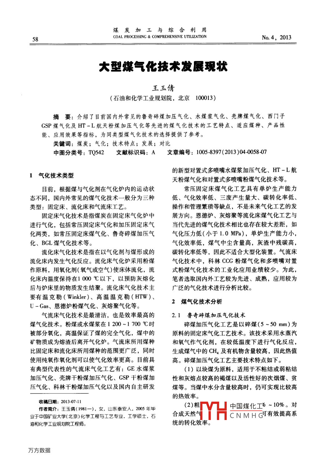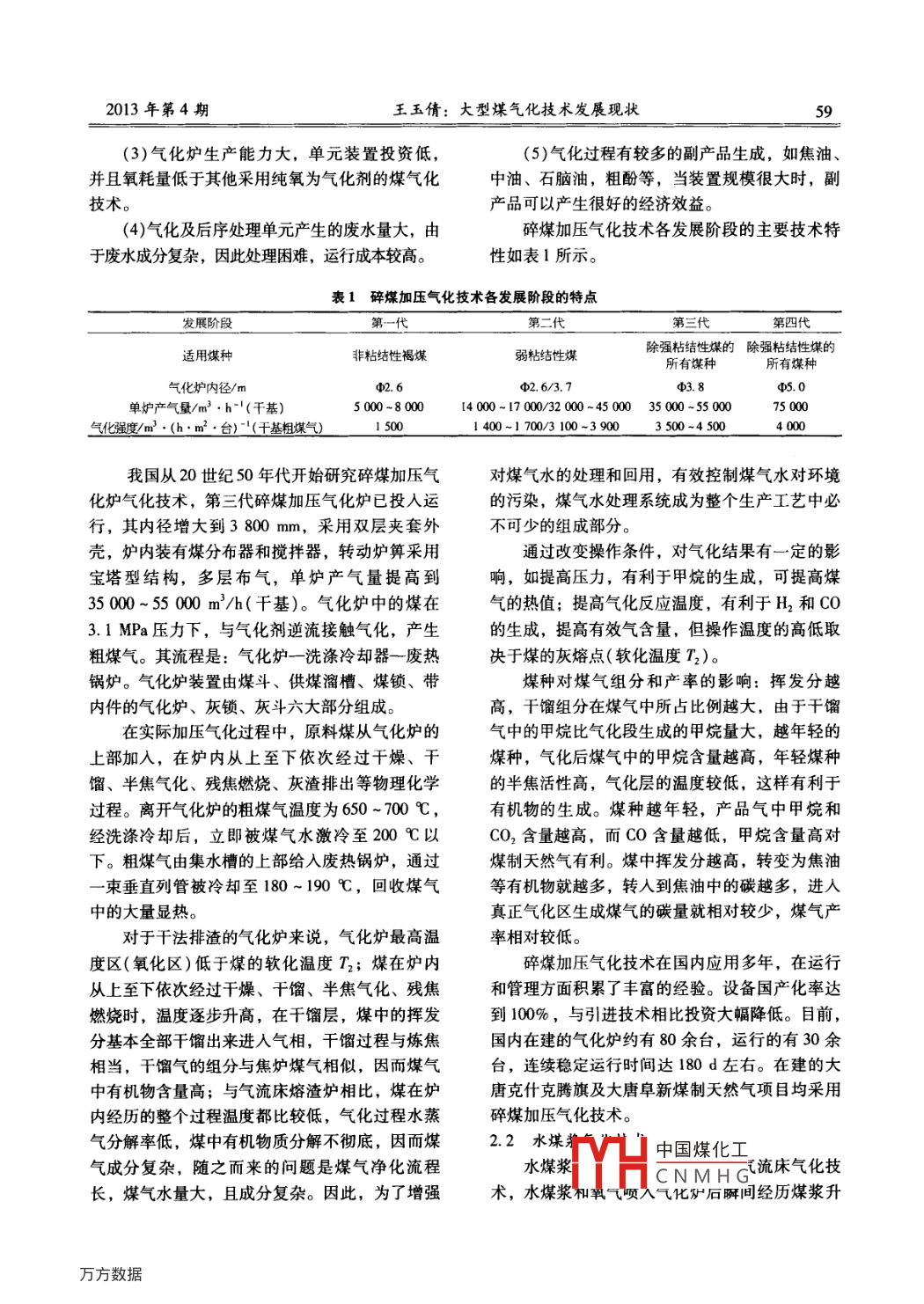 煤炭加工與綜合利用58COAL PROCESSINC & COMPREHENSIVE UTILZATIONNo.4, 2013大型煤氣化技術(shù)發(fā)展現(xiàn)狀王玉倩(石油和化學(xué)工業(yè)規(guī)劃院,北京100013)摘要:介紹了目前國內(nèi)外常見的魯奇碎煤加壓氣化、水煤漿氣化、殼牌煤氣化、西門子GSP煤氣化及HT-L航天粉煤加壓氣化等先進(jìn)的煤氣化技術(shù)的工藝特點(diǎn)、適應(yīng)煤種、產(chǎn)品性能、應(yīng)用效果等指標(biāo),為同類型煤氣化技術(shù)的選擇提供了參考。關(guān)鍵詞:煤炭;氣化;技術(shù)特點(diǎn);發(fā)展;對比中圖分類號(hào): TQ542文獻(xiàn)標(biāo)識(shí)碼: A文章編號(hào): 1005-8397(2013 )04-0058-07的新型對置式多噴嘴水煤漿加壓氣化、HT-L航1氣化技術(shù)類型天粉煤氣化和對置式多噴嘴粉煤氣化技術(shù)等。目前,根據(jù)煤與氣化劑在氣化爐內(nèi)的運(yùn)動(dòng)狀常壓固定床煤氣化工藝具有單爐生產(chǎn)能力態(tài)不同,國內(nèi)外常見的煤氣化技術(shù)- - 般分為三種低、氣化效率低、三廢產(chǎn)生量大、碳轉(zhuǎn)化率低、類型:固定床、流化床和氣流床工藝。操作和管理繁瑣等缺點(diǎn),不是未來氣化工藝的發(fā)固定床氣化技術(shù)是指煤炭在固定床氣化爐中展方向。恩德爐、灰熔聚等流化床煤氣化工藝與進(jìn)行氣化,包括常壓固定床氣化和加壓固定床氣當(dāng)代先進(jìn)的煤氣化技術(shù)相比也存在較大差距,如化兩類,如常壓固定床煤氣化、魯奇碎煤加壓氣氣化壓力低(小于1.0 MPa),單爐生產(chǎn)能力小,化、BGL煤氣化技術(shù)等。氣化效率低,煤氣中塵含量高,灰渣中殘?zhí)几撸骰矚饣夹g(shù)是指在以氣化劑與煤形成的碳轉(zhuǎn)化率低等,因此不適合大型化裝置。氣流床流化床內(nèi)發(fā)生氣化反應(yīng)。流化床氣化爐采用粉煤氣化技術(shù)中,科林CCG粉煤氣化和多噴嘴對置作原料,用氧化劑(氧氣或空氣)使床體流化,流式粉煤氣化技術(shù)的工業(yè)化應(yīng)用業(yè)績較少。為此,化床內(nèi)溫度保持在1 000 C以下,以預(yù)防灰熔化筆者選取國內(nèi)外工藝較為先進(jìn)、成熟,應(yīng)用較為后與爐床里的物質(zhì)發(fā)生結(jié)聚。流化床氣化技術(shù)主廣泛的氣化技術(shù)進(jìn)行分析比較。要有溫克勒( Winkler)、高溫溫克勒( HTW)、2煤氣化技術(shù)分析U- Gas、恩德爐粉煤氣化、灰熔聚氣化等。氣流床氣化技術(shù)是最清潔,也是效率最高的2.1魯奇碎煤加壓 氣化技術(shù)煤氣化技術(shù)。粉煤或水煤漿在1200~1 700 C時(shí)碎煤加壓氣化工藝是以碎煤(5 ~50 mm)為被部分氧化,高溫保證了煤的完全氣化,煤中的原料的固定床氣化工藝技術(shù)。該技術(shù)采用水蒸汽礦物質(zhì)成為熔渣后離開氣化爐。氣流床所用煤種和氧氣作氣化劑,在較低溫度下進(jìn)行氣化反應(yīng),比固定床和流化床所用煤種的范圍更廣泛,同時(shí)生成煤氣中的CH,及有機(jī)物含量較高,因此熱值使用純氧作氧化劑可以使氣化效率更高。目前具高。碎煤加壓氣化工藝主要技術(shù)特點(diǎn)如下。有典型代表性的氣流床氣化工藝有: GE水煤漿(1)以塊煤為原料,適用于不粘結(jié)或弱粘結(jié)加壓氣化、殼牌干粉煤加壓氣化、GSP 干粉煤加性和灰熔點(diǎn)較高的褐煤以及活性好的次煙煤、貧壓氣化、科林干粉煤加壓氣化以及國內(nèi)自主研發(fā)煤等。當(dāng)煤中水分含量較高時(shí),仍可實(shí)現(xiàn)比較高的熱效率。收稿日期: 2013-07-112)粗中國煤化工% ~ 10%。對作者簡介:王玉倩(1981-),女,山東泰安人,2005 年畢合成天然氣CN M H可有效提高系業(yè)于中國礦業(yè)大學(xué)(北京)化學(xué)工程與工藝專業(yè),工學(xué)碩士,石MYH油和化學(xué)工業(yè)規(guī)劃院工程師。統(tǒng)的轉(zhuǎn)化效率。.2013年第4期王玉倩:大型煤氣化技術(shù)發(fā)展現(xiàn)狀59(3)氣化爐生產(chǎn)能力大,單元裝置投資低,(5)氣化過程有較多的副產(chǎn)品生成,如焦油、并且氧耗量低于其他采用純氧為氣化劑的煤氣化中油、石腦油,粗酚等,當(dāng)裝置規(guī)模很大時(shí),副技術(shù)。產(chǎn)品可以產(chǎn)生很好的經(jīng)濟(jì)效益。(4)氣化及后序處理單元產(chǎn)生的廢水量大,由碎煤加壓氣化技術(shù)各發(fā)展階段的主要技術(shù)特于廢水成分復(fù)雜,因此處理困難,運(yùn)行成本較高。性如表1所示。表1碎煤加壓氣化技術(shù)各 發(fā)展階段的特點(diǎn)發(fā)展階段第一代第二代第三代第四代適用煤種非粘結(jié)性褐煤弱粘結(jié)性煤除強(qiáng)粘結(jié)性煤的除強(qiáng)粘結(jié)性煤的所有煤種氣化爐內(nèi)徑/mφ2.62.6/3. 7φ3.8φ5.0單爐產(chǎn)氣量/m2 .h-'(干基)s 008000[4 000-17 00/32000~45000 35 000 ~5500075 000氣化強(qiáng)度/m’.(h.m2 .臺(tái))"(干基粗煤氣)I 5001 400~-1 700/3 100~3 9003500 ~45004 000我國從20世紀(jì)50年代開始研究碎煤加壓氣對煤氣水的處理和回用,有效控制煤氣水對環(huán)境化爐氣化技術(shù),第三代碎煤加壓氣化爐已投人運(yùn)的污染,煤氣水處理系統(tǒng)成為整個(gè)生產(chǎn)工藝中必行,其內(nèi)徑增大到3800 mm,采用雙層夾套外不可少的組成部分。殼,爐內(nèi)裝有煤分布器和攪拌器,轉(zhuǎn)動(dòng)爐箅采用通過改變操作條件,對氣化結(jié)果有- -定的影寶塔型結(jié)構(gòu),多層布?xì)?,單爐產(chǎn)氣量提高到響,如提高壓力,有利于甲烷的生成,可提高煤35 000~55 000 m'/h(干基
