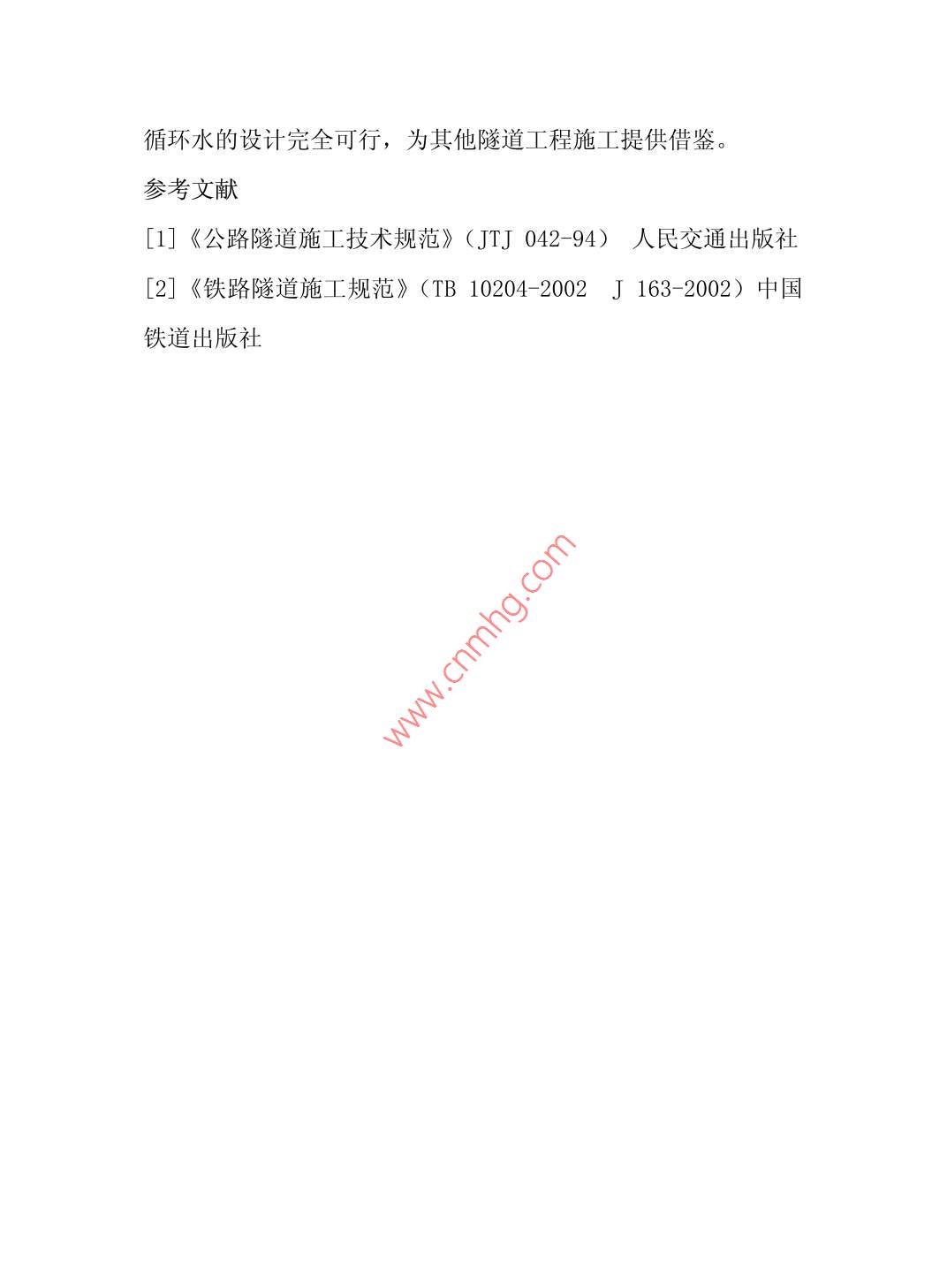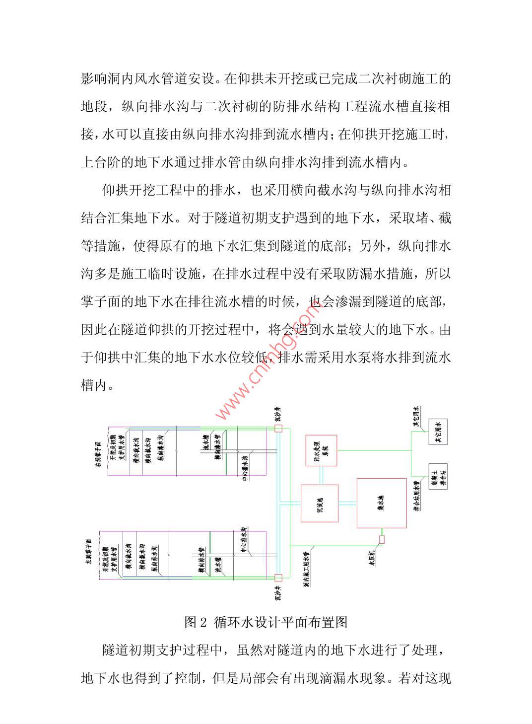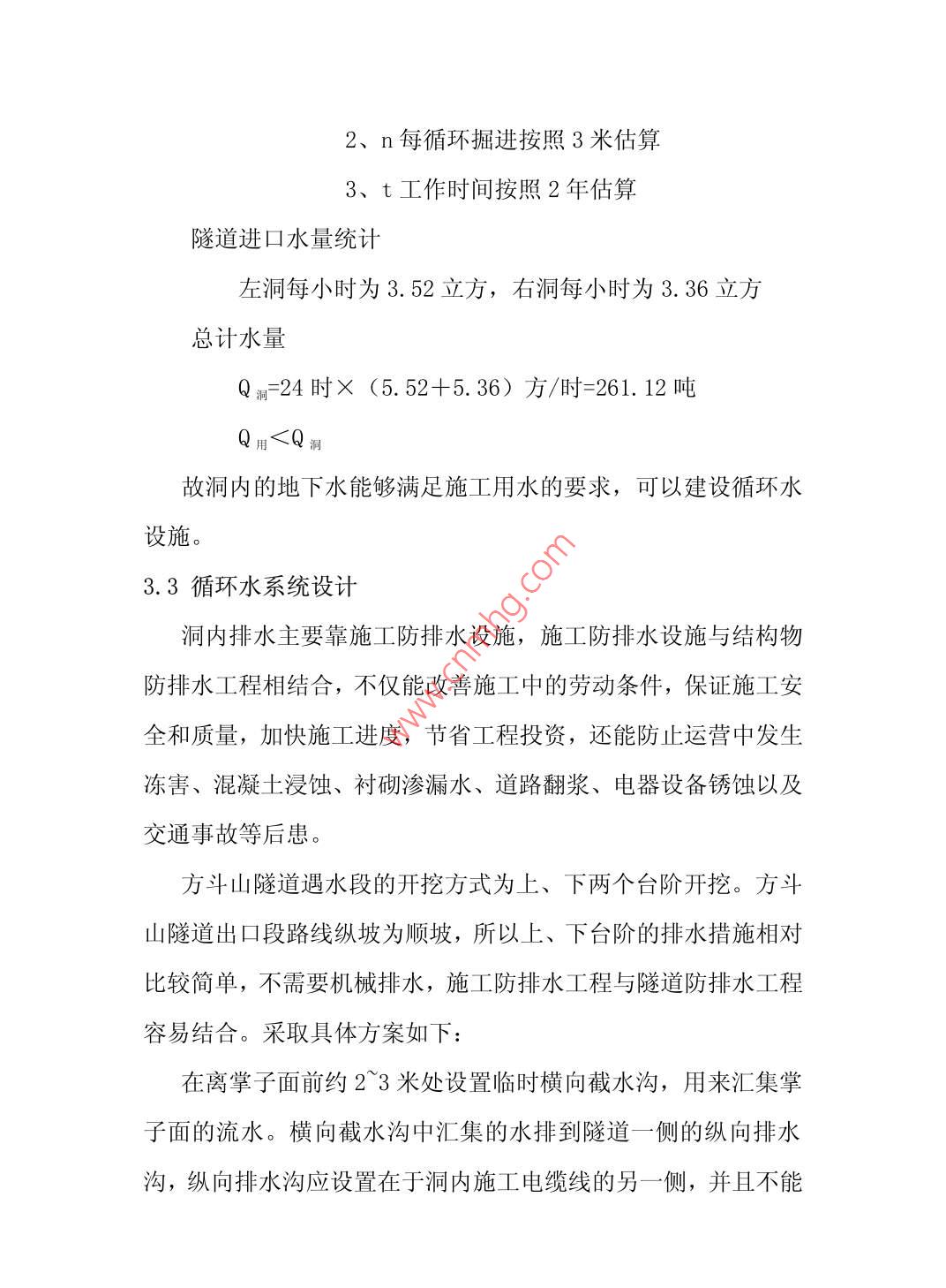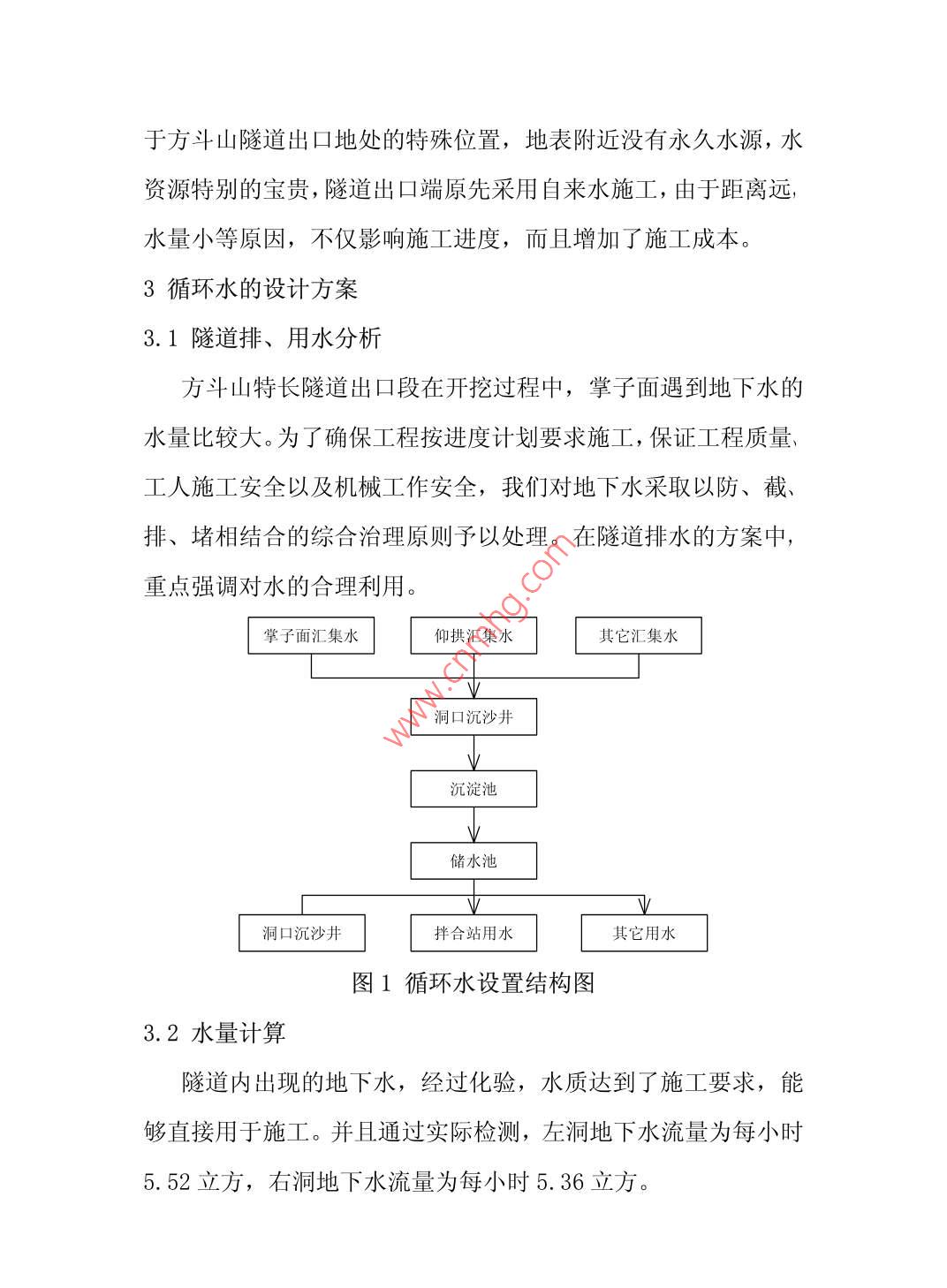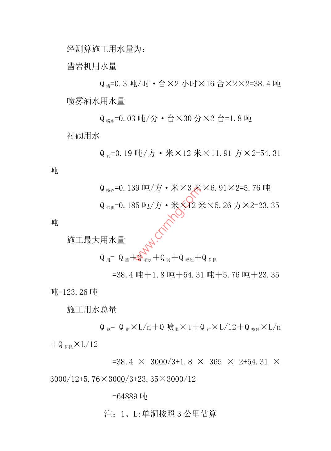隧道施工循環(huán)水設(shè)計薛明英韓曉芳中交路橋華北工程有限公司北京摘要:為了保持洞內(nèi)施工場地的干燥,確保洞內(nèi)工人施工以及機械施工的安全,合理利用隧道開挖過程中遇到水,節(jié)約施工成本。關(guān)鍵詞:隧道循環(huán)水設(shè)計中圖分類號:U45文獻標識碼:A1工程概況方斗山特長隧道設(shè)計為分離式隧道,左線長7285m,右線長7310m。隧道穿越的方斗山背斜構(gòu)造,區(qū)域性斷裂構(gòu)造—一橫梁子斷裂帶(F1)及次級斷層發(fā)育、分布規(guī)律,巖溶發(fā)育規(guī)律及水文地質(zhì)特征等。方斗山隧道隧址區(qū)地質(zhì)構(gòu)造復(fù)雜、巖溶發(fā)育、地下水豐富,屬水文地質(zhì)條件復(fù)雜的隊址。預(yù)計平水期隧道涌水量124180m3/d,雨季最大涌水量宜按五倍計,為620900m3/d,屬涌水量特大隧道。隧址區(qū)地下水對砼無結(jié)晶類、分解類、結(jié)晶分解復(fù)合類腐蝕性。2建設(shè)循環(huán)水設(shè)施的必要性在隧道工程施工過程中,水起到很重要的作用。需要水的方面很多,包括鑿巖機用水、噴霧灑水用水、襯砌用水、導(dǎo)管注漿用水等。從施工工藝上來簡述以上幾個環(huán)節(jié)中水的重要性。隧道開挖:爆破開挖是現(xiàn)代隊道開挖中很重要的開挖方式。爆破開挖需要用風槍進行鉆孔施工,風槍鉆孔施工的原理為高壓氣體帶動鉆頭在巖體內(nèi)鉆進。在風槍鉆頭鉆進的過程中,鉆頭由于與巖體的摩擦而不斷的生熱,同時巖體較濕潤的話,鉆頭容易工作。為了風槍鉆頭能夠降溫及更方便鉆頭鉆進,用水來降溫及潤滑鉆頭。洞內(nèi)除塵及降溫:隧道掌子面鉆孔結(jié)束后,開始進行爆破工作,爆破后會在隧道內(nèi)出現(xiàn)大量的灰塵及有毒氣體。這些灰塵除了通過通風設(shè)施予以排除外,還需要用水幕法予以除塵,同時部分氮氧化物也會隨之溶解在水中。隨著隧道深度的不斷加深,洞內(nèi)溫度有所上升,在洞內(nèi)噴水降溫,確保泂內(nèi)溫度不超過規(guī)范施工溫度,為工人提供舒適的工作環(huán)境。噴射混凝土:隧道開挖講究早封閉,隧道岀渣完畢后,緊接著進行初期支護。其中的噴射混凝土的施工工藝分為干噴、潮噴、濕噴,無論是哪種施工工藝,都需要水的配合,只是用水量和加水部位不同而已?;炷涟韬汀⑦\輸及澆筑:二次襯砌為澆筑混凝土。混凝土的拌合離不開水。隧道襯砌混凝土的澆筑一般是泵送混凝土澆筑施工,要求拌合的混凝土具有較好的和易性。其中用水量是決定混凝土拌和物流動性的主要因素。分布在水泥漿中的水量,決定了拌和物的流動性。拌和物中,水泥漿應(yīng)填充骨料顆粒的空隙,并在骨料顆粒表面形成潤滑層以降低摩擦,由此可見,為了獲得要求的流動性,必須有足夠的水泥漿,必須提供必要的施工用水。綜上所述,隊道施工過程中,需要大量的施工用水。但是由于方斗山隧道出口地處的特殊位置,地表附近沒有永久水源,水資源特別的寶貴,隧道出口端原先采用自來水施工,由于距離遠,水量小等原因,不僅影響施工進度,而且增加了施工成本。3循環(huán)水的設(shè)計方案3.1隧道排、用水分析方斗山特長隧道出口段在開挖過程中,掌子面遇到地下水的水量比較大。為了確保工程按進度計劃要求施工,保證工程質(zhì)量、工人施工安全以及機械工作安全,我們對地下水采取以防、截排、堵相結(jié)合的綜合治理原則予以處理。在隧道排水的方案中重點強調(diào)對水的合理利用。掌子面匯集水仰拱匯集水其它匯集水洞口沉沙井沉淀池儲水池洞口沉沙井拌合站用水其它用水圖1循環(huán)水設(shè)置結(jié)構(gòu)圖3.2水量計算隧道內(nèi)出現(xiàn)的地下水,經(jīng)過化驗,水質(zhì)達到了施工要求,能夠直接用于施工。并且通過實際檢測,左洞地下水流量為每小時5.52立方,右洞地下水流量為每小時5.36立方。經(jīng)測算施工用水量為:鑿巖機用水量Q諧=0.3噸/時·臺×2小時×16臺×2×2=38.4噸噴霧灑水用水量Q水=0.03噸/分·臺×30分×2臺=1.8噸襯砌用水Q神=0.19噸/方·米×12米×11.91方×2=5431噸Q噴=0.139噸/方·米×3米×6.91×2=5.76噸Q=0.185噸/方·米×12米×5.26方×2=23.35噸施工最大用水量Q用=Q鑿十Q水十Q襯十Q噴論十Q拱=38.4噸+1.8噸+54.31噸+5.76噸+23.35噸=123.26噸施工用水總量Qa=Q鑿×L/n+Q噴水×t+Q×L/12+Q噴×L/n十Q拱×L/12=38.4×3000/3+1.8×365×2+54.31×3000/12+5.76×3000/3+23.35×3000/1264889噸注:1、L:單洞按照3公里估算2、n每循環(huán)掘進按照3米估算3、t工作時間按照2年估算隧道進口水量統(tǒng)計左洞每小時為3.52立方,右洞每小時為3.36立方總計水量Q澗=24時×(5.52+5.36)方/時=261.12噸Q用<故洞內(nèi)的地下水能夠滿足施工用水的要求,可以建設(shè)循環(huán)水設(shè)施3.3循環(huán)水系統(tǒng)設(shè)計洞內(nèi)排水主要靠施工防排水設(shè)施,施工防排水設(shè)施與結(jié)構(gòu)物防排水工程相結(jié)合,不僅能改善施工中的勞動條件,保證施工安全和質(zhì)量,加快施工進度,節(jié)省工程投資,還能防止運營中發(fā)生凍害、混凝土浸蝕、襯砌滲漏水、道路翻漿、電器設(shè)備銹蝕以及交通事故等后患。方斗山隧道遇水段的開挖方式為上、下兩個臺階開挖。方斗山隧道出口段路線縱坡為順坡,所以上、下臺階的排水措施相對比較簡單,不需要杋械排水,施工防排水工程與隧道防排水工程容易結(jié)合。采取具體方案如下在離掌子