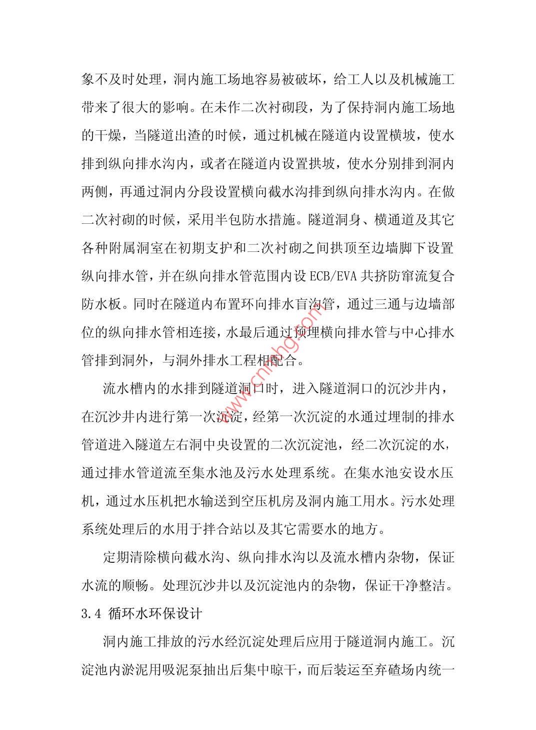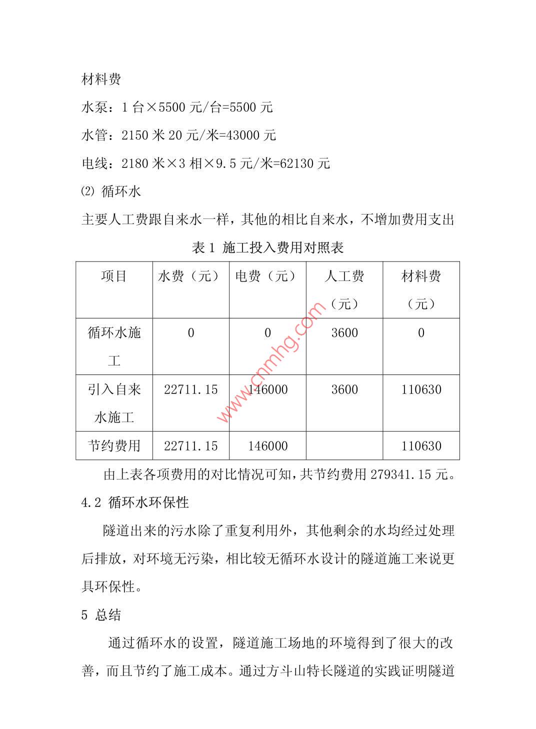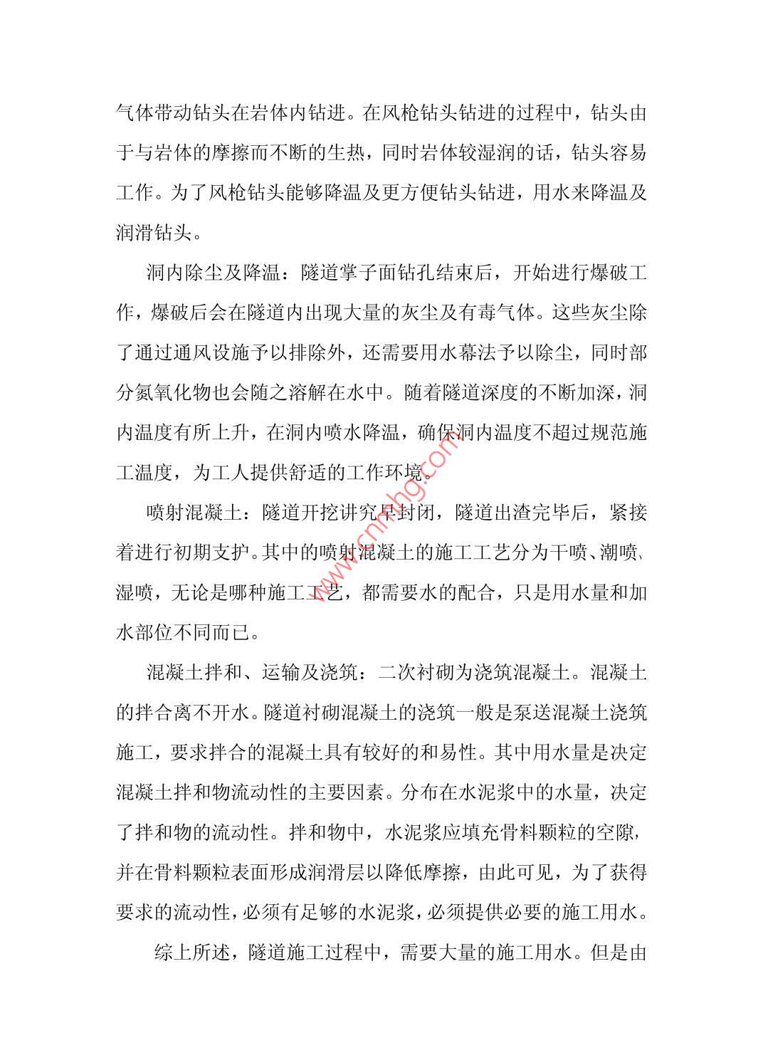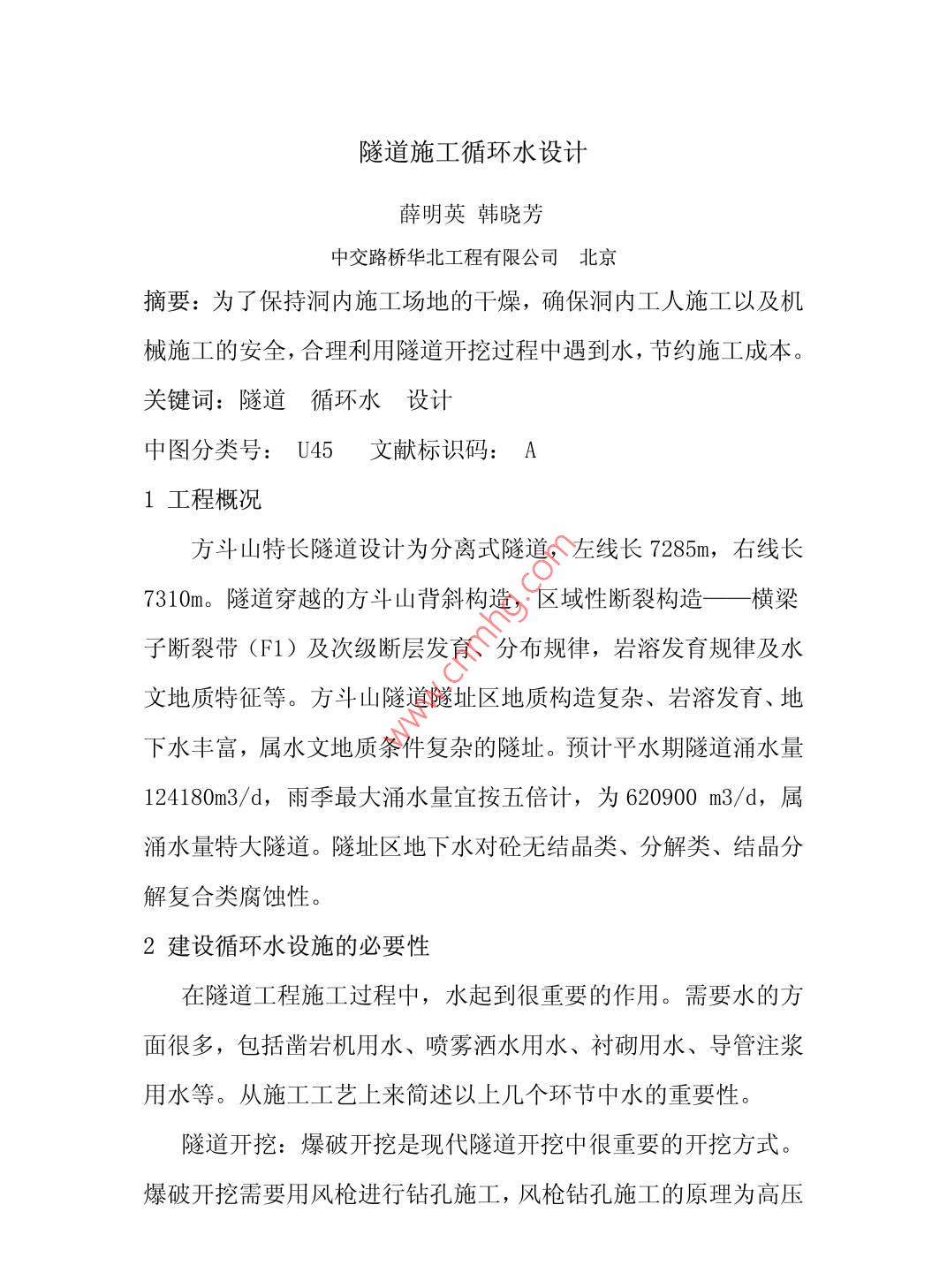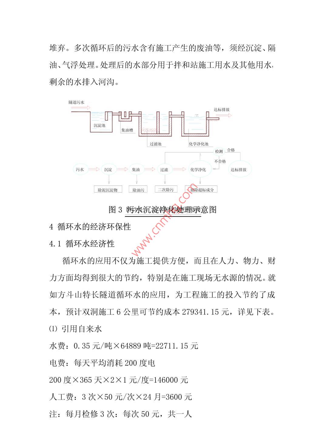 隧道施工循環(huán)水設(shè)計薛明英韓曉芳中交路橋華北工程有限公司北京摘要:為了保持洞內(nèi)施工場地的干燥,確保洞內(nèi)工人施工以及機械施工的安全,合理利用隧道開挖過程中遇到水,節(jié)約施工成本。關(guān)鍵詞:隧道循環(huán)水設(shè)計中圖分類號:U45文獻標識碼:A1工程概況方斗山特長隧道設(shè)計為分離式隧道,左線長7285m,右線長7310m。隧道穿越的方斗山背斜構(gòu)造,區(qū)域性斷裂構(gòu)造—一橫梁子斷裂帶(F1)及次級斷層發(fā)育、分布規(guī)律,巖溶發(fā)育規(guī)律及水文地質(zhì)特征等。方斗山隧道隧址區(qū)地質(zhì)構(gòu)造復(fù)雜、巖溶發(fā)育、地下水豐富,屬水文地質(zhì)條件復(fù)雜的隊址。預(yù)計平水期隧道涌水量124180m3/d,雨季最大涌水量宜按五倍計,為620900m3/d,屬涌水量特大隧道。隧址區(qū)地下水對砼無結(jié)晶類、分解類、結(jié)晶分解復(fù)合類腐蝕性。2建設(shè)循環(huán)水設(shè)施的必要性在隧道工程施工過程中,水起到很重要的作用。需要水的方面很多,包括鑿巖機用水、噴霧灑水用水、襯砌用水、導(dǎo)管注漿用水等。從施工工藝上來簡述以上幾個環(huán)節(jié)中水的重要性。隧道開挖:爆破開挖是現(xiàn)代隊道開挖中很重要的開挖方式。爆破開挖需要用風槍進行鉆孔施工,風槍鉆孔施工的原理為高壓氣體帶動鉆頭在巖體內(nèi)鉆進。在風槍鉆頭鉆進的過程中,鉆頭由于與巖體的摩擦而不斷的生熱,同時巖體較濕潤的話,鉆頭容易工作。為了風槍鉆頭能夠降溫及更方便鉆頭鉆進,用水來降溫及潤滑鉆頭。洞內(nèi)除塵及降溫:隧道掌子面鉆孔結(jié)束后,開始進行爆破工作,爆破后會在隧道內(nèi)出現(xiàn)大量的灰塵及有毒氣體。這些灰塵除了通過通風設(shè)施予以排除外,還需要用水幕法予以除塵,同時部分氮氧化物也會隨之溶解在水中。隨著隧道深度的不斷加深,洞內(nèi)溫度有所上升,在洞內(nèi)噴水降溫,確保泂內(nèi)溫度不超過規(guī)范施工溫度,為工人提供舒適的工作環(huán)境。噴射混凝土:隧道開挖講究早封閉,隧道岀渣完畢后,緊接著進行初期支護。其中的噴射混凝土的施工工藝分為干噴、潮噴、濕噴,無論是哪種施工工藝,都需要水的配合,只是用水量和加水部位不同而已?;炷涟韬汀⑦\輸及澆筑:二次襯砌為澆筑混凝土。混凝土的拌合離不開水。隧道襯砌混凝土的澆筑一般是泵送混凝土澆筑施工,要求拌合的混凝土具有較好的和易性。其中用水量是決定混凝土拌和物流動性的主要因素。分布在水泥漿中的水量,決定了拌和物的流動性。拌和物中,水泥漿應(yīng)填充骨料顆粒的空隙,并在骨料顆粒表面形成潤滑層以降低摩擦,由此可見,為了獲得要求的流動性,必須有足夠的水泥漿,必須提供必要的施工用水。綜上所述,隊道施工過程中,需要大量的施工用水。但是由于方斗山隧道出口地處的特殊位置,地表附近沒有永久水源,水資源特別的寶貴,隧道出口端原先采用自來水施工,由于距離遠,水量小等原因,不僅影響施工進度,而且增加了施工成本。3循環(huán)水的設(shè)計方案3.1隧道排、用水分析方斗山特長隧道出口段在開挖過程中,掌子面遇到地下水的水量比較大。為了確保工程按進度計劃要求施工,保證工程質(zhì)量、工人施工安全以及機械工作安全,我們對地下水采取以防、截排、堵相結(jié)合的綜合治理原則予以處理。在隧道排水的方案中重點強調(diào)對水的合理利用。掌子面匯集水仰拱匯集水其它匯集水洞口沉沙井沉淀池儲水池洞口沉沙井拌合站用水其它用水圖1循環(huán)水設(shè)置結(jié)構(gòu)圖3.2水量計算隧道內(nèi)出現(xiàn)的地下水,經(jīng)過化驗,水質(zhì)達到了施工要求,能夠直接用于施工。并且通過實際檢測,左洞地下水流量為每小時5.52立方,右洞地下水流量為每小時5.36立方。經(jīng)測算施工用水量為:鑿巖機用水量Q諧=0.3噸/時·臺×2小時×16臺×2×2=38.4噸噴霧灑水用水量Q水=0.03噸/分·臺×30分×2臺=1.8噸襯砌用水Q神=0.19噸/方·米×12米×11.91方×2=5431噸Q噴=0.139噸/方·米×3米×6.91×2=5.76噸Q=0.185噸/方·米×12米×5.26方×2=23.35噸施工最大用水量Q用=Q鑿十Q水十Q襯十Q噴論十Q拱=38.4噸+1.8噸+54.31噸+5.76噸+23.35噸=123.26噸施工用水總量Qa=Q鑿×L/n+Q噴水×t+Q×L/12+Q噴×L/n十Q拱×L/12=38.4×3000/3+1.8×365×2+54.31×3000/12+5.76×3000/3+23.35×3000/1264889噸注:1、L:單洞按照3公里估算2、n每循環(huán)掘進按照3米估算3、t工作時間按照2年估算隧道進口水量統(tǒng)計左洞每小時為3.52立方,右洞每小時為3.36立方總計水量Q澗=24時×(5.52+5.36)方/時=261.12噸Q用<故洞內(nèi)的地下水能夠滿足施工用水的要求,可以建設(shè)循環(huán)水設(shè)施3.3循環(huán)水系統(tǒng)設(shè)計洞內(nèi)排水主要靠施工防排水設(shè)施,施工防排水設(shè)施與結(jié)構(gòu)物防排水工程相結(jié)合,不僅能改善施工中的勞動條件,保證施工安全和質(zhì)量,加快施工進度,節(jié)省工程投資,還能防止運營中發(fā)生凍害、混凝土浸蝕、襯砌滲漏水、道路翻漿、電器設(shè)備銹蝕以及交通事故等后患。方斗山隧道遇水段的開挖方式為上、下兩個臺階開挖。方斗山隧道出口段路線縱坡為順坡,所以上、下臺階的排水措施相對比較簡單,不需要杋械排水,施工防排水工程與隧道防排水工程容易結(jié)合。采取具體方案如下在離掌子