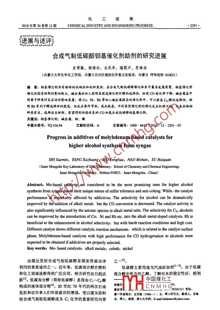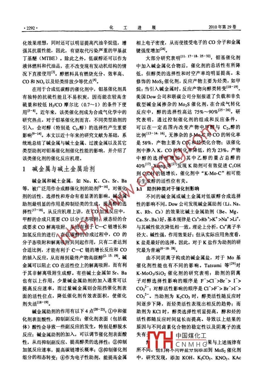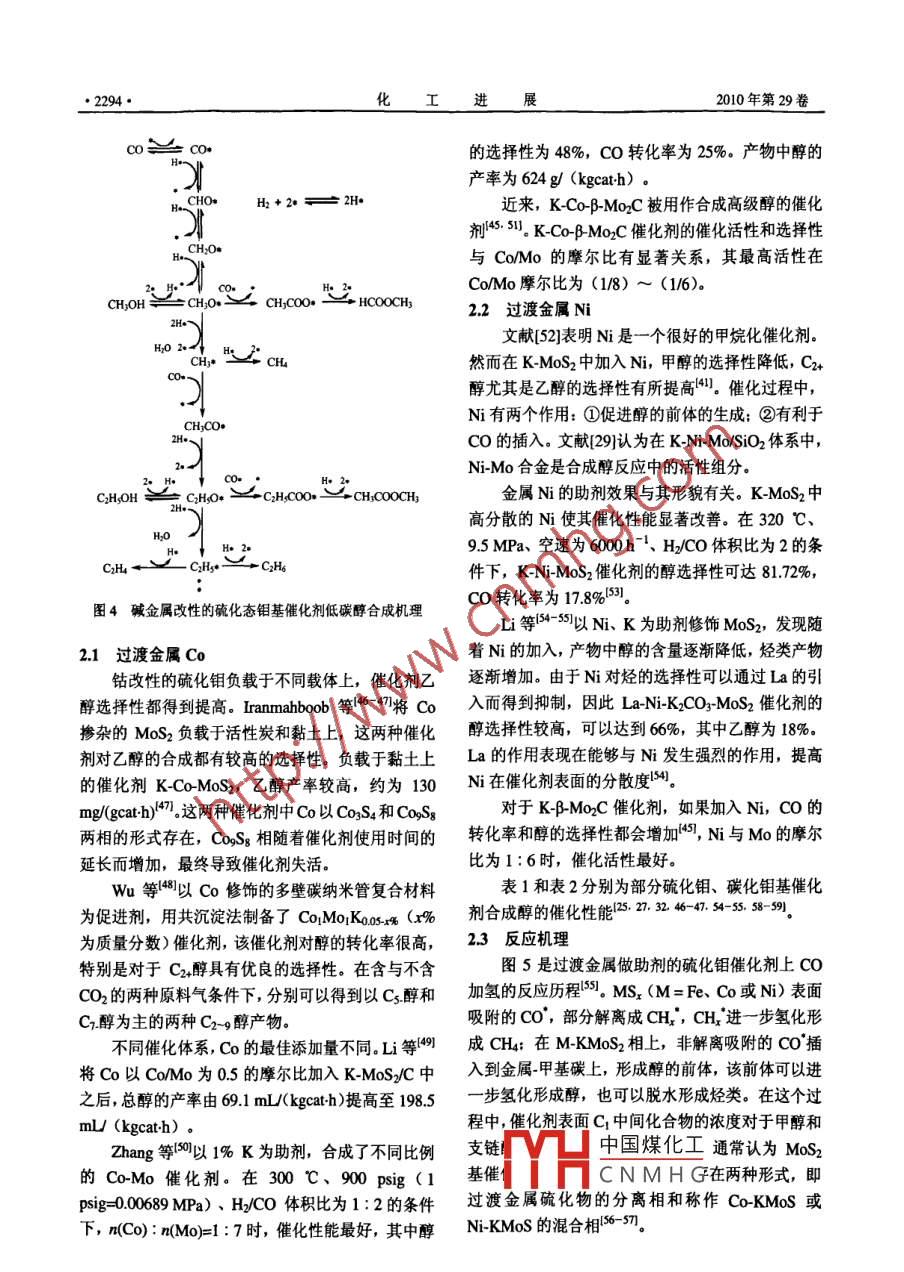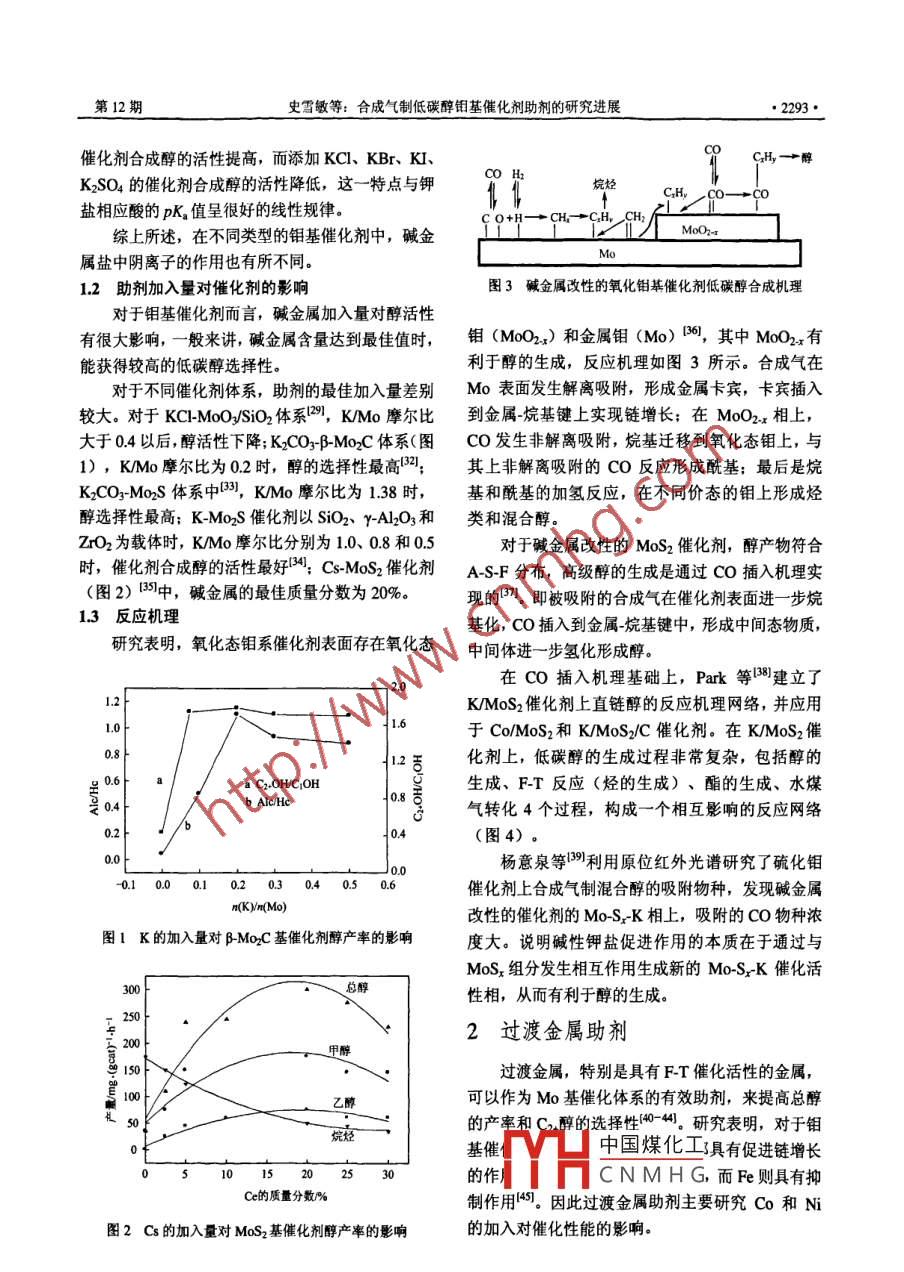 化進(jìn)展2010年第29卷第12期 CHEMICAL INDUSTRY AND ENGINEERING PROGRESS2291進(jìn)展與述評合成氣制低碳醇鉬基催化劑助劑的研究進(jìn)展史雪敏,楊緒壯,白鳳華,瑙莫汗,蘇海全(內(nèi)蒙古大學(xué)化學(xué)化工學(xué)院,內(nèi)蒙古自治區(qū)煤炭化學(xué)重點實驗室,內(nèi)蒙古呼和浩特010021)摘要:鉬基催化劑具有獨特的抗硫性和抗積炭性,在合成氣制低碳醇催化體系中最具發(fā)展前景,鉬基催化劑催化性能受助劑的影響較大,堿金屬的加入能明顯提高催化劑對酶的選擇性,但使CO轉(zhuǎn)化率下降;堿金屬鹽中陰離子種類對反應(yīng)活性影響顯著;將Co、N、Rh等加入堿金屬摻雜的催化劑中,可以提高C2醇的選擇性;助劑Rh有利于醇選擇性的提高,但反應(yīng)條件苛刻,成本較高。不同類型催化劑的催化反應(yīng)機(jī)理不同,與表面物相種類有關(guān)。選擇適當(dāng)助劑,有望得到性能優(yōu)良的CO加氫合成低碳醇鉬基催化劑關(guān)鍵詞:鉬基催化劑;堿金屬;鈷;鎳中圖分類號;TQ42694文獻(xiàn)標(biāo)志碼:A文章編號:1000-6613(2010)12-2291-07Progress in additives of molybdenum based catalysts forhigher alcohol synthesis from syngasSHI Xuemin, YANG Xuzhuang, BAl Fenghua, NAO Mohan, SU Haiqua(Inner Mongolia Key Laboratory of Coal Chemistry, School of Chemistry and Chemical EngineeringInner Mongolia University, Hohhot 010021, Inner Mongolia, China)Abstract: Mo-based catalysts are considered to be the most promising ones for higher alcoholsynthesis from syngas due to their unique nature of sulfur tolerance and anti-coking. While, the catalysterformance is remarkably affected by addictives. The selectivity for alcohol can be dramaticallyimproved by the addition of alkali metal, but the co conversion is decreased. The catalyst activity isalso significantly influenced by the anionic species in alkali metal salts. The selectivity for C2+ alcoholscan be improved by the introduction of Co, Ni and Rh etc. into the alkali metal-doped catalysts. Rh isbeneficial to the enhancement in alcohol selectivity, but with harsh reaction conditions and high cost.Different catalyst shows different catalytic reaction mechanism, which is related to the catalyst surfacephase. Molybdenum-based catalysts with high performance for CO hydrogenation to alcohols wereexpected to be obtained if addictives are properly selectedKey words: Mo- based catalysts; alkali metals: cobalt; nickel由煤出發(fā)經(jīng)合成氣制低碳醇是煤炭資源潔凈之_田利用的重要途徑之一。近年來,低碳混合醇在燃料低碳醇主要用途為汽油添加劑-3。由于低碳和化工領(lǐng)域逐漸得到廣泛應(yīng)用,相關(guān)研究也日趨活混合醇中所含的子醇、丁醇對水的穩(wěn)定性好、溶劑躍。低碳混合醇(簡稱低碳醇)是指由C1~C醇中國煤化工構(gòu)成的液體混合物2。20世紀(jì)70年代的兩次石油收稿日CNMHB226112)資助。危機(jī)和近年來人們環(huán)保意識的增強(qiáng),使以煤為原料第一作者簡介:史雪敏(1986),女,碩士研究生,聯(lián)系人:蘇海經(jīng)合成氣制取低碳醇成為C1化學(xué)的重要研究內(nèi)容全,博土,教授,博土生導(dǎo)師,E-mailbaiquansu@yahoo.com·2292200年第29卷化效果理想,同時還可以明顯提高汽油辛烷值,增相上電子密度,從而使接受電子的Co分子和金屬強(qiáng)其抗震性能,因此,有望取代污染嚴(yán)重的甲基叔鍵強(qiáng)度增加2。丁基醚(MTBE)。除此之外,低碳醇還可以作為大部分研究表明-135-3,鉬基催化劑液體燃料和代油品,在不改變現(xiàn)有發(fā)動機(jī)結(jié)構(gòu)的情中加入堿金屬化合物后,催化劑的總活性有所降況下直接使用凹。醇燃料具有燃燒充分、效率高、低,但醇類的選擇性和時空產(chǎn)率均明顯提高。未Co和NO2以及烴類排放少等優(yōu)點向。修飾的MoS2催化劑,反應(yīng)產(chǎn)物主要為烴類,如在用于合成低碳醇的催化劑中,鉬基催化劑具烷;當(dāng)引入堿金屬時,反應(yīng)產(chǎn)物向醇類轉(zhuǎn)變有獨特的抗硫性能且不易積炭,因而能在較高含美國Dw公司和聯(lián)碳公司分別報道了負(fù)載和非負(fù)硫量和較低H2CO摩爾比(0.7~1)的條件下使載型堿金屬摻雜的Mo2S催化劑,在合成氣轉(zhuǎn)化用"5-8。近年來,該類催化劑成為合成氣化學(xué)中的反應(yīng)中,醇的選擇性高達(dá)75%~90%32。研研究熱點。對于鉬基催化劑而言,不同類型助劑的究表明,通過控制催化劑的組成和反應(yīng)條件引入,會對醇(特別是C2醇)的選擇性產(chǎn)生重要可以在一定范圍內(nèi)改變產(chǎn)物中甲醇與C2+醇的影響91。本文以近十年來的研究文獻(xiàn)為基礎(chǔ),系比例3-1416。無摻雜的βMo2C對CO的轉(zhuǎn)化率統(tǒng)地總結(jié)了堿金屬與堿土金屬、過渡金屬以及其它是58%,產(chǎn)物主要為CO2和烴類化合物;該催化類型助劑對鉬基催化劑催化性能的影響,并介紹了劑中摻入K,CO的轉(zhuǎn)化率降低,約為23%,產(chǎn)物該類催化劑的催化反應(yīng)機(jī)理。中醇的選擇性增加,其中乙醇的量占總醇的1堿金屬與堿土金屬助劑40%0n. Xiang等發(fā)現(xiàn)K助劑可有效促進(jìn)coH到C2OH的鏈增長,催化劑中“KMo-C”相可能堿金屬和堿土金屬,如Na、K、Cs、Sr、Ba與生成醇的活性位有關(guān)等,被廣泛用作合成醇催化劑的助劑1,對催化11助劑種類對于催化劑影響劑的活性、選擇性和壽命有著顯著的影響。堿金屬不同的堿金屬或堿土金屬對低碳醇合成選擇助劑最明顯的作用是抑制烴類的生成,提高醇的選性的影響不同。Dow公司發(fā)現(xiàn)堿金屬助劑(Li、Na、擇