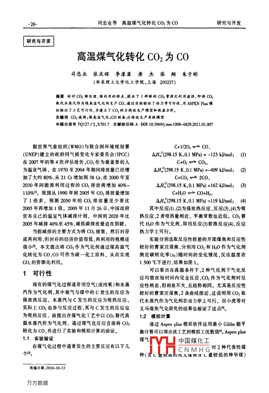 高溫煤氣化轉(zhuǎn)化CO2為CO