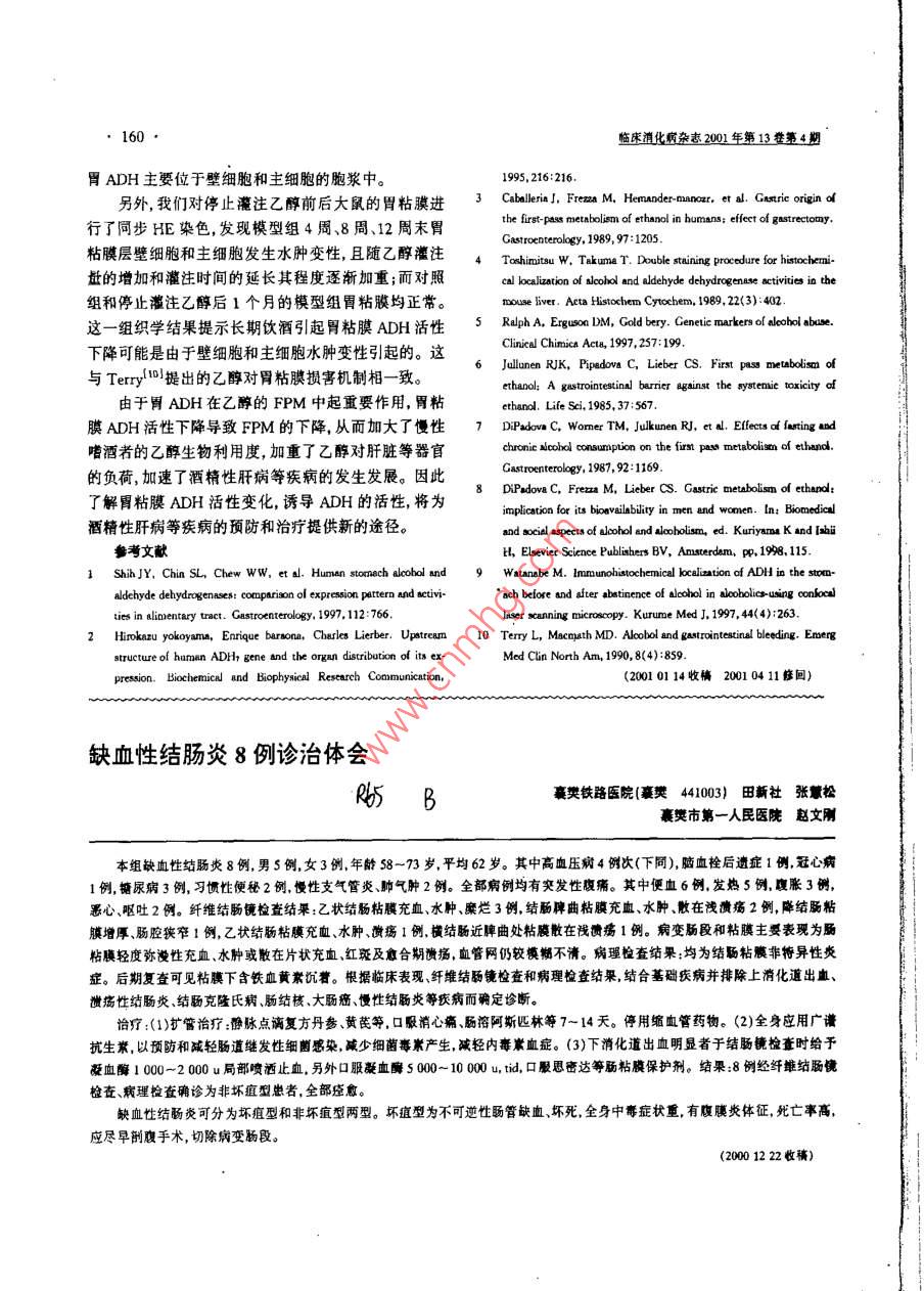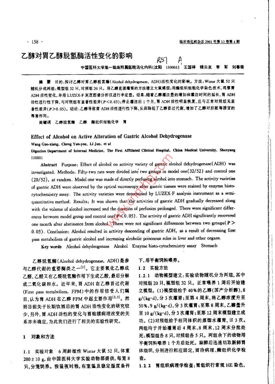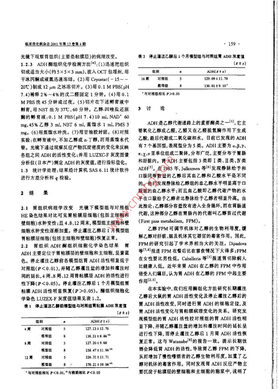 158臨床消化病雜2001年第13卷第4期乙醇對胃乙醇脫氫酶活性變化的影響 R5T A中國醫(yī)科大學第一臨床附屬醫(yī)院消化內(nèi)科(沈陽1001王國祥程云友李軍劉春榮摘目的:探討乙醇對胃乙醇脫氫酶( Alcohol dehydrogenase,dh)活性變化的影響。方法: Wistar大鼠52只隨機分成兩組:模型組32只,對照組20只。用乙醇直接灌胃的方法建立大鼠模型用組織細胞化學染色技術觀察ADH活性變化,并用 LUZEX--F灰度圖像分析儀進行半定量。結果:隨著乙醇灌注量的增加和灌注時間的延長,胃adH活性進行性下降與對照組有顯著性差異(P<0.05;停止注后1個月、胃ADH活性明顯恢復,且與正常對照組無顯著性差異(P>0.05)。結論:乙醇導致胃ADH活性進行性下降從而降低了乙醇首過代謝增加了乙醇對肝臟等器官的毒害作用。關鍵詞乙脫氫酶乙醇組織細胞化學胃 Effect of Alcohol on Active Alteration of Gastric Alcohol Dehydrogenase Wang Guo-xiang, Cheng Yun-you, LI Jun, et al Digestion Department of Internal Medicine. The First Affiiated Clnical Hospital, China Medical Uaiversity, Shenyang110001 Abstract Purpose: Effect of alcohol on activity variety of gastric alcohol dehydrogenase( ADH) was investigated. Methods: Fifty-two rats were divided into two groups in model one(32/52) and control one (20/52), at random. Model one was made of directly perfusing alcohol into stomach. The activity varieties of gastric ADH were observed by the optical microscopy after gastric tissues were stained by enzyme hista- cytochemistry assay. The activity varieties were determined by LUZEX-F analysis instrument as a semi quantitative method. Results: It was shown that the activities of gastric ADH gradually decreased along with the volume of alcohol increased and the duration of perfusion prolonged. There were significant differ- ences between model group and control one(<0.05). The activity of gastric ADH significantly recovered one month after abstinence from alcohol. There were not significant differences between two groups(P 0.05). Conclusion: Alcohol resulted in activity descending of gastric ADH, as a result of decreasing first Key words Alcohol dehydrogenase Alcohol Enzyme histo-cytochemistr assay Stomach乙醇脫氫酶( Alcohol dehydrogenase,ADH)是參下,用平衡飼料喂養(yǎng)。與乙醇代謝的重要酶類之一。它主要氧化乙醇成1.2實驗方法乙醛,乙醛又在乙醛脫氫酶作用下生成乙酸,最后分解1.2.1動物模型建立:實驗動物隨機分為兩組,其中成二氧化碳和水。近年來,胃ADH在乙醇首過代謝對照組20只,模型組32只。正常喂養(yǎng)1周后開始建(First pass metabolism,FPM)中的作用倍受人們矚立模型。(1)模型組給予40%的乙醇(國產(chǎn)分析醇),8目,認為胃ADH在乙醇FPM中起主要作用231然g/(kgd),分3次胃至第4周末,將乙醇濃度升至而目前關于長期飲酒后的胃ADH活性變化的研究較50%,9g/(kgd),分3次至第8周末,乙醇量升少,另外,胃ADH活性的變化與胃粘膜病理改變的關至10g/(kgd)分3次灌胃;至第12周末模型建立成系亦未確定,為此我們進行了相關的實驗性研究。功(2)對照組給予相同體積的蒸餾水灌胃,日3次兩組均于開始胃后4周末、8周末、12周末分批處1對象和方法死:模型組各8只,對照組各5只。兩組余下的動物用平衡飼料喂養(yǎng)1個月后處死。麻醉后迅速切取新鮮胃1.1實驗對象6周齡雄性 Wistar大鼠52只,體重體組織,分別進行相應固定留待病理酶組織化學檢200±10g,由中國醫(yī)科大學實驗動物部提供,每籠8查。只,分籠飼養(yǎng)按夜時程,在室溫及穩(wěn)定濕度條件1.2.2胃組織病理學檢查:胃組織行常規(guī)HE染色,臨床消化病雜2001年第13第4期159光鏡下觀察胃組織(主要是粘膜層)的病理改變。表2停止灌注乙醇后1個月模型組與對照組胃ADH灰度值1.2.3ADH酶組織化學檢測方法1:(1)迅速把組織x±s)切成適當大小(約5×5×3mm),放入OCT包埋劑,用組別ADh(千冰丙酮或液氮迅速凍結。(2)用 Cryostat(-15~16周對照組5129.09±11.7020℃)制成12m之冰凍切片。(3)用0.1MPBS(pH模組8130.01±9.107.4)稀釋2%~4%的戊二醛固定1分鐘。(4)用0.1·與對照組相比P>0.05MPBS洗45分鐘或過夜。(5)切片在下述孵育液中孵育,用NBT法為37℃,60分鐘。乙醇四唑鹽還原3討論酶的孵育液:0.1MPBS(p7.4)10ml,AD+60mg,45%乙醇3ml,nT6ml,蒸餾水1ml,PMS3ADH是乙醇代謝通路上的重要酶類之一,它主mg。(6)用蒸餾水沖洗。(7)用甘油膠封固。(8)對照要氧化乙醇成乙醛,乙醛又在乙醛脫氫酶作用下生成實驗:在孵育液中,不加乙醇或n-丁醇,而用蒸餾水代乙酸最后代謝成二氧化碳和水目前已發(fā)現(xiàn)的ADH替。光鏡下通過觀察反應產(chǎn)物沉淀密度的變化來反映有7個基因型,表現(xiàn)型分為5類。ADH主要為aBy、各組之間ADH的活性變化;并用 LUZXCF灰度圖像亞單位組成二聚體,分布廣泛主要分布于胃腸分析儀(日本產(chǎn))測定ADH的灰度值,進行指標量化。和肝臟內(nèi)。胃DH主要包括3類即類、類、Ⅳ類1.3統(tǒng)計學處理:結果經(jīng)計算機SAS6.11統(tǒng)計軟件ADH5在1985年, Julknmen等6發(fā)現(xiàn)靜脈給予和進行方差分析和q檢驗??谘弁葦?shù)量的乙醇后其血乙醇和乙酸水平是不同的。他們發(fā)現(xiàn)靜脈給乙醇組的血乙醇水平明顯高于2結果服組的血乙醇水平;而且血乙酸即乙醇代謝產(chǎn)物的水平在口服給予乙醇者比靜脈給予乙醇者明顯升高。由2.1胃組織病理學改變光鏡下模型組與對照組此推論:乙醇部分容量沒有進入全身循環(huán),而在胃腸道HE染色結果對比可見胃粘膜層細胞(包括主細胞和代謝,這種部分乙醇在胃腸內(nèi)的代謝叫乙醇首過代謝壁細
