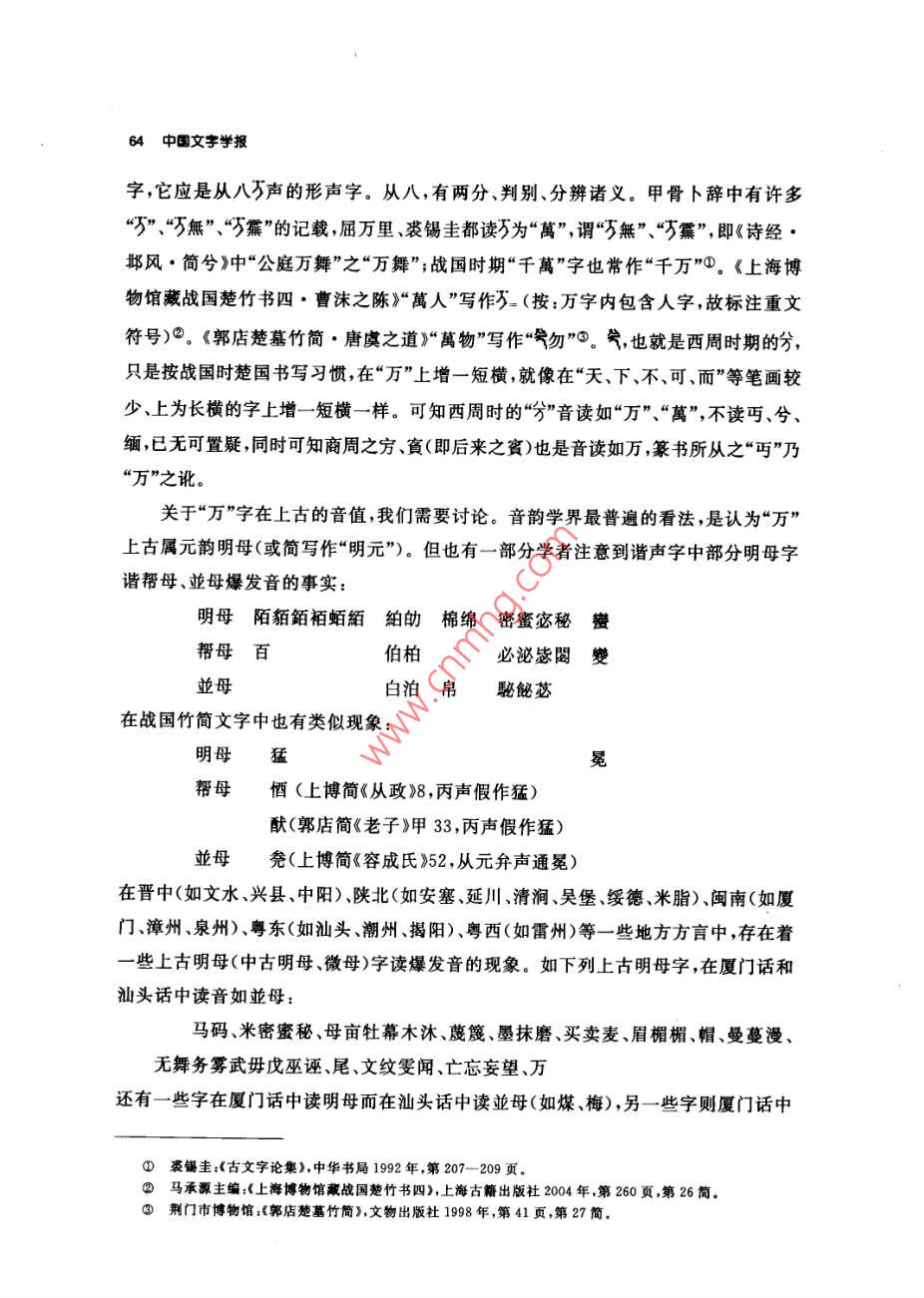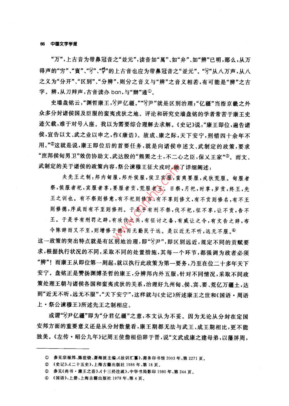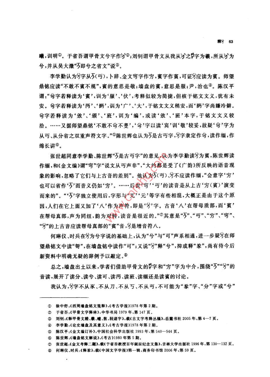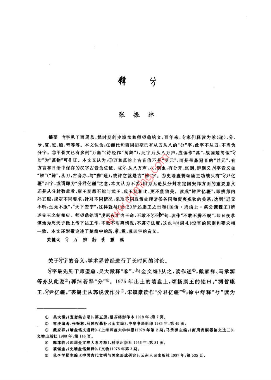 釋分張振林提要分字見于西周恭、懿時期的史墻盤和師望鼎銘文,百年來,專家們釋讀為象(遂)、分兮、賓、班、緬、哿等等。本文認為:①商代和西周初期已有從刀從八的“分”字,此字不從刀,不當為分字。②甲骨文已有多例“萬無”(詩經(jīng)作“萬舞”),此字乃從八萬聲,應讀作“萬”,戰(zhàn)國楚簡假“勿”為“萬物”可作證。本文又認為:③萬和萬的上古音值不是“明元”,而是帶鼻冠音的“並元”,有方言和日語中保存的漢字古音為佐證。④,從八萬聲;八,別也,有分開、區(qū)別、辨別義;字音義如“辨”(“辨”,從刀,古音辦,與“辦”通),或許它就是古“辨”字。⑤史墻盤贊頌康王功績只有“分尹億疆”四字,或謂即為“分君億疆”之意,本文認為不妥,因為無論從分封在定國安邦方面的重要意義還是從分封數(shù)量看,康王期都不能與武王、成王期相比,更不能獨美。讀成“辨尹億疆”即辨邦內(nèi)外五服,規(guī)定不同要求,針對不同情況,采取不同政策處理諸侯各國和蠻夷戎狄的關系,達到“近無不聽,遠無不服”“天下安寧”,這樣就與《史記》所述康王之世和《國語·周語上·祭公諫穆王》所述先王之制相應。師望鼎銘謂“虔夙夜出內(nèi)王命,不敢不分不餐”句,讀作“不敢不辨不規(guī)”,即日夜恭謹?shù)貫橹芴熳幼錾蟼飨逻_工作,不敢不明辨情況,不遵守法度,這也與《周禮》設官的原則和要求相致。本文還附帶論述了楚簡中的、我、、萬四字的音義。關鍵詞兮萬辨訝食憊濱關于分字的音義,學術界曾經(jīng)進行了長時間的討論。分字最先見于師望鼎,吳大激釋“豢”,《金文編》從之,讀作遂②,戴家祥、馬承源等亦從此說③;郭沫若釋“分”④。1976年出土的墻盤上,頌揚康王的銘曰:“淵哲康王,分尹億疆?!濒缅a圭從郭說讀作分③,宋鎮(zhèn)豪讀作“分君億疆”6;徐中舒釋“兮”讀為①吳大微:《愙齋集古錄》,第五冊,涵芬樓影印本1918年,第7頁②容庚編著,張振林、馬國權摹補:《金文編》中華書局影印1985年第49頁。③戴家祥:《墻盤銘文通釋》,《上海師范大學學報》1979年第2期;馬承源主編:《商周青銅器銘文選三》,文物出版社1988年,第146頁。④郭沫若:《兩周金文辭大系考釋》,科學出版社1956年,第81頁⑤裘錫圭:《史墻盤銘解釋》,《文物》1978年第3期。⑥見李學勤主編:《中國古代文明與國家形成研究》,云南人民出版杜1997年,第535頁曦,訓明。于省吾謂甲骨文兮字作護;劉釗謂甲骨文從我從子之字為羲所從為兮,并從吳大激“即兮之省文”說③。李學勤認為分字從(丐),卜辭金文守字作方賓字作寶可證分應讀為賓。師望鼎銘應讀“不敢不賓不規(guī)”,竇的意思是敬;墻盤的賓,意思是服;尹,治也④。陳漢平謂:“字若釋讀為‘賓’,訓為服’、伏’,考釋似較為簡捷,但核于銘文文義,猶有未安。兮字若釋讀為沔’、“衙’,訓為廣’、大’,于銘文文義稍安,而“眄’字尚嫌冷僻。⑥字若釋讀為‘攽’、頒’、班’,訓為‘編’,或讀‘攽’、‘班’本字,于銘文文義較洽?!謸?jù)師望鼎銘‘不敢不命不妻’,’字以讀‘賓’訓‘敬’較妥,故疑‘窀’字為從丐、從分省之雙重聲符文字?!雹蓐愂垒x也認為是古丐字,分字隸定作兮,讀作緬,作綿長講◎。張世超同意李學勤陳世輝“是古丐字”的意見認為李學勤讀才為賓陳世輝讀作緬,和《金文編》謂“宙”字“說文從丐聲非”,“大約都是受了《廣韻》所反映的語音現(xiàn)象的影響,忽略了它們與上古音的差別”。他認為(丐)、分不應讀作緬,“會意字窮也可以省作萬而音義仍如“方’?!笫馈笆亍さ淖x音是從上古“方(實賓)演變而來的”。“5字獨立使用后,字形與‘兀元’等字有些相混,大概正是由于這個原因,人們在它上面又加了八作為聲符,即是今分字。古音‘八在幫母質部,而“賓在幫母真部,聲為同紐,韻為對轉,讀音是很近的?!逼湟馐恰啊?、“丐”、“窮”、“哼”、“分”的上古音應讀幫母真部的“賓”音,分是增音符八。何琳儀時兵在分為兮字說的基礎上認為“兮”與“可”聲系相通,進一步疑在師望鼎銘文中讀“哿”在墻盤銘中讀作“可”;又說“分”釋“兮”抑或釋“”,尚有待今后新資料中明確無疑的辭例予以敲定。③總之,墻盤出土以來,學者們借助甲骨文的夢字和“方”字為中介,圍繞“”“分”的音讀,展開了讀分讀兮讀可、讀沔、讀班、讀緬還是讀賓的討論我認為,分字不從豕、不從刀、不從萬、不從丐,不可能為“豢”字、“分”字或“兮①徐中舒:《西周墻盤銘文箋釋》《考古學報》1978年第2期②于省吾:《甲骨文字釋林》中華書局1979年,第147頁劉釗:《釋甲骨文精、畿、蝗散、栽諸字》,載《古文字考釋叢稿》,岳麓書社2005年,第4-7頁④李學勤:《論史墻盤及其意義》,《考古學報》1978年第2期⑤陳漢平:《金文編訂補》,中國社會科學出版社1993年,第540-—544頁⑥陳世輝:《墻盤銘文解說》,《考古》1980年第5期⑦張世超:《金文考釋二題》載《于省吾教授百年誕辰紀念文集》吉林大學出版社1996年,第130-132頁③何琳儀、時兵:《釋苯》載《中國文字學報》第一輯,商務印書館2006年,第59頁。64中國文字學報字,它應是從八聲的形聲字。從八,有兩分判別分辨諸義。甲骨卜辭中有許多“”、“萬無”、“歹蕪”的記載,屈萬里、裘錫圭都讀萬為“萬”,謂“萬無”、“萬冪”,即《詩經(jīng)邶風·