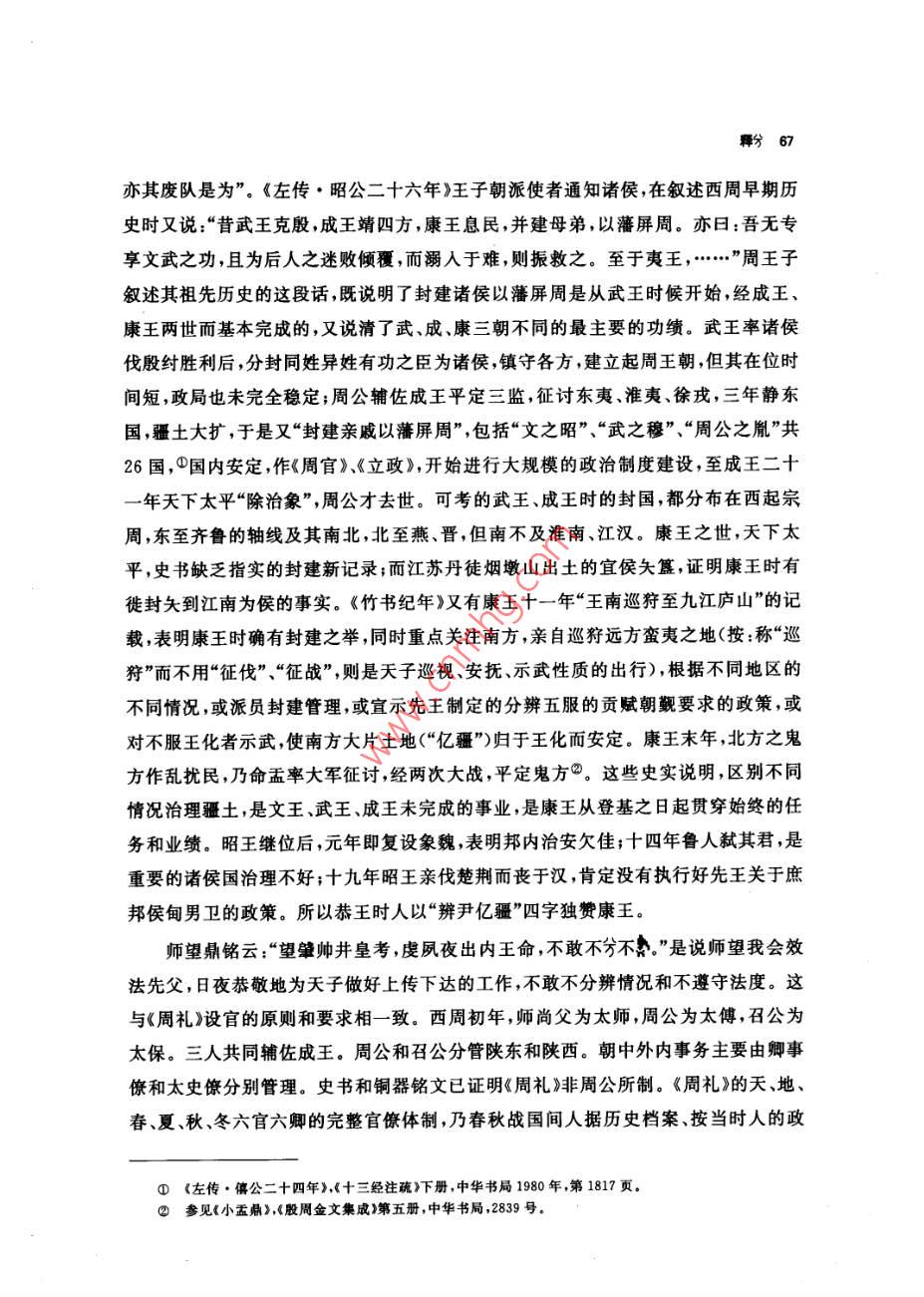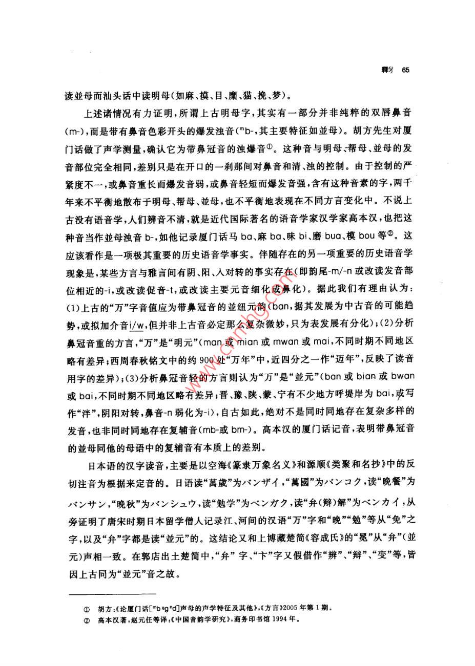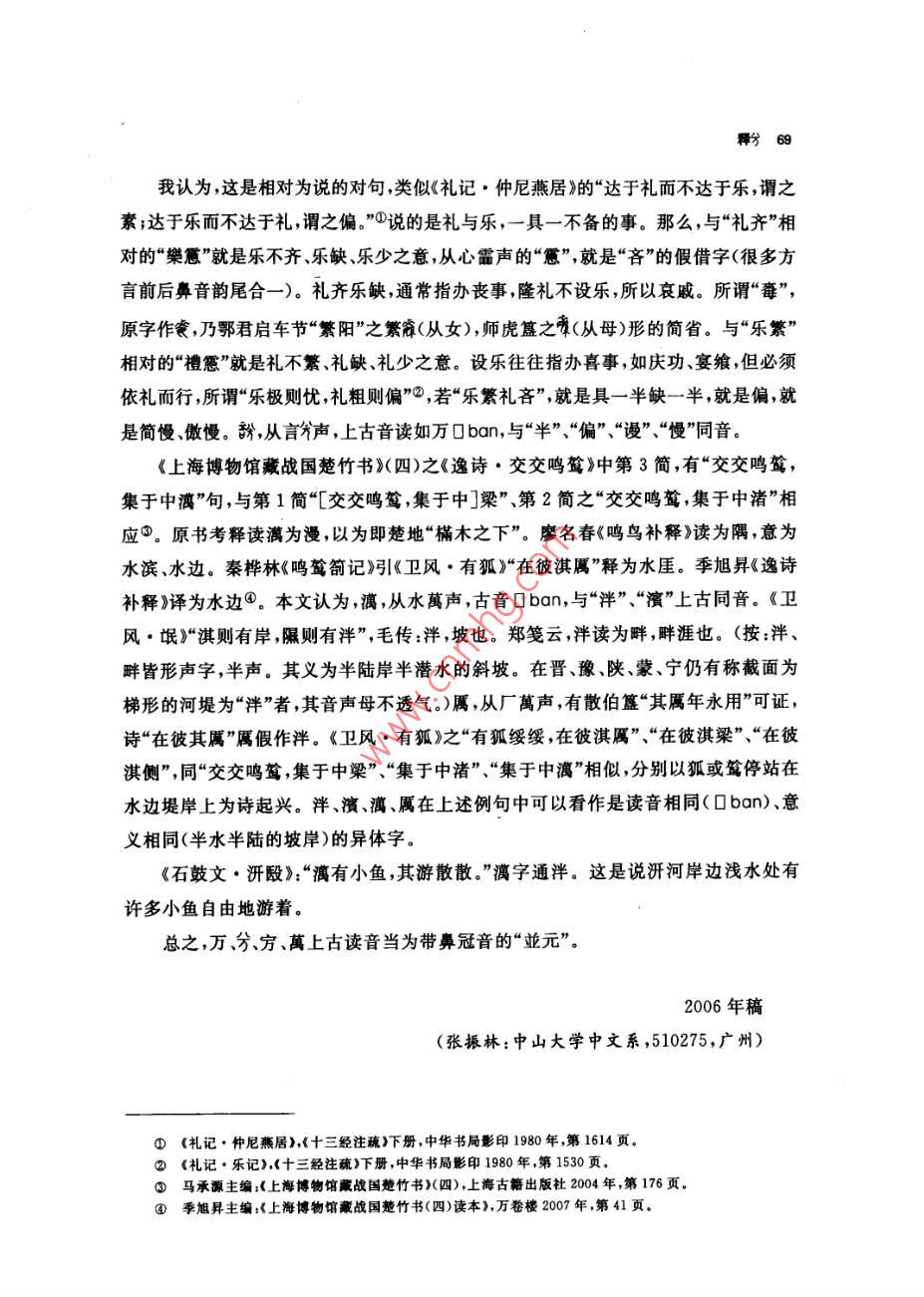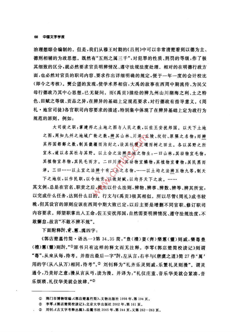 釋分張振林提要分字見于西周恭、懿時期的史墻盤和師望鼎銘文,百年來,專家們釋讀為象(遂)、分兮、賓、班、緬、哿等等。本文認為:①商代和西周初期已有從刀從八的“分”字,此字不從刀,不當為分字。②甲骨文已有多例“萬無”(詩經(jīng)作“萬舞”),此字乃從八萬聲,應讀作“萬”,戰(zhàn)國楚簡假“勿”為“萬物”可作證。本文又認為:③萬和萬的上古音值不是“明元”,而是帶鼻冠音的“並元”,有方言和日語中保存的漢字古音為佐證。④,從八萬聲;八,別也,有分開、區(qū)別、辨別義;字音義如“辨”(“辨”,從刀,古音辦,與“辦”通),或許它就是古“辨”字。⑤史墻盤贊頌康王功績只有“分尹億疆”四字,或謂即為“分君億疆”之意,本文認為不妥,因為無論從分封在定國安邦方面的重要意義還是從分封數(shù)量看,康王期都不能與武王、成王期相比,更不能獨美。讀成“辨尹億疆”即辨邦內(nèi)外五服,規(guī)定不同要求,針對不同情況,采取不同政策處理諸侯各國和蠻夷戎狄的關系,達到“近無不聽,遠無不服”“天下安寧”,這樣就與《史記》所述康王之世和《國語·周語上·祭公諫穆王》所述先王之制相應。師望鼎銘謂“虔夙夜出內(nèi)王命,不敢不分不餐”句,讀作“不敢不辨不規(guī)”,即日夜恭謹?shù)貫橹芴熳幼錾蟼飨逻_工作,不敢不明辨情況,不遵守法度,這也與《周禮》設官的原則和要求相致。本文還附帶論述了楚簡中的、我、、萬四字的音義。關鍵詞兮萬辨訝食憊濱關于分字的音義,學術界曾經(jīng)進行了長時間的討論。分字最先見于師望鼎,吳大激釋“豢”,《金文編》從之,讀作遂②,戴家祥、馬承源等亦從此說③;郭沫若釋“分”④。1976年出土的墻盤上,頌揚康王的銘曰:“淵哲康王,分尹億疆?!濒缅a圭從郭說讀作分③,宋鎮(zhèn)豪讀作“分君億疆”6;徐中舒釋“兮”讀為①吳大微:《愙齋集古錄》,第五冊,涵芬樓影印本1918年,第7頁②容庚編著,張振林、馬國權摹補:《金文編》中華書局影印1985年第49頁。③戴家祥:《墻盤銘文通釋》,《上海師范大學學報》1979年第2期;馬承源主編:《商周青銅器銘文選三》,文物出版社1988年,第146頁。④郭沫若:《兩周金文辭大系考釋》,科學出版社1956年,第81頁⑤裘錫圭:《史墻盤銘解釋》,《文物》1978年第3期。⑥見李學勤主編:《中國古代文明與國家形成研究》,云南人民出版杜1997年,第535頁曦,訓明。于省吾謂甲骨文兮字作護;劉釗謂甲骨文從我從子之字為羲所從為兮,并從吳大激“即兮之省文”說③。李學勤認為分字從(丐),卜辭金文守字作方賓字作寶可證分應讀為賓。師望鼎銘應讀“不敢不賓不規(guī)”,竇的意思是敬;墻盤的賓,意思是服;尹,治也④。陳漢平謂:“字若釋讀為‘賓’,訓為服’、伏’,考釋似較為簡捷,但核于銘文文義,猶有未安。兮字若釋讀為沔’、“衙’,訓為廣’、大’,于銘文文義稍安,而“眄’字尚嫌冷僻。⑥字若釋讀為‘攽’、頒’、班’,訓為‘編’,或讀‘攽’、‘班’本字,于銘文文義較洽?!謸?jù)師望鼎銘‘不敢不命不妻’,’字以讀‘賓’訓‘敬’較妥,故疑‘窀’字為從丐、從分省之雙重聲符文字?!雹蓐愂垒x也認為是古丐字,分字隸定作兮,讀作緬,作綿長講◎。張世超同意李學勤陳世輝“是古丐字”的意見認為李學勤讀才為賓陳世輝讀作緬,和《金文編》謂“宙”字“說文從丐聲非”,“大約都是受了《廣韻》所反映的語音現(xiàn)象的影響,忽略了它們與上古音的差別”。他認為(丐)、分不應讀作緬,“會意字窮也可以省作萬而音義仍如“方’?!笫馈笆亍さ淖x音是從上古“方(實賓)演變而來的”。“5字獨立使用后,字形與‘兀元’等字有些相混,大概正是由于這個原因,人們在它上面又加了八作為聲符,即是今分字。古音‘八在幫母質部,而“賓在幫母真部,聲為同紐,韻為對轉,讀音是很近的?!逼湟馐恰啊?、“丐”、“窮”、“哼”、“分”的上古音應讀幫母真部的“賓”音,分是增音符八。何琳儀時兵在分為兮字說的基礎上認為“兮”與“可”聲系相通,進一步疑在師望鼎銘文中讀“哿”在墻盤銘中讀作“可”;又說“分”釋“兮”抑或釋“”,尚有待今后新資料中明確無疑的辭例予以敲定。③總之,墻盤出土以來,學者們借助甲骨文的夢字和“方”字為中介,圍繞“”“分”的音讀,展開了讀分讀兮讀可、讀沔、讀班、讀緬還是讀賓的討論我認為,分字不從豕、不從刀、不從萬、不從丐,不可能為“豢”字、“分”字或“兮①徐中舒:《西周墻盤銘文箋釋》《考古學報》1978年第2期②于省吾:《甲骨文字釋林》中華書局1979年,第147頁劉釗:《釋甲骨文精、畿、蝗散、栽諸字》,載《古文字考釋叢稿》,岳麓書社2005年,第4-7頁④李學勤:《論史墻盤及其意義》,《考古學報》1978年第2期⑤陳漢平:《金文編訂補》,中國社會科學出版社1993年,第540-—544頁⑥陳世輝:《墻盤銘文解說》,《考古》1980年第5期⑦張世超:《金文考釋二題》載《于省吾教授百年誕辰紀念文集》吉林大學出版社1996年,第130-132頁③何琳儀、時兵:《釋苯》載《中國文字學報》第一輯,商務印書館2006年,第59頁。64中國文字學報字,它應是從八聲的形聲字。從八,有兩分判別分辨諸義。甲骨卜辭中有許多“”、“萬無”、“歹蕪”的記載,屈萬里、裘錫圭都讀萬為“萬”,謂“萬無”、“萬冪”,即《詩經(jīng)邶風·