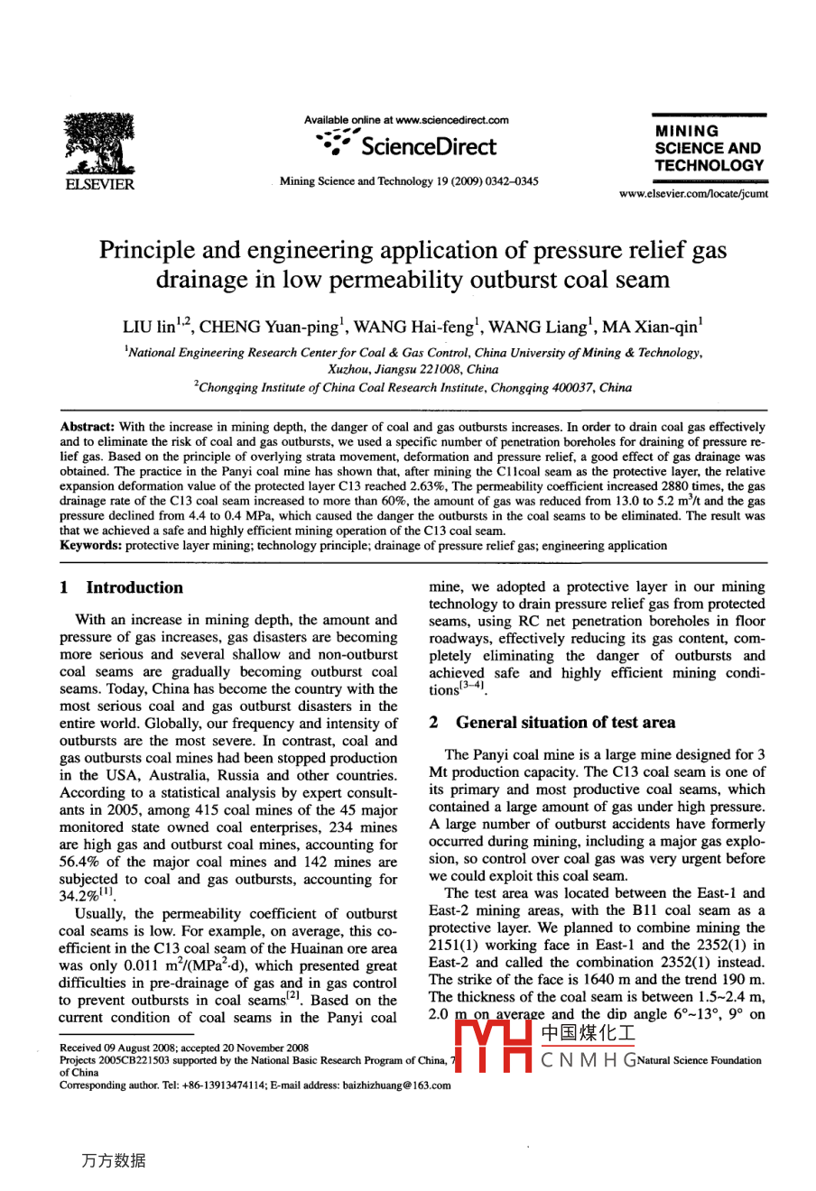 Availableonlineatwww.sciencedMININGScience DirectSCIENCE ANDTECHNOLOGYELSEVIERMining Science and Technology 19(2009)0342-0345www.elsevier.com/locate/jcurPrinciple and engineering application of pressure relief gasdrainage in low permeability outburst coal seamLIU lin, CHENG Yuan-ping, WANG Hai-feng, WANG Liang, MA Xian-qinNational Engineering Research Center for Coal& Gas Control, China University of Mining Technology,Xuzhou, Jiangsu 221008, ChinacHongqing Institute of China Coal Research Institute, Chongqing 400037, chinaAbstract: With the increase in mining depth, the danger of coal and gas outbursts increases. In order to drain coal gas effectivelyand to eliminate the risk of coal and gas outbursts, we used a specific number of penetration boreholes for draining of pressure re-lief gas. Based on the principle of overlying strata movement, deformation and pressure relief, a good effect of gas drainage wasobtained. The practice in the Panyi coal mine has shown that, after mining the Cl lcoal seam as the protective layer, the relativeexpansion deformation value of the protected layer C13 reached 2.63%, The permeability coefficient increased 2880 times, the gasainage rate of the C13 coal seam increased to more than 60%, the amount of gas was reduced from 13.0 to 5.2 m /t and the gaspressure declined from 4.4 to 0. 4 MPa, which caused the danger the outbursts in the coal seams to be eliminated. The result washat we achieved a safe and highly efficient mining operation of the C13 coal seam.Keywords: protective layer mining; technology principle; drainage of pressure relief gas; engineering application1 Introductionmine, we adopted a protective layer in our miningtechnology to drain pressure relief gas from protectedWith an increase in mining depth, the amount and seams, using RC net penetration boreholes in floorpressure of gas increases, gas disasters are becoming roadways, effectively reducing its gas content, com-more serious and several shallow and non-outburst pletely eliminating the danger of outbursts andcoal seams are gradually becoming outburst coal achieved safe and highly efficient mining condiseams. Today, China has become the country with the tionsmost serious coal and gas outburst disasters in theentire world. Globally, our frequency and intensity of 2 General situation of test areaoutbursts are the most severe. In contrast. coal andgas outbursts coal mines had been stopped productionThe Panyi coal mine is a large mine designed for 3in the USA, Australia, Russia and other countries. Mt production capacity. The C13 coal seam is one ofAccording to a statistical analysis by expert consult- its primary and most productive coal seams, whichants in 2005, among 415 coal mines of the 45 major contained a large amount of gas under high pressuremonitored state owned coal enterprises, 234 mines A large number of outburst accidents have formerlyre high gas and outburst coal mines, accounting for occurred during mining, including a major gas explo-56.4%of the major coal mines and 142 mines are sion, so control over coal gas was very urgent beforesubjected to coal and gas outbursts, accounting for we could exploit this coal seam34.2%The test area was located between the east -1 andUsually, the permeability coefficient of outbursrst East-2 mining areas, with the Bll coal seam ascoal seams is low. For example, on average, this co- protective layer. We planned to combine mining theefficient in the C13 coal seam of the Huainan ore area 2151(1) working face in East-l and the 2352(1)inwas only 0.011 m/(MPad), which presented great East-2 and called the combination 2352(1) insteaddifficulties in pre-drainagend in gas controlThe strike of the face is 1640 m and the trend 190 mto prevent outbursts in coal6 2I. Based on the The thickness of the coal seam is between 1.5-2. 4 m,current condition of coal seams in the Panyi coal 2.0e and the dip angle6°-13°,9°on中國(guó)煤化工Received o9 August 2008: accepted 20 November 2008rojects 2005CB221503 supported by the National Basic Research Program of China,CNMHGNNatural Science FoundationCorrespondingauthorTel+86-13913474114:E-mailaddressbaizhizhuang@@163.comLIU lin et aliple and engineeringtion of pressure relief gas drainageaverage. The amount of gas of the Bll coal seam is protective layer mining technology. When we mine4-7.5 m/t and it is a non-outburst coal seam. The coal seams in outburst coal mines we should firstcoal seam is stable and its geological structure simple. mine the non-outburst or low risk outburst coal seamsFully mechanized coal mining technology had been as protective layers 5-6, where the outburst coal seamadopted for the working face, designed for 2000 t/dis then called the protected layer. With protectiveThe C13 coal seam is a protected layer, located 70 layer mining, the coal and rock mass among the roofm above the bll coal seam. The corresponding test and floor moves and deforms within certain limits,working face of the protected layer consists of the which causes stress changing. Fracture fields are re-2121(3)working face in East-1 and the 2322(3)in distributed, ground stress is reduced, the coal seamEast-2(called 2121(3)2322(3)combined). The strike expands, the coal seam permeability coefficient in-is 1680 m(two faces in all) and the trend is 160 m. creases and drainage condition are created for pres-The coal seam is 5.57-6.25 m thick, 6.0 m on average, sure relief gas in the protected coal seams In the casethe dip angle 6-13 and 9 on average. The original of the Panyi mine, we drilled penetration boreholes ormeasured gas pressure was 4.4 MPa, the amount of carried out surface well drilling to drain the pressuregas 13.0 m/t and the original permeability coefficient relief gas, which caused the amount of gas and pres-only 0.011 m7(MPa. d). The coal seam was also sure to decrease significantly and the coal massstable and its geological structure simple. By draining turned hard. Naturally, gas pressure reduced to belowthe p