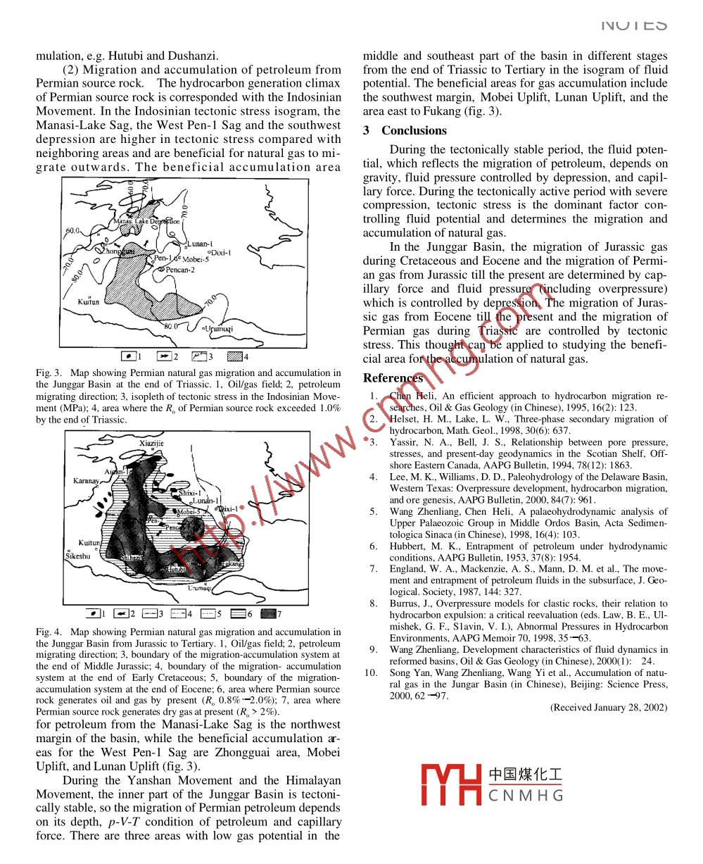 strating that the method of trend analysis of sediment grainsize is fit to the depositional area of fine-grained sedimentson large-scale continental shelf. Constant sampling intervaland suitable comparative distance(Der) are the key to leading grain size trend analysis to be reasonableInteraction of fluid dynamicAcknowledgements This work was supported by the Project of"China- factors in the migrationific Foundation of State Oceanic Administration( Grant No. 97401)and accumulation ofReferencesnatural gas1. Mclaren, P, An interpretation of trends in grain size measurements,Journal of Sedimentary Petrology, 1981, 51: 6112. Mclaren, P, Bowles, D, The effects of sediment transport on grainSONG Yan2, XIA Xinyu, WANG Zhenliang,WANG Yi%& HU Shengbiao53 SIze distribution, Journal of Sedimentary Petrology, 1985, 55: 457t sediment transport patterns inferred from 1. Research Institute of Petroleum Exploration and Development, Beijinggrain-size trends, based upon definition of"transport vectors"-reply,100083 China.Institute of Geochemistry, Chinese Academy of Sciences, Guiyan50002. China4. Gao, S, Collins, M, Analysis of grain size trends, for defining 3. Northwest University, Xi'an 710069, Chinasediment transport pathways in marine environments, Journal 4. Chinese University of Petroleum, Dongying 257062, China;Coastal Research, 1994. 10: 705. Institute of Geology, Chinese Academy of Sciences, Beijing 1000295. Gao Shu, Collins, M, Sediment grain size trend and marine sediment dynamics, Chinese Scientific Foundation(in Chinese), 1998 Correspondence should be addressed to Song Yan(e-mail: sya@ petro-12(4):2416. Cheng Peng, Gao Shu, Characteristics of grain size parameters and Abstract The migration of fluid petroleum gas, describecnet transport trend of seabed sediments in the North Yellow Sea, as fluid potential, depends only on gravity, fluid pressure con-Oceanologia et Limnologia Sinica(in Chinese), 2000, 31(6): 604trolled by depression and capillary force during tectonically7. Qin Yunshan, Zhao Yiyang, Chen Lirong et al., Geology of the stable period; but on tectonic stress during the tectonicallyYellow Sea (in Chinese). Beijing: China Ocean Press, 1989, 65- active period with severe compression. This method is appliedin the junggar Basin, showing that the migration of Jurassic8. Liu Minhou, Wu Shiying, Wang Yongi et al., Late Quaternary gas during Cretaceous and Eocene and the migration of perGeology of the Yellow Sea (in Chinese), Beijing: China Oceanmian gas from Jurassic till the presetermined byPres,1987,24-44;362-70capillary force and fluid pressure (including overpressure)whi-ch is controlled by depression; the migration of jurassic gas9. Zhao Yiyang, Li Fengye, Qin Chaoyang et al., Discussion on the from Eocene till the present and the migration of Permian gassource origins and genesis of the Central Southern Yellow Sea Mud, during Triassic are controlled by tectonic stress10.Park, Y.A., Origin and Distribution patterns of Muddy Deposits in Keywords: petroleum migration, fluid potential, tectonic stress, fluidthe Yellow Sea, Proceedings of the First International Conferencpressure, Junggar Basin.on Asian Marine Geology, Beijing: China Ocean Press, 1990, 335350.Petroleum migration is one of the most significant11. Shen Shunxi, Li Anchun, Yuan Wei, Discovery of the cold water problems in basin analysis and petroleum exploration. Thegyre and channel deposits in the southern Yellow Sea, Oceanologia research of fluid dynamic history is an efficient methodet Limnologia Sinica( in Chinese), 1993. 24(6): 563.study petroleum migration and accumulation l. .Natural12. Tang Yuxiang, Zou Emei, Lee Heungjae, Characteristics of circula- gas migration is influenced directly or indirectly by thetion in the South Yellow Sea, Acta Oceanologia Sinica (in Chinese), following physical conditions of fluid and solid in the strata2000,22(1):1the buoyancy of hydrocarbon, formation water kinetic po13. Hu, D. X. Some striking features of circulation in Huanghai Sea tential, capillary forces, fluid pressure, tectonic stress andd East China Sea, Oceanology of China Sea, 1994, 1: 27elys). Mathematical and physical simulations were applied(Received February 21, 2002) in petroleum migration and accumulation study consideringsome of the above physical parameters in some basins 4.51However中國煤化工rbon buoyancy andfluid pressisSure brougCN MH Grocarbon generationduring depression) are considered in detail while the othertwo important factors of tectonic stress and capillary forceare usually omitted. The interaction of these factors lacksChine丹與數(shù)據(jù)?l∥ tin Vol47No14l?0021207de t ailed eI n gravity and fluid pressure, while the effect of capillaryfact, during most conditions of migration, petroleum is force is not obvious. For lateral migration, gravity and fluidunwettable to the surface of rock pore, the significance of pressure change slowly, thus capillary becomes the mostcapillary force cannot be omitted; besides, in the compress important factor controlling the migration and accumulationbasins in the western part of China, tectonic stress played of natural gas. It determines the migrating direction andan important role in petroleum migration and needs more accumulation area where migration stops. Due to the restriction of data acquisition, capillary force is totally omit-In this note, the interrelationship between the factors ted in some cases of basin simulation, so the oil potential orinfluencing the migration and accumulation of natural gas gas potential may be only correspond to structural surface,is studied theoretically. The results were applied in the which is not able to reflect the direction of petroleum miJunggar Basin as an examplegrationInterrelationship between the factors influencing theFrom formula(2), in order to gain the accurate valuemigration and accumulation of natural gasof capillary force, the radii of pore and throat should beanalyzed, meanwhile the surface tension of unw