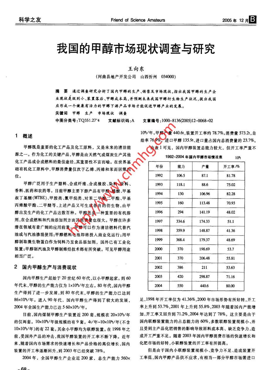 科學之友Friend of Science Amateurs2005年12月B我國的甲醇市場現(xiàn)狀調(diào)查與研究王向東(河曲縣地產(chǎn)開發(fā)公司山西忻州 034000)摘要通過調(diào)查研究分析了國內(nèi)甲醇的生產(chǎn)、銷售及市場現(xiàn)狀,指出我國甲醇的生產(chǎn)企業(yè)現(xiàn)狀是級別小、裝置落后、甲醇成本高,并預測未來我國甲醇衍生物生產(chǎn)狀況,提出我國應形成一個健康有活力的甲醇下游產(chǎn)品市場才能促進甲醇產(chǎn)業(yè)的發(fā)展。關鍵詞甲醇生產(chǎn)市場現(xiàn)狀調(diào)查中團分類號:TQ351.27*4文獻標識碼:A文章編號:1000 -8136(2005)12- 0068-0210/年。甲醇產(chǎn)量440.6t,裝置開工率約78.7%。 消費量573.2t,自1概述給率76.9%。進口甲醇135.91,進口量占國內(nèi)總消費量的23.7%。甲醇既是重要的化工產(chǎn)品及化工原料,又是未來的清潔能由表1可見,國內(nèi)甲醇裝置總能力較大,但開工率嚴重不源之一。作為化工的關鍵產(chǎn)品,甲醇是由天然氣或煤炭生產(chǎn)其他1992-2004年國內(nèi)甲醇市場情況表04化工產(chǎn)品或合成燃料的最佳途徑,其重要性不言而喻。在世界基年份能力產(chǎn)量開工率1%礎有機化工原料中,甲醇消費量僅次于乙烯、丙烯和苯而居第四位。1992106.587.181.78甲醇廣泛用于生產(chǎn)塑料、合成纖維、合成橡膠、染料、涂料、1993118.188.6香料、醫(yī)藥和農(nóng)藥等。目前甲醇主要下游產(chǎn)品有甲醛、醋酸、甲基1994130106.9682.28叔丁基醚(MTBE)、甲胺類、氯甲烷類、對苯二甲酸二甲酯、甲基1995160113.4870.93丙烯酸甲酯、二甲醚等,上述產(chǎn)品又可生成各自的衍生物,由甲醇出發(fā)生產(chǎn)的化工產(chǎn)品達數(shù)百種。甲醇還是一種重要的有機溶1996294141.1948.02劑,在合成燃料和汽油添加劑方面其消費量也很大。甲醇在許多1997334.6174.3351.1潛在領城有著廣闊的應用前景:甲醇可以作為清潔燃料代替汽1998359.9148.8741.36油或與汽油摻混使用;甲醇燃料電池即將投人商業(yè)化運行;用甲368.4179.37醇制取微生物蛋白作為飼料乃至食品添加劑,國外已有工業(yè)化裝置;甲醇制汽油及甲醇制烯烴技術(shù)都有所突破??梢娂状加猛?70198.69 .53.7相當廣泛。2001206.4855.812國內(nèi)甲醇生產(chǎn)與消費現(xiàn)狀200238621153.63國內(nèi)甲醇生產(chǎn)起始于20世紀60年代,以小甲醇起家。到602003298.8771.16年代末,甲醇的生產(chǎn)能力僅為1x10V年左右。80年代,國內(nèi)甲醇2004550440.680.00生產(chǎn)得到了進-步發(fā)展,到80年代末,甲醇的生產(chǎn)能力已達到86x10/年。進入90年代,國內(nèi)甲醇生產(chǎn)得到了較大的發(fā)展,足,1998年開工率僅為41.36% ,2000年市場形勢有所好轉(zhuǎn),開工2004年全國生產(chǎn)能力已達5 60x10V年。率上升到53.7% ,2001年上升到55.8% ,2003年隨著國內(nèi)產(chǎn)能增目前,國內(nèi)煤制甲醇生產(chǎn)裝置近200套,規(guī)模在20x104V年加,開工率又回升到71.2% ,2004年達到了78%。這主要是由于的僅兩套。10x10/年級規(guī)模的有9套。4U/年-10x10/年(不含國內(nèi)聯(lián)醇裝 置能力約占總能力的60%,多數(shù)聯(lián)醇裝置規(guī)模小、并10x10/年)的有22套。其余小甲醇均為聯(lián)醇裝置。在1998 年之且受到主產(chǎn)品化肥銷售的影響導致原料成本高、缺乏競爭力,造前,受國外產(chǎn)品的沖擊,我國甲醇裝置的開工率不斷下降。近年成開工嚴重不足。隨著2003年國內(nèi)甲醇消費市場的快速增長和來,隨著國內(nèi)市場需求的快速增長和產(chǎn)品價格的高位增長,國內(nèi)化肥市場的好轉(zhuǎn),小聯(lián)醇裝置的開工率有所提高。裝置的開工率逐漸回升,到2003年已經(jīng)突破78%。但是由于國內(nèi)小聯(lián)醇裝置規(guī)模小、競爭力不足、造成裝置開2004年,全國甲醇生產(chǎn)企業(yè)近200家,總生產(chǎn)能力560x工率低 ,國內(nèi)甲醇產(chǎn)品供不應求,有相當一部分甲醇市場儒進口68-王向東:我國的甲醇市場現(xiàn)狀調(diào)查與研究新經(jīng)濟.產(chǎn)品來滿足.而大量進口產(chǎn)品加劇了對國內(nèi)甲醇行業(yè)的沖擊,因醇約占國內(nèi)總進口量的60%以上。此,國內(nèi)新建裝置必須是規(guī)模大的裝置才有競爭力。近年國內(nèi)甲醇價格波動較大,最低時低于1 300元/,最高時超過3000元/t,變動范圍超過100%。國內(nèi)甲醇價格的大幅度3國內(nèi)甲醇市場供求現(xiàn)狀與需求預測波動主要是受到國際市場價格的影響,同時也與國內(nèi)甲醇需求3.1甲醇 市場供求狀況旺盛,裝置技術(shù)水平及規(guī)模提高競爭力增強有關。2000年以來,我國甲醇生產(chǎn)裝置主要以煤、焦為原料,生產(chǎn)技術(shù)以合成氨隨著世界原油市場的大幅度上漲,甲醇價格也一路上揚,進口平聯(lián)產(chǎn)甲醇工藝為主。這些能力的形成主要是在20世紀90年代均價格超過140美元/,國內(nèi)甲醇價格也開始走高,甲醇價格曾中期,當時甲醇國際市場價格超過300美元/t,國內(nèi)有些地區(qū)市超過2000元/t,2001年國內(nèi)價格又開始回落,企業(yè)出廠價最高場價格超過了3000元,國內(nèi)中、小型合成氨廠紛紛建設聯(lián)醇生為1873元/t,最低為1393元/t,均價在1 550元/~1750元/t產(chǎn)裝置。但是90年代末期隨著國際甲醇市場價格的降低和趨左右。進入2002年以后,甲醇價格止跌回升,進人2003年后市穩(wěn),這些裝置很快失去了競爭力,從而造成近年來我國甲醇表觀場甲醇價格有所回落,但