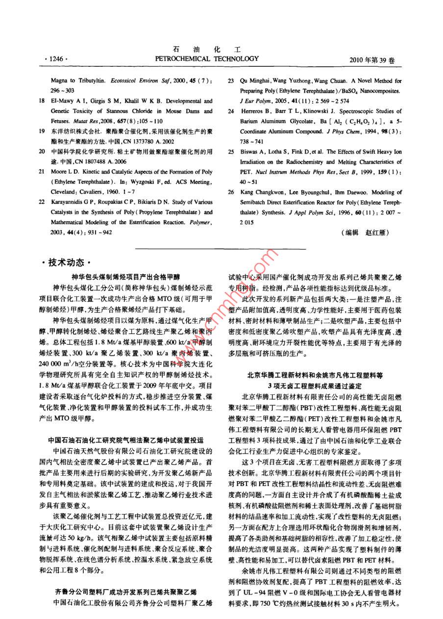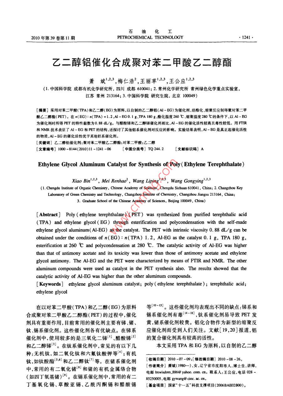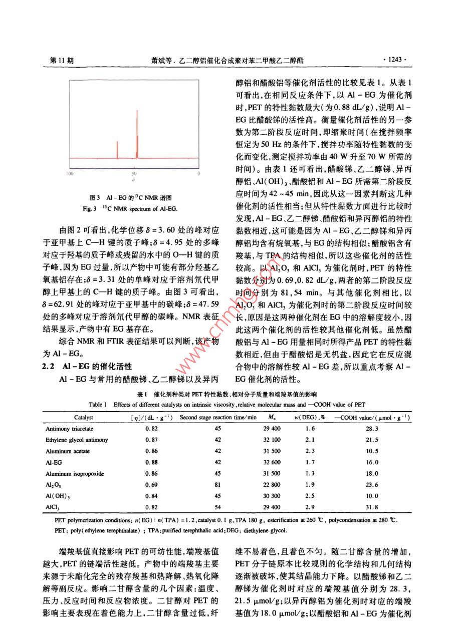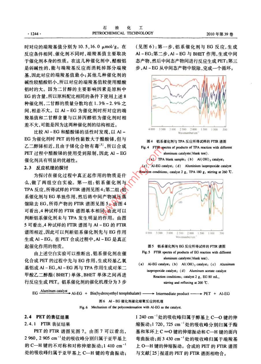 2010年第39卷第11期PETROCHEMICAL TECHNOLOGY1241乙二醇鋁催化合成聚對苯二甲酸乙二醇酯蕭斌!23,梅仁浩2,王麗蘋123,王公應(yīng)12,3(1.中國科學(xué)院成都有機(jī)化學(xué)研究所,四川成都610041;2.常州化學(xué)研究所常州綠色化學(xué)重點(diǎn)實(shí)驗(yàn)室,江蘇常州213164;3.中國科學(xué)院研究生院,北京100049)[摘要]采用對苯二甲酸(TPA)和乙二醇(EG)為原料以自制的乙二醇鋁(A-EG)為催化劑,經(jīng)酯化、縮聚反應(yīng)制得豪對苯二甲酸乙二醇酯(PET)。在n(EG):n(TPA)=1.2、A-EG0.,1g、TPA180g、酯化溫度260℃、縮聚溫度280℃的條件下,以A-EG為催化劑時(shí)所得PET的特性黏數(shù)為088dLg。與醋酸銻和乙二醇銻催化劑相比,A-EG的催化活性較高且毒性較低。用FTR和NMR技術(shù)表征了A-EG和PET的結(jié)構(gòu),還探討了其他鋁系催化劑對反應(yīng)的影響。實(shí)驗(yàn)結(jié)果表明,A-EG是真正起催化活性的物質(zhì),A-EG的催化活性優(yōu)于其他鋁系催化劑。關(guān)鍵詞]乙二醇鋁催化劑;聚對苯二甲酸乙二醇酯;對苯二甲酸;乙二醇文章編號]1000-8144(2010)11-1241-06中圖分類號]TQ24.2[文獻(xiàn)標(biāo)識碼]AEthylene Glycol Aluminum Catalyst for Synthesis of Poly( Ethylene TerephthalateXiao Bin2. 3, Mei Renhao, Wang Liping".2. 3, Wang Gongying".,3(1. Chengdu Institute of Organic Chemistry, Chinese Academy of Sciences, Chengdu Sichuan 610041, China; 2, Changzhou KeyLaboratory of Green Chemistry and Technology, Changzhou Institute of Chemistry, Changzhou Jiangsu 213164, China;3. Graduate School of the Chinese Academy of Sciences, Beijing 100049. China)Abstract] Poly( ethylene terephthalate)( PET) was synthesized from purified terephthalic acid(TPA)and ethylene glycol( EG through esterification and polycondensation with the self-madethylene glycol aluminum( Al-EG) as the catalyst. The PEt with intrinsic viscosity 0. 88 dl/g can beobtained under the conditions of n(EG ): n(TPA)1. 2, Al-EG as the catalyst 0. 1 g, TPAesterification at 260 C and polycondensation at 280 C. The catalytic activity of Al-EG was higherthan that of antimony acetate and its toxicity was lower than those of antimony acetate and ethyleneglycol antimony. The Al-EG and the PEt were characterized by means of FTiR and NMr. The otheraluminum compounds were used as catalyst in the PEt synthesis also. The results showed that thecatalytic activity of Al-EG was higher than the other aluminum compoundsKeywords] ethylene glycol aluminum catalyst; poly( ethylene terephthalate ) terephthalic aciethylene glycol在以對苯二甲酸(TPA)和乙二醇(EG)為原料等1。這些催化劑均表現(xiàn)出不同的缺點(diǎn):銻系和合成聚對苯二甲酸乙二醇酯(PET)的過程中催化錫系催化劑有毒-1,鈦系催化劑易導(dǎo)致PET發(fā)劑具有重要作用,目前常用的催化劑主要有銻、鍺、黃鍺系催化劑較貴。鋁化合物作為新型的縮聚反鈦、錫系催化劑。這些催化劑各有優(yōu)缺點(diǎn)。在銻系應(yīng)催化劑而受到人們關(guān)注。文獻(xiàn)[19,20]報(bào)道,鋁催化劑中,使用較多的是三氧化二銻、醋酸銻21的復(fù)合催化劑具有較高的活性。和乙二醇銻3。在鈦系催化劑中,常見的有以下幾本文采用TPA和EG為原料以自制的乙二醇種:無機(jī)鈦,如二氧化鈦和六氟鈦酸鉀等“;有機(jī)鈦,如鈦酸酯6和乙二醇鈦等。在鍺系催化劑收確日期20107-0,修改稿日期208-26中,常用的有二氧化鍺和鍺的有機(jī)金屬絡(luò)合物作者簡介]蕭斌(1980—),女,遼寧省市沈陽市人,博士生,講師電郵 wisdom886@ yahoo.,com,cn。聯(lián)系人:王公應(yīng),電話028(如四丁氧基鍺)°。在錫系催化劑中常用的有二800電郵 ang( cioc. ac cn丁基氧化錫、草酸亞錫、乙酰丙酮錫和醋酸錫[基金項(xiàng)目]國家“十一五”科技支撐項(xiàng)目(206BAzB)石油化工1242PETROCHEMICAL TECHNOLOGY2010年第39卷鋁(A-EG)為催化劑,經(jīng)酯化縮聚反應(yīng)制得PET;可看出,2933.37,287.81cm處的吸收峰分別歸用FTR和NMR技術(shù)對A-EG和PET的結(jié)構(gòu)進(jìn)屬于亞甲基上C-H鍵的不對稱和對稱伸縮振動;行了表征;并對反應(yīng)機(jī)理進(jìn)行了探討。14628cm處的吸收峰歸屬于亞甲基上C-H1實(shí)驗(yàn)部分鍵的彎曲振動;890.47cm處的吸收峰歸屬于兩個(gè)亞甲基相連的C_C鍵的平面搖擺振動;11主要試劑1090.19,1043.89cm-1處的吸收峰歸屬于醇基上EG,TPA:工業(yè)級,華潤公司,用前未經(jīng)提純;異C-O鍵的伸縮振動,這說明產(chǎn)物中存在EG基,EG丙醇鋁:分析純成都市科龍化學(xué)試劑廠;其他試劑基是A-FG中的官能團(tuán);658.03cm處的吸收峰均為分析純,市售。歸屬于Al-O鍵的伸縮振動。FTR表征結(jié)果顯12A-EG的合成示,產(chǎn)物為A-EG用異丙醇鋁與EG在一定條件下進(jìn)行醇交換反由圖1還可看出,3323.95cm處出現(xiàn)了強(qiáng)而應(yīng),一步合成A-EG。此反應(yīng)為可逆反應(yīng),為了使寬的羥基OH鍵的伸縮振動吸收峰,與EG相比,反應(yīng)向正向進(jìn)行需采取原料過量或移出反應(yīng)產(chǎn)物A-BG的該吸收峰強(qiáng)度明顯減弱,但A-EG中依的措施。本實(shí)驗(yàn)釆用EG過量和同時(shí)移出產(chǎn)物異丙然存在該吸收峰,說明異丙醇鋁與EG發(fā)生醇基交醇的方法合成A-BG。將計(jì)量的異丙醇鋁和EG加換時(shí)只有一端的羥基發(fā)生了反應(yīng),這可能是因?yàn)樵谌肴i瓶中,三頸瓶置于油浴鍋中,加熱攪拌下進(jìn)行反應(yīng)過程中EG過量。上述特征吸收峰與文獻(xiàn)[24]反應(yīng),控制溫度,冷凝回流,同時(shí)收集蒸餾出的異丙報(bào)道的A-EG的特征吸收峰相符。醇;反應(y