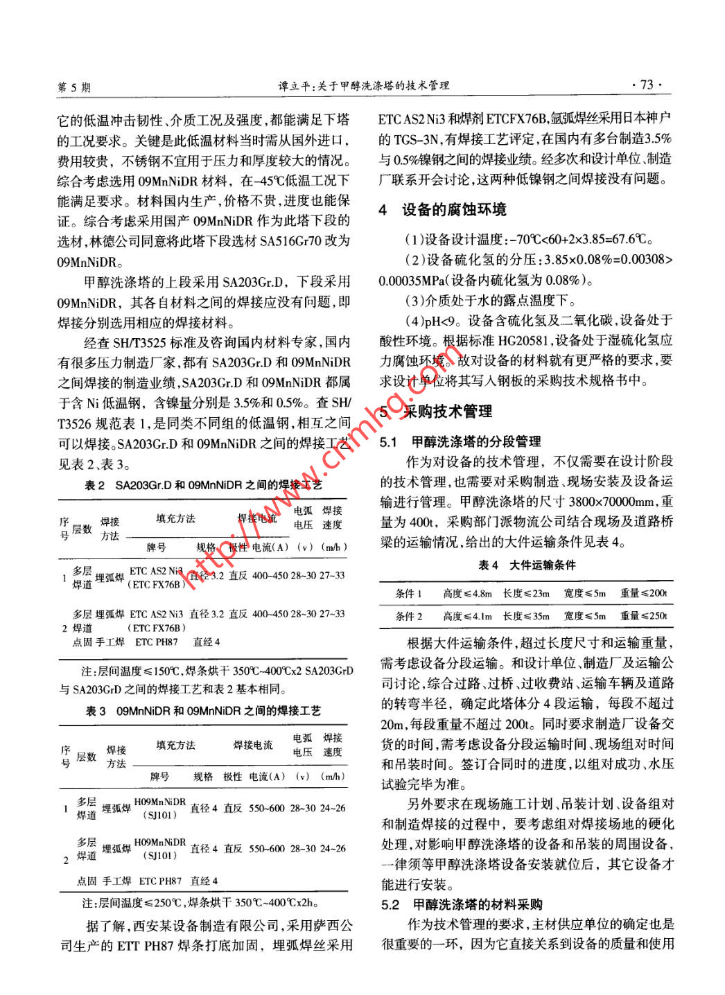 第11卷第5期神華科技2013年9月.VOL1I NO.5Sep.2013關(guān)于甲醇洗滌塔的技術(shù)管理譚立平(中國(guó)神華煤制油化工有限公司北京工程分公司,北京, 10011)摘要: 在合成氣凈化裝置中,甲醇洗滌塔是凈化單元非常重要的一臺(tái)設(shè)備,由于其壓力高(中壓 .3.8MPa),又是低溫容器(-70C),為了保證設(shè)備在生產(chǎn)過(guò)程中長(zhǎng)周期運(yùn)行,在設(shè)計(jì)、制造和安裝過(guò)程中,須全程進(jìn)行管理,本文主要論述甲醇洗滌塔的技術(shù)管理。關(guān)鍵詞:甲醇洗滌塔材料管理焊接中圖分類(lèi)號(hào):TQ2文獻(xiàn)標(biāo)識(shí)碼:B文章編號(hào):1674-8492(2013 )05- -072- -04的材料,在設(shè)計(jì)制造方面有特殊的補(bǔ)充要求。1前言塔體的上段選材,根據(jù)甲醇洗滌塔的設(shè)備工況,在工程公司的項(xiàng)目設(shè)備管理中,由于管理的內(nèi)須選擇低溫壓力容器用鋼。09MnNiDR是國(guó)內(nèi)最好的容較多,需和公司各專(zhuān)業(yè)工程技術(shù)人員、設(shè)計(jì)單位技抗低溫Ni鋼板,含Ni量0.5%,它的使用溫度為-70C。術(shù)人員施工單位技術(shù)人員、制造單位技術(shù)人員進(jìn)行而塔上段的設(shè)計(jì)溫度為-70C,沒(méi)有溫度富裕。另外溝通與聯(lián)系,解決設(shè)備的設(shè)計(jì)、采購(gòu)、.制造和安裝等09MnNiDR根據(jù)GB3531-96標(biāo)準(zhǔn),國(guó)內(nèi)鋼廠此材料一系列問(wèn)題。因煤制氫裝置需管理的設(shè)備較多,本文最大鋼板厚度不超過(guò)60mm( GB3531- -2008標(biāo)準(zhǔn)鋼板論述煤制氫的重要設(shè)備一甲 醇洗滌塔設(shè)備的技術(shù)最大厚度可用到120mm),沒(méi)有厚度富裕,且國(guó)內(nèi)當(dāng)管理。時(shí)09MnNiDR用于設(shè)計(jì)溫度為-70C的業(yè)績(jī)不多。當(dāng)時(shí)該鋼種只用到-50C的低溫,-70C未實(shí)際使用2甲醇洗滌塔的設(shè)備參數(shù)過(guò),焊接工藝稍有不當(dāng),-70C的沖擊功達(dá)不到標(biāo)準(zhǔn)甲醇洗滌塔是低溫甲醇洗單元中的主要設(shè)備之要求(現(xiàn)在09MnNiDR已有多年使用業(yè)績(jī),可用于一。甲醇洗滌塔的設(shè)備數(shù)據(jù):工藝介質(zhì):變換合成氣+此工況)。甲醇,上段設(shè)計(jì)溫度約為- -709C,下段設(shè)計(jì)溫度約為查ASME2004《鐵基材料》SA20表A2.15中低溫-45C,上下段設(shè)計(jì)壓力都為3.8MPa,直徑約為3.8m。材料,知SA662及SA537的含NI量較低,在厚度50~此塔為板式吸收塔,利用低溫甲醇吸收二氧化碳及硫75mm范圍內(nèi),使用溫度為-60以上(在滿足沖擊功化氫能力強(qiáng)的特點(diǎn),塔的上段甲醇吸收變換工藝氣體的前提下),也不滿足設(shè)計(jì)工況的要求。SA203Gr A、B中二氧化碳(塔下切線至上下段連接焊縫約42m),塔含Ni量2.5%,在滿足平均沖擊功20J的條件下,最的下段甲醇吸收工藝氣體中的硫化氫(塔上切線至.大使用厚度為60mm,不滿足鋼板厚度要求。上下段連接焊縫約19m)。此塔筒體兩切線相距約SA203Gr.D的焊Ni量為3.5% ,在設(shè)備壁厚50~75mm61m,塔內(nèi)設(shè)雙溢流塔盤(pán),第二類(lèi)壓力容器(見(jiàn)表1)。范圍內(nèi),能用于-879C以上(即沖擊功符合標(biāo)準(zhǔn)規(guī)范表1變換合成 氣進(jìn)入甲醇洗滌塔前的化學(xué)成份( % )要求)的溫度。故此遵照林德工藝要求,塔上段為SA203Gr.D。HCCO2HS+COS塔體下段選材必須能耐-45C的低溫,國(guó)內(nèi)材料55.0138.50.08 .5.4216MnDR只能用于-40C的工況,不滿足要求。SA516Gr70在-45C工況下,使用鋼板厚度上限為3塔體的選材35mm(查2004ASME規(guī)范),即使用厚度≤35mm。甲醇洗滌塔的選材,在設(shè)備技術(shù)管理中非常重根據(jù)相關(guān)規(guī)范進(jìn)行計(jì)算,塔體下段其計(jì)算厚度需要,國(guó)內(nèi)有專(zhuān)門(mén)的低溫鋼標(biāo)準(zhǔn)規(guī)范(如GB150附錄C56mm,顯然下段采用SA516Gr70材質(zhì)也不能滿足要.和HGT20585)。國(guó)外在ASME規(guī)范中,對(duì)低溫鋼部分求。下段可以采用SA203Gr.D .SA662及SA537材料,.●74.神蕭科技第5期壽命。由于SA203Gr.D是ASME標(biāo)準(zhǔn)中的低溫鋼,國(guó)分各占50%。主要評(píng)分內(nèi)容包括:制造資質(zhì)文件、設(shè)內(nèi)的壓力容器鋼板生產(chǎn)廠一舞陽(yáng)鋼廠 、武鋼和重備供貨范圍和工作范圍、設(shè)備的卷板能力、熱處理爐鋼,當(dāng)時(shí)沒(méi)有生產(chǎn)3.5Ni容器鋼板的業(yè)績(jī)(舞陽(yáng)鋼廠能力、吊裝能力、焊接機(jī)具及射線能力、現(xiàn)場(chǎng)組對(duì)能2007年后開(kāi)始試生產(chǎn)SA203E),SA203Gr:D只能進(jìn)口。力、交貨進(jìn)度等。經(jīng)詢價(jià)后,參加投標(biāo)的單位都是國(guó)據(jù)調(diào)查國(guó)外的制造廠一德國(guó)的迪林根和韓國(guó)的浦內(nèi)制造壓力容器的知名廠家,由專(zhuān)家委員會(huì)評(píng)審打項(xiàng)制鐵,都有制造此材料的業(yè)績(jī),生產(chǎn)SA203GrD的沖分。因西安某設(shè)備有限公司有較多制造SA203Gr.D和擊功都在100J以上,故選擇這兩家為生產(chǎn)SA203Gr.D09MnNiDR壓力容器的業(yè)績(jī),最后確定為甲醇洗滌塔鋼板的候選單位(見(jiàn)表5)。.的供貨廠家。表5實(shí)際供應(yīng)的韓國(guó)浦項(xiàng) 制鐵的SA203Gr.D化學(xué)成份機(jī)械性能6設(shè)備管理 中的審圖機(jī)械性能化學(xué)成份設(shè)備管理中的審圖,是在設(shè)計(jì)階段技術(shù)管理中的Mpa,%)零下87度硬(%)重要的一環(huán)。審圖管理和設(shè)計(jì)單位的校