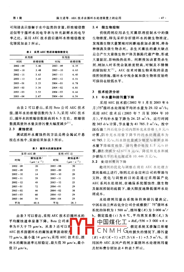 第24卷第1期石化技術(shù)與應(yīng)用Vol 24 No. 12006年1月Petrochemical Technology Application環(huán)境工程(46~48)AEC技術(shù)在循環(huán)水處理裝置上的應(yīng)用陳文遒',王道溫',賴(lài)?yán)^章',王強(qiáng)(1.中國(guó)石漁“州石化分公司合成橡膠廠,甘肅蘭州730012,中國(guó)石油蘭州石化分公司石能化⊥廠,甘肅蘭州73000摘要:報(bào)道了AEC( Alkyl Epoxy Carboxylate,環(huán)氧化烷基酸鹽)非有機(jī)磷系循環(huán)水處理技術(shù)在中國(guó)石油蘭州石化分公司合成橡膠廠75°循環(huán)水場(chǎng)的工業(yè)應(yīng)用情況。應(yīng)用結(jié)果表明:循環(huán)水的濃縮倍數(shù)由2.9上升到6.18;系統(tǒng)的補(bǔ)水量由2902Uh下降到24.25h;系統(tǒng)的腐蝕速率由14-72pm/a下降為23-30μm/a;采用國(guó)產(chǎn)AFC系水處理劑,藥劑費(fèi)可降低11.453萬(wàn)元/a;設(shè)備維修、更新費(fèi)下降16萬(wàn)元/a;總經(jīng)濟(jì)效益37.9萬(wàn)元/a。關(guān)鍵詞:浙環(huán)水;AFC技術(shù);環(huán)氧化烷基羧酸鹽;濃縮倍數(shù);緩蝕;阻垢中圖分類(lèi)號(hào):X783文獻(xiàn)標(biāo)識(shí)碼:B文章編號(hào):1009-0045(2006)01-0046-02003年7月前,中國(guó)石油蘭州石化分公司合藥量由排污量決定成橡膠廠75°循環(huán)水場(chǎng)采用的是有機(jī)膦系水處理配方,緩蝕除垢劑為羥基亞乙基二磷酸(HEDP)、2使用結(jié)果基亞乙基二磷酸(AEDP)和七水硫酸鋅,殺菌2.1控制系統(tǒng)運(yùn)行情況滅藻劑為優(yōu)氯凈和火菌靈。由于配方有局限性,藥劑加入量及加藥方式如表1所以一些頑固菌類(lèi)在一定條件下仍有機(jī)會(huì)快速表1AEC配方的藥劑加入量及加藥方式繁殖,從而造成黏泥量增加,水質(zhì)濁度偏高。另外,從蘭州地區(qū)自來(lái)水廠送來(lái)的補(bǔ)充新鮮水易結(jié)藥劑加人加藥方式垢,硬度較高。為了防止用戶(hù)的裝置結(jié)垢,濃縮連續(xù)倍數(shù)一般控制在2.5~3.5。大量排污造成補(bǔ)充20水用量偏高。自2004年7月16日使用AEC水93%-%%以滋控在.G-8.6處理技術(shù)以來(lái),平均濃縮倍數(shù)達(dá)到6.18,循環(huán)水優(yōu)氧凈余氨為0.102x10斷投尾濁度小于40mg/La系統(tǒng)觀察和數(shù)據(jù)分析結(jié)果顯示,處理效果滿(mǎn)1AEC技術(shù)意,在線監(jiān)測(cè)儀表運(yùn)行可靠,北京金應(yīng)利公司的AEC處理技術(shù)是集緩蝕阻垢和微生物控制專(zhuān)用控制軟件運(yùn)行正常。為一體的先進(jìn)控制技術(shù),采用溶解性和穩(wěn)定性?xún)?yōu)2.2濃縮倍數(shù)異且不含磷的AEC和HPS-1控制設(shè)備的結(jié)垢和濃縮倍數(shù)為濃縮循環(huán)水含鹽量(Ss)與補(bǔ)充腐蝕。AEC是 Alkyl Epoxy Carboxylate(環(huán)氧化烷新鮮水含鹽量(Sn)的比值,即濃縮倍數(shù)=Sa基羧酸鹽)的詞頭縮寫(xiě)。AEC不但能S含鹽量是水中各種陽(yáng)離子和陰離子的總量。碳酸鈣結(jié)垢,而且能延緩鋼質(zhì)設(shè)中國(guó)煤化工較大考慮到溶解于水中的HPS-l是Beu公司專(zhuān)利產(chǎn)品,屬聚劑,可將膠體顆粒包圍起來(lái)穩(wěn)定地CNMHG存在,具有導(dǎo)電性電導(dǎo)率防止結(jié)垢和沉積。在理論上AEC在水中的停留時(shí)間沒(méi)有限制。傳統(tǒng)有機(jī)膦酸鹽水處理方案的收禍日期:2005-04-14;修回日期:2005-08-15作者簡(jiǎn)介:陳文道(1969-),男,助理工程師,甘肅永登加藥量由補(bǔ)充水水量決定,AEC水處理方案的加事公用工程工作第1期陣文道等,AEC技術(shù)在循環(huán)水處理裝置上的應(yīng)用可間接表示溶解于水中鹽類(lèi)的含量,即濃縮倍數(shù)2.4微生物控制近似等于循環(huán)水的電導(dǎo)率與補(bǔ)充新鮮水的電導(dǎo)傳統(tǒng)藥劑應(yīng)用殺生滅藻原理控制水中的微率之比。采用AEC技術(shù)前后循環(huán)水濃縮倍數(shù)變生物濃度,即先采樣分析循環(huán)水的微生物濃度化情況如表2所示。發(fā)現(xiàn)微生物大量繁殖時(shí)間斷地投加殺菌劑,將各種細(xì)菌及微生物殺死。殺生滅藻法的最大缺點(diǎn)表2采用AEC前后濃縮倍數(shù)變化是會(huì)產(chǎn)生大量微生物尸體及新陳代謝產(chǎn)物,形成濃縮倍數(shù)濃縮倍數(shù)大量黏泥,影響換熱效果。間斷投加鹵素類(lèi)殺生2002-03.46200065劑剛加入時(shí)系統(tǒng)余氯濃度較高,對(duì)銅及不銹鋼2002=10的腐蝕較大(2)。AFC技術(shù)對(duì)微生物采取的是連2002-11續(xù)控制措離,循環(huán)水中殘余氯和微生物濃度始終2002-122003-12可保持在較低水平3技術(shù)經(jīng)濟(jì)分析3.1補(bǔ)水量和排污量下降采用AEC技術(shù)前(2002年1月至2003年6由表2可以看出,采用Be公司AEC技術(shù)月)75'循環(huán)水處理場(chǎng)平均補(bǔ)水量為29.02m3/h;前,循環(huán)水的濃縮倍數(shù)約為3.3;采用AEC技術(shù)采用AEC技術(shù)后(2003年7月至2004年10后,循環(huán)水的濃縮倍數(shù)提高到6.5左右。濃縮倍月),平均補(bǔ)水量下降為24.25m3/h。運(yùn)行時(shí)間數(shù)提高使補(bǔ)水量及排污量大幅度減少口。按365d/a計(jì)算,節(jié)水量為41785.2m3/a。按中2.3腐蝕狀況國(guó)石油蘭州石化分公司內(nèi)部補(bǔ)充水價(jià)格1.0元/t測(cè)試循環(huán)水腐蝕性的方法是將金屬試片懸計(jì)算,因補(bǔ)充水用量下降節(jié)約的水處理成本為掛在水池中,實(shí)驗(yàn)結(jié)果如表3所示。41785.2元/a。污水排放量減少幅度與新鮮水補(bǔ)水量下降幅度相等。排污費(fèi)價(jià)格按1.5元/t計(jì)表3循環(h