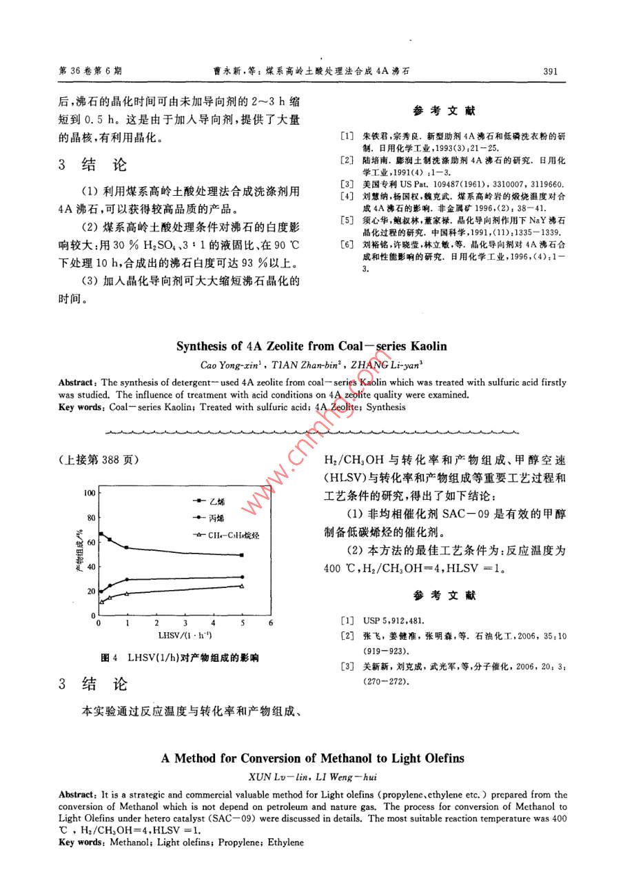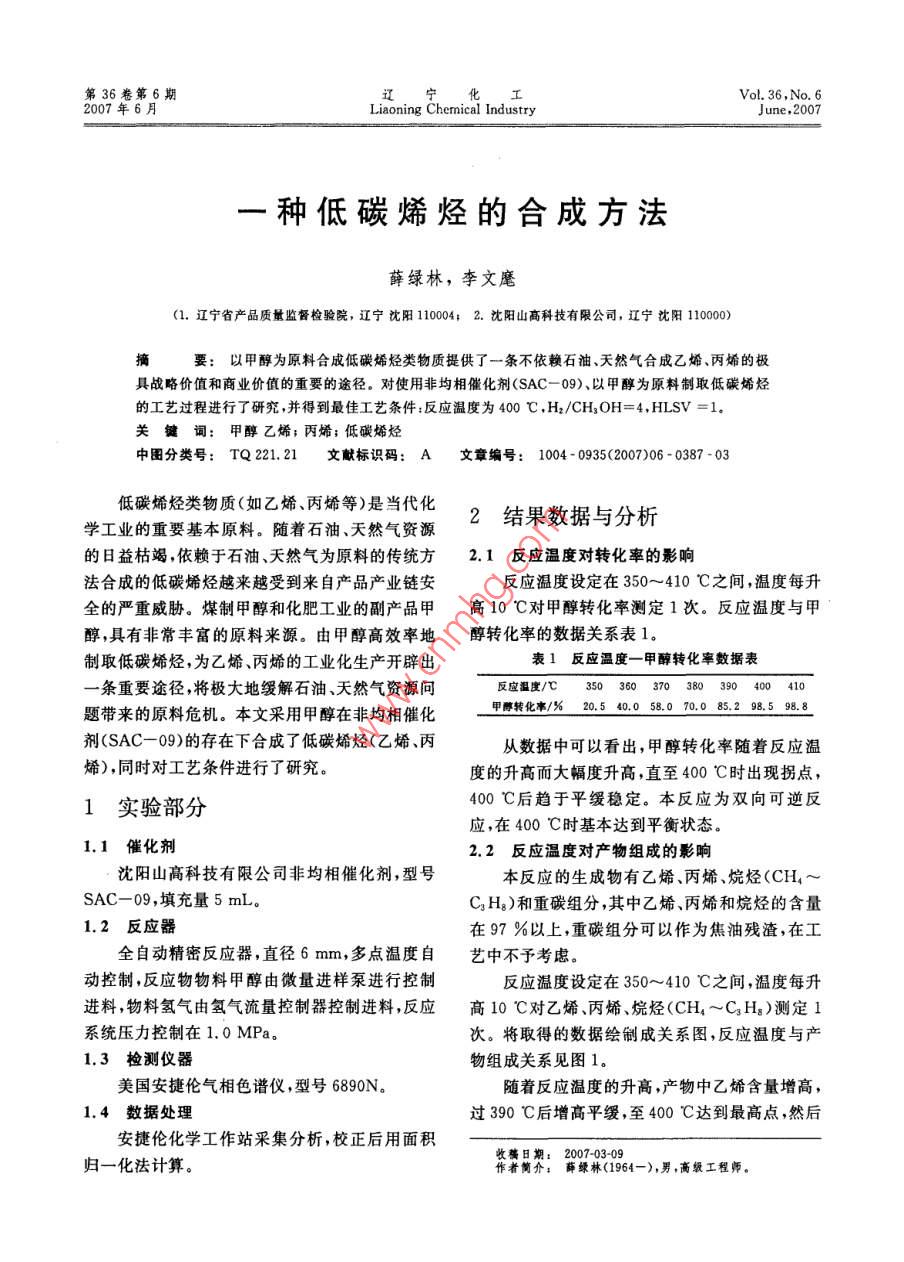 第36卷第6期遼,寧化..工Vol. 36,No. 62007年6月Liaoning Chemical IndustryJune,2007一種低碳烯烴的合成方法薛綠林,李文麾(1.遼寧省產(chǎn)品質(zhì)量監(jiān)督檢驗院,遼寧沈陽10004; 2. 沈陽山高科技有限公司,遼寧沈陽10000)摘要:以甲醇為原料合成低碳烯烴類物質(zhì)提供了-條不依賴石油、天然氣合成乙烯、丙烯的極.具戰(zhàn)略價值和商業(yè)價值的重要的途徑。對使用非均相催化劑(SAC-09)、以甲醇為原料制取低碳烯烴的工藝過程進(jìn)行了研究,并得到最佳工藝條件:反應(yīng)溫度為400 C ,H2/CHzOH=4,HLSV =1.關(guān)鍵詞:甲醇乙烯;丙烯;低碳烯烴中圖分類號: TQ 221.21文獻(xiàn)標(biāo)識碼: A文章編號: 1004 - 0935(2007)06 - 0387 -03低碳烯烴類物質(zhì)(如乙烯、丙烯等)是當(dāng)代化2結(jié)果數(shù)據(jù)與分析學(xué)工業(yè)的重要基本原料。隨著石油、天然氣資源的日益枯竭,依賴于石油、天然氣為原料的傳統(tǒng)方2.1 反應(yīng)溫度對轉(zhuǎn)化率的影響法合成的低碳烯烴越來越受到來自產(chǎn)品產(chǎn)業(yè)鏈安反應(yīng)溫度設(shè)定在350~410 C之間,溫度每升全的嚴(yán)重威脅。煤制甲醇和化肥工業(yè)的副產(chǎn)品甲高10 C對甲醇轉(zhuǎn)化率測定1次。反應(yīng)溫度與甲醇,具有非常豐富的原料來源。由甲醇高效率地醇轉(zhuǎn)化率的數(shù)據(jù)關(guān)系表1。制取低碳烯烴,為乙烯、丙烯的工業(yè)化生產(chǎn)開辟出表1反應(yīng)溫度一 甲醇轉(zhuǎn)化率數(shù)據(jù)表一條重要途徑,將極大地緩解石油、天然氣資源問反應(yīng)溫度/C350 360 370 380 390 400 410甲醇轉(zhuǎn)化事/% 20.5 40.0 58.0 70.0 85.2 98.5 98.8題帶來的原料危機(jī)。本文采用甲醇在非均相催化劑(SAC-09)的存在下合成了低碳烯烴(乙烯、丙從數(shù)據(jù)中可以看出,甲醇轉(zhuǎn)化率隨著反應(yīng)溫烯) ,同時對工藝條件進(jìn)行了研究。度的升高而大幅度升高,直至400C時出現(xiàn)拐點(diǎn),1實(shí)驗部分400 C后趨于平緩穩(wěn)定。本反應(yīng)為雙向可逆反應(yīng),在400C時基本達(dá)到平衡狀態(tài)。1.1催化劑2.2反應(yīng)溫度對產(chǎn)物組成的影響沈陽山高科技有限公司非均相催化劑,型號:本反應(yīng)的生成物有乙烯、丙烯、烷烴(CH,~SAC- 09 ,填充量5 mL。Cs H)和重碳組分,其中乙烯、丙烯和烷烴的含量1.2 反應(yīng)器在97%以上,重碳組分可以作為焦油殘渣,在工全自動精密反應(yīng)器,直徑6 mm,多點(diǎn)溫度自.藝中不予考慮。動控制,反應(yīng)物物料甲醇由微量進(jìn)樣泵進(jìn)行控制反應(yīng)溫度設(shè)定在350~410C之間,溫度每升進(jìn)料,物料氫氣由氫氣流量控制器控制進(jìn)料,反應(yīng)高10 C對乙烯、丙烯、烷烴(CH,~C,Hz)測定1系統(tǒng)壓力控制在1. 0 MPa.次。將取得的數(shù)據(jù)繪制成關(guān)系圖,反應(yīng)溫度與產(chǎn)1.3 檢測儀器.物組成關(guān)系見圖1.美國安捷倫氣相色譜儀,型號6890N。隨著反應(yīng)溫度的升高,產(chǎn)物中乙烯含量增高,1.4數(shù)據(jù)處理過390 C后增高平緩,至400 C達(dá)到最高點(diǎn),然后安捷倫化學(xué)工作站采集分析,校正后用面積2007-03-09歸一化法計算。作者簡介:薛綠林(1964-),男,高級工程師。388寧化2007年6月平緩下降。丙烯含量在350~390 C上升過程中化劑使用壽命。增加H2/CH3OH的數(shù)值,對甲平緩下降,在390~400 C時略有回升,為烷烴中.醇轉(zhuǎn)化率進(jìn)行檢測,所得數(shù)據(jù)見表2。的丙烷脫氫生成丙烯的反應(yīng)所致;過400 C后急100一乙烯劇升高,為烷烴中的丙烷脫氫生成丙烯的反應(yīng)加30f +丙烯劇所致。烷烴(CH,~CjHg)含量平緩下降,過400 C后急劇下降,為烷烴中的丙烷脫氫生成丙母6古CH-CHIr烷烴烯的反應(yīng)加劇所致??傮w反應(yīng)趨勢是,隨著反應(yīng)溫度的升高,產(chǎn)物中乙烯、丙烯的總量在增加,烷20烴的總量減少。但是,考慮到反應(yīng)溫度過高催化劑表面結(jié)焦加劇,影響催化劑使用壽命,反應(yīng)溫度34060380420以400C為宜。反應(yīng)溫度/C2.3 H2/CH,OH 對轉(zhuǎn)化率的影響圖1反應(yīng)溫度對產(chǎn)物組成的影響在反應(yīng)中加人氫氣,起到防止催化劑結(jié)焦失效的重要作用,從而保證催化劑催化效率,延長催表2 H2/CH,OH-甲 醇轉(zhuǎn)化率數(shù)據(jù)表H2/CHsOH2467891甲醇轉(zhuǎn)化率/%60. 280. 597. 897.998.198. 398.598.3從數(shù)據(jù)中可以看出,當(dāng)H2/CHzOH為4時,體反應(yīng)趨勢 是,在H2/CHzOH為4時,產(chǎn)物中乙甲醇轉(zhuǎn)化率提高到了97.8 %。H2/CHzOH再繼烯、丙烯的總量最高,烷烴的總量最低,故H2/續(xù)增加,甲醇轉(zhuǎn)化率上升幅度很小,說明H2/CH,OH以4為最宜。CH,OH為4時巳經(jīng)達(dá)到保護(hù)催化劑的理想效2.5甲醇空 速(HLSV)對轉(zhuǎn)化率和產(chǎn)物組成的果。影響2.4 H2/CH,OH 對產(chǎn)物組成的影響甲醇空速(HLSV)是考核催化劑優(yōu)劣的關(guān)鍵仍然控制H2/CH3OH從1增加到10,對產(chǎn)數(shù)據(jù)。采集甲醇空速與甲醇轉(zhuǎn)化率和產(chǎn)物組成的物乙烯、丙烯、烷烴(CH,~CHg)含量進(jìn)行測試,相互關(guān)系 數(shù)據(jù),繪制成圖3、圖4。將測試數(shù)據(jù)繪制成關(guān)系圖,見圖2。00 f+.乙烯十丙烯30}30 t- A- CH-CsH烷烴40 |20}一一。6810HLSV/(1.h")H2/CHoOH圖2 H2/CHsOH 對產(chǎn)物組成的影響圖3 HLSV(1/h)對轉(zhuǎn)化率的影響隨著H2/CHzOH的提高,產(chǎn)物中乙烯含量由圖3可見,隨著HLSV的提高,甲醇轉(zhuǎn)化增高,在H2/CH,OH為4時趨于