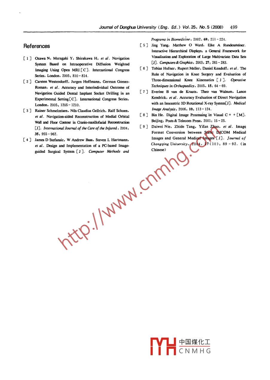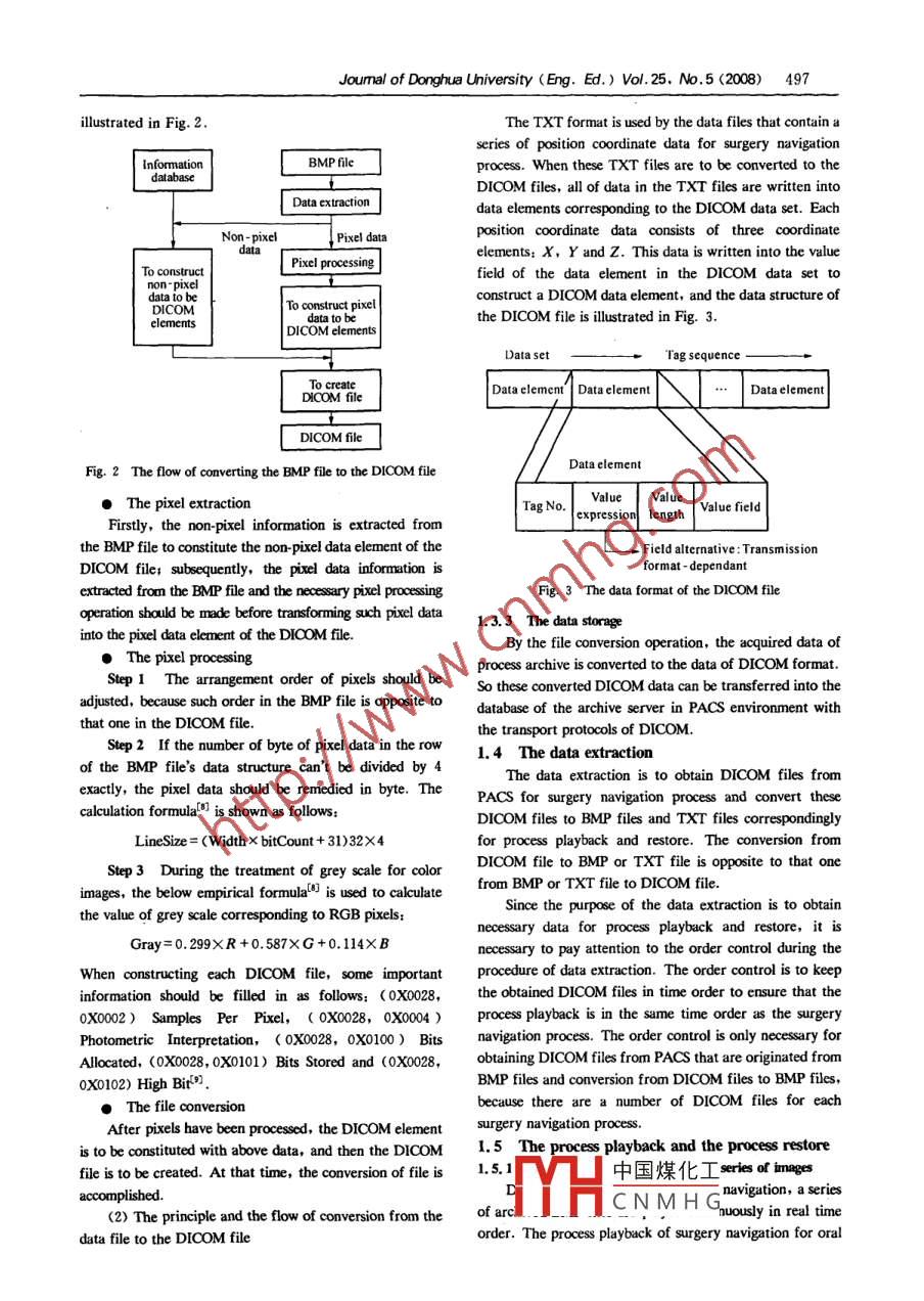 Joumal of Donghua University (Eng. Ed.) Vol. 25, No.5 (2008) 495Research about Process Archive of Computerized Surgery NavigationBased on PACSDENG Hong(鄧宏)" , CHEN Li(陳笠), CHEN Xiao-jun (陳曉軍), WANG Cheng-tao (王成燾)Institute of Mechanical and Pouer Engineering , Shanghai Jiaotong University, Shanghai 20030, ChinaAbstract: Since the process of the surgery navigation isand the relative position relationship between the surgicalan operation-sensitive process, it is important to recordscalpel and the surgery region; secondly, because theand archive the whole process. In this paper, some keyrefresh frequency of the video recording device is lowertechnologies are introduced to accomplish processthan that one of the display of the navigation system, it isarchive of computerized surgery navigation based on theimpossible to reproduce the real condition of thepicture archiving and communication system( PACS).navigation system and surgeon's operations in real time;Firstly, the images and track data are acquired by thefinally, since the video recording files can't be supportedscreen captured tool and the navigation software.by PACS or the hospital information system ( HIS),Secondly, these image and data files are converted tosurgeons aren't able to access PACS or HIS in bospital tothe digital imaging and communications in medicineread such files for evaluation.(DICOM) files supported by PACS and transferred intoAccording to the above deficiency and defect, somethe database in PACS. The process of surgerytechnologies for process archive are introduced in thisnavigation is recorded and archived. Finally, theoriginal data of process archive is acquired from PACS,paper. Firstly, by interfacing with the navigationand this data is used to play back and restore thesystem,the data acquisition module collects images andprocess of surgery navigation.position coordinate data from the procedure of surgeryKey words: process archive; computerized surgerynavigation in real time; secondly, these images andnarigatiom; PACS; process playback; process restoreordinate data are converted to the corresponding DICOMCLC umber: TP 391Document code: Afiles which can be supported by PACS in hospitals andArticle D: 1672 - 5220(2008)05 - 0495 - 0then transferred to PACS; finally, after finishingrecording the procedure of surgery navigation, thisprocedure can be replayed and restored according to theIntroductionabove images and ordinate data. The procedure ofsurgery navigation can be evaluated qualitatively anThe technology of computerized surgery navigation isquantitatively based on process archive of surgeryutilized to provide instructions for surgery operation tonavigation.surgeons and can be used to aid those surgeons who areshort of practical surgical experience to accomplish their1 The Flow of Process Archive and Its Keysurgeries and aid common surgeons to finish complicatedTechnologiessurgeries that require high precisionlr.However,during the course of surgery navigation, although surgery1.1 The flow of process archivenavigation system can be utilized to guide surgeonsThere are two stages in the flow of process archive.continuously, there is possibility for surgeons to takeThe first stage is to collect data from the procedure ofwrong operations to cause injury to the patient and lead tothe failure of the surgery. Therefore, it is of criticalsurgery navigation by using relevant hardware andclinical importance to record the whole surgery process insoftware of navigation system in real time, then thesereal time for evaluation of surgery process and failuredata are to be converted to the DICOM file anddiagnose in the future. The general method to recordsubsequently transferred to the PACS system. The secondsurgery process is video capture. This recording methodstage is to pick up the archived data from the PACSof surgery process has some deficiency and defect assystem and the procedure of surgery navigation is to befollows: firstly, video recording can't be used to preciselyreplayed and restored based on these data. The flow isdescribe the real movement track of the surgical sealpelillustr中國(guó)煤化工YHCNMHGReceived date: 2007-09 - 13* Correspondence should be addressed to DENG Hong, E-mail; denghongdh@126. com496Joumal of Donghua University (Eng. Ed.) Vol.25, No. 5 (2008)surgery navigation. These acquired images are to be siavedData acquisitionin time order. At the stage of surgery simulation, theData conversionacquired position coordinate data is the coordinate data ofProccss play backthe simulated osteotomy path. At the stage of real surgeryand process restoreData storagenavigation, the position coordinates of the movement trackof the surgical scalpel are acquired by the orientator in theData extractionsurgery navigation system according to the predefinedacquisition frequency. Such coordinate data is to be savedFig. 1 The flow of process archivein real time.1.2 The data acquisition1. 2.3 The outcome of the data acqulsition1.2. 1 The method for the data acquisitionDuring the whole procedure of surgery navigation, a .In order to accomplish process archive for surgeryseries of images and a TXT file of position coordinate datanavigation, the critical data which can be used to reflectare to be acquired. These images are used to ilustratethe whole process needs to be acquired. The navigationsituations of surgery navigation operation and the TXT filedisplay is the main part of the surgery navigation systemis utilized to record all of coordinate data in the surgeryand the situation about the patient and the surgical scalpelnavigation procedure. To ensure that such images can beis displayed on the screen. By capturing screens on themanaged in correct order, the acquisition time of eachdisplay and saving as the corresponding images, the wholeimage is involved in the name of such image file. The namesurgery navigation process can be recorded vividly. Byof each image file consists of the patient's ID and the