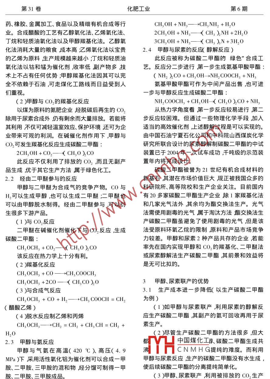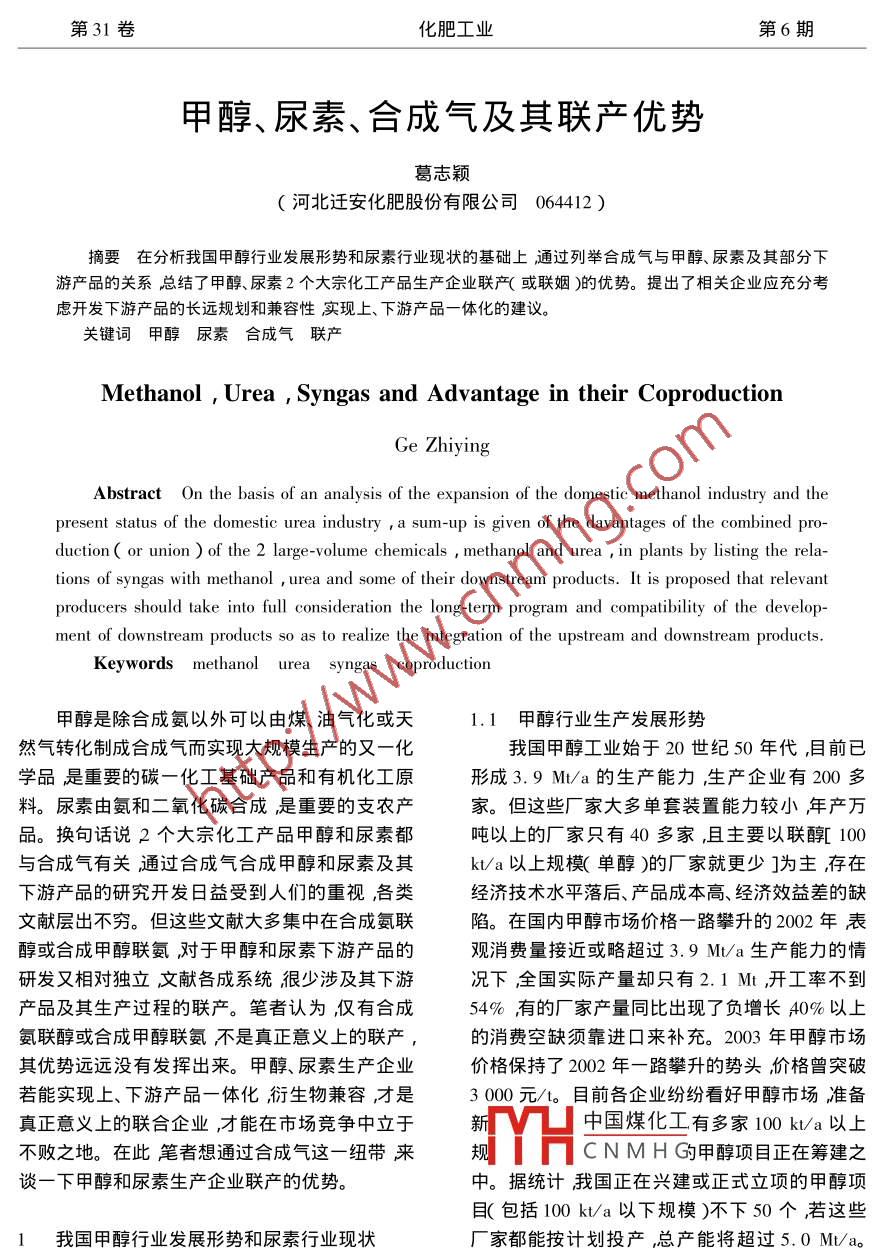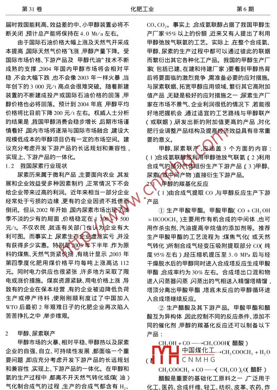 第31卷化肥工業(yè)第6期甲醇、尿素、合成氣及其聯(lián)產(chǎn)優(yōu)勢(shì)葛志穎河北遷安化肥股份有限公司064412)摘要在分析我國(guó)甲醇行業(yè)發(fā)展形勢(shì)和尿素行業(yè)現(xiàn)狀的基礎(chǔ)上通過(guò)列舉合成氣與甲醇、尿素及其部分下游產(chǎn)品的關(guān)系總結(jié)了甲醇、尿素2個(gè)大宗化工產(chǎn)品生產(chǎn)企業(yè)聯(lián)產(chǎn)(或聯(lián)姻)的優(yōu)勢(shì)。提出了相關(guān)企業(yè)應(yīng)充分考慮開(kāi)發(fā)下游產(chǎn)品的長(zhǎng)遠(yuǎn)規(guī)劃和兼容性實(shí)現(xiàn)上、下游產(chǎn)品一體化的建議。關(guān)鍵詞甲醇尿素合成氣聯(lián)產(chǎn)Methanol, Urea, Syngas and Advantage in their CoproductionGe ZhiyingAbstract On the basis of an analysis of the expansion of the domestic methanol industry and thepresent status of the domestic urea industry a sum-up is given of the davantages of the combined pro-duction( or union )of the 2 large-volume chemicals methanol and urea in plants by listing the relations of syngas with methanol urea and some of their downstream products. It is proposed that relevantproducers should take into full consideration the long-term program and compatibility of the development of downstream products so as to realize the integration of the upstream and downstream productsKsyngas coproduction甲醇是除合成氨以外可以由煤、油氣化或天1.1甲醇行業(yè)生產(chǎn)發(fā)展形勢(shì)然氣轉(zhuǎn)化制成合成氣而實(shí)現(xiàn)大規(guī)模生產(chǎn)的又一化我國(guó)甲醇工業(yè)始于20世紀(jì)50年代,目前已學(xué)品是重要的碳一化工基礎(chǔ)產(chǎn)品和有機(jī)化工原形成3.9Mta的生產(chǎn)能力生產(chǎn)企業(yè)有200多料。尿素由氨和二氧化碳合成是重要的支農(nóng)產(chǎn)家。但這些廠家大多單套裝置能力較小年產(chǎn)萬(wàn)品。換句話說(shuō)2個(gè)大宗化工產(chǎn)品甲醇和尿素都噸以上的廠家只有40多家且主要以聯(lián)醇[100與合成氣有關(guān)通過(guò)合成氣合成甲醇和尿素及其kt/a以上規(guī)模(單醇)的廠家就更少]為主存在下游產(chǎn)品的研究開(kāi)發(fā)日益受到人們的重視,各類經(jīng)濟(jì)技術(shù)水平落后、產(chǎn)品成本高、經(jīng)濟(jì)效益差的缺文獻(xiàn)層出不窮。但這些文獻(xiàn)大多集中在合成氨聯(lián)陷。在國(guó)內(nèi)甲醇市場(chǎng)價(jià)格一路攀升的2002年表醇或合成甲醇聯(lián)氨對(duì)于甲醇和尿素下游產(chǎn)品的觀消費(fèi)量接近或略超過(guò)3.9Mta生產(chǎn)能力的情研發(fā)又相對(duì)獨(dú)立文獻(xiàn)各成系統(tǒng)很少涉及其下游況下全國(guó)實(shí)際產(chǎn)量卻只有2.1Mt,開(kāi)工率不到產(chǎn)品及其生產(chǎn)過(guò)程的聯(lián)產(chǎn)。筆者認(rèn)為,僅有合成54%有的廠家產(chǎn)量同比出現(xiàn)了負(fù)增長(zhǎng)40%以上氨聯(lián)醇或合成甲醇聯(lián)氨不是真正意義上的聯(lián)產(chǎn)的消費(fèi)空缺須靠進(jìn)口來(lái)補(bǔ)充。2003年甲醇市場(chǎng)其優(yōu)勢(shì)遠(yuǎn)遠(yuǎn)沒(méi)有發(fā)揮出來(lái)。甲醇、尿素生產(chǎn)企業(yè)價(jià)格保持了2002年一路攀升的勢(shì)頭價(jià)格曾突破若能實(shí)現(xiàn)上、下游產(chǎn)品一體化衍生物兼容才是3000元/。目前各企業(yè)紛紛看好甲醇市場(chǎng)準(zhǔn)備真正意義上的聯(lián)合企業(yè)才能在市場(chǎng)競(jìng)爭(zhēng)中立于新V凵中國(guó)煤化工有多家100ka以上不敗之地。在此筆者想通過(guò)合成氣這一紐帶來(lái)規(guī)CNMH③甲醇項(xiàng)目正在籌建之談一下甲醇和尿素生產(chǎn)企業(yè)聯(lián)產(chǎn)的優(yōu)勢(shì)中。據(jù)統(tǒng)計(jì)我國(guó)正在興建或正式立項(xiàng)的甲醇項(xiàng)目(包括100kta以下規(guī)模)不下50個(gè)若這些1我國(guó)甲醇行業(yè)發(fā)展形勢(shì)和尿素行業(yè)現(xiàn)狀廠家都能按計(jì)劃投產(chǎn),總產(chǎn)能將超過(guò)5.0Mt/a第31卷化肥工業(yè)第6期屆時(shí)我囯能耗高、效益差的中、小甲醇裝置必將不CO、CO2。事實(shí)上合成氨聯(lián)醇占據(jù)了我國(guó)甲醇生斷關(guān)閉預(yù)計(jì)總產(chǎn)能將保持在4.0Mt/a左右產(chǎn)廠家95%以上的份額近來(lái)又有人提出了利用由于國(guó)際石油價(jià)格大幅上漲及天然氣開(kāi)采成甲醇弛放氣聯(lián)氨的工藝。實(shí)際上在整個(gè)合成氨、本提高國(guó)際天然氣價(jià)格飛漲用醇產(chǎn)量下降。受甲醇、尿素的生產(chǎn)過(guò)程中都可以通過(guò)彼此的聯(lián)姻國(guó)際市場(chǎng)價(jià)格、下游產(chǎn)品及甲醇代油〃技術(shù)不斷而繁衍岀其它各種化工產(chǎn)品。我國(guó)的甲醇生產(chǎn)成熟的支撐2004年國(guó)內(nèi)甲醇市場(chǎng)將會(huì)相對(duì)平家包括已建、在建和待建廠家)要看到甲醇熱背穩(wěn)不會(huì)大幅下跌也不會(huì)像2003年一樣火暴當(dāng)后將要面臨的激烈競(jìng)爭(zhēng)需準(zhǔn)備必要的應(yīng)對(duì)措施。年創(chuàng)下的3000元/高點(diǎn)會(huì)很難突破。隨著新建與尿素聯(lián)姻、拓寬甲醇應(yīng)用領(lǐng)域、繁衍其它高附加裝置的不斷建成投產(chǎn)或國(guó)際石油價(jià)格的回落甲值產(chǎn)品無(wú)疑是極好的應(yīng)對(duì)措施之一尿素生產(chǎn)醇價(jià)格也必將回落。預(yù)計(jì)到2004年底甲醇平均家在市場(chǎng)不景氣、企業(yè)利潤(rùn)很低的情況