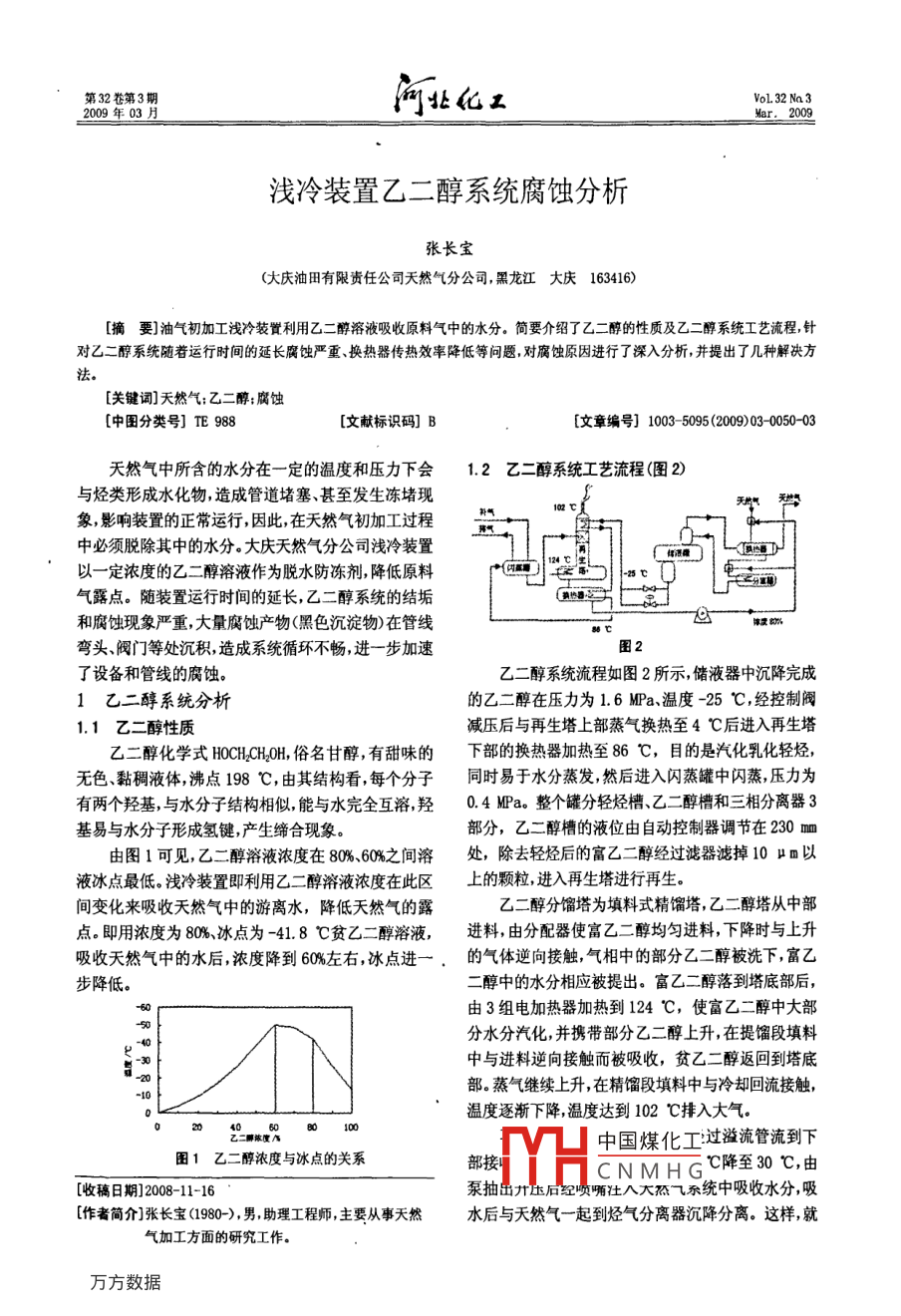 第32卷第3期L322009年03月淺冷裝置乙二醇系統(tǒng)腐蝕分析張長寶(大慶油田有限責(zé)任公司天然氣分公司,黑龍江大慶163416)[摘要]油氣初加工淺冷裝置利用乙二醇溶液吸收原料氣中的水分。簡要介紹了乙二醇的性質(zhì)及乙二醇系統(tǒng)工藝流程針對乙二醇系統(tǒng)隨著運行時間的延長腐蝕嚴(yán)重、換熱器傳熱效率降低等問題,對腐蝕原因進(jìn)行了深入分析,并提出了幾種解決方[關(guān)鍵詞]天然氣;乙二醇;腐蝕[中圖分類號]TE988[文獻(xiàn)標(biāo)識碼]B[文章編號]1003-5095(2009)0305003天然氣中所含的水分在一定的溫度和壓力下會1.2乙二醇系統(tǒng)工藝流程(圖2)與烴類形成水化物,造成管道堵塞、甚至發(fā)生凍堵現(xiàn)象影響裝置的正常運行,因此,在天然氣初加工過程中必須脫除其中的水分。大慶天然氣分公司淺冷裝置以一定濃度的乙二醇溶液作為脫水防凍劑,降低原料氣露點。隨裝置運行時間的延長,乙二醇系統(tǒng)的結(jié)垢和腐蝕現(xiàn)象嚴(yán)重,大量腐蝕產(chǎn)物(黑色沉淀物)在管線彎頭、閥門等處沉積,造成系統(tǒng)循環(huán)不暢,進(jìn)一步加速圖2了設(shè)備和管線的腐蝕。乙二醇系統(tǒng)流程如圖2所示,儲液器中沉降完成1乙二醇系統(tǒng)分析的乙二醇在壓力為1.6Ma、溫度-25℃,經(jīng)控制閥1.1乙二醇性質(zhì)減壓后與再生塔上部蒸氣換熱至4℃后進(jìn)入再生塔乙二醇化學(xué)式 HOCH CH_OH,俗名甘醇,有甜味的下部的換熱器加熱至86℃,目的是汽化乳化輕烴,無色黏稠液體,沸點198℃由其結(jié)構(gòu)看,每個分子同時易于水分蒸發(fā),然后進(jìn)入閃蒸罐中閃蒸,壓力為有兩個羥基,與水分子結(jié)構(gòu)相似能與水完全互溶羥0.4Ma。整個罐分輕烴槽、乙二醇槽和三相分離器3基易與水分子形成氫鍵,產(chǎn)生締合現(xiàn)象部分,乙二醇槽的液位由自動控制器調(diào)節(jié)在230mm由圖1可見,乙二醇溶液濃度在80%、60%之間溶處,除去輕烴后的富乙二醇經(jīng)過濾器濾掉10μm以液冰點最低。淺冷裝置即利用乙二醇溶液濃度在此區(qū)上的顆粒進(jìn)入再生塔進(jìn)行再生。間變化來吸收天然氣中的游離水,降低天然氣的露乙二醇分餾塔為填料式精餾塔,乙二醇塔從中部點。即用濃度為80%、冰點為-41.8℃貧乙二醇溶液,進(jìn)料由分配器使富乙二醇均勻進(jìn)料,下降時與上升吸收天然氣中的水后濃度降到60%左右冰點進(jìn)一,的氣體逆向接觸,氣相中的部分乙二醇被洗下,富乙二醇中的水分相應(yīng)被提出。富乙二醇落到塔底部后,由3組電加熱器加熱到124℃,使富乙二醇中大部分水分汽化,并攜帶部分乙二醇上升,在提餾段填料中與進(jìn)料逆向接觸而被吸收,貧乙二醇返回到塔底部。蒸氣繼續(xù)上升,在精餾段填料中與冷卻回流接觸,溫度逐漸下降溫度達(dá)到102℃排入大氣。二依度中國煤化工過溢流管流到下圖1乙二醇濃度與冰點的關(guān)系部接CNMHGC降至30℃由[收稿日期]2008-11-16泵抽出力H痛壯八大恐氣尕統(tǒng)中吸收水分,吸[作者簡介張長寶1980-),男助理工程師主要從事天然水后與天然氣一起到烴氣分離器沉降分離。這樣,就氣加工方面的研究工作。第3期張長寶:淺冷裝置乙二醇系統(tǒng)腐蝕分析51·完成了循環(huán)過程到吸收酸性物質(zhì)的目的,如醇胺與HS、CO2的反應(yīng)1.3乙二醇性質(zhì)變化般在較低溫度下就可以進(jìn)行,反應(yīng)式:乙二醇溶液在使用期問,主要發(fā)生了以下變化:RNH-HS或(RNH)S(1)裝置運行3個月以內(nèi),貧乙二醇為淺黃色,比較透Co 2+ RNH,+H0 ++RNH,HCO- HS #(RNHy_CO,明;富乙二醇呈乳白色,含少量的輕油。當(dāng)裝置運行半使用緩蝕劑是最常采用的腐蝕控制方法。有效的年后貧乙二醇溶液顏色變深溶液中混有大量的黑緩蝕劑通常只需要添加幾個至幾十個ppm,就可以使色懸浮物和部分沉淀物;富乙二醇外觀變化不大。(2)腐蝕速率大幅度降低。采用緩蝕劑的一次性投資比隨著裝置運行時間延長,貧、富乙二醇的色度和濁度較低,可以在腐蝕已經(jīng)發(fā)生的情況下使用。都與新鮮乙二醇相差很大貧、富乙二醇的酸度逐漸22乙二醇系統(tǒng)內(nèi)添加涂層或襯里升高、pH值降低,管線、設(shè)備出現(xiàn)腐蝕現(xiàn)象。在乙二醇再生塔及容易發(fā)生腐蝕部位內(nèi)壁堆焊1.4沉淀物形成原因一層不銹鋼層,延長乙二醇系統(tǒng)設(shè)備的壽命。對乙二表1原料氣組分醇溫度較高部位內(nèi)涂防腐層,減小腐蝕發(fā)生的可能性V/3組分%和降低腐蝕的程度。0.14防腐層能使管線設(shè)備內(nèi)部光滑,提高流動速度,4.032.41采取內(nèi)壁涂層或襯里也有一些缺點:處理工藝復(fù)雜,3.44333硫化氫/mgm105.93而且一旦有缺陷,極易導(dǎo)致嚴(yán)重的局部腐蝕。在高溫1.18相對密度0.76高壓多相流條件下涂層破損的幾率大,而且也很難由表1裝置入口原料氣化驗組分可知,裝置入口監(jiān)測涂層的破壞情況并及時進(jìn)行修復(fù)。因此,將緩蝕氣中含有一定量的HS、C02酸性氣體,這些酸性氣體劑和涂層聯(lián)合使用是世界各國廣泛使用的防護是沉淀物形成的主要原因。措施。1.41乙二醇噴注到天然氣管線中吸收天然氣中游23除去沉淀物離水的同時,HSCO2氣體也被吸收致使循環(huán)使用的在乙二醇循壞系統(tǒng)中增設(shè)過濾設(shè)備,除去沉淀乙二醇溶液酸性不斷增大。新鮮的乙二醇為中性p物減輕腐蝕物對乙二醇的污染