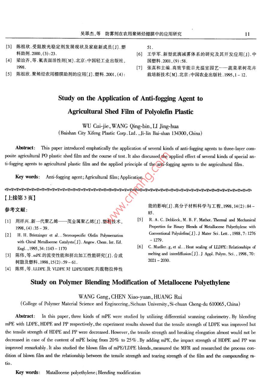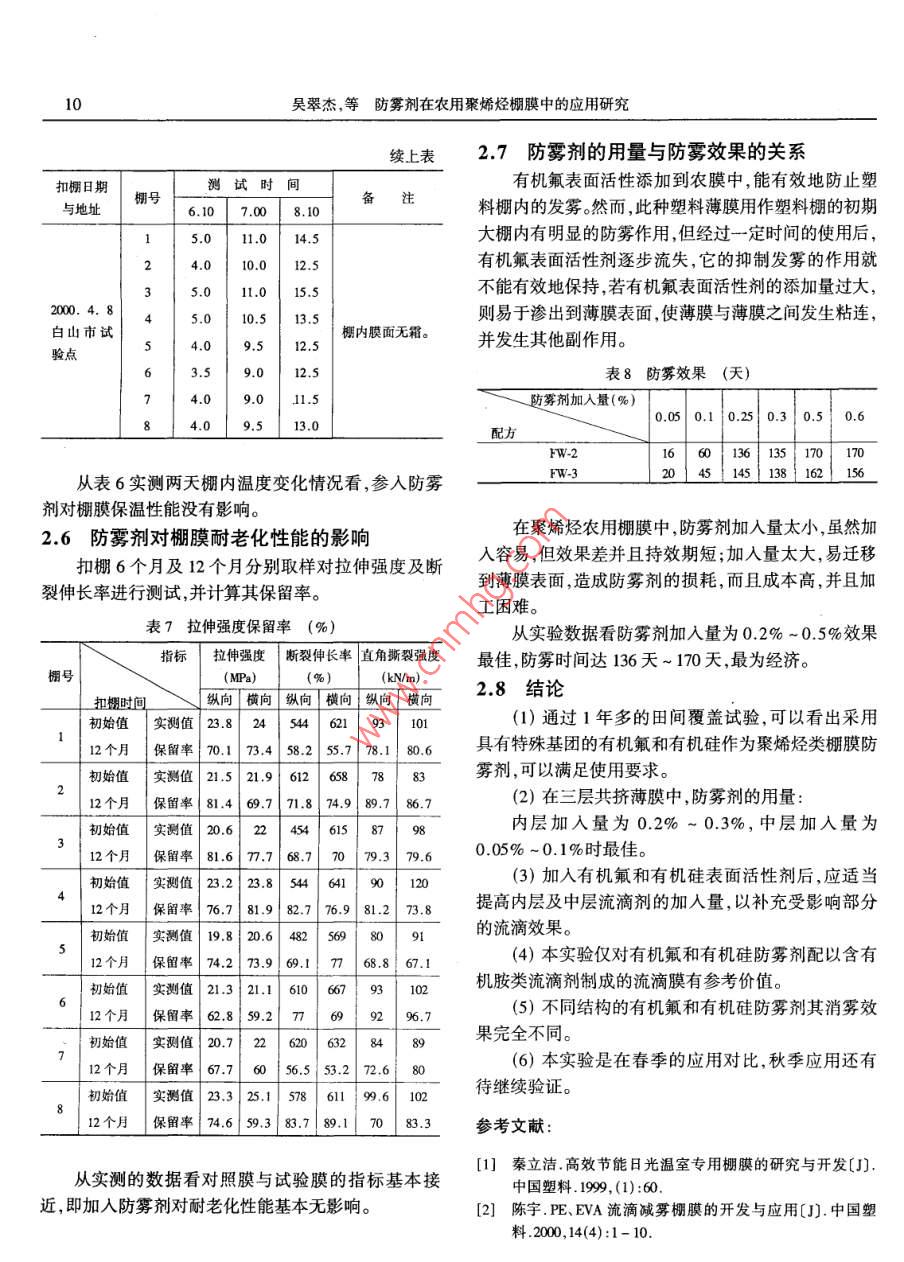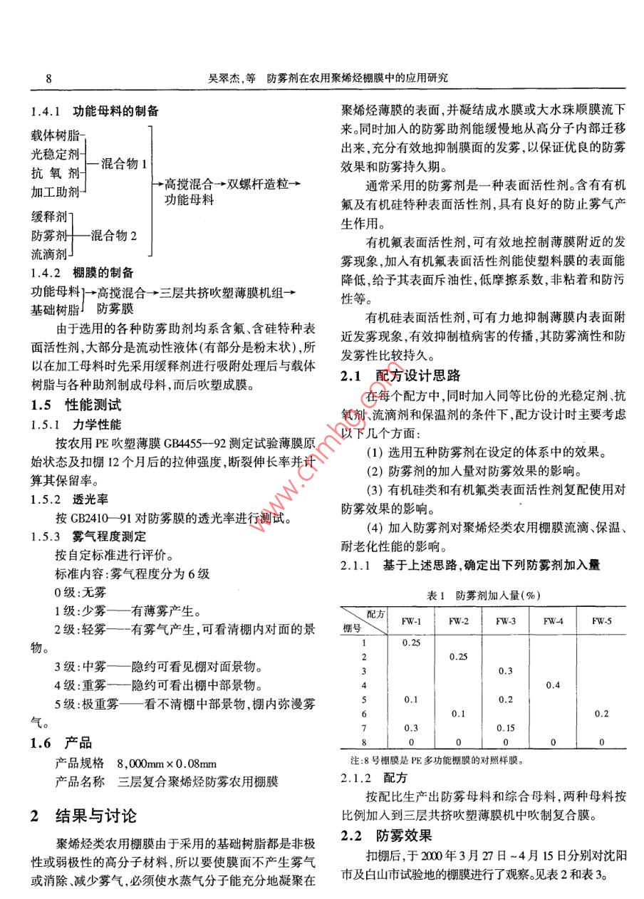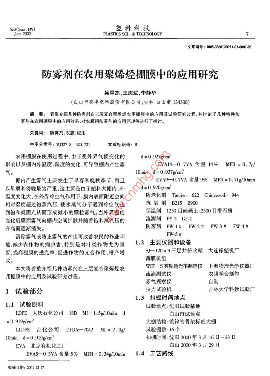 No3(Sum. 149)塑料科技June 2002PLASTICS SCI. & TECHNOLOCY7文章編號: 03020203-00005防霧劑在農(nóng)用聚烯烴棚膜中的應(yīng)用研究吳翠杰,王慶斌,李靜華(白山市喜豐塑料股份有限公司,吉林白山市134300)摘要:著重介紹幾種防霧劑在三層復(fù)合聚烯烴農(nóng)用棚膜中的應(yīng)用及試驗研究過程并討論了幾種特種防霧劑在農(nóng)用棚膜中的應(yīng)用效果,對農(nóng)膜用防霧劑的應(yīng)用原理等進行了探討。關(guān)鍵詞:防霧劑 ;農(nóng)膜;應(yīng)用中圖分類號: TQ327.8 320.721文獻標識碼: B農(nóng)用棚膜在使用過程中,由于受外界氣候變化的d= 0.927g/cm3影響以及棚內(nèi)外溫度、濕度的變化,可導(dǎo)致棚內(nèi)產(chǎn)生霧EVA14- -0. 7VA含量14% MFR = 0.7g/氣。10min d = 0. 937g/cm3棚內(nèi)產(chǎn)生霧氣主要發(fā)生于早春和晚秋季節(jié),而且EVA9- 0.7VA 含量9% MFR = 0.71g/ 10min以早晨和傍晚最為嚴重。這主要是由于塑料大棚內(nèi)外d= 0.920g/cm'溫度變化大,在外界冷空氣作用下,膜內(nèi)表面附近空間防老化劑Tinuivn-- 622 Chimassorb- -944相對濕度超過飽蒸汽壓,使水蒸氣分子遇到冷空氣達抗氧劑B215 B900到飽和凝固點從而形成微小的顆粒霧氣。當(dāng)外界溫度保溫劑1250目硅藻土、2500目滑石粉變化后膜面霧氣向棚內(nèi)空間擴散并隨著飽和蒸汽壓的流滴劑FY-2 GF-1 .防霧劑FW-1 #FW-2 #FW-3# FW4#升高而逐漸消失。FW-5 # .消除霧氣或防止霧氣的產(chǎn)生可改善農(nóng)民的作業(yè)環(huán)1.2 主要儀器和設(shè)備境,減少農(nóng)作物的病蟲害,特別是對葉類作物尤為重要,提高棚膜的透光率,促進作物的光合作用,增產(chǎn)增SJ- -120x3三層共擠吹塑大連橡 塑機廠薄膜機組收。本文將著重介紹幾種防霧劑在三層復(fù)合聚烯烴農(nóng)WCT- s霧度透光率測定儀上海 物理光學(xué)儀器廠流滴測試儀農(nóng)膜學(xué)會制作用棚膜中的應(yīng)用及試驗研究過程。霧氣觀察儀自制1試驗部分拉力試驗機吉林大學(xué)科教試驗廠1.3扣棚時間地點1.1試驗原料試驗地點:沈陽試驗基地LDPE大慶石化公司18D MI= 1.5g/10min d白山市試驗點= 0.919g/cm'大棚結(jié)構(gòu):鍍鋅管骨架標準大棚L(fēng)LDPE吉化公司DFDA--7042 MI= 2. 0g/試驗棚數(shù):16個10min d = 0.919g/cm'扣棚時間:沈陽2000年3月16日~23日EVA北京有 機化工廠白山2000年3月29日EVA5- 0.3VA含量5% MFR = 0.34g/10min1.4工藝路線收稿日期: 2001-12-178吳翠杰,等防霧劑在農(nóng)用 聚烯烴棚膜中的應(yīng)用研究1.4.1功能 母料的制備聚烯烴薄膜的表面,并凝結(jié)成水膜或大水珠順膜流下來。同時加人的防霧助劑能緩慢地從高分子內(nèi)部遷移載體樹脂-出來,充分有效地抑制膜面的發(fā)霧,以保證優(yōu)良的防霧光穩(wěn)定劑--混合物1效果和防霧持久期??寡鮿?→高攪混合→雙螺桿造?!ǔ2捎玫姆漓F劑是-一種表面活性劑。含有有機加工助劑一功能母料氟及有機硅特種表面活性劑,具有良好的防止霧氣產(chǎn)緩釋劑]生作用。防霧劑-混合物2有機氟表面活性劑,可有效地控制薄膜附近的發(fā)流滴劑J霧現(xiàn)象,加入有機氟表面活性劑能使塑料膜的表面能. 1.4.2 棚膜的制備功能母料]→高攪混合+三層共擠吹塑薄膜機組-→降低,給予其表面斥油性,低摩擦系數(shù),非粘著和防污性等。.基礎(chǔ)樹脂」防霧膜由于選用的各種防霧助劑均系含氟、含硅特種表有機硅表面活性劑,可有力地抑制薄膜內(nèi)表面附面活性劑,大部分是流動性液體(有部分是粉末狀) ,所近發(fā)霧現(xiàn)象,有效抑制植病害的傳播,其防霧滴性和防以在加工母料時先采用緩釋劑進行吸附處理后與載體發(fā)霧性比較持久。2.1配方設(shè)計 思路樹脂與各種助劑制成母料,而后吹塑成膜。在每個配方中,同時加入同等比份的光穩(wěn)定劑、抗1.5 性能測試氧劑流滴劑和保溫劑的條件下,配方設(shè)計時主要考慮1.5.1力學(xué)性能按農(nóng)用PE吹塑薄膜GB4455--92測定試驗薄膜原以下幾個方面:(1)選用五種防霧劑在設(shè)定的體系中的效果。始狀態(tài)及扣棚12個月后的拉伸強度,斷裂伸長率并計(2)防霧劑的加入量對防霧效果的影響。算其保留率。(3)有機硅類和有機氟類表面活性劑復(fù)配使用對1.5.2 透光率按GB2410- 91 對防霧膜的透光率進行測試。防霧效果的影響。(4)加入防霧劑對聚烯烴類農(nóng)用棚膜流滴、保溫、1.5.3霧氣程度測定耐老化性能的影響。按自定標準進行評價。2.1.1基于. 上述思路,確定出下列防霧劑加入量標準內(nèi)容:霧氣程度分為6級0級:無霧表1防霧劑加入量(%)1級:少霧一有 薄霧產(chǎn)生。配方FW-1FW-2FW-3FW4Fw-S2級:輕霧一-有霧氣產(chǎn)生,可看清棚內(nèi)對面的景棚號物。0.2523級:中霧-隱約可看見棚對面景物。0.34級:重霧一隱約可 看出棚中部景物。0.45級:極重霧一看不清 棚中部景物,棚內(nèi)彌漫霧0.2氣。0.151.6產(chǎn)品產(chǎn)品規(guī)格8,000mm x 0.08mm注:8號棚膜是PE多功能棚膜的對照樣膜。產(chǎn)品名稱三層復(fù) 合聚烯烴防霧農(nóng)用棚膜2.1.2 配方按配比生產(chǎn)出防霧母料和綜合母料,兩種母料按2結(jié)果與討論比例加人到三層共擠吹塑薄膜機中吹制復(fù)合膜。聚烯烴類農(nóng)用棚膜由于采用的基礎(chǔ)樹脂都是非極2.2防霧效果性或弱極性的高分子材料,所以要使膜面不產(chǎn)生霧氣扣棚后,于2000年3月27日~4月15 日分別對沈陽或消除、減少霧氣,必須使水蒸氣分子能充分地凝聚在市及白山市試驗地