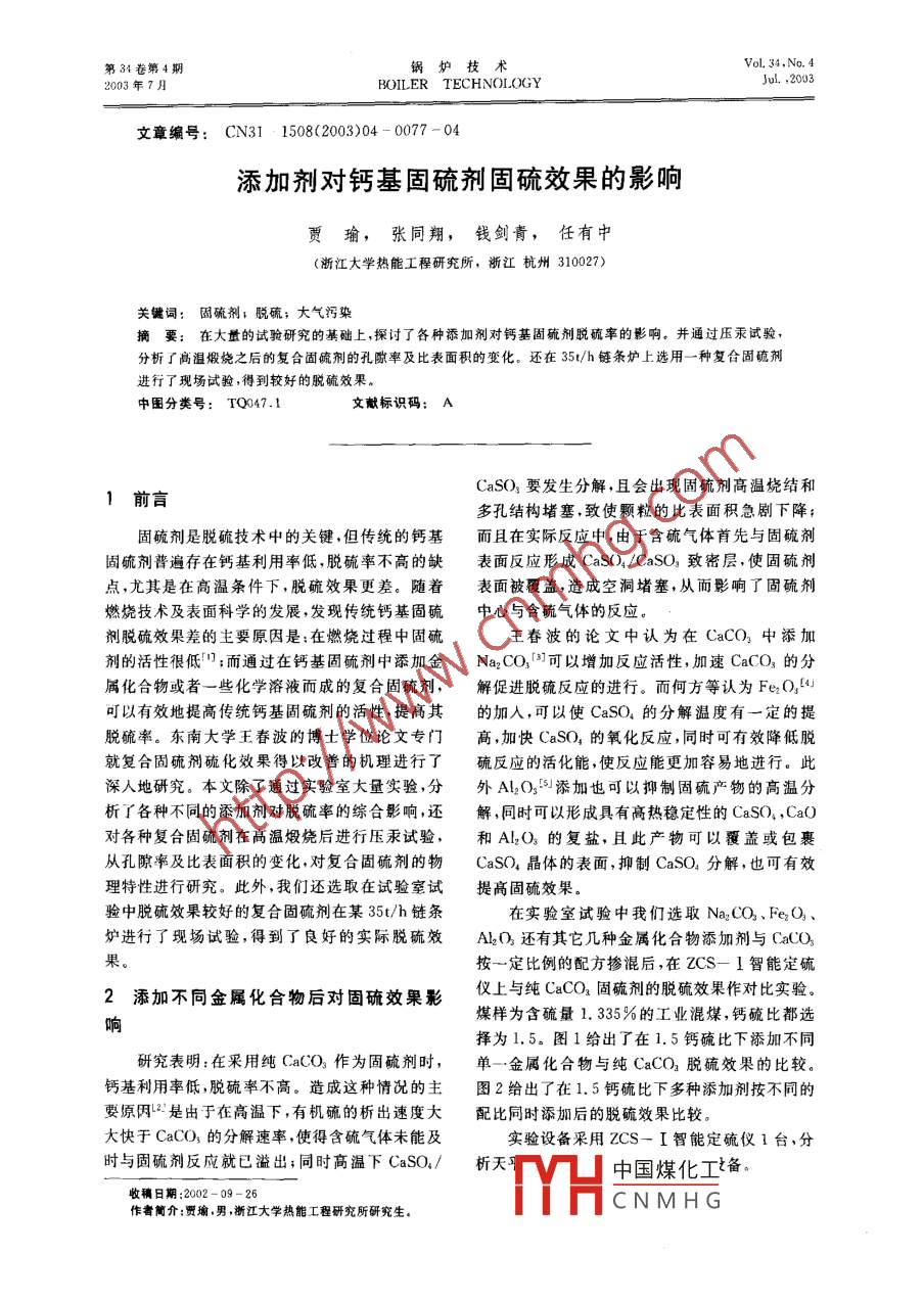 第34卷第4期鍋爐技術Vol. 34,No.42003年7月BOILER TECHNOLOGYJul.,2003文章編號: CN31 : 1508(2003)04 - 0077 - 04添加劑對鈣基固硫劑固硫效果的影響賈瑜,張同翔,錢劍青,任有中(浙江大學熱能工程研究所,浙江杭州310027)關鍵詞:固硫劑; 脫硫;大氣污染摘要:在大量的試驗研究的基礎上,探討了各種舔加劑對鈣基固硫劑脫硫率的影響。并通過壓汞試驗,分析了高溫煆燒之后的復合固硫劑的孔歐率及比表面積的變化。還在35/h鏈條爐上選用-種復合固硫劑進行了現(xiàn)場試驗,得到較好的脫硫效果。中圖分類號: TQ047.1 .文獻標識碼: ACaSO3要發(fā)生分解,且會出現(xiàn)固硫劑高溫燒結和1前言多孔結構堵塞,致使顆粒的比表面積急劇下降;固硫劑是脫硫技術中的關鍵,但傳統(tǒng)的鈣基而且在實際反應中,由于含硫氣體首先與固硫劑固硫劑普遍存在鈣基利用率低,脫硫率不高的缺表面反應形成CaSO/CaSO。致密層,使固硫劑點,尤其是在高溫條件下,脫硫效果更差。隨著表面被覆蓋,造成空洞堵塞,從而影響了固硫劑燃燒技術及表面科學的發(fā)展,發(fā)現(xiàn)傳統(tǒng)鈣基固硫中心與含硫氣體的反應。劑脫硫效果差的主要原因是:在燃燒過程中固硫王春波的論文中認為在CaCO, 中添加劑的活性很低'";而通過在鈣基固硫劑中添加金:Na2CO,[8可以增加反應活性,加速CaCO,的分屬化合物或者一些化學溶液而成的復合固硫劑,解促進脫硫反應的進行。而何方等認為FeO[uJ可以有效地提高傳統(tǒng)鈣基固硫劑的活性,提高其的加入,可以使CaSO,的分解溫度有一定的提脫硫率。東南大學王春波的博士學位論文專門高,加快CaSO,的氧化反應,同時可有效降低脫就復合固硫劑硫化效果得以改善的機理進行了硫反應的活化能,使反應能更加容易地進行。此深人地研究。本文除了通過實驗室大量實驗,分外Al2O35l添加也可以抑制固硫產(chǎn)物的高溫分析了各種不同的添加劑對脫硫率的綜合影響,還解,同時可以形成具有高熱穩(wěn)定性的CaSO,,CaO對各種復合固硫劑在高溫煅燒后進行壓汞試驗,和Al2O3的復鹽,且此產(chǎn)物可以覆蓋或包裹從孔隙率及比表面積的變化,對復合固硫劑的物CaSO,晶體的表面,抑制CaSO,分解,也可有效理特性進行研究。此外,我們還選取在試驗室試提高固硫效果。驗中脫硫效果較好的復合固硫劑在某35t/h鏈條在實驗室試驗中我們選取Na2CO.FeO、爐進行了現(xiàn)場試驗,得到了良好的實際脫硫效Al2O還有其它幾種金屬化合物添加劑與CaCO3果。按一定比例的配方摻混后,在ZCS- 1智能定硫2添加不同金屬化合物后對固硫效果影儀上與純CaCO2固硫劑的脫硫效果作對比實驗。煤樣為含硫量1.335%的工業(yè)混煤,鈣硫比都選響擇為1.5。圖1給出了在1.5鈣硫比下添加不同研究表明:在采用純CaCO3作為固硫劑時,單一金屬化合物與純CaCO,脫硫效果的比較。鈣基利用率低,脫硫率不高。造成這種情況的主圖2給出了在1.5鈣硫比下多種添加劑按不同的要原因L2!是由于在高溫下,有機硫的析出速度大配比同時添加后的脫硫效果比較。大快于CaCO;的分解速率,使得含硫氣體未能及實驗設備采用ZCS- I智能定硫儀1臺,分時與固硫劑反應就已溢出;同時高溫下CaSO,/析天中國煤化工備。收稿日期:2002 -09- 26YHCNMHG作者簡介:賈瑜.男,浙江大學熱能工程研究所研究生。71鍋爐技術第34卷其中:固硫劑I . CaCO, + Fe20,+ Na,CO, +從圖1中可以看出:加入各種添加劑后固硫效MgCO,+ V:O,果都能有一定程度的提高,其中添加FeO3及固硫劑I. CaCO% +Fe2Q,+Na,CO, +Al2O, 后的固硫劑在900~1 000C之間有較好的.MgCO, + NaCl固硫率,而固硫效果最好的是添加NaCO, ,其在各固硫劑IM. CaCO, + Fe:(), +Na2C02 +溫度段的固硫率都有明顯地提高。可能堿金屬的MgC03+ AL(添加會對固硫反應有一定催化作用。從圖2中可以303u211sCaCD- MnO,進21- - AlO,量150)1000 1100HU900 1000 T 100溫度/心:溫度1:圖1添加單一添加劑時固硫劑的脫硫效果圖2添加多種添 加劑的脫硫效果看出,同時添加幾種添加劑,可使固硫劑的脫硫+ FHTZ- T率有比較明顯地提高,而且反映到高溫特性上,+.FHTz-I對溫度的變化不再那么敏感。其中固硫劑I的.+FHIZ-1高溫特性最佳,而低于1 100C時, 固硫劑Il效果......-日- HTZ- W最好。這提醒我們對于金屬化合物添加劑可以考慮一定配比進行混合添加,這樣會對固硫率的.5045..提高有更明顯的作用。3添加化學溶液進行復合調(diào)質(zhì)對 固硫效溫度/C果的影晌圖3(a/S=1.5時復合調(diào)質(zhì)固硫劑的脫碗曲線Shearer, J等認為:使用化學溶液調(diào)質(zhì)CaCON后,可使固硫劑在調(diào)質(zhì)過程中發(fā)生膨脹,孔徑分固硫率甚至達到了70%。面固硫劑FHTZ- I布發(fā)生變化,提高脫硫效果。因此我們在溶液調(diào)隨著溫度的升高,脫硫率在實驗范圍內(nèi)一直保持質(zhì)后又添加了不同的金屬化合物進行了復合調(diào)上升,雖然其低溢脫硫效果不是很好,但其在質(zhì)。圖3給出復合調(diào)質(zhì)后固硫劑脫硫效果對比。1 100C的高溫下已達到50%以上的脫硫率,是其中:FHTZ- I. 脂肪族酸調(diào)質(zhì)CaCO, +一種較好的高溫問硫劑。KOH+ Fe2O,FHTZ- I.脂肪族酸調(diào)質(zhì)CaCO, +4復合固硫劑高溫煅燒后壓汞試驗研究K0H+ Na2CO, + Al2O,為了研究固硫劑進行復合調(diào)質(zhì)可以改善其脫FHTZ-M.脂肪族酸調(diào)質(zhì)CaCO,+硫效果的原因.我們選取脂肪族酸調(diào)質(zhì)CaCO,、脂KOH肪族酸調(diào)質(zhì)CaCO,并添加KOH及FeO,和純FHTZ- IV. 脂肪族酸調(diào)