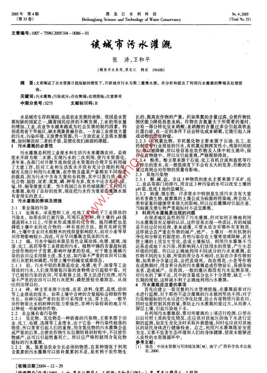 005年第4期黑龍江水利科技No,4,2005(第33卷)Heilongjiang Science and Technology of Water Conservancy(Total No 33)文章編號:1007-7596(2005)04-0086-01談城市污水灌溉張濤,衛(wèi)和平(鶴崗市水務(wù)局,黑龍江鶴崗154100摘要:文章闡述了在水資源日趨短缺的情況下,開辟城市污水為第二灌溉水源。并分析和提出了利用污水灌溉的弊端及處理措關(guān)鍵詞:污水灌溉;污染成分;存在弊端;處理措施;注意事項中圖分類號:S275文獻標(biāo)識碼:B水是城市生存的基礎(chǔ),也是農(nóng)業(yè)發(fā)展的命脈的含量過高,會使作物抗源短缺的國家之一,隨著國民經(jīng)濟的不斷發(fā)展量大于所需要的量時的增加,工業(yè)、農(nóng)業(yè)爭水越來越成為社會發(fā)展的制含量過多會引起高鐵血別是我省干早地區(qū)缺水現(xiàn)象者遍存在,二方面丁成亞硝氨,它能引起人體溉,如何解決好二者的矛盾,是擺在我們面前的課題1污水灌溉的必要性藥制造等行業(yè)排放的污水,有機氯化物揮發(fā)性小,殘留時間較污水灌溉是利用工業(yè)廢水和生活污水來灌溉農(nóng)田長,難以被降解,所以很容易在農(nóng)作物及人體中相互循環(huán),保廢水開辟為第二水源,實現(xiàn)污水的二次利用,使污水資存在食物鏈中。所以應(yīng)引起重視,嚴(yán)格限制排放多年來,各部門對開源節(jié)流和促進水資源的合理開發(fā)224酚類。酚主要來源于石油、化工有機合成和造紙等行大量作但對工業(yè)和生活廢水并沒有充分合理的利用。出排出的度水,在般低濃度下不會有太大的危害,但酚的含的提高因為污水中含有大量的有機物,其中以蛋白質(zhì)、碳水2.3其他污染物化合物、脂肪尿素、氨氮、磷、鉀等為多,廢水中還含有鈣、钅錳鋅銅等微量元素。當(dāng)今我國已在有些城鎮(zhèn)推廣了利用污工食品等部門的排污用含這3種污染的水可以改變土壤的有著現(xiàn)實的意義23.2病菌、微生物。許多廢水中特別是生活污水含有大量2污水灌溉的弊端及措施的有害微生物被灌溉的土壤會成為病源的傳染地將會給人類和家畜的健康帶來很大的影響所以應(yīng)在灌溉時引起注意,2.1重金屬的污染當(dāng)病菌及微生物嚴(yán)重超標(biāo)時不適宜灌溉。21.1金屬汞。汞是塑料工業(yè)、電池工業(yè)和電子工業(yè)排放的3利用污水灌溉易出現(xiàn)的問題提高到6.5以上,可使汞形成難溶的化合物。施用磷肥也是污水灌溉沒有足夠的認識,這樣容易出現(xiàn)一些誤區(qū),有的城鎮(zhèn)料,土壤中含汞對水稻糙米的殘留量影響較大,面對小麥等旱這樣就會造嚴(yán)重農(nóng)作物的減產(chǎn),絕產(chǎn)。土壤對一些有機物的田作物影響較小,因此,可在旱田灌溉含低汞的污水凈化和分解是有限度的,有些污染存在土壤里很難降解,甚至21.2鎘。污水中鎘的來源是有色金屬冶煉、電鍍、玻璃、油使土壤的土質(zhì)發(fā)生變化,造成土壤板結(jié)。利用污水灌溉不當(dāng)漆、化工、醫(yī)藥等等工業(yè)排放的污水。植物中鎘的含量超標(biāo)就還易造成地下響到人們飲用水的質(zhì)量會使作物的葉子發(fā)黃,影響葉綠素的形成。對于被金屬鎘污環(huán)境的問題。所以應(yīng)正確地利用不同成分的污水來灌溉,農(nóng)染的農(nóng)田應(yīng)采用排土法、客土法,如污染不嚴(yán)重的農(nóng)田可以施作物不同的生長期,所需的養(yǎng)分各不相同,比如在許多作物初用石灰肥料和磷肥,可使土壤中的鎘變成難溶態(tài)。期,如果養(yǎng)分含量過高,會把苗燒死。而在棉花、小麥等作物21.3鉛。污水中鉛的來源是冶金、電鍍、電子、油漆等工業(yè)在成熟期時,用含養(yǎng)分高的污水灌溉造成作物徒長,易感染病排放的污水,人們食用被鉛污染的食物將會引起鉛中毒。對蟲害,造成減產(chǎn)。在我國,一般的灌區(qū)都沒有污水監(jiān)測系統(tǒng)于已被鉛污染的農(nóng)田,可采取排土法,客土法進行治理,對污對污水的了解不足,其中的含量成分也不十分清楚缺乏染不嚴(yán)重的農(nóng)田可以用石灰肥料、磷肥使鉛呈難溶態(tài)。從而長期的規(guī)劃,這樣就不利于正確地利用污水灌溉。達到治理目的。4污水灌溉應(yīng)注意的事項等工業(yè)排放的廢水。如果土壤中含砷的含量超標(biāo)會抑制作物水進行監(jiān)測,對于那些不適合灌溉的污水做到堅決不用;對于田作物要比水稻耐砷的能力要強些,在砷污染較弱的地方可.同時也要控制其排放量,要防止污水灌溉的量過大,從而滲入以種植一些耐砷的作物深層土壤,引起污染地下水2.2非金屬有毒污染物在利用污水灌溉前,要對所灌溉的土壤進行檢測,以便在221氫化物。氫化物是一種劇毒的污染物,主要來源于冶以后對照土質(zhì)的變化情況,還應(yīng)該對該地區(qū)的地下水進行定金、化工、電鍍、選煤等工業(yè)廢水,由于它是一種污染性極強的期的監(jiān)測,如發(fā)生變化及時采取補救措施,同時也應(yīng)該對該地被質(zhì)重的時菜常凝物重;后期轉(zhuǎn)裂移物粒本食灌約,反要類掩害生境和人的速球樓東能李連物減產(chǎn),還可以引起牲畜死亡。所以應(yīng)嚴(yán)格控制用含氫化物入良性的水資源循環(huán)中。超標(biāo)的污水灌溉2.22氮。氮素是農(nóng)業(yè)生長必須的物質(zhì),在某種情況下利用1]張岳.中國水資源與可持續(xù)發(fā)展[M].南寧:廣西科學(xué)技術(shù)出版含氮素