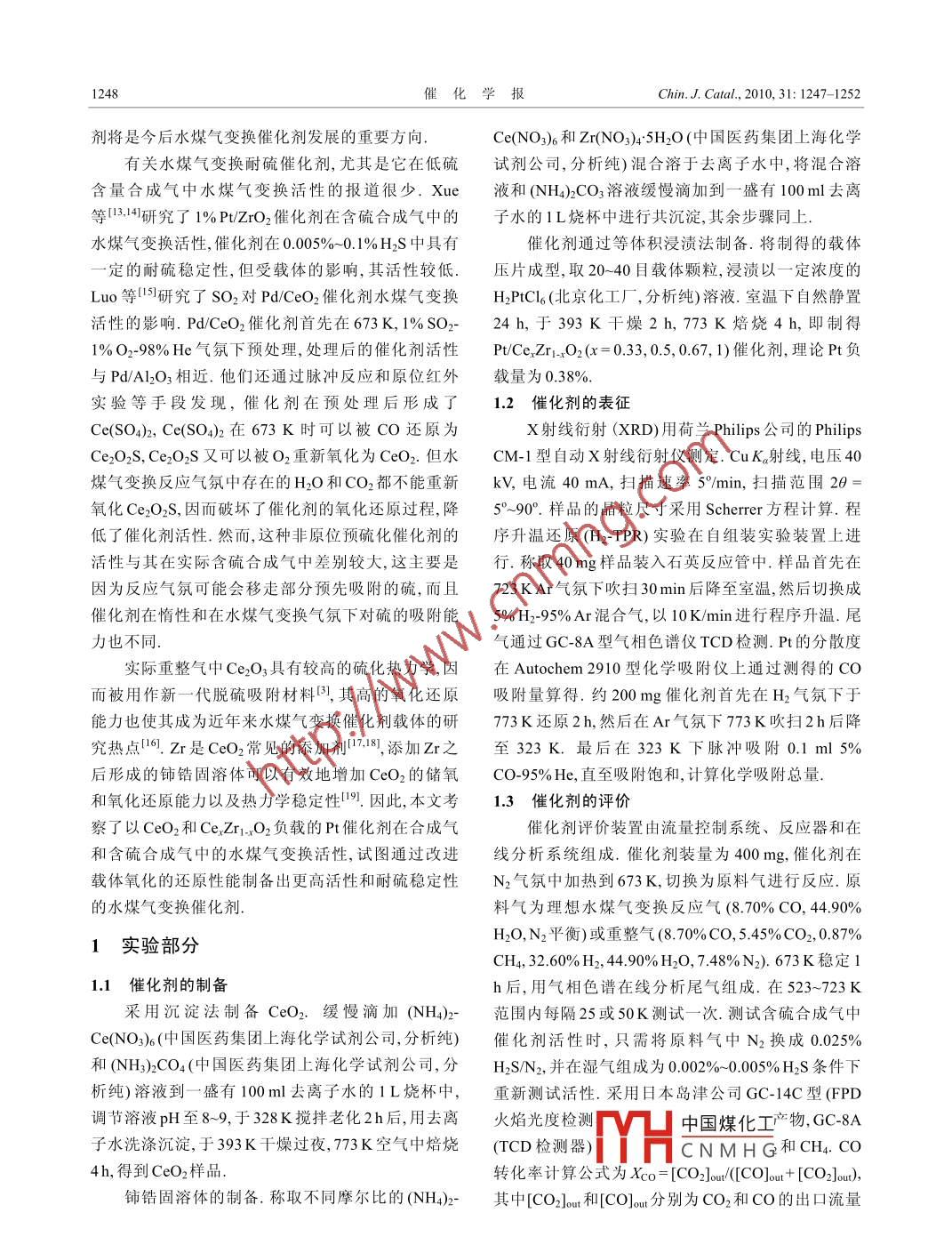Pt/CexZr1-xO2催化劑在含硫合成氣中催化水煤氣變換反應(yīng)活性