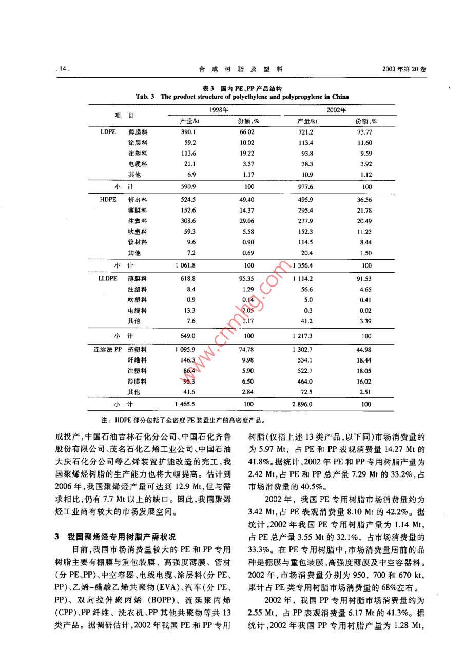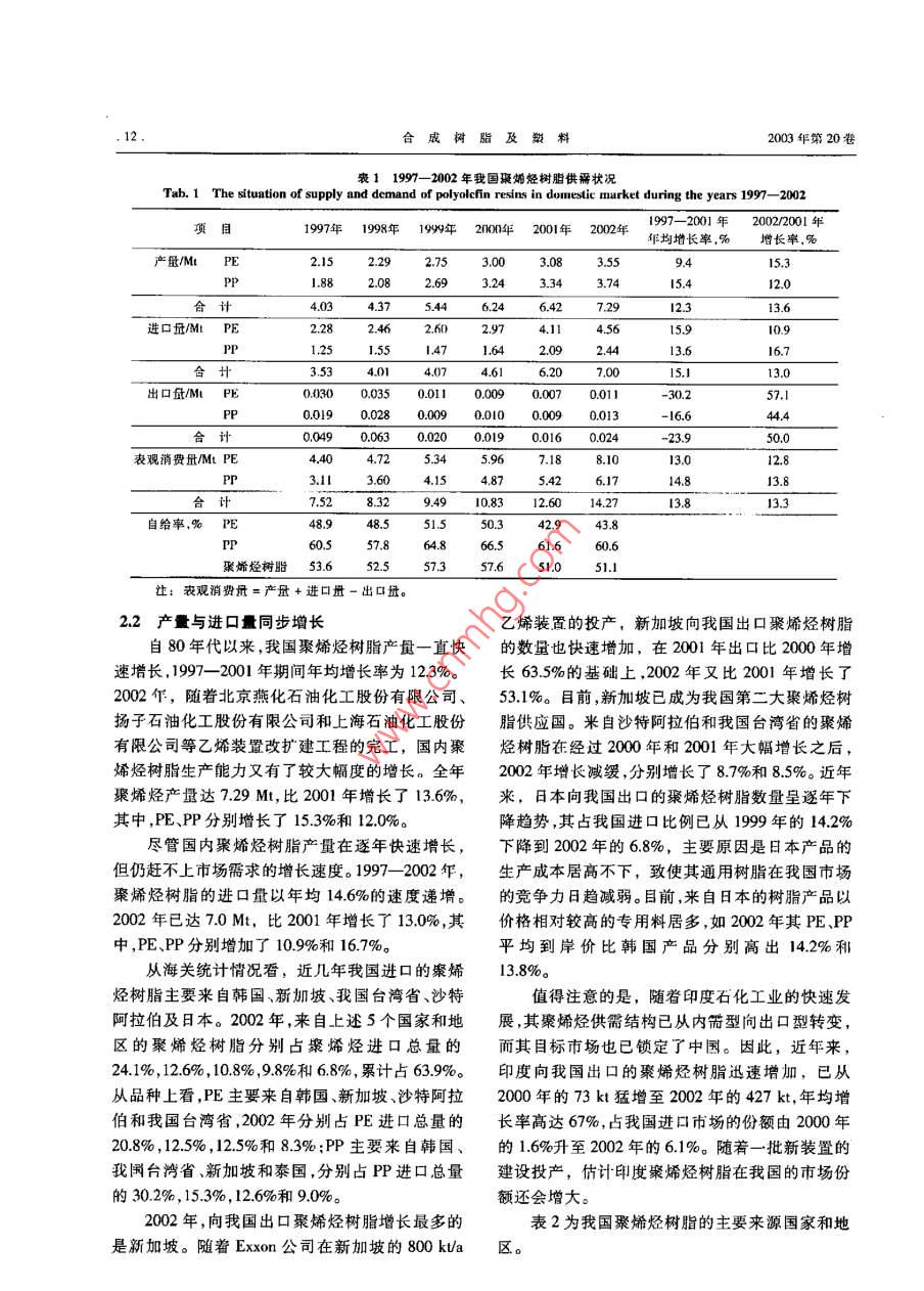 合成樹脂及黻料2003年第20卷表11997--2002年我國(guó)聚媚烴樹脂供需狀況Tab. 1 The situation of supply and demand of polyolcefin resins in donmestic mararket during the years 1997- 20021997- -2001 年2002/2001年項(xiàng)目1997年1998年 1999年 2000年 2001年 2002年年均增長(zhǎng)率,%增長(zhǎng)率. %產(chǎn)量/Mt PE2.152.292.753.003.083.55).415.32.082.693.243.343.7415.412.0合計(jì)4.034.375.446.246.427.2912.313.6進(jìn)口 量/MI P2.282.462.602.974.114.565.9PP1.251.55 .1.471.64 2.09 2.4416.73.534.014.074.616.207.0013.0出口量/Mu PE0.0300.035 0.011 0.009 0.0070.011-30.257.10.0190.028 0.009 0.0100.0090.01-16.644.40.0490.063 0.020 0.0190.0160.024-23.950.0表觀消費(fèi)冊(cè)/Mt PE4.44.725.345.96 .7.188.1012.83.604.154.875.426.1714.87.58.329.49 10.83 12.6014.2713.813.自給率,% PI48948.551.550.342.943.860.57.864.866.5 61.6 60.6聚烯烴樹脂53.652.557.357.651.0注:表觀消費(fèi)量=產(chǎn)量+進(jìn)口量-出口訊。2.2產(chǎn)量與進(jìn)口量同步增長(zhǎng)乙烯裝置的投產(chǎn),新加坡向我國(guó)出口聚烯烴樹脂自80年代以來,我國(guó)聚烯烴樹脂產(chǎn)量一直快的數(shù)量也快速增加,在2001年出口比2000年增速增長(zhǎng),1997- -2001 年期間年均增長(zhǎng)率為12.3%。長(zhǎng)63.5%的基礎(chǔ)上,2002年又比2001年增長(zhǎng)了2002年,隨著北京燕化石油化工股份有限公司、53.1%。目前,新加坡已成為我國(guó)第二大聚烯烴樹揚(yáng)子石油化工股份有限公司和上海石油化工股份脂供應(yīng)國(guó)。米自沙特阿拉伯和我國(guó)臺(tái)灣省的聚烯有限公司等乙烯裝置改擴(kuò)建工程的完工,國(guó)內(nèi)聚烴樹脂在經(jīng)過2000年和2001年大幅增長(zhǎng)之后,烯烴樹脂生產(chǎn)能力又有了較大幅度的增長(zhǎng)。全年2002年增長(zhǎng)減緩,分別增長(zhǎng)了8.7%和8.5%。近年聚烯烴產(chǎn)量達(dá)7.29 Mt,比2001年增長(zhǎng)了13.6%,來,日本向我國(guó)出口的聚烯烴樹脂數(shù)量呈逐年下其中,PE、PP分別增長(zhǎng)了15.3%和12.0%。降趨勢(shì),其占我國(guó)進(jìn)口比例已從1999年的14.2%盡管國(guó)內(nèi)聚烯烴樹脂產(chǎn)量在逐年快速增長(zhǎng),下降到2002年的6.8%,主要原因是日本產(chǎn)品的但仍趕不上市場(chǎng)需求的增長(zhǎng)速度。1997--2002年,生產(chǎn)成本居高不下,致使其通用樹脂在我國(guó)市場(chǎng)聚烯烴樹脂的進(jìn)口量以年均14.6%的速度遞增。的競(jìng)爭(zhēng)力日趨減弱。目前,來自日本的樹脂產(chǎn)品以2002年已達(dá)7.0 Mt,比2001年增長(zhǎng)了13.0%,其價(jià)格相對(duì)較高的專用料居多,如2002年其PE、PP中,PE、PP分別增加了10.9%和16.7%。平均到岸價(jià)比韓國(guó)產(chǎn)品分別高出14.2%和從海關(guān)統(tǒng)計(jì)情況看,近幾年我國(guó)進(jìn)口的聚烯13.8%。烴樹脂主要來自韓國(guó)、新加坡我國(guó)臺(tái)灣省、沙特值得注意的是,隨著印度石化工業(yè)的快速發(fā)阿拉伯及日本。2002 年,來自上述5個(gè)國(guó)家和地展,其聚烯烴供需結(jié)構(gòu)已從內(nèi)符型向出口型轉(zhuǎn)變,區(qū)的聚烯烴樹脂分別占聚烯烴進(jìn)口總量的而其目標(biāo)市場(chǎng)也已鎖定了中國(guó)。因此,近年來,24.1%, 12.6% , 10.8% ,9.8%和6.8% ,累計(jì)占63.9%。印度向我國(guó)出口的聚烯烴樹脂迅速增加,已從從品種上看,PE主要來自韓國(guó)、新加坡、沙特阿拉2000年的73kt猛增至2002年的427kt,年均增伯和我國(guó)臺(tái)灣省,2002年分別占PE進(jìn)口總量的長(zhǎng)率高達(dá)67%,占我國(guó)進(jìn)口市場(chǎng)的份額由2000年20.8% ,12.5% ,12.5%和8.3%;PP主要來自韓國(guó)、的1.6%升至2002年的6.1%。隨肴一批新裝置的我國(guó)臺(tái)灣省、新加坡和泰國(guó),分別占PP進(jìn)口總量建設(shè)投產(chǎn),估計(jì)印度聚烯烴樹脂在我國(guó)的市場(chǎng)份的30.2% , 15.3%, 12.6%和9.0%。額還會(huì)增大。2002年,向我國(guó)出口聚烯烴樹脂增長(zhǎng)最多的表2為我國(guó)聚烯烴樹脂的主要來源國(guó)家和地是新加坡。隨著Exxon公司在新加坡的800kta區(qū)。第4期韓風(fēng)山等聚烯烴樹脂市場(chǎng)狀況與發(fā)展建議.13.表2我國(guó)聚烯烴樹脂主要來源國(guó)家和地區(qū)Tab.2 The major importing countries and areas of polyolefin resins in China2000年2001年2002年國(guó)家和地區(qū)rEPI合計(jì)PEPPP韓國(guó)6141 4291 0436561 699487371 685新加坡211140351367207574308879我國(guó)臺(tái)灣省9337739130948037375沙特阿拉伯29412306S8162968116日本3098549428117645706167473873153871156427131672981833399221941美國(guó)183021432263125266俄羅斯130161463922234進(jìn)口合計(jì)2 9671 6404 60)741132 0876 1994 5592 4427 0022.3高附加值產(chǎn)品比例增加,產(chǎn)晶總體結(jié)構(gòu)仍有吹塑料和管材料分別占11.2%和8.4%。ILDPE絕待改善大部分為薄膜料,占LLDPE總產(chǎn)量的91.5%,其至2002年底,我國(guó)共擁有聚烯烴生產(chǎn)裝置次為注塑類產(chǎn)品,占4.7%。115套,總計(jì)生產(chǎn)能力達(dá)7.61 Mta, 其中,PE為2002年,在PP產(chǎn)量中,連續(xù)法裝置產(chǎn)量為3.66 M/a ,PP為3.95 Mva。2.90 Mt,占PP總產(chǎn)量的77.5%。國(guó)內(nèi)連續(xù)法PP產(chǎn)近年米,我國(guó)在自行開發(fā)及消化吸收引進(jìn)技品構(gòu)成以擠出級(jí)扁絲料為主,占連續(xù)法PP總產(chǎn)術(shù)的基礎(chǔ)上建設(shè)了多套以煉廠氣為原料的PP生量的50.0%,纖維料、注塑料及薄膜料的比例相產(chǎn)裝置,使我國(guó)的PP生產(chǎn)能力有了較快的提高。近,分別為18.4%, 18.1%