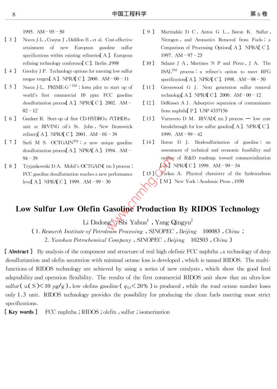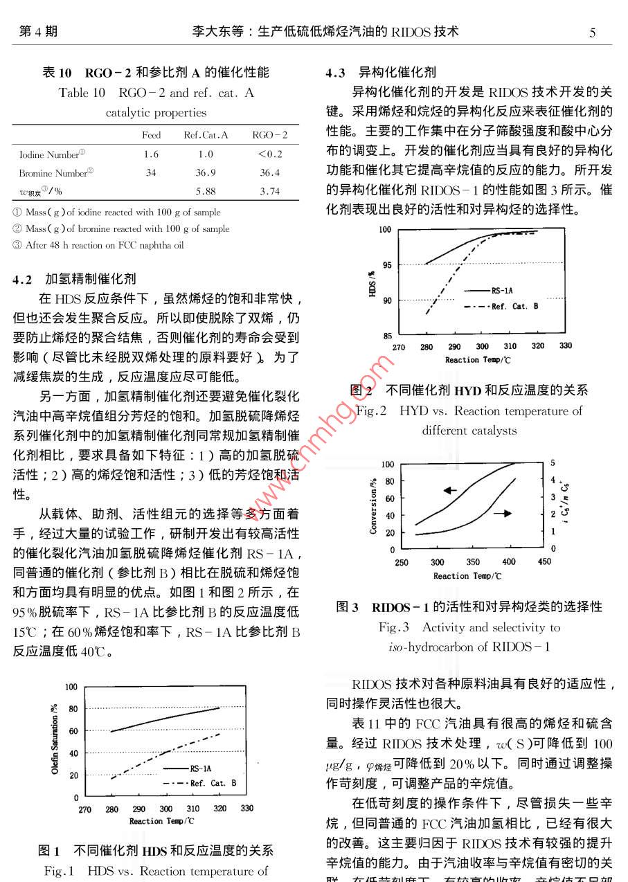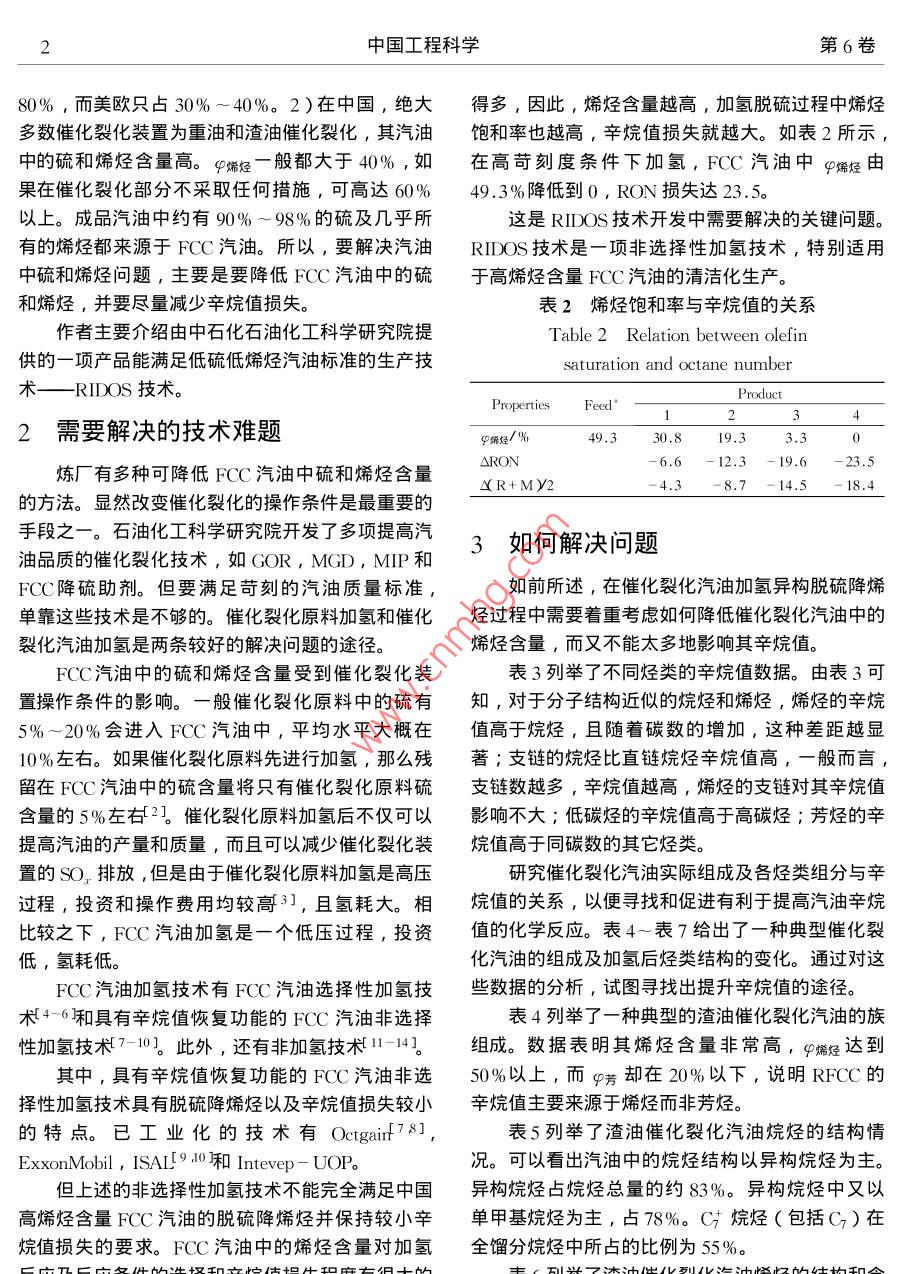 2004年4月中國工程科學(xué)Apr.2004第6卷第4期Engineering ScienceVol.6 No.4專題報(bào)告生產(chǎn)低硫低烯烴汽油的RIDOS技術(shù)李大東' ,石亞華1 ,楊清雨2( 1.中石化石油化工科學(xué)研究院,北京100083 ;2. 中石化燕山分公司,北京 102503)[摘要]通過研究高烯烴含 量FCC汽油的烴類組成和結(jié)構(gòu),針對性地開發(fā)了具有深度脫硫和烯烴飽和能力并減少辛烷值損失的RIDOS技術(shù)。RIDOS 技術(shù)的多種功能是通過-系列新催化劑實(shí)現(xiàn)的,具有良好的原料適應(yīng)性和操作穩(wěn)定性。第一套RIDOS技術(shù)工業(yè)應(yīng)用結(jié)果表明產(chǎn)品中硫的質(zhì)量分?jǐn)?shù)可小于10 pg/g,烯烴體積分?jǐn)?shù)小于20% ,抗爆指數(shù)損失僅1.3。RIDOS 技術(shù)為生產(chǎn)滿足更苛刻標(biāo)準(zhǔn)的汽油提供了可能。[關(guān)鍵詞]FCC汽油;RIDOS;烯烴;硫;異構(gòu)化[中圖分類號] TE626.21[文獻(xiàn)標(biāo)識碼] A [ 文章編號] 1009- 1742 (2004)04 - 000 - 08歐國家到2005年就會(huì)生產(chǎn)re( S小于10 ug/g的汽1世界汽油標(biāo)準(zhǔn)的發(fā) 展趨勢油。在過去的20年里對汽車燃料的需求不斷增長,表1世界汽油標(biāo)準(zhǔn) 發(fā)展趨勢燃油的質(zhì)量和發(fā)動(dòng)機(jī)效率也在穩(wěn)步提升,最大的進(jìn)Table 1 Worldwide trends in gasoline specifications步是無鉛汽油的全面推廣。許多國家正在進(jìn)--步強(qiáng)Chinese National.Implementa-USAEuropeStandardBeijing化規(guī)范以降低發(fā)動(dòng)機(jī)污染物的排放,試驗(yàn)表明降低tion Year20062000 200520032005汽油中的硫和烯烴含量是減少汽車污染物排放的最RVP/kPa74~ 88有效手段之- [1]。降低汽油中烯烴含量可以減少u(O)%2.72.3NO,的排放以及廢氣和油蒸氣的光化學(xué)反應(yīng)活性,q基/%1.0212.5P芳烴/%350減少對臭氧的影響;降低汽油中的硫含量對配備三φ儒烴/ %18效轉(zhuǎn)換器的汽車降低有害氣體HC, CO和NO,的u(SX(14g g)3(1505(800排放有顯著效果,主要原因在于硫化物是三效催化中國汽油標(biāo)準(zhǔn)規(guī)定, 2003年汽油中u( S)小于轉(zhuǎn)換器中使用的Pt-Pd活性金屬的毒物。如表1所示,按美國Tier II 規(guī)范要求,從800 pμg/g ,烯烴體積分?jǐn)?shù)q烯烴小于35%。到2005年,北京要求采用更為苛刻的汽油標(biāo)準(zhǔn),其中2004年開始到2006年汽油中硫的質(zhì)量分?jǐn)?shù)ru( S)u( s)小于150 ug/go將過渡到小于30ug/g的水平。對于多數(shù)歐洲國中國清潔汽油標(biāo)準(zhǔn)應(yīng)有自己的特點(diǎn),應(yīng)當(dāng)充分家,到2005年,汽油中w(S)小于50 ug/g。但是考慮降低排放和中國煉油模式兩方面因素。受稅收政策的影響,很多國家提前采用了更為嚴(yán)格從中國的煉油模式看,要求北京在2005年達(dá)的汽油標(biāo)準(zhǔn),如德國2001年已要求汽油中e( S )小到汽油中u( s小于150 ug/g、中烯烴小于18%是非于50μg/g,2003年小于10μug/g。歐盟計(jì)劃到常困難的。主要受兩方面因素的影響: 1 )在中國,2009年汽油中u( S)小于10 ug/g。預(yù)計(jì)大部分西FCC汽油在成品汽油中份額高,占總量的75%~[收稿日期]2003-07-23[作者簡介萬李李輕< 1938- ), 男,山東德州市人,中國工程院院士,中石化石油化工科學(xué)研究院教授級高級工程師2中國工程科學(xué)第6卷80% , 而美歐只占30%~40%。2)在中國,絕大得多,因此,烯烴含量越高,加氫脫硫過程中烯烴多數(shù)催化裂化裝置為重油和渣油催化裂化,其汽油飽和率也越高,辛烷值損失就越大。如表2所示,中的硫和烯烴含量高。φ烯烴 一般都大于40% ,如在高苛刻度條件下加氫,F(xiàn)CC汽油中中烯烴由果在催化裂化部分不采取任何措施,可高達(dá)60%49.3%降低到0 , RON損失達(dá)23.5。.以上。成品汽油中約有90% ~ 98%的硫及幾乎所這是RIDOS技術(shù)開發(fā)中需要解決的關(guān)鍵問題。有的烯烴都來源于FCC汽油。所以,要解決汽油RIDOS技術(shù)是-項(xiàng)非選擇性加氫技術(shù),特別適用中硫和烯烴問題,主要是要降低FCC汽油中的硫于高烯烴含量FCC汽油的清潔化生產(chǎn)。和烯烴,并要盡量減少辛烷值損失。表2烯烴飽和率 與辛烷值的關(guān)系作者主要介紹由中石化石油化工科學(xué)研究院提Table 2 Relation between olefin供的一項(xiàng)產(chǎn)品能滿足低硫低烯烴汽油標(biāo)準(zhǔn)的生產(chǎn)技saturation and octane number術(shù)一-RIDOS 技術(shù)。ProductPropertiesFed’-12需要解決的技術(shù)難題φ烯烴/%49.330.819.33.3ARON-6.612.3 - 19.623.5煉廠有多種可降低FCC汽油中硫和烯烴含量AR+MY2-4.3-8.714.518.4的方法。顯然改變催化裂化的操作條件是最重要的手段之一。石油化工科學(xué)研究院開發(fā)了多項(xiàng)提高汽3如何解決問題油品質(zhì)的催化裂化技術(shù),如GOR,MGD,MIP和FCC降硫助劑。但要滿足苛刻的汽油質(zhì)量標(biāo)準(zhǔn),如前所述,在催化裂化汽油加氫異構(gòu)脫硫降烯.單靠這些技術(shù)是不夠的。催化裂化原料加氫和催化烴過程中需要著重考慮如何降低催化裂化汽油中的裂化汽油加氫是兩條較好的解決問題的途徑。烯烴含量,而又不能太多地影響其辛烷值。FCC汽油中的硫和烯烴含量受到催化裂化裝表3列舉了不同烴類的辛烷值數(shù)據(jù)。由表3可置操作條件的影響。-般催化裂化原料中的硫有知,對于分子結(jié)構(gòu)近似的烷烴和烯烴,烯烴的辛烷5%~20%會(huì)進(jìn)入FCC汽油中,平均水平大概在值高于烷烴,且隨著碳數(shù)的增加,這種差距越顯10%左
