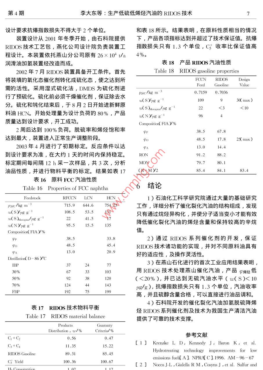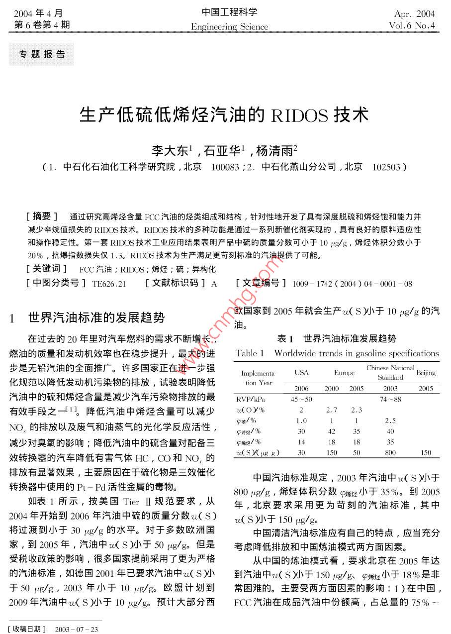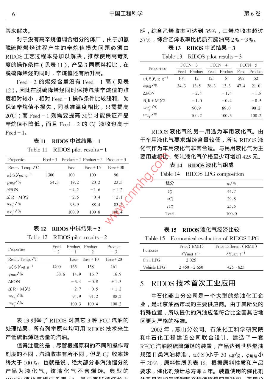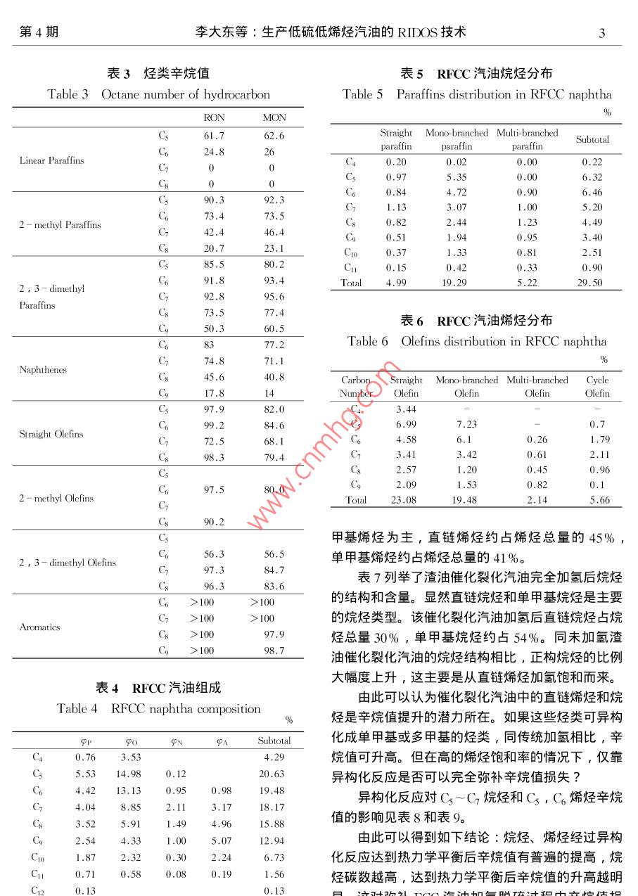 2004年4月中國工程科學(xué)Apr.2004第6卷第4期Engineering ScienceVol.6 No.4專題報(bào)告生產(chǎn)低硫低烯烴汽油的RIDOS技術(shù)李大東' ,石亞華1 ,楊清雨2( 1.中石化石油化工科學(xué)研究院,北京100083 ;2. 中石化燕山分公司,北京 102503)[摘要]通過研究高烯烴含 量FCC汽油的烴類組成和結(jié)構(gòu),針對性地開發(fā)了具有深度脫硫和烯烴飽和能力并減少辛烷值損失的RIDOS技術(shù)。RIDOS 技術(shù)的多種功能是通過-系列新催化劑實(shí)現(xiàn)的,具有良好的原料適應(yīng)性和操作穩(wěn)定性。第一套RIDOS技術(shù)工業(yè)應(yīng)用結(jié)果表明產(chǎn)品中硫的質(zhì)量分?jǐn)?shù)可小于10 pg/g,烯烴體積分?jǐn)?shù)小于20% ,抗爆指數(shù)損失僅1.3。RIDOS 技術(shù)為生產(chǎn)滿足更苛刻標(biāo)準(zhǔn)的汽油提供了可能。[關(guān)鍵詞]FCC汽油;RIDOS;烯烴;硫;異構(gòu)化[中圖分類號] TE626.21[文獻(xiàn)標(biāo)識碼] A [ 文章編號] 1009- 1742 (2004)04 - 000 - 08歐國家到2005年就會(huì)生產(chǎn)re( S小于10 ug/g的汽1世界汽油標(biāo)準(zhǔn)的發(fā) 展趨勢油。在過去的20年里對汽車燃料的需求不斷增長,表1世界汽油標(biāo)準(zhǔn) 發(fā)展趨勢燃油的質(zhì)量和發(fā)動(dòng)機(jī)效率也在穩(wěn)步提升,最大的進(jìn)Table 1 Worldwide trends in gasoline specifications步是無鉛汽油的全面推廣。許多國家正在進(jìn)--步強(qiáng)Chinese National.Implementa-USAEuropeStandardBeijing化規(guī)范以降低發(fā)動(dòng)機(jī)污染物的排放,試驗(yàn)表明降低tion Year20062000 200520032005汽油中的硫和烯烴含量是減少汽車污染物排放的最RVP/kPa74~ 88有效手段之- [1]。降低汽油中烯烴含量可以減少u(O)%2.72.3NO,的排放以及廢氣和油蒸氣的光化學(xué)反應(yīng)活性,q基/%1.0212.5P芳烴/%350減少對臭氧的影響;降低汽油中的硫含量對配備三φ儒烴/ %18效轉(zhuǎn)換器的汽車降低有害氣體HC, CO和NO,的u(SX(14g g)3(1505(800排放有顯著效果,主要原因在于硫化物是三效催化中國汽油標(biāo)準(zhǔn)規(guī)定, 2003年汽油中u( S)小于轉(zhuǎn)換器中使用的Pt-Pd活性金屬的毒物。如表1所示,按美國Tier II 規(guī)范要求,從800 pμg/g ,烯烴體積分?jǐn)?shù)q烯烴小于35%。到2005年,北京要求采用更為苛刻的汽油標(biāo)準(zhǔn),其中2004年開始到2006年汽油中硫的質(zhì)量分?jǐn)?shù)ru( S)u( s)小于150 ug/go將過渡到小于30ug/g的水平。對于多數(shù)歐洲國中國清潔汽油標(biāo)準(zhǔn)應(yīng)有自己的特點(diǎn),應(yīng)當(dāng)充分家,到2005年,汽油中w(S)小于50 ug/g。但是考慮降低排放和中國煉油模式兩方面因素。受稅收政策的影響,很多國家提前采用了更為嚴(yán)格從中國的煉油模式看,要求北京在2005年達(dá)的汽油標(biāo)準(zhǔn),如德國2001年已要求汽油中e( S )小到汽油中u( s小于150 ug/g、中烯烴小于18%是非于50μg/g,2003年小于10μug/g。歐盟計(jì)劃到常困難的。主要受兩方面因素的影響: 1 )在中國,2009年汽油中u( S)小于10 ug/g。預(yù)計(jì)大部分西FCC汽油在成品汽油中份額高,占總量的75%~[收稿日期]2003-07-23[作者簡介萬李李輕< 1938- ), 男,山東德州市人,中國工程院院士,中石化石油化工科學(xué)研究院教授級高級工程師2中國工程科學(xué)第6卷80% , 而美歐只占30%~40%。2)在中國,絕大得多,因此,烯烴含量越高,加氫脫硫過程中烯烴多數(shù)催化裂化裝置為重油和渣油催化裂化,其汽油飽和率也越高,辛烷值損失就越大。如表2所示,中的硫和烯烴含量高。φ烯烴 一般都大于40% ,如在高苛刻度條件下加氫,F(xiàn)CC汽油中中烯烴由果在催化裂化部分不采取任何措施,可高達(dá)60%49.3%降低到0 , RON損失達(dá)23.5。.以上。成品汽油中約有90% ~ 98%的硫及幾乎所這是RIDOS技術(shù)開發(fā)中需要解決的關(guān)鍵問題。有的烯烴都來源于FCC汽油。所以,要解決汽油RIDOS技術(shù)是-項(xiàng)非選擇性加氫技術(shù),特別適用中硫和烯烴問題,主要是要降低FCC汽油中的硫于高烯烴含量FCC汽油的清潔化生產(chǎn)。和烯烴,并要盡量減少辛烷值損失。表2烯烴飽和率 與辛烷值的關(guān)系作者主要介紹由中石化石油化工科學(xué)研究院提Table 2 Relation between olefin供的一項(xiàng)產(chǎn)品能滿足低硫低烯烴汽油標(biāo)準(zhǔn)的生產(chǎn)技saturation and octane number術(shù)一-RIDOS 技術(shù)。ProductPropertiesFed’-12需要解決的技術(shù)難題φ烯烴/%49.330.819.33.3ARON-6.612.3 - 19.623.5煉廠有多種可降低FCC汽油中硫和烯烴含量AR+MY2-4.3-8.714.518.4的方法。顯然改變催化裂化的操作條件是最重要的手段之一。石油化工科學(xué)研究院開發(fā)了多項(xiàng)提高汽3如何解決問題油品質(zhì)的催化裂化技術(shù),如GOR,MGD,MIP和FCC降硫助劑。但要滿足苛刻的汽油質(zhì)量標(biāo)準(zhǔn),如前所述,在催化裂化汽油加氫異構(gòu)脫硫降烯.單靠這些技術(shù)是不夠的。催化裂化原料加氫和催化烴過程中需要著重考慮如何降低催化裂化汽油中的裂化汽油加氫是兩條較好的解決問題的途徑。烯烴含量,而又不能太多地影響其辛烷值。FCC汽油中的硫和烯烴含量受到催化裂化裝表3列舉了不同烴類的辛烷值數(shù)據(jù)。由表3可置操作條件的影響。-般催化裂化原料中的硫有知,對于分子結(jié)構(gòu)近似的烷烴和烯烴,烯烴的辛烷5%~20%會(huì)進(jìn)入FCC汽油中,平均水平大概在值高于烷烴,且隨著碳數(shù)的增加,這種差距越顯10%左