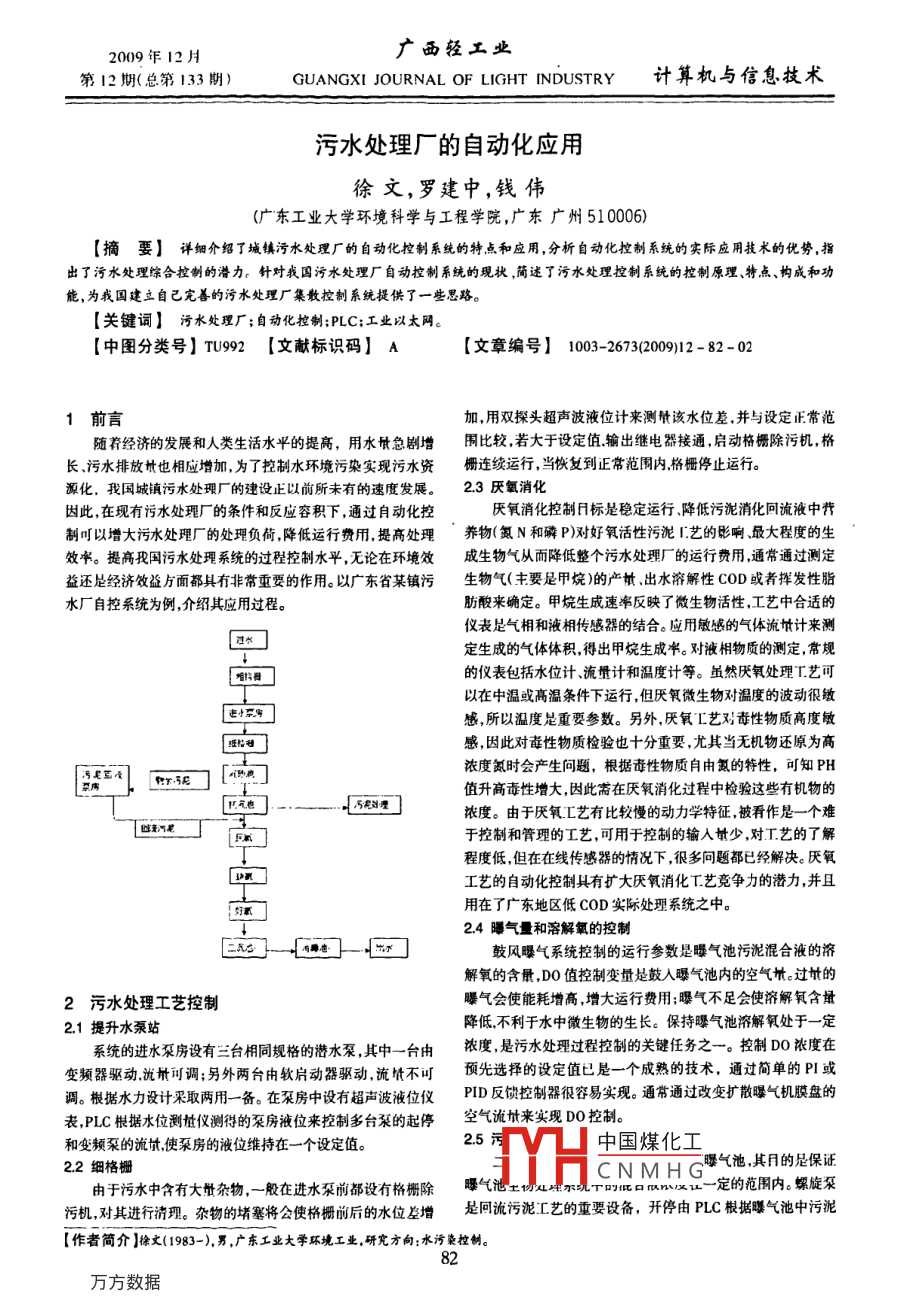 廣西輕工業(yè)2009年12月第12期(總第133期)GUANGXI JOURNAL OF LIGHT INDUSTRY計算機與信息技術(shù)污水處理廠的自動化應(yīng)用徐文,羅建中,錢偉(廣東工業(yè)大學(xué)環(huán)境科學(xué)與工程學(xué)院,廣東廣州51 00)[摘要]詳細介紹了城鎮(zhèn)污水處理廠的自動化控制系統(tǒng)的特點和應(yīng)用,分析自動化控制系統(tǒng)的實際應(yīng)用技術(shù)的優(yōu)勢,指出了污水處理綜合控制的潛力。針對我國污水處理廠自動控制系統(tǒng)的現(xiàn)狀,簡述了污水處理控制系統(tǒng)的控制原理、特點.構(gòu)成和功能,為我國建立自己完善的污水處理廠集散控制系統(tǒng)提供了一些思路。.[關(guān)鍵詞]污水處理廠 ;自動化控制;PLC;工業(yè)以太網(wǎng)。[中圖分類號] TU992 [文獻標識碼] A[文章編號] 1003-2673(2009)12-82 -021前言加,用雙探頭超聲波液位計來測量該水位差.并與設(shè)定正常范隨著經(jīng)濟的發(fā)展和人類生活水平的提高,用水最急劇增圍比較,若大于設(shè)定值.輸出繼電器接通,啟動格柵除污機,格長、污水排放根也相應(yīng)增加,為了控制水環(huán)境污染實現(xiàn)污水資柵連續(xù)運行,當(dāng)恢復(fù)到正常范圍內(nèi),格柵停止運行。源化,我國城鎮(zhèn)污水處理廠的建設(shè)正以前所未有的速度發(fā)展。2.3厭氧消化因此,在現(xiàn)有污水處現(xiàn)廠的條件和反應(yīng)容積下,通過自動化控厭氧消化控制日標是穩(wěn)定運行.降低污泥消化回流液中共制可以增大污水處理廠的處理負荷,降低運行費用,提高處理養(yǎng)物(氮N和磷P)對好氦活性污泥I.藝的影響最大程度的生效率。提高我國污水處理系統(tǒng)的過程控制水平,無論在環(huán)境效成生物氣從而降低整個污水處理廠的運行費用,通常通過測定益還足經(jīng)濟效益方面都具有非常重要的作用。以曠東省某鎮(zhèn)污生物氣(主要是甲烷)的產(chǎn)量,出水溶解性COD或者揮發(fā)性脂水廠自控系統(tǒng)為例,介紹其應(yīng)用過程。肪酸來確定。甲烷生成速率反映了微生物活性,工藝中合適的儀表是氣相和液相傳感器的結(jié)合。應(yīng)用敏感的氣體流城計來測定生成的氣體體積,得出甲烷生成中。對液相物質(zhì)的測定,常規(guī)增將圈的儀表包括水位計流量計和溫度計等。雖然厭氧處理T.藝可以在中溫或高溫條件下運行,但厭氧微生物對溫度的波動很敏電小京賓感,所以溫度是重要參數(shù)。另外,厭氧L藝對毒性物質(zhì)高度敏感,因此對毒性物質(zhì)檢驗也十分重要,尤其當(dāng)無機物還原為高濃度氮時會產(chǎn)生問題,根據(jù)赤性物質(zhì)自由氨的特性,可知PH[你爾氣花值升高毒性增大,因此需在厭氧消化過程中檢驗這些有機物的「氣池1[5]]濃度。由于厭氧L藝有比較慢的動力學(xué)特征,被看作是- -個難[過來河是于控制和管理的工藝,可用于控制的輸入母少,對工藝的了解程度低,但在在線傳感器的情況下,很多問題都已經(jīng)解決。厭氧工藝的自動化控制具有擴大厭氧消化T藝競爭力的潛力,并且用在了廣東地區(qū)低COD實際處理系統(tǒng)之中。2.4曝氣和溶解氧的控制鼓風(fēng)曝氣系統(tǒng)控制的運行參數(shù)是曝氣池污泥混合液的溶解氧的含最,DO值控制變量是鼓入曝氣池內(nèi)的空氣冊。過她的2污水處理工藝控制曝氣會使能耗增高,增大運行費用;曝氣不足會使?jié)饽屎?.1提升水泵站降低,不利于水中微生物的生長。保持曝氣池溶解氧處于一定系統(tǒng)的進水泵房設(shè)有三臺相同規(guī)格的潛水泵,其中一臺由濃度,是污水處理過程控制的關(guān)鍵任務(wù)之一??刂艱O濃度在變頻器驅(qū)動,流冊可調(diào);另外兩臺由軟啟動器驅(qū)動,流情不可預(yù)先選擇的設(shè)定值已是-個成熟的技術(shù),通過簡單的PI或調(diào)。根據(jù)水力設(shè)計采取兩用一備。在泵房中設(shè)有超聲波液位儀PID反饋控制器很容易實現(xiàn)。通常通過改變擴散曝氣機膜盤的表,PLC根據(jù)水位測址儀測得的泵房液位來控制多臺泵的起??諝饬鞯貋韺崿F(xiàn)DO控制。和變頻泵的流城,使泵房的液位維持在-一個設(shè)定值。.5污|中國煤化工2.2細格柵MHCNMHG曝氣池,其月的是保證-定的范圍內(nèi)。螺旋泵由于污水中含有大量雜物,一般在進水泵前都設(shè)有格柵除污機,對其進行清理。雜物的堵塞將公使格柵前后的水位差增是回流污泥工藝的重要設(shè)備,開停由PLC根據(jù)曝氣池中污泥[作者簡介]徐文(1983-),男,廣東工業(yè)大學(xué)環(huán)境工業(yè),研究方向:水污染控制。82濃度計測址結(jié)果自動控制。當(dāng)污泥濃度低于- -定范圍下限,需廠污水處理廠設(shè)置5個控制分站,PLCI位于中控室內(nèi),PLC2加大回流污泥敏則問流泵自動增加開啟臺數(shù);當(dāng)污泥濃度高于位于變電所內(nèi),主要用于機泵等電氣參數(shù)的監(jiān)視.控制和聯(lián)鎖。一定范闈 上限,萵馘小同流污瀧量則回流泵自動戰(zhàn)少開啟臺在沉砂池設(shè)置PLC3.用于成套設(shè)備監(jiān)控.確保其I止E常運行:在數(shù)。剩氽污泥的排放根據(jù)二沉池泥位的高低控制剩余污泥泵的污泥濃縮間設(shè)暨PLC4,用于對污泥脫水機的安全保護及有關(guān)開停及運行時間。二沁池的泥位測卅依靠二沉池上:的泥位計進參數(shù)的監(jiān)控。紫外線消毒系統(tǒng)自帶有PLC5,用于對紫外線燈行數(shù)據(jù)采集.保證測量結(ji