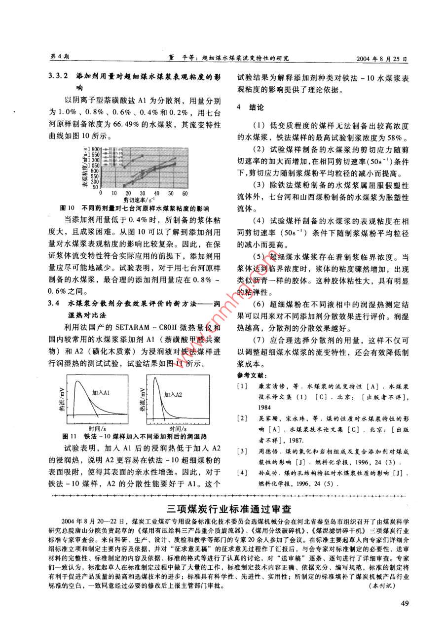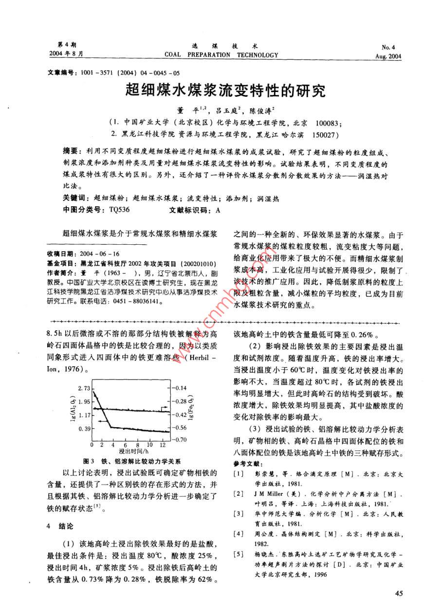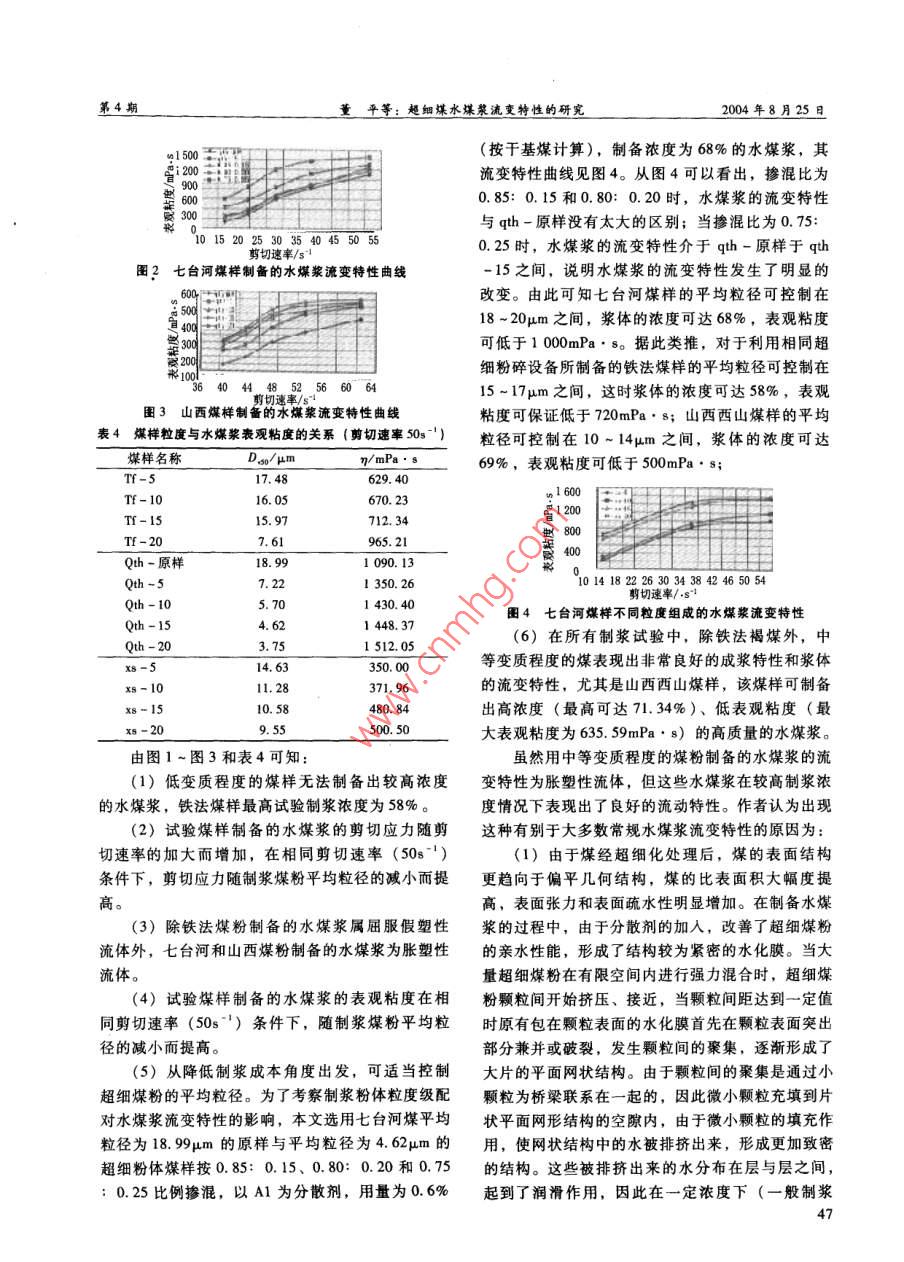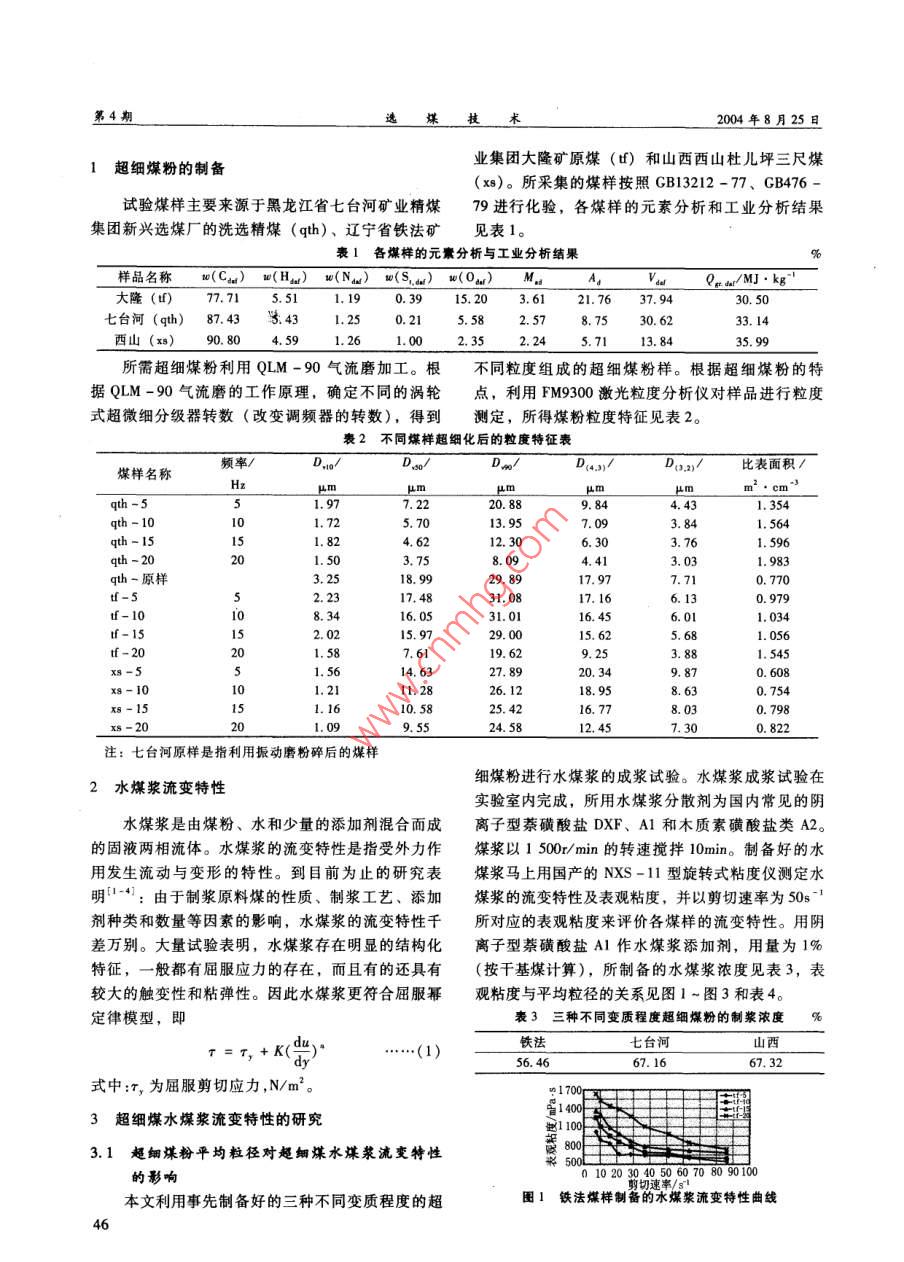 第4期選煤技術(shù)2004年8月COAL PREPARATION TECHNOLOGYg2004文章編號(hào):1001-3571(2004)04-0045-05超細(xì)煤水煤漿流變特性的研究董平12,呂玉庭2,陳俊濤(1.中國礦業(yè)大學(xué)(北京校區(qū))化學(xué)與環(huán)境工程學(xué)院,北京2.黑龍江科技學(xué)院資源與環(huán)境工程學(xué)院,黑龍江哈爾濱摘要:利用不同變質(zhì)程度超細(xì)煤粉進(jìn)行超細(xì)煤水煤漿的成漿試驗(yàn),研究了超細(xì)煤粉的粒度組成、制漿濃度和添加劑種類及用量對趯細(xì)煤水煤漿流變特性的影響。試驗(yàn)結(jié)果表明,不同變質(zhì)程度的煤成漿特性有很大的區(qū)別。另外,還介紹了一種評價(jià)水煤漿分散劑分散效果的方法一—潤濕熱對比法。關(guān)鍵詞:超細(xì)煤粉;超細(xì)煤水煤漿;流變特性;添加劑;澗濕熱中圖分類號(hào):TQ536文獻(xiàn)標(biāo)識(shí)碼:A超細(xì)煤水煤漿是介于常規(guī)水煤漿和精細(xì)水煤漿之間的一種全新的、環(huán)保效果顯著的水煤漿。由于常規(guī)水煤漿的煤粒粒度較粗,流變粘度大等問題,收稿日期:2004-06-16基金項(xiàng)目:黑龍江省科技廳2002年攻關(guān)項(xiàng)目(200201010)給商業(yè)化應(yīng)用帶來了極大的不便。而精細(xì)水煤漿制作者簡介:董平(1963-男,遼寧省北票市人,副漿成本高,工業(yè)化應(yīng)用與試驗(yàn)開展得很少,限制了教授。中國礦業(yè)大學(xué)北京校區(qū)在讀博士研究生,現(xiàn)在黑龍?jiān)摷夹g(shù)的推廣應(yīng)用。因此,降低制漿原料的粒度上江科技學(xué)院黑龍江省潔凈煤技術(shù)研究中心從事潔凈煤技術(shù)限及粗粒含量,減小煤粒的平均粒度,已成為目前研究工作。聯(lián)系電話:0451-88036141。水煤漿技術(shù)研究的重點(diǎn)。85h以后微溶或不溶的那部分結(jié)構(gòu)鐵被解釋為高該地高嶺土中的鐵含量最低可降至0.26%。嶺石四面體晶格中的鐵是比較合理的,因?yàn)橐灶愘|(zhì)(2)影響浸出除鐵效果的主要因素是浸出溫同象形式進(jìn)入四面體中的鐵更難溶些( Erbil-度和試劑濃度。隨著溫度升高,鐵的浸出率增大Ion,1976)。當(dāng)浸出溫度小于60℃時(shí),溫度變化對鐵浸出率的影響不大,當(dāng)溫度超過80℃時(shí),各試劑的鐵浸出0282率均明顯增大,但此時(shí)高嶺石的結(jié)構(gòu)受到破壞。酸濃度增大,除鐵效果均明顯提高,其中鹽酸濃度的0.42變化對除鐵率的影響最大。0.390.56(3)浸出試驗(yàn)的鐵、鋁溶解比較動(dòng)力學(xué)分析表明,礦物相的鐵、高嶺石晶格中四面體配位的鐵和浸出時(shí)間/h八面體配位的鐵是該地高嶺土中鐵的三種賦存形式。圖3鐵、鋁溶解比較動(dòng)力學(xué)關(guān)系參考文獻(xiàn)以上討論表明,浸出試驗(yàn)既可確定礦物相鐵的[1]彭崇慧,等。絡(luò)合滴定原理[M].北京:北京大含量,還提供了一種區(qū)別鐵的存在形式的方法,并學(xué)出版社,1981且根據(jù)其鐵、鋁溶解比較動(dòng)力學(xué)分析進(jìn)一步確定了21 J M Miller(美),化學(xué)分析中戶分離方法[M鐵的賦存狀態(tài)葉明呂,等譯,上海:上??萍汲霭嫔?1981.[3]華中師范大學(xué)編,分析化學(xué)[M],北京:人民4結(jié)論育出版社,1981[4]周公度,晶體結(jié)構(gòu)測定[M],北京:科學(xué)出版社(1)該地高嶺土浸出除鐵效果最好的是鹽酸最佳浸出條件是:浸出溫度80℃,酸濃度25%,[5]楊晚杰,東勝高嶺土選礦工藝礦物學(xué)研究及化學(xué)浸出時(shí)間4h,礦漿濃度5%。浸出除鐵后高嶺土的功率超聲剝片方法的揮討[D].北京:中國礦業(yè)鐵含量從0.73%降為0.28%,鐵脫除率為62%。大學(xué)北京研究生部,1996第4期2004年8月25日1超細(xì)煤粉的制備業(yè)集團(tuán)大隆礦原煤(t)和山西西山杜兒坪三尺煤(xs)。所采集的煤樣按照GB13212-77、GB476-試驗(yàn)煤樣主要來源于黑龍江省七臺(tái)河礦業(yè)精煤79進(jìn)行化驗(yàn),各煤樣的元素分析和工業(yè)分析結(jié)果集團(tuán)新興選煤廠的洗選精煤(qth)、遼寧省鐵法礦見表1。表1各煤樣的元素分析與工業(yè)分析結(jié)果樣品名稱(Ca)w(H灬)(N)(S4)(0)M,A大隆()77.715.511.190.3915.203.6121.7637.94七臺(tái)河(qth)87.431.250.215.582.578.7530.6233.141.261.002.352.245.7113.8435.99所需超細(xì)煤粉利用QLM-90氣流磨加工。根不同粒度組成的超細(xì)煤粉樣。根據(jù)超細(xì)煤粉的特?fù)?jù)QLM-90氣流磨的工作原理,確定不同的渦輪點(diǎn),利用FM9300激光粒度分析儀對樣品進(jìn)行粒度式超微細(xì)分級(jí)器轉(zhuǎn)數(shù)(改變調(diào)頻器的轉(zhuǎn)數(shù)),得到測定,所得煤粉粒度特征見表2。表2不同煤樣超細(xì)化后的粒度特征表頻率/比表面積煤樣名稱H7.091564quh-156.303.761.5961.983qh-原樣18.9929.8917.977.710.7702.2317.4831.0817.160.97916.6.0ltf-1515.621.0561.587.6119.623.881.5451.5614.63Xs-1018.95X8-151.1610.5825.4216.778.030.798x-202010995512.457.30注:七臺(tái)河原樣是指利用振動(dòng)磨粉碎后的煤樣水煤漿流變特性細(xì)煤粉進(jìn)行水煤漿的成漿試驗(yàn)。水煤漿成漿試驗(yàn)在實(shí)驗(yàn)室內(nèi)完成,所用水煤漿分散劑為國內(nèi)常見的陰水煤漿是由煤粉、水和少量的添加劑混合而成離子型萘磺酸鹽DXF、A1和木質(zhì)素磺酸鹽類A2。的固液兩相流體。水煤漿的流變特性是指受外力作煤漿以1500r/min的轉(zhuǎn)速攪拌10min。制備好的水用發(fā)生流動(dòng)與變形的特性。到目前為止的研究表煤漿馬上用國產(chǎn)的NXS-11型旋轉(zhuǎn)式粘度儀測定水