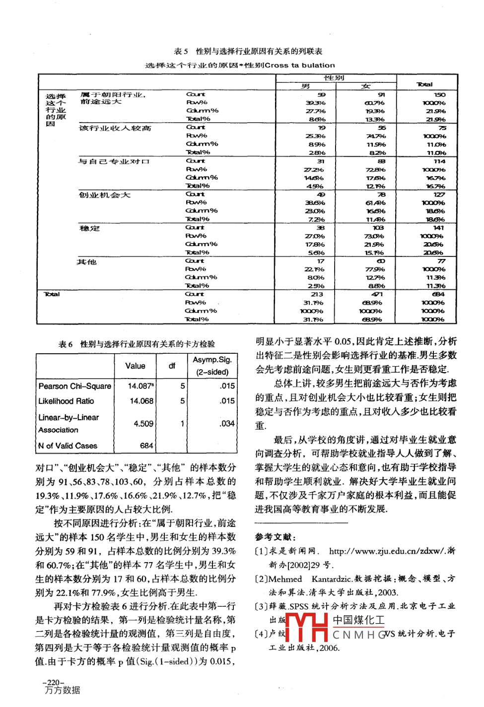 第27卷第7期赤峰學(xué)院學(xué)報(bào)〔自然科學(xué)版Vol 27 No. 72011年7月Journal of Chifeng university( Natural Science EditionJul 2011SPSS統(tǒng)計(jì)方法與應(yīng)用(太原理工大學(xué);山西大學(xué)商務(wù)學(xué)院,山西太原030024030031)摘要:本文在調(diào)查了六百多名大學(xué)本科學(xué)生并收回684份有效問卷的基礎(chǔ)上,通過SPSS軟件建立了相應(yīng)的敷據(jù)文件,利用頻數(shù)分析和列聯(lián)表分析等方法得出了兩個(gè)隱含特征:一是畢業(yè)后選擇求職的人居多,并且絕大多數(shù)人認(rèn)為在就業(yè)時(shí)個(gè)人能力最為重要;二是性別會(huì)影響選擇行業(yè)的基準(zhǔn),男生多數(shù)會(huì)先考慮前途問題,女生則更看重工作是否穩(wěn)定結(jié)合以上兩個(gè)特征,針對(duì)學(xué)院就業(yè)方面的工作提出一些相關(guān)的建關(guān)鍵詞:頻數(shù);SPSs;卡方檢驗(yàn);列聯(lián)表分析;就業(yè)中圖分類號(hào):C645文獻(xiàn)標(biāo)識(shí)碼:A文章編號(hào):1673-260X(2011)07-0218-03隨著杜會(huì)的不斷發(fā)展進(jìn)步,人們將更多地采用的問題分成了四類數(shù)據(jù)挖掘技術(shù)來評(píng)鉆市場(chǎng)以外的價(jià)值,譬如心理首先在問卷中設(shè)置畢業(yè)生信息,它包括性別、學(xué)、精神病學(xué)等相關(guān)學(xué)科研究人類的精神壓力等.年齡、所在系和生源所在地設(shè)置原因:在統(tǒng)計(jì)分析數(shù)據(jù)統(tǒng)計(jì)是在大量的數(shù)據(jù)中挖掘發(fā)現(xiàn)潛在的有價(jià)中需要對(duì)調(diào)查對(duì)象的基本情況進(jìn)行描述統(tǒng)計(jì)量的值的模式和數(shù)據(jù)間關(guān)系(知識(shí))的過程SPSs( Statis-計(jì)算,以便準(zhǔn)確把握數(shù)據(jù)的集中程度tical Package for the Social Science)即社會(huì)科學(xué)統(tǒng)其次在問卷中設(shè)置進(jìn)入理想的行業(yè),選擇該行計(jì)軟件用戶可以非常方便地通過鼠標(biāo)點(diǎn)選菜單或業(yè)的原因,在這個(gè)行業(yè)中最想為之工作的企業(yè)名按鈕配合簡(jiǎn)單的對(duì)話框輸入來實(shí)現(xiàn)對(duì)數(shù)據(jù)的統(tǒng)計(jì)稱,企業(yè)的吸引點(diǎn),了解企業(yè)的渠道設(shè)置原因:先分析工作,分析結(jié)果通常以文字、表格、圖形混排的調(diào)查畢業(yè)生對(duì)于未來行業(yè)的選擇情況及選擇的原形式展現(xiàn).除此之外SRSS還可實(shí)現(xiàn)對(duì)互聯(lián)網(wǎng)的全因,可以了解到10屆本科生選擇職業(yè)與自己所學(xué)面適應(yīng),支持?jǐn)?shù)據(jù)的動(dòng)態(tài)收集、統(tǒng)計(jì)和分析等專業(yè)的關(guān)系和就業(yè)單位的在學(xué)生中的印象本文針對(duì)10屆大學(xué)生就業(yè)的基本特征及其大接著再在問卷中設(shè)置對(duì)就業(yè)地區(qū)的選擇,選擇致取向做了實(shí)例分析,通過SPs軟件提供的方法上述地區(qū)的原因,如果求職較為困難能否接受去小來實(shí)現(xiàn)數(shù)據(jù)的統(tǒng)計(jì)分析.這為學(xué)院以后的教學(xué)改城鎮(zhèn)及鄉(xiāng)鎮(zhèn)單位就業(yè)設(shè)置原因:這一部分主要是革、課程設(shè)置及就業(yè)指導(dǎo)工作等類似問題提供了理調(diào)查同學(xué)們對(duì)于就業(yè)地區(qū)的選擇情況,通過數(shù)據(jù)分論參考價(jià)值.析可以了解到部分10屆畢業(yè)生就業(yè)選擇時(shí)對(duì)地域1調(diào)查問卷統(tǒng)計(jì)指標(biāo)的設(shè)計(jì)環(huán)境的影響程度11問卷設(shè)計(jì)的原則最后在問卷中設(shè)置畢業(yè)時(shí)的去向,對(duì)求職薪酬在10屆本科畢業(yè)生問卷設(shè)計(jì),包括以下兩個(gè)的考慮(試用期后的工資),專業(yè)不對(duì)口時(shí)是否會(huì)選基本原則:一是設(shè)置醒目、簡(jiǎn)明扼要的標(biāo)題,標(biāo)題是擇跳槽,認(rèn)為在就業(yè)時(shí)什么最重要,對(duì)自己專業(yè)技“山西大學(xué)商務(wù)學(xué)院大學(xué)生就業(yè)調(diào)查問卷”,此標(biāo)題能程度的看法,對(duì)就業(yè)程序的了解程度設(shè)置原因概括了問卷內(nèi)容;二是問卷中的問題全部采用選擇可從中分析到我院10級(jí)本科生對(duì)自己就業(yè)問題的的方式,且選項(xiàng)標(biāo)號(hào)采用1”、“2”、“3”數(shù)字序號(hào),這心態(tài)和總體認(rèn)識(shí)樣既方便被調(diào)查者填寫又節(jié)省時(shí)間,且有利于建立2數(shù)據(jù)納與過最終的數(shù)據(jù)文件這中國(guó)煤化工和教室這些相對(duì)集建立問卷數(shù)據(jù)信息中的地兒大量缺失值)問卷在設(shè)計(jì)問卷前,首先要考慮問卷中應(yīng)該設(shè)置哪699份,其中有效問卷684份,緊接著對(duì)回收問卷些題目(即將來數(shù)據(jù)表中的變量),在這里把問卷里的數(shù)據(jù)進(jìn)行統(tǒng)計(jì)和分析升數(shù)據(jù)21建立有效數(shù)據(jù)文件時(shí)什么最重要)進(jìn)行頻數(shù)分析,結(jié)果如表3、表4所首先在獲取了有效問卷后,開始著手建立示.SPSS數(shù)據(jù)文件具體結(jié)構(gòu)見表1表3山西大學(xué)商務(wù)學(xué)院大學(xué)生被調(diào)查者畢業(yè)時(shí)去向頻數(shù)表1就業(yè)調(diào)查表的數(shù)據(jù)的結(jié)構(gòu)分布表畢業(yè)時(shí)的去向氵泣??佳?1.6其次根據(jù)問卷中的問題,選擇部分有用的數(shù)據(jù)自主創(chuàng)求職考研兩手準(zhǔn)備15.8定義好結(jié)