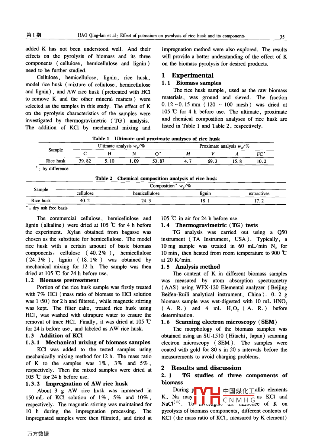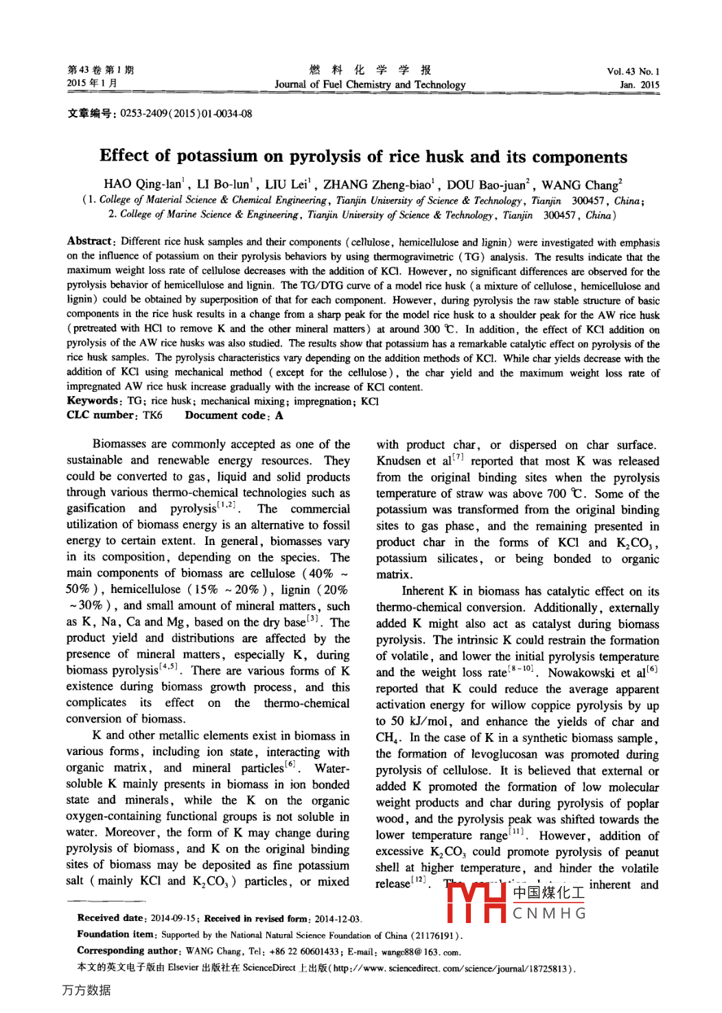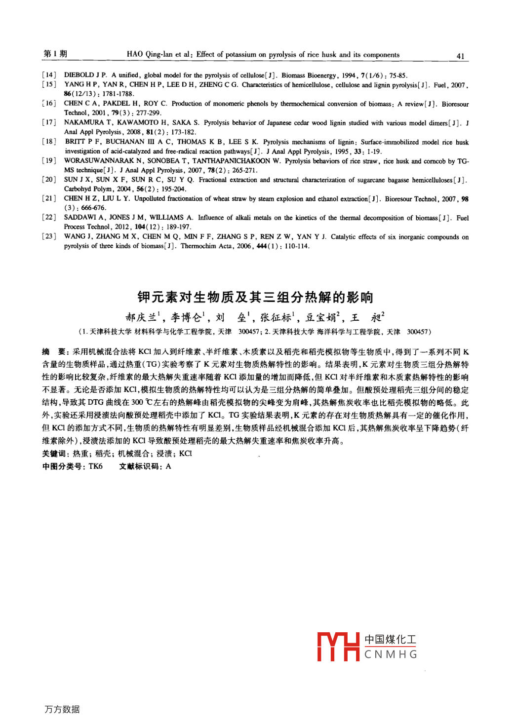 第43卷第1期燃料化學(xué)學(xué)報Vol 43 No. 12015年1月Journal of Fuel Chemistry and TechnologyJan.2015文章編號:0253-2409(2015)014003408Effect of potassium on pyrolysis of rice husk and its componentsHAO Qing-lan, LI Bo-lun, LIU Lei, ZHANG Zheng-biao, DOU Bao-juan, WANG Chang(1. College of Material Science& Chemical Engineering, Tianjin University of Science Technology, Tianyin 300457, China2. College of Marine Science Engineering, Tianyin University of Science Technology, Tianjin 300457, China)Abstract Different rice husk samples and their components ( cellulose, hemicellulose and lignin) were investigated with emphasison the influence of potassium on their pyrolysis behaviors by using thermogravimetric(TG)analysis. The results indicate that themaximum weight loss rate of cellulose decreases with the addition of KCl. However, no significant differences are observed for thepyrolysis behavior of hemicellulose and lignin. The TG/DTG curve of a model rice husk( a mixture of cellulose, hemicellulose andlignin)could be obtained by superposition of that for each component. However, during pyrolysis the raw stable structure of basiccomponents in the rice husk results in a change from a sharp peak for the model rice husk to a shoulder peak for the aw rice huskpretreated with HCl to remove K and the other mineral matters)at around 300 C. In addition the effect of KCl addition onpyrolysis of the Aw rice husks was also studied. The results show that potassium has a remarkable catalytic effect on pyrolysis of therice husk samples. The pyrolysis characteristics vary depending on the addition methods of KCl. While char yields decrease with theaddition of KCl using mechanical method except for the cellulose ) the char yield and the maximum weight loss rate ofimpregnated Aw rice husk increase gradually with the increase of KCl contKeywords: TG; rice husk; mechanical mixing; impregnation; KCICLC number. TK6Document code. ABiomasses are commonly accepted as one of the with product char, or dispersed on char surface.sustainable and renewable energy resources. They Knudsen et all7 reported that most K was releasedcould be converted to gas, liquid and solid products from the original binding sites when the pyrolysisthrough various thermo-chemical technologies such as temperature of straw was above 700 C. Some of thegasification and pyrolysis. The commercial potassium was transformed from the original bindingutilization of biomass energy is an alternative to fossil sites to gas phase, and the remaining presented inenergy to certain extent. In general, biomasses vary product char in the forms of KCI and K, CO,n its composition, depending on the species. The potassium silicates, or being bonded to organicmain components of biomass are cellulose(40%manx50%), hemicellulose (15 %-20%), lignin(20%Inherent K in biomass has catalytic effect on its30%),and small amount of mineral matters, such thermo-chemical conversion. Additionally, extermallyas K, Na, Ca and Mg, based on the dry base[3).Thedded K might also act as catalyst during biomassproduct yield and distributions are affected by the pyrolysis. The intrinsic k could restrain the formationpresence of mineral matters, especially K, during of volatile, and lower the initial pyrolysis temperaturebiomass pyrolysis(4,5)here are various forms of Kand the weight loss rate[8-101Nowakowski et alexistence during biomass growth process, and this reported that K could reduce the average apparentcomplicates its effect on the thermo-chemical activation energy for willow coppice pyrolysis by upconversion of biomassto 50 k/mol, and enhance the yields of char andK and other metallic elements exist in biomass in CH,. In the case of K in a synthetic biomass samplevarious forms, including ion state, interacting with the formation of levoglucosan was promoted duringorganic matrix, and mineral particles 6) Water- pyrolysis of cellulose. It is believed that external orsoluble K mainly presents in biomass in ion bonded added K promoted the formation of low molecularstate and minerals, while the K on the organic weight products and char during pyrolysis of poplaroxygen-containing functional groups is not soluble in wood, and the pyrolysis peak was shifted towards thewater.Moreover, the form of K may change during lower temperature rangeHowever, addition ofpyrolysis of biomass, and k on the original binding excessive K2CO, could promote pyrolysis of peanutsites of biomass may be deposited as fine potassium shell at higher temperature, and hinder the volatilealt( mainly KCl and K 2 CO,)particles, or mixed release[ 12中國煤化工inherent andReceived date: 2014-09-15: Received in revised form: 2014-12-03CNMHGFoundation item: Supported by the National Natural Science Foundation of China(21176191)CorrespondingauthorWangChang,Tel:+862260601433;e-mail;wangc88@163.com本文的英文電子版由Elsevier出版社在ScienceDirect上出版(hp:/w.sciencedirect.com/science/joumal/18725813)第1HAo Qing-lan et al: Effect ofium on pyrolysis of rice husk and its componentsadded K has not been understood well. And their impregnation method were also explored. The resultseffects on the pyrolysis of biomass and its three will provide a better understanding of the effect of Kcomponents( cellulose, hemicellulose and lignin) on the biomass pyrolysis for desired productsneed to be further studiedCellulose, hemicellulose, lignin, rice husk1 Experimentalmodel rice husk(mixture of cellulose, hemicellulose 1.1 Biomass samplesand lignin), and Aw rice husk( pretreated with HCIThe rice husk sample, used as the rawto remove K and the other mineral matters)were materials, was ground and sieved. Thefractionselected as the samples in this study. The effect of K 0. 12-0. 15 mm(120- 100 mesh was dried aton the pyrolysis characteristics of the samples were 105 C for 4 h before use. The ultimate, proximateinvestigated by thermogravimetric (TG)analysis. and chemical composition analyses of rice husk areThe a