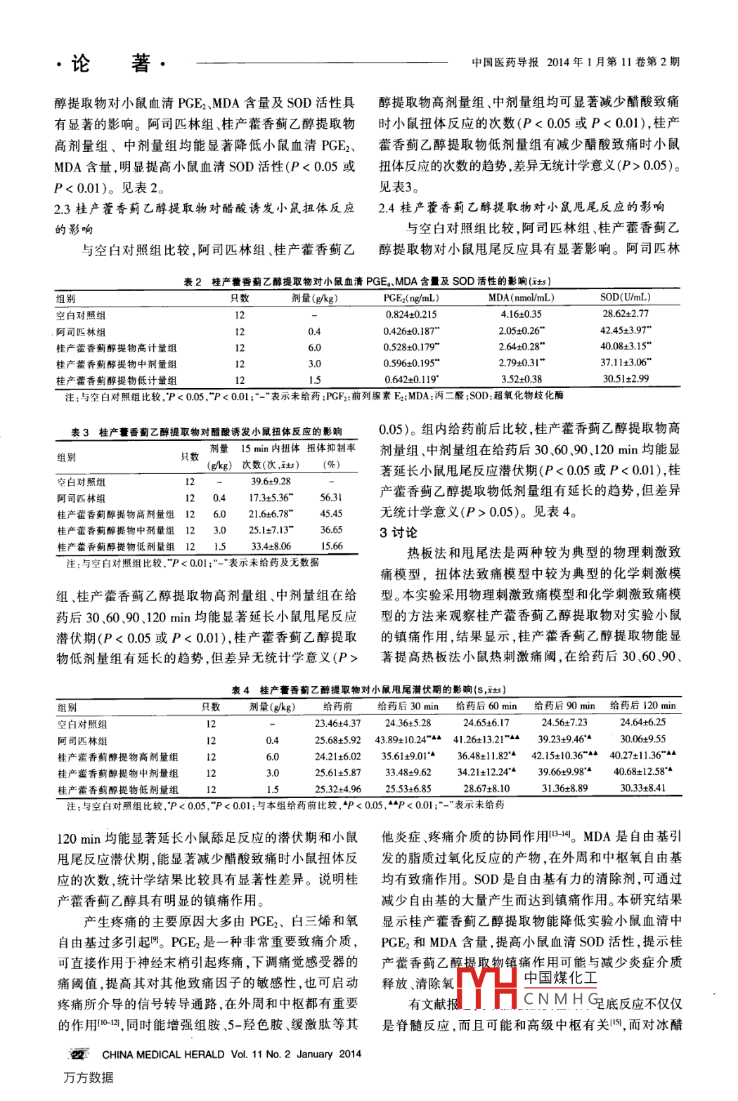 ·論著·中國(guó)醫(yī)藥導(dǎo)報(bào)2014年1月第11卷第2期桂產(chǎn)藿香薊乙醇提取物鎮(zhèn)痛作用研究唐秀能韋紅棉▲陸翠林周至品李建哲劉冠達(dá)廣西中醫(yī)藥大學(xué)附屬瑞康醫(yī)院,廣西南寧530011摘要]目的觀(guān)察桂產(chǎn)薇香薊乙醇提取物的鎮(zhèn)痛作用探討其作用機(jī)制。方法各自分別取60只合格昆明小鼠,隨機(jī)分為空白對(duì)照組阿司匹林組(0.4g/kg)、桂產(chǎn)藿香薊乙醇提取物高、中低劑量組,每組各12只。采用熱板法、扭體法和甩尾法來(lái)觀(guān)察桂產(chǎn)藿香薊乙醇提取物的鎮(zhèn)痛作用,并測(cè)定熱板法小鼠血清丙二醛(MDA)、前列腺素E2(PGE2)和超氧化物歧化酶(SOD)的活性。結(jié)果①與空白對(duì)照組比較,桂產(chǎn)藿香薊乙醇提取物能顯著提高熱板法小鼠熱刺激痛閾,在給藥后3060、90、120mn均能顯著延長(zhǎng)小鼠舔足反應(yīng)的潛伏期,差異均有統(tǒng)計(jì)學(xué)意義(P<0.05或P<001),顯著降低小鼠血清MDA和PGE2含量,提高SOD活性,差異有統(tǒng)計(jì)學(xué)意義(P<0.05或P<001)。②與空白對(duì)照組比較桂產(chǎn)藿香薊乙醇提取物均可顯著減少醋酸致痛時(shí)小鼠扭體反應(yīng)的次數(shù),差異有統(tǒng)計(jì)學(xué)意義(P<005或P<001),其中桂產(chǎn)藿香薊乙醇提取物高、中和低劑量組(60、3.0、1.5gkg)扭體抑制率分別為4545%、3565%和15.66%。③無(wú)論是與空白對(duì)照組比較還是與本組給藥前比較桂產(chǎn)截香薊乙醇提取物在給藥后30、6090、120min能顯著延長(zhǎng)小鼠甩尾反應(yīng)潛伏期,差異有統(tǒng)計(jì)學(xué)意義(P<005或P<001)。結(jié)論桂產(chǎn)藿香薊乙醇提取物具有顯著的鎮(zhèn)痛作用,其機(jī)制之一可能與減少炎癥介質(zhì)釋放、清除氧自由基有關(guān)。[關(guān)鍵詞]柱產(chǎn)藿香薊乙醇提取物;鎮(zhèn)痛;機(jī)制[中圖分類(lèi)號(hào)]R85文獻(xiàn)標(biāo)識(shí)碼]A[文章編號(hào)]1673-7210(201401(b)-0020-0Study on analgesic effects of ethanol extract of Ageratum conyzoides. Lfrom guangxiTANG Xiuneng WEI Hongmian LU Cuilin ZHOU Zhipin LI Jianzhe LIU GuandaRuikang Hospital Affiliated to Guangxi University of Chinese Medicine, Guangxi Zhuang Autonomous Region, Nanning530011, China[Abstract] Objective To observe analgesic effects of ethanol extract of A geratum conyzoides L. from Guangxi and toexplore its analgesic mechanisms. Methods 60 Kunming mice were selected individually in hot-plate method, bodytorsion method and swinging-tail method, all of them were divided into blank control group, Aspirin group(0. 4 g/kg), A geratum conyzoides. L low dosage group, medium dosage group, high dosage groupmethod, body-torsion method and swinging-tail method were used respectively to investigate the analgesic effects ofethanol extract of A geratum conyzoides L from Gti, and then, the contents of malondialdehyde(MAD) and prostaglandinE2(PGE)and the activity of superoxide dismutase(SOD) in hot-plate mice serum were measured. Results Comparedwith blank control group, thermal stimulation threshold in hot-plate mice was enhanced by the ethanol extract of A ger-atum conyzoides. L. from Guangxi, the latency time of the mice's licking at 30, 60, 90, 120 min respectively were pro-longed, the differences were statistically significant(P<0.05 or P< 0.01). Meanwhile, MDA and PGE productions werereduced and SOD level in mice serum enhanced, the differences were statistically significant (P< 0.05 or P< 0.01)@2) Compared with model control group, mouse twisting munbers were remarkably reduced by Ageratum conyzoides. L.from Guangxi, the differences were statistically significant(P< 0.05 or P<0. 01). Body twisting inhibition rate in highmedium and low dosage group (6.0, 3.0, 1.5 g/kg) were 45.45%, 35.65% and 15.66% respectively. @3 Not only com-pared with blank control group but also compared with former dose in each group, the latency of the tail flick responsein the mice at 30, 60, 90, 120 min were prolonged respectively after given the ethanol extract of A geratum conyzoidesL from Guangxi, the differences were statistically significant(P< 0.05 or P<0.01). Conclusion The ethanol extract ofA geratum conyzoides L. from Guangxi has significantly基金項(xiàng)目]廣西壯族自治區(qū)衛(wèi)生廳自籌經(jīng)費(fèi)科研課題(編號(hào)anms maZ2011251)。be relate to its ability of scavenging oxygen free radicals作者簡(jiǎn)介唐秀能(19714-),男,壯族,碩土,副主任藥師, and reducing t中國(guó)煤化工oki碩士研究生導(dǎo)師;研究方向:生化藥理學(xué)及臨床藥學(xué)Key wordsCN MH Gonyzoides L▲通訊作者AF CHINA MEDICAL HERALD Vol 11 No. 2 January 2014中國(guó)醫(yī)藥導(dǎo)報(bào)2014年1月第11卷第2期論著藿香薊屬于菊科植物藿香薊,又名勝紅薊、白花有痛閾值測(cè)定結(jié)束后,立即行小鼠眼球取血,3500rmin草、白花臭草、消炎草等,屬一年生草本植物,多以全離心15min,棄下層沉淀,留上清液。將上清液置草或葉及嫩莖入藥,傳統(tǒng)藥用功效為清熱解毒、止血、于-20℃冰箱保存,隨后按照試劑盒說(shuō)明書(shū)的方法測(cè)止痛等,在亞洲、非洲、南美洲等地均廣泛使用2。我定前列腺素E2(PGE2)MDA的含量和SOD活性國(guó)多分布于廣東、廣西、云南、貰州、四川、江西、福建12對(duì)醋酸誘發(fā)小鼠扭體反應(yīng)的影響另取一批小等地,民間常用于治感冒發(fā)熱、咽喉腫痛、疔瘡濕疹、鼠60只,體重(20±2)g,雌雄各半,分組及給藥同外傷出血、燒燙傷等。本研究采用野生于廣西田間荒“1.2.1”項(xiàng)下。末次給藥后1h,每只小鼠腹部注射地的桂產(chǎn)藿香薊進(jìn)行鎮(zh