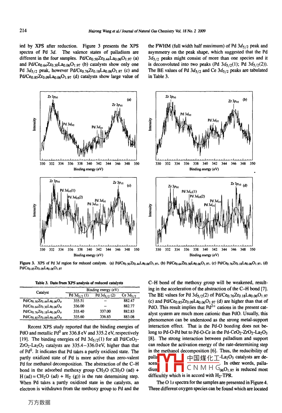 Available online at www.sciencedirect.comJIUPIUL.FScienceDirectSNGCFNATURALGASCHEMISTRYEL SEVIERJoumnal of Natural Gas Chemistry 18(2009)211-216www. elsevier.com/locate/jngcCatalytic methanol decomposition to carbon monoxide and hydrogenover Pd/CeO2-ZrO2-La2O3 with different Ce/Zr molar ratiosHairong Wang,Yaoqiang Chen, Qiulin Zhang,Qingchao Zhu,Maochu Gong,Ming Zhao*Kay Laboratory of Green Chemistry & Technology of Ministry Education, College of Chemistry, Sichuan University, Chengdu 610064, Sichuan, China[ Received February 5, 2009; Revised March 27, 2009; Available online June 24, 2009]AbstractThe catalytic behaviors of Pd (1.4 wt%) catalysts supported on CeO2-ZrO2-La2O3 mixed oxides with different Ce/Zr molar ratios wereinvestigated for methanol decomposition. Nitrogen adsorption-desorption (BET), X-ray photocletron spectroscopy (XPS), H2 temperature-programmed reduction (H2-TPR), X-ray dffractiono (XRD) and Pd dispersion analysis were used for their characterization. PdCeo.76Z0.18La0.06O1 97 catalyst showed the highest BET surface area, best Pd dispersion capability and strongest metal-support interaction. Moreover, XPSshowed that there was lttice defect oxygen or mobile oxygen. According to the result of 0 Is measurements the lttice defect oxygen or mobileoxygen helped to maintin Pd in a partly oxidized state and increased the activity for methanol decompositin. The PCo.7670.18L30.06O1.97catalyst exhibited the best activity. A 100% conversion of methanol was achieved at around 260 °C, which was about 20- -40 °C lower thanother catalystsKey wordsmethanol decomposition; plladium; CeO2-ZrO2-La2O3; XPS; hydrogen; carbon monoxide1. Introductionited space in the engine fuel compartment and limited temper-ature of the exhaust heat, especially at cold start, the methanolRecently the decomposition of methanol to H2 and COdecomposition catalysts are required to be active at low tem-has drawn growing attention. The decomposition product isperature [5]. For base metal catalysts, its low temperature ac-a cleaner and more efficient fuel than gasoline and undecom-tivity and selectivity to CO and H2 are poor. The Pd-based cat-posed methanol for internal combustion engines of automo-alysts seem to be preferred and their activity is largely affectedbiles. The decomposition may be brought about by makingby the supports. Kapoor [6] and Liu [7] et al. prepareduse of engine exhaust heat, and this would increase the heatingPd/CeO2-ZrO2 catalysts. A more active Pds+(0< 8 <2) statevalue of the fuel. The methanol decomposition is also attrac-could be maintained. Moreover, palladium particles with bet-tive as a source of hydrogen and/or synthesis gas for chemicalter distribution and stability were on the surface of CeO2-ZrO2processes or as an ecological fuel for gas turbines and fueloxides supports. Sun [8] and Yang [9] et al. reported thatcells. Moreover, it is an endothermic reaction as well as re-the addition of lanthana significantly improved the activity ofversible reaction, which can operate in a suitable temperaturePd supported catalysts. Besides, lanthana could enhance therange. The equilibrium conversion of methanol decomposi-dispersion of active component and increase the mumber oftion reaches around 100% at 473 K at atmospheric pressure.active sites. Guo et al. [10] prepared Ceo.3sZro.ssLao. 1oO1.95solid solution, which improved thermal resistance and showedCH;OH→CO+ 2H2△H = 90.7kJ/molgood redox property. However, up to now, there are few re-Various metals like nickel, copper, iron, platinum and pal-ports on the catalytic behavior of methanol decompositionladium supported on Al2O3, SiO2, TiO2, ZrO2, CeO2, activedover Pd/CeO2-ZrO2-La2O3. The goal of this paper is to inves-carbon and synthetic clays were reported to be effective fortigate the surface properties and catalytic performances overmethanol decomposition [1-4]. However, because of the lim-Pd/CeO--7x0--1 g0z for methanol decomposition.中國煤化工●Crresponding author. Tel: +86-28-85418451; Fax: +86-28-85418451; E-mail: micFoundation item: the National Natural Science Foundation of China (20773090)TYHC N M H Ge Docon Pogam ofHigterEducation of China (20070610026, 2010000)Copright@2009, Dalian Institute of Chemical Physics, Chinese Academy of Sciences. All rights reserved.doi:10.1016/S1003-9953(08)60109-7212Hairong Wang et al/ Journal of Natural Gas Chemisty Vol. 18 No.220092. Experimentalments were carried out in a conventional system equippedwith a thermal conductivity detector. All samples (100 mg)2.1. Catalyst preparationwere pretreated in a quartz U-tube in a flow of pure N2 at400°C for 45 min, and then cooled. The reduction was car-The CeO2-ZrO2-La2O3 samples with different CelZr mo~ried out in a flow of H2 (5%, diluted with N2) from 50°C tolar ratios were prepared by co-precipitation method from900 °。C with a linear heating rate of 8 °C/minthe corresponding chemicals: Ce(NO3)3-6H2O, Zr0CO3Pd dispersion was measured after reducing the sam-and La(NO3)3-6H2O at a nominal composition. The pre-ple (200 mg) at the appropriate temperature (400。C) undercursors were mixed in an aqueous solution, respectively,5%H2-95%N2 flow for 1 h. The remmant H2 was driven offand an appropriate amount of fresh H2O2 was added towith argon at 420 °C for 30 min, then the sample was cooledthis mixed salt solution. Then the mixed salt solutiondown to room temperature under argon flow. Finally, pulse ofwas added dropwise to a new container with a mixedCO was injected up to the breakthrough point. Pd dispersionsolution of ammonia and ammonia- carbonate aqueous so-was evaluated from CO consumption.lution, to reach a pH value of 9.0. The precipitatesThe X-ray photoelectron spectroscopy (XPS) experi-were filtered, washed, dried, and calcined at 600°C forments were carried out on a spectrometer (XSAM-800,4h. Finally, Co.o0.4La0.oO1.97, Ce.64Zxo 3oL 80.0601.97,KRATOS Co) with Mg K。radiation under UHV. All samplesCeo.76Zro.18L80.0601.97 and Ceo,8sZr