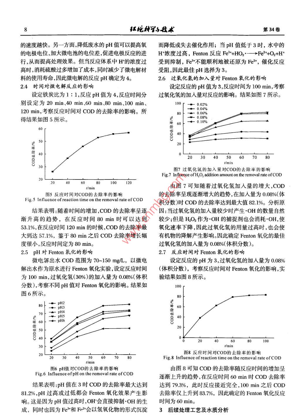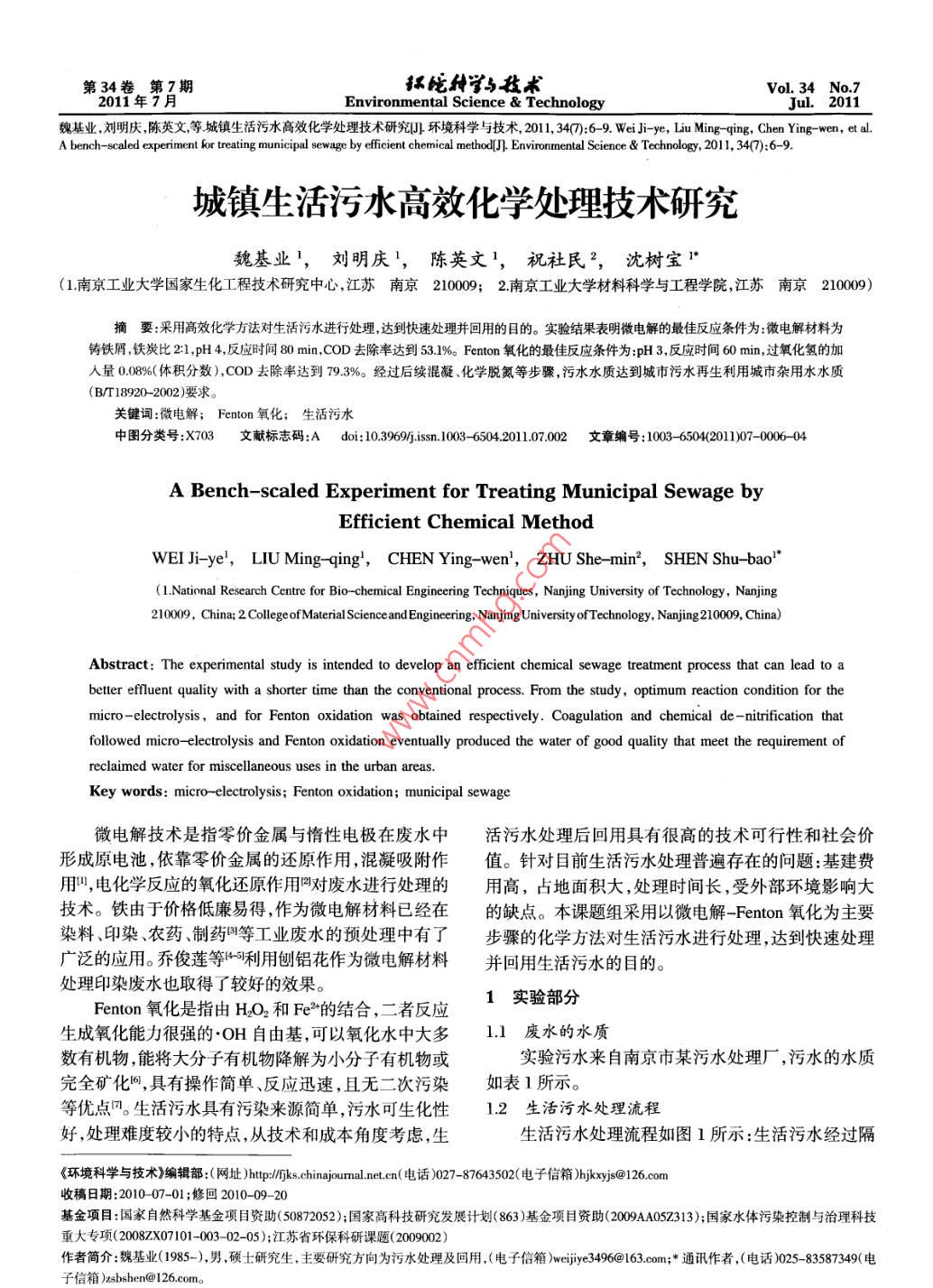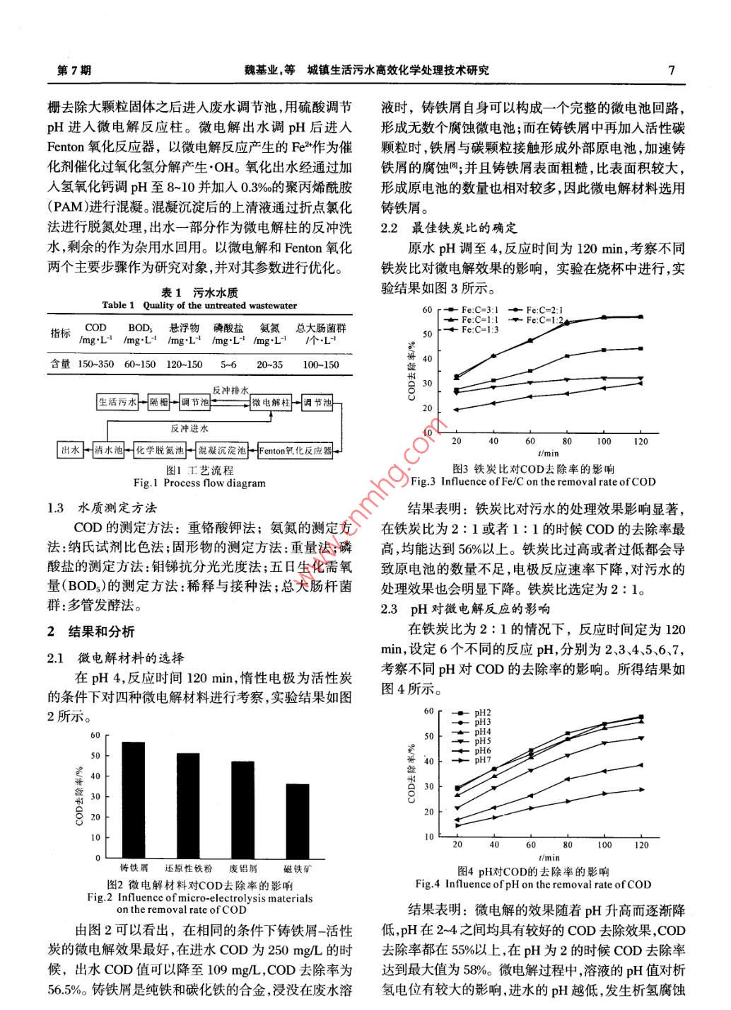 第34卷第7期抓比排術(shù)Vol 34 No. 72011年7Environmental Science TechnologyJ2011魏基業(yè),劉明慶,陳英文,等城鎮(zhèn)生活污水高效化學(xué)處理技術(shù)研究環(huán)境科學(xué)與技術(shù),2011,347:6-9.Weij-ye, Liu Ming-ging, Chen Ying-wen,etlA bench-scaled experiment for treating municipal sewage by efficient chemical method[J. Environmental Science& Technology, 2011, 34(7): 6-9城鎮(zhèn)生活污水高效化學(xué)處理技術(shù)研究魏基業(yè)1,劉明慶,陳英文1,祝社民2,沈樹寶(1南京工業(yè)大學(xué)國家生化工程技術(shù)研究中心,江蘇南京21000;京工業(yè)大學(xué)材料科學(xué)與工程學(xué)院江蘇南京21000摘要:采用高效化學(xué)方法對(duì)生活污水進(jìn)行處理達(dá)到快速處理并回用的目的。實(shí)驗(yàn)結(jié)果表明微電解的最佳反應(yīng)條件為微電解材料為鑄鐵屑,鐵炭比21,pH4,反應(yīng)時(shí)間80min,COD去除率達(dá)到531%。 Fenton氧化的最佳反應(yīng)條件為pH3,反應(yīng)時(shí)間60min,過氧化氫的加入量0.08%(體積分?jǐn)?shù)),COD去除率達(dá)到793%。經(jīng)過后續(xù)混凝、化學(xué)脫氮污水水質(zhì)達(dá)到城市污水再生利用城市雜用水水(B/T8920-2002)要求關(guān)鍵詞:微電解; Fenton氧化;生活污水中圖分類號(hào):X703文獻(xiàn)標(biāo)志碼Adoi:10.3969/isn.1003-6504.201107.002文章編號(hào):10036504(201107-000-04A Bench-scaled Experiment for Treating Municipal Sewage byEfficient Chemical MethodWEI Ji-ye, LIU Ming-qing, CHEN Ying-wen, ZHU She-min, SHEN Shu-bao'(1. National Research Centre for Bio-chemical Engineering Techniques, Nanjing University of Technology, Nanjing210009, China; 2 College of Material Scienceand Engineering, Nanjing University of Technology, Nanjing 210009, China)Abstract: The experimental study is intended to develop an efficient chemical sewage treatment process that can lead to abetter effluent quality with a shorter time than the conventional process. From the study, optimum reaction condition for themicro-electrolysis, and for Fenton oxidation was obtained respectively. Coagulation and chemical de-nitrification thfollowed micro-electrolysis and Fenton oxidation eventually produced the water of good quality that meet the requirement ofreclaimed water for miscellaneous uses in the urban areasKey words: micro-electrolysis; Fenton oxidation; municipal sewage微電解技術(shù)是指零價(jià)金屬與惰性電極在廢水中活污水處理后回用具有很高的技術(shù)可行性和社會(huì)價(jià)形成原電池,依靠零價(jià)金屬的還原作用,混凝吸附作值。針對(duì)目前生活污水處理普遍存在的問題:基建費(fèi)用,電化學(xué)反應(yīng)的氧化還原作用對(duì)廢水進(jìn)行處理的用高,占地面積大,處理時(shí)間長,受外部環(huán)境影響大技術(shù)。鐵由于價(jià)格低廉易得,作為微電解材料已經(jīng)在的缺點(diǎn)。本課題組采用以微電解- Fenton氧化為主要染料、印染、農(nóng)藥、制藥叫等工業(yè)廢水的預(yù)處理中有了步驟的化學(xué)方法對(duì)生活污水進(jìn)行處理,達(dá)到快速處理廣泛的應(yīng)用。喬俊蓮等利用刨鋁花作為微電解材料并回用生活污水的目的。處理印染廢水也取得了較好的效果。Fenton氧化是指由HO2和Fe°的結(jié)合,二者反應(yīng)實(shí)驗(yàn)部分生成氧化能力很強(qiáng)的OH自由基,可以氧化水中大多1.1廢水的水質(zhì)數(shù)有機(jī)物能將大分子有機(jī)物降解為小分子有機(jī)物或?qū)嶒?yàn)污水來自南京市某污水處理廠,污水的水質(zhì)完全礦化,具有操作簡單、反應(yīng)迅速,且無二次污染如表1所示。等優(yōu)點(diǎn)。生活污水具有污染來源簡單,污水可生化性1.2生活污水處理流程好,處理難度較小的特點(diǎn),從技術(shù)和成本角度考慮,生生活污水處理流程如圖1所示:生活污水經(jīng)過隔《環(huán)境科學(xué)與技術(shù)》編輯部:(網(wǎng)址)htp/ jks.chinajourmalneten(電話)027-87643502(電子信箱) hjkxyjs@126com收稿日期:201007-01;修回2010-09-20基金項(xiàng)目:國家自然科學(xué)基金項(xiàng)目資助(50872052);國家高科技研究發(fā)展計(jì)劃(863)基金項(xiàng)目資助(200A05Z313);國家水體污染控制與治理科技重大專項(xiàng)(2008ZX07101-003-02-05);江蘇省環(huán)??蒲姓n題(2009002)作者簡介:魏基業(yè)(1985-),男,碩士研究生,主要研究方向?yàn)槲鬯幚砑盎赜?(電子信箱) weijiye3496@163。com;*通訊作者,(電話)025-83587349(電子信箱) sishen@126com第7期魏基業(yè),等城鎮(zhèn)生活污水高效化學(xué)處理技術(shù)研究柵去除大顆粒固體之后進(jìn)入廢水調(diào)節(jié)池,用硫酸調(diào)節(jié)液時(shí),鑄鐵屑自身可以構(gòu)成一個(gè)完整的微電池回路,pH進(jìn)入微電解反應(yīng)柱。微電解出水調(diào)pH后進(jìn)入形成無數(shù)個(gè)腐蝕微電池;而在鑄鐵屑中再加入活性碳Fenton氧化反應(yīng)器,以微電解反應(yīng)產(chǎn)生的Fe作為催顆粒時(shí),鐵屑與碳顆粒接觸形成外部原電池,加速鑄化劑催化過氧化氫分解產(chǎn)生OH。氧化出水經(jīng)通過加鐵屑的腐蝕網(wǎng);并且鑄鐵屑表面粗糙,比表面積較大,人氫氧化鈣調(diào)pH至8~10并加入03‰的聚丙烯酰胺形成原電池的數(shù)量也相對(duì)較多,因此微電解材料選用(PAM)進(jìn)行混凝?;炷恋砗蟮纳锨逡和ㄟ^折點(diǎn)氯化鑄鐵屑法進(jìn)行脫氮處理,出水一部分作為微電解柱的反沖洗22最佳鐵炭比的確定水,剩余的作為雜用水回用。以微電解和 Fenton氧化原水pH調(diào)至4,反應(yīng)時(shí)
