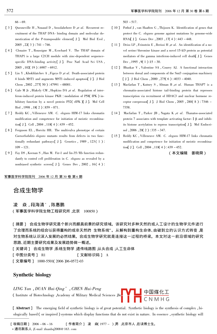 572軍事醫(yī)學(xué)科學(xué)院院刊2006年12月第30卷 第6期66 - 69.503 -517.[3 ] Quesneville H , Nouaud D , Anxolabehere D et al. Recurrent re-[ 10] Pothof J , van Hatn G ,hijssen K. Identification of genes thatcruitment of the THAP DNA- binding domain and molecular do-protect the C. elegans genome against mutations by genome-widemestication of the P-transposable element[ J ] Mol Biol Evol ,RNA[J] Genes Dev ,2003 ,17( 4 ):443 - 448.2005 ,22(3 ):741 -746.[11 ] Deiss LP ,Feinstein E , Berissi H el al. An ienification of a no-[4] Clouaire T , Roussigne M , Ecochard V. The THAP domain ofvel serine/ threonine kinase and a novel 15-kD protein as potentialTHAPI is a large C2CH module with zinc-dependent sequence-mediators of the garnma interferon-induced cell deat[ J ] Genesspecifie DNA-binding activity[ J ] Proe Natl Acad Sci USA ,Dev ,1995 ,9(1 ):15 -30.2005 , 102( 19):6907 - 6912.[ 12 ] Bhaskar V , Valentine SA , Courey AJ. A functional interaction[5] Lin Y , Khokhlatchev A , Figeys D et al. Death-associated proteinbetween dorsal and components of the Smt3 conjugation machinery4 binds MST1 and augments MSTI -induced apoptosi[ J] J Biol[J] J Biol Chem ,2000 ,275( 6 ):4033 - 4040.Chem ,2002 ,277( 50 ) :47991 - 48001.[ 13] Macfarlan T , Kutney S , Altman B ,et al. Human THAP7 is a[6] Gale M Jr ,Blakely CM , Hopkins DA el al. Regulation of inter-chromain-associated histone tail-binding protein that repressesferon-induced protein kinase PKR : modulation of P58( IPK ) in-transcription via recruitment of HDAC3 and nuclear hormone re-hibitory function by a novel protein P52( rIPK )[ J ] Mol Cellceptor corepressor[ J] J Biol Chem , 2005 , 280( 8 ): 7346 -Biol , 1998 ,18(2):859 - 871.7358.[7] Reddy KC , Villeneuve AM. C. elegans HIM-17 links chromatin[ 14] Macfarlan T , Parker JB , Nagata K ,et al. Thanatos-associatedmodification and competence for initiation of meiotic recombina-protein 7 associates with template activating factor- I β and inhib-tior[J] Cell ,2004 ,118(4) :439 -452.its histone acetylation to repress transcription[ J ]. Mol Endocri-[8] Ferguson EL , Horviz HR. The multivulva phenotype of certainnol ,2006 ,20( 2):335 -347.Caenorhabditis elegans mutants resuts from defects in two func- [ 15] Reddy KC , Villeneuve AM. C. elegans HIM-17 links chromatintionally redundant pathways[ J ] Genetics, 1989 , 123( 1 ):109-121.tior[ J]. Cell ,2004 ,118(4 ):439 -452.[9] Fay DS , KeenanS ,Han M. Fzr-1 and lin-35/ Rb function redun-(本文編輯姜曉舜)dantly to control cell proliferation in C. elegans as revealed by anonbiased synthetic screen[ J] Genes Dev , 2002 , 16( 4 ):軍事醫(yī)學(xué)科學(xué)院院刊_ 2006年12月 第30卷第6期合成生物學(xué)凌焱,段海清”,陳惠鵬(軍事醫(yī)學(xué)科學(xué)院生物工程研究所北京100850 )[摘要]合成生物學(xué)研究是個(gè)新興而頗具前景的研究領(lǐng)域。該研究對(duì)多種天然的或人工設(shè)計(jì)的生物學(xué)元件進(jìn)行了合理而系統(tǒng)的組合以獲得重構(gòu)的或非天然的生物系統(tǒng)”。從解構(gòu)到重構(gòu)生命體、由破到立的認(rèn)識(shí)方式轉(zhuǎn)變是對(duì)生物系統(tǒng)認(rèn)識(shí)深入發(fā)展的必然結(jié)果。合成生物學(xué)研究就是連接這-過(guò)程的橋梁。本文對(duì)這-前沿領(lǐng)域的研究思路、近期主要研究成果及發(fā)展趨勢(shì)做一概述。[關(guān)鍵詞]合成生物學(xué) 系統(tǒng)生物學(xué)遺傳線路圖從頭合成人工生命體[中圖分類號(hào)] R1[文獻(xiàn)標(biāo)識(shí)碼]A[文章編號(hào)] 100-5501( 2006 )06-0572-03Synthetic biologyLING Yan , DUAN Hai-Qing* , CHEN Hui-Peng中國(guó)煤化工( Institute of Biotechnology Academy of Military Medical Sciences ITYHCNMHG[ Abstract ] The emerging field of synthetic biology is of great potential. Synthetic biology is the synthesis of complex ,bi-ologically based ( or inspired ) systems which display functions that do not exist in nature. In essence , synthetic biology will[收稿日期] 2006 -06-16.[作者簡(jiǎn)介]凌焱(1977- )男北京市人在讀博士生。*通訊聯(lián)系人E-mail xduanhq2008@ 163. com軍事醫(yī)學(xué)科學(xué)院院刊2006 年12月第30卷第6期enable the design of biological systems in a rational and systematic way. Synthetic biology stands at the meeting-point of de-structing life and construction of life. In this article the current state of this field in scientific and technalogical perspectiveis reviewed and the potentially beneficial outcomes are explored.[ Key words ] synthetic biology ; systems biology ; genetic circuit ; de novo synthesis ; artificial life早在1978年就已有人預(yù)言合成生物學(xué)"時(shí)代將會(huì)來(lái)題.上(例如利用光能來(lái)處理廢氣、凈化水)或者能制造出用臨'。人工合成基因研究最早出現(xiàn)在20世紀(jì)60年代2]然化學(xué)與生物合成方法都難以獲得的具有復(fù)雜結(jié)構(gòu)的藥物或而受到當(dāng)時(shí)基因合成能力與成本因素的制約在飛速發(fā)展者將-些能對(duì)身體健康狀況的改變做出應(yīng)答的基因和蛋白的DNA重組技術(shù)備受矚目時(shí)人工合成基因的應(yīng)用十分有質(zhì)整合成分子醫(yī)生”,使其在多種疾病的發(fā)病早期就發(fā)送限。時(shí)過(guò)境遷隨著遺傳工程和系統(tǒng)生物學(xué)的發(fā)展人們對(duì)警示訊息[51湛至還可以協(xié)助人類尋找宇宙中的其他生命跡生物系統(tǒng)的認(rèn)識(shí)逐步加深隨著基因組數(shù)據(jù)庫(kù)的日益豐富、象[°]。無(wú)疑結(jié)合了對(duì)基本生物學(xué)元件的深入了解和自由操生物信息學(xué)與材料科學(xué)領(lǐng)域的進(jìn)步新的技術(shù)方法、更高的作能力的合成生物學(xu