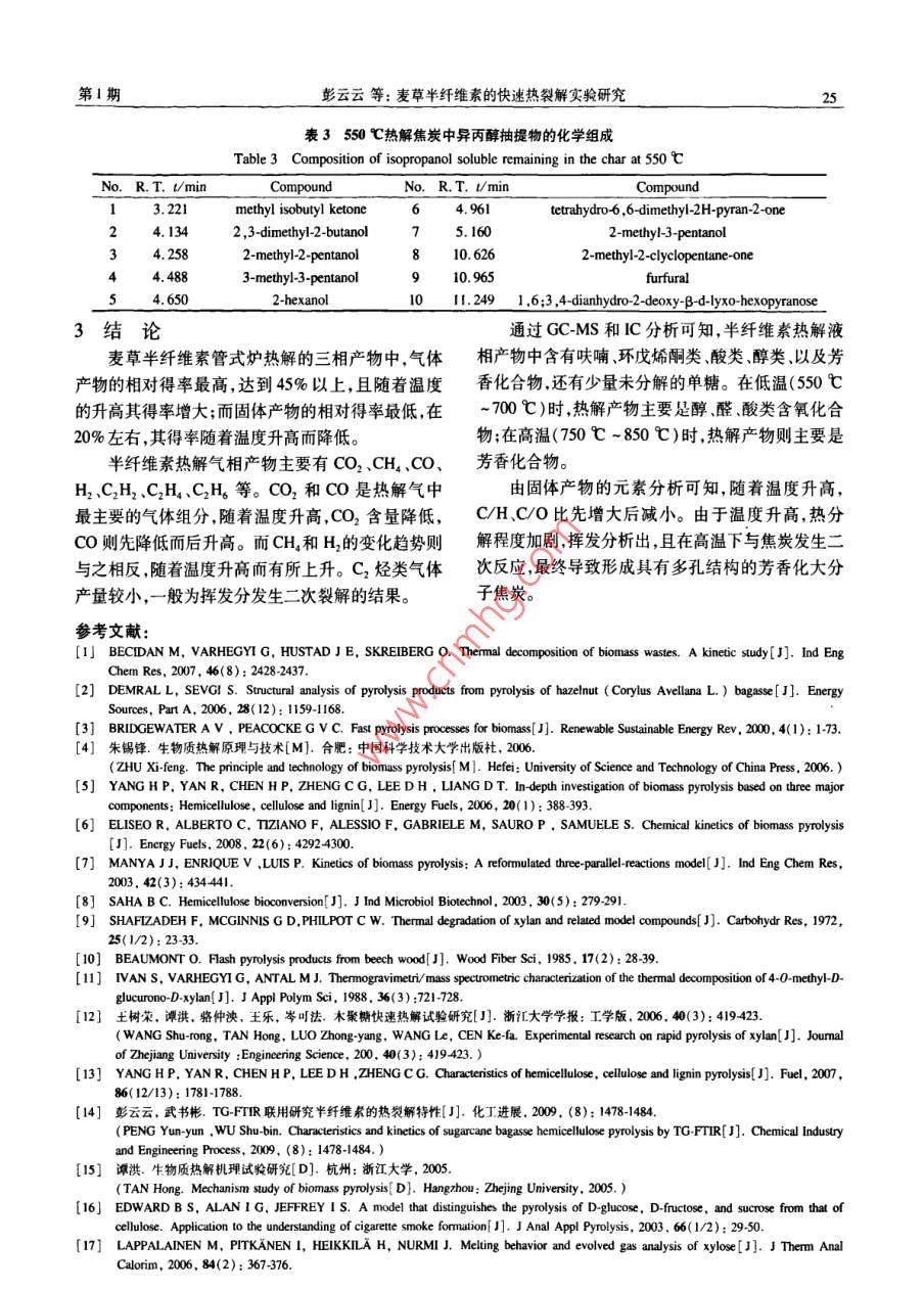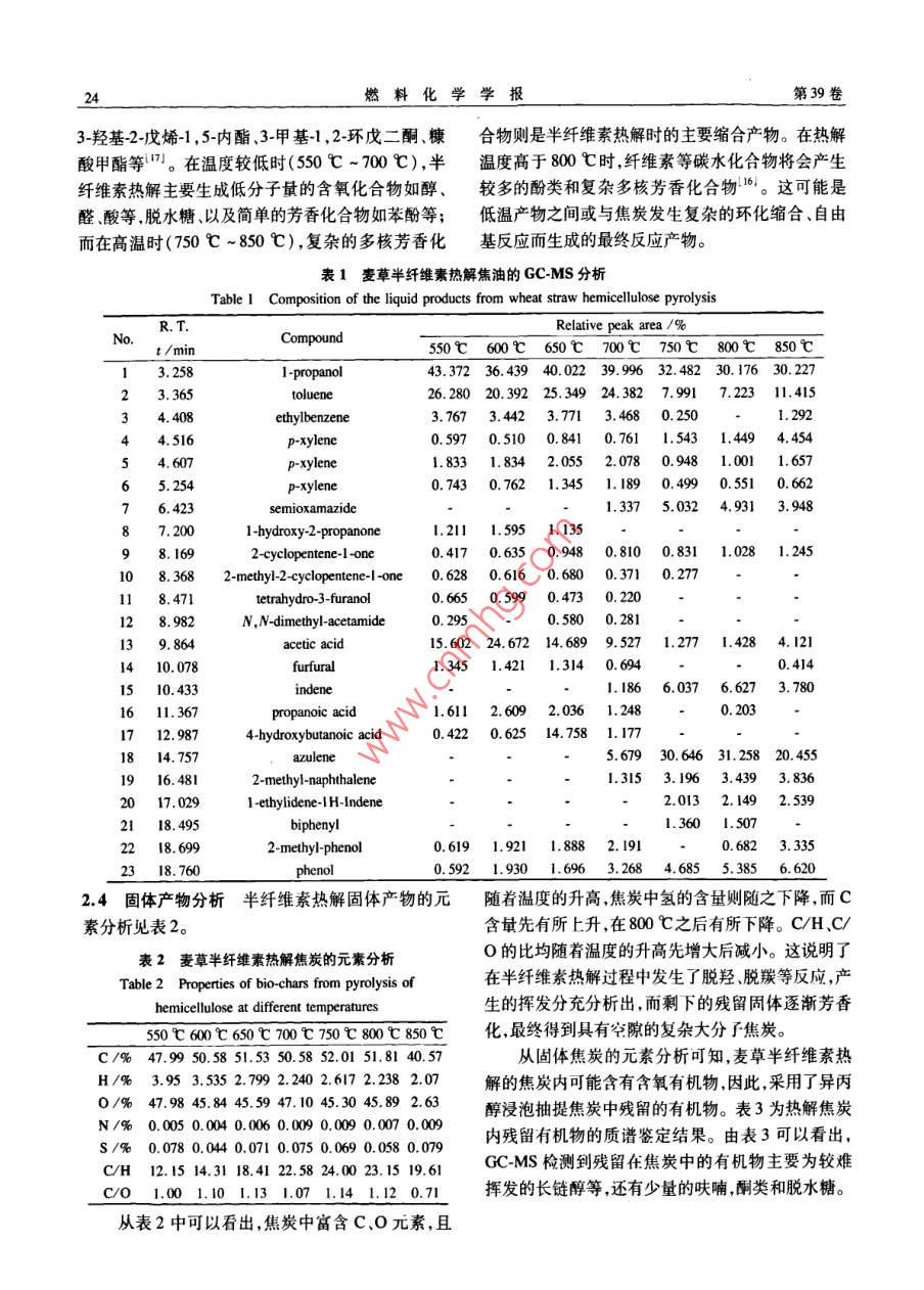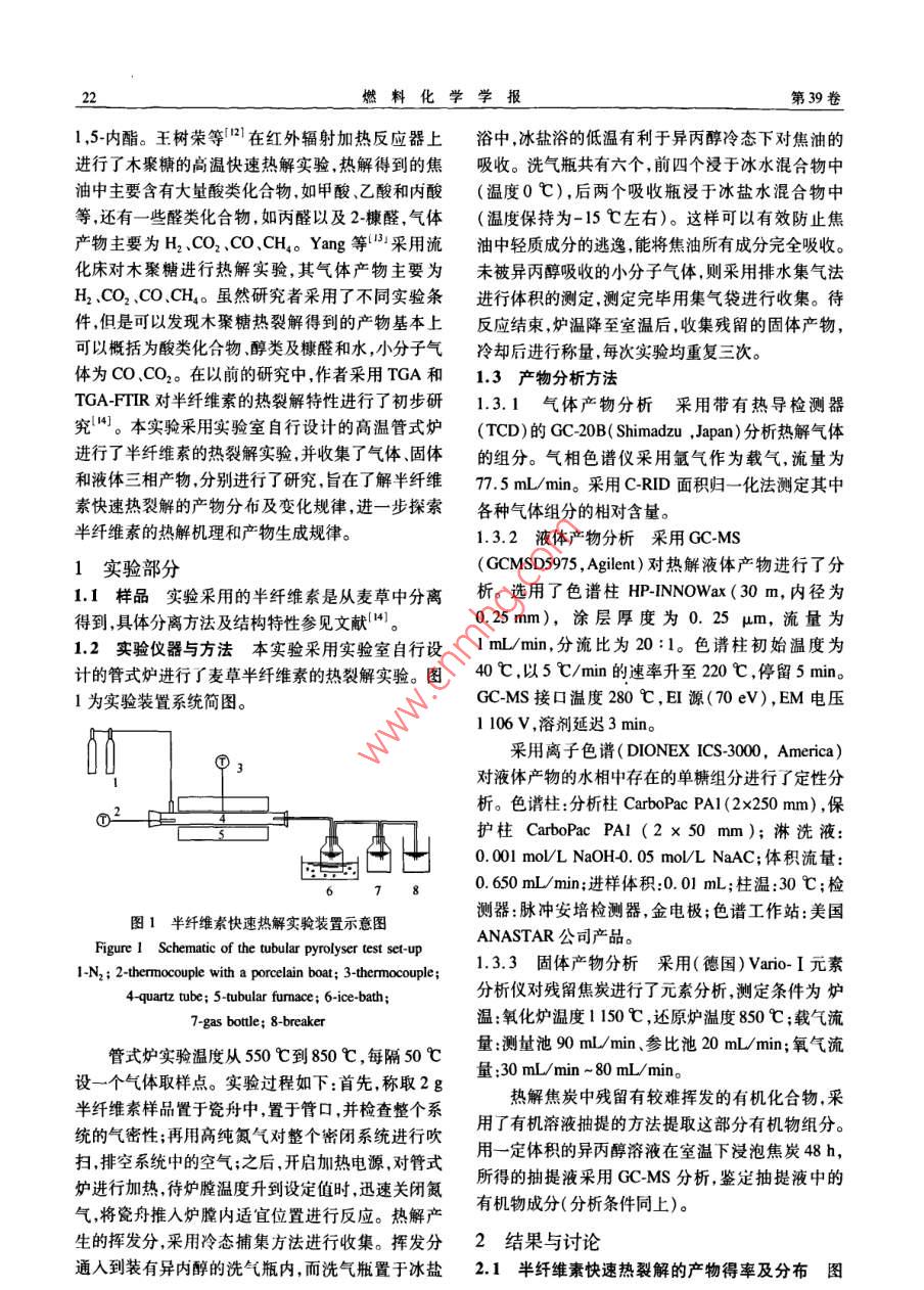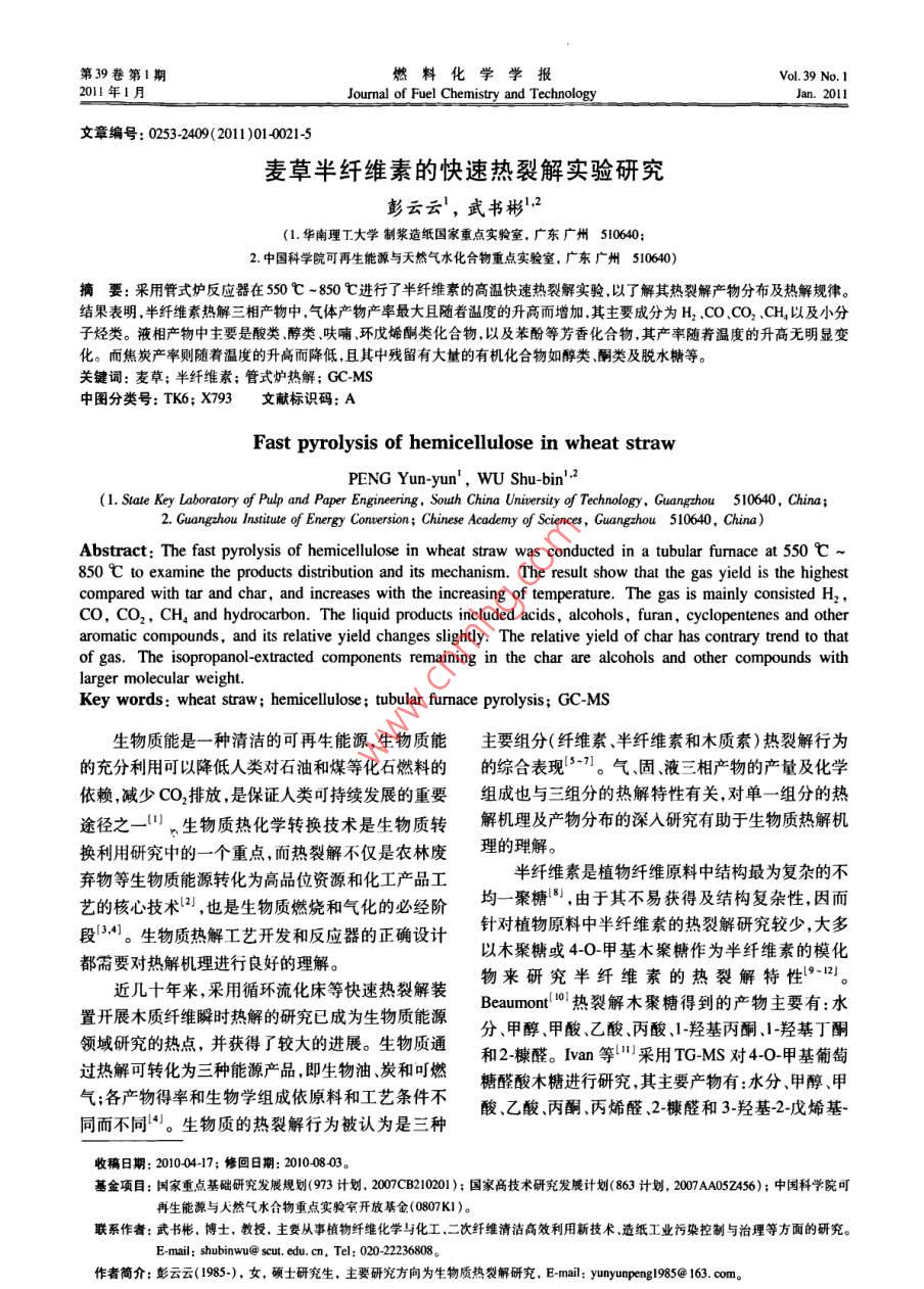 第39卷第1期燃料化學(xué)學(xué)報(bào)Vol. 39 No.12011年1月Journal of Fuel Chemistry and TechnologyJan. 2011文章編號(hào): 0253-2409(2011)01-0021-5麥草半纖維素的快速熱裂解實(shí)驗(yàn)研究彭云云',武書彬.2(1.華南理I.大學(xué)制漿造紙國家重點(diǎn)實(shí)驗(yàn)室,廣東廣州510640;2.中國科學(xué)院可再生能源與天然氣水化合物重點(diǎn)實(shí)驗(yàn)室,廣東廣州510640)摘要: 采用管式爐反應(yīng)器在550 c -850 C進(jìn)行了半纖維素的高溫快速熱裂解實(shí)驗(yàn),以了解其熱裂解產(chǎn)物分布及熱解規(guī)律。結(jié)果表明.半纖維素?zé)峤馊喈a(chǎn)物中,氣體產(chǎn)物產(chǎn)率最大且隨者溫度的升高而增加,其主要成分為H, .Co .CO2.CH,以及小分子烴類。液相產(chǎn)物中主要是酸類.醇類、呋喃、環(huán)戊烯酮類化合物,以及苯酚等芳香化合物,其產(chǎn)率隨著溫度的升高無明顯變化。而焦炭產(chǎn)率則隨著溫度的升高而降低.且其中殘留有大量的有機(jī)化合物如醇類、闈類及脫水糖等。關(guān)鍵詞:麥草;半纖維素;管式爐熱解; GCMS中圖分類號(hào): TK6; X793文獻(xiàn)標(biāo)識(shí)碼: AFast pyrolysis of hemicellulose in wheat strawPENG Yun-yun' , WU Shu-bin'.2(1. Stale Key Laboratory of Pulp and Paper Engineering,Souh China Universty of Technology, Guangzhou 510640, China;2. Guangzhou Instiute of Energy Conersion; Chinese Academy of Sciences, Cuangzhou 510640, China)Abstract: The fast pyrolysis of hemicellulose in wheat straw was conducted in a tubular furmace at 550 C ~850 C to examine the products distribution and its mechanism. The result show that the gas yield is the highestcompared with tar and char, and increases with the increasing of temperature. The gas is mainly consisted H2CO, CO2, CH, and hydrocarbon. The liquid products included acids,alcohols, furan, cyclopentenes and otheraromatic compounds . and its relative yield changes slightly. The relative yield of char has contrary trend to thatof gas. The isopropanol-extracted components remaining in the char are alcohols and other compounds withlarger molecular weight.Key words: wheat straw; hemicellulose; tubular furnace pyrolysis; GC-MS生物質(zhì)能是一種清潔的可再生能源,生物質(zhì)能主要組分(纖維素.半纖維素和木質(zhì)素)熱裂解行為的充分利用可以降低人類對(duì)石油和煤等化石燃料的的綜合表現(xiàn)5-7]。氣固液三相產(chǎn)物的產(chǎn)量及化學(xué)依賴,減少CO2排放,是保證人類可持續(xù)發(fā)展的重要組成也與三組分的熱解特性有關(guān),對(duì)單一組分的熱途徑之一_川n生物質(zhì)熱化學(xué)轉(zhuǎn)換技術(shù)是生物質(zhì)轉(zhuǎn)解機(jī)理及產(chǎn)物分布的深入研究有助于生物質(zhì)熱解機(jī)換利用研究中的一一個(gè) 重點(diǎn),而熱裂解不僅是農(nóng)林廢理的理解。棄物等生物質(zhì)能源轉(zhuǎn)化為高品位資源和化工產(chǎn)品工半纖維素是植物纖維原料中結(jié)構(gòu)最為復(fù)雜的不藝的核心技術(shù)21 ,也是生物質(zhì)燃燒和氣化的必經(jīng)階均一聚糖81,由于其不易獲得及結(jié)構(gòu)復(fù)雜性,因而段|.4)。生物質(zhì)熱解工藝開發(fā)和反應(yīng)器的正確設(shè)計(jì)針對(duì)植物原料中半纖維索的熱裂解研究較少,大多以木聚糖或4-0-甲基木聚糖作為半纖維素的模化都需要對(duì)熱解機(jī)理進(jìn)行良好的理解。近幾十年來,采用循環(huán)流化床等快速熱裂解裝物來研究半纖維素的熱裂解特性19-121。置開展木質(zhì)纖維瞬時(shí)熱解的研究已成為生物質(zhì)能源Beaumont' "0熱裂解木聚糖得到的產(chǎn)物主要有:水領(lǐng)域研究的熱點(diǎn),并獲得了較大的進(jìn)展。生物質(zhì)通分甲醇.甲酸,乙酸丙酸、1-羥基丙酮.1-羥基丁酮過熱解可轉(zhuǎn)化為三種能源產(chǎn)品,即生物油、炭和叮燃和2-糠醛。Ivan 等"采用TG-MS對(duì)4-0-甲基葡萄氣;各產(chǎn)物得率和生物學(xué)組成依原料和工藝條件不:糖醛酸木糖進(jìn)行研究,其主要產(chǎn)物有:水分、甲醇、甲同而不同4。生物質(zhì)的熱裂解行為被認(rèn)為是三種酸,乙酸,丙酮.丙烯醛、2-糠醛和3-羥基-2-戊烯基~收稿日期: 2010-04-17;修回日期: 2010.08.03。基金項(xiàng)目:國家重點(diǎn)基礎(chǔ)研究發(fā)展規(guī)劃(973計(jì)劃,2007CB210201);國家高技術(shù)研究發(fā)展計(jì)劃(863計(jì)劃, 2007AA052456);中國科學(xué)院可再生能源與天然氣水合物重點(diǎn)實(shí)驗(yàn)室開放基金(0807K1)。聯(lián)系作者:武書帳,博士,教授,主要從事植物纖維化學(xué)與化工.二次纖維清潔高效利用新技術(shù)、造紙工業(yè)污染控制與治理等方面的研究。E-mail; shubinwu@ seut. edu. cn, Tel: 020-22236808。作者簡介:彭云云(1985-),女,碩士研究生.主要研究方向?yàn)樯镔|(zhì)熱裂解研究, E mail: yunyunpeng1985@ 163. com。22燃料化學(xué)學(xué)報(bào)第39卷1,5-內(nèi)酯。王樹榮等[21在紅外輻射加熱反應(yīng)器上浴中,冰鹽浴的低溫有利于異丙醇冷態(tài)下對(duì)焦油的進(jìn)行了木聚糖的高溫快速熱解實(shí)驗(yàn),熱解得到的焦吸收。洗氣瓶共有六個(gè),前四個(gè)浸于冰水混合物中油中主要含有大量酸類化合物,如甲酸,乙酸和內(nèi)酸(溫度0C),后兩個(gè)吸收瓶浸于冰鹽水混合物中等,還有一些醛類化合物,如丙醛以及2-棟醛,氣體(溫度保持為-15 C左右)。這樣可以有效防止焦產(chǎn)物主要為H2.CO2 .Co ,CH。Yang 等(3)采用流油中輕質(zhì)成分的逃逸,能將焦油所有成分完全吸收?;