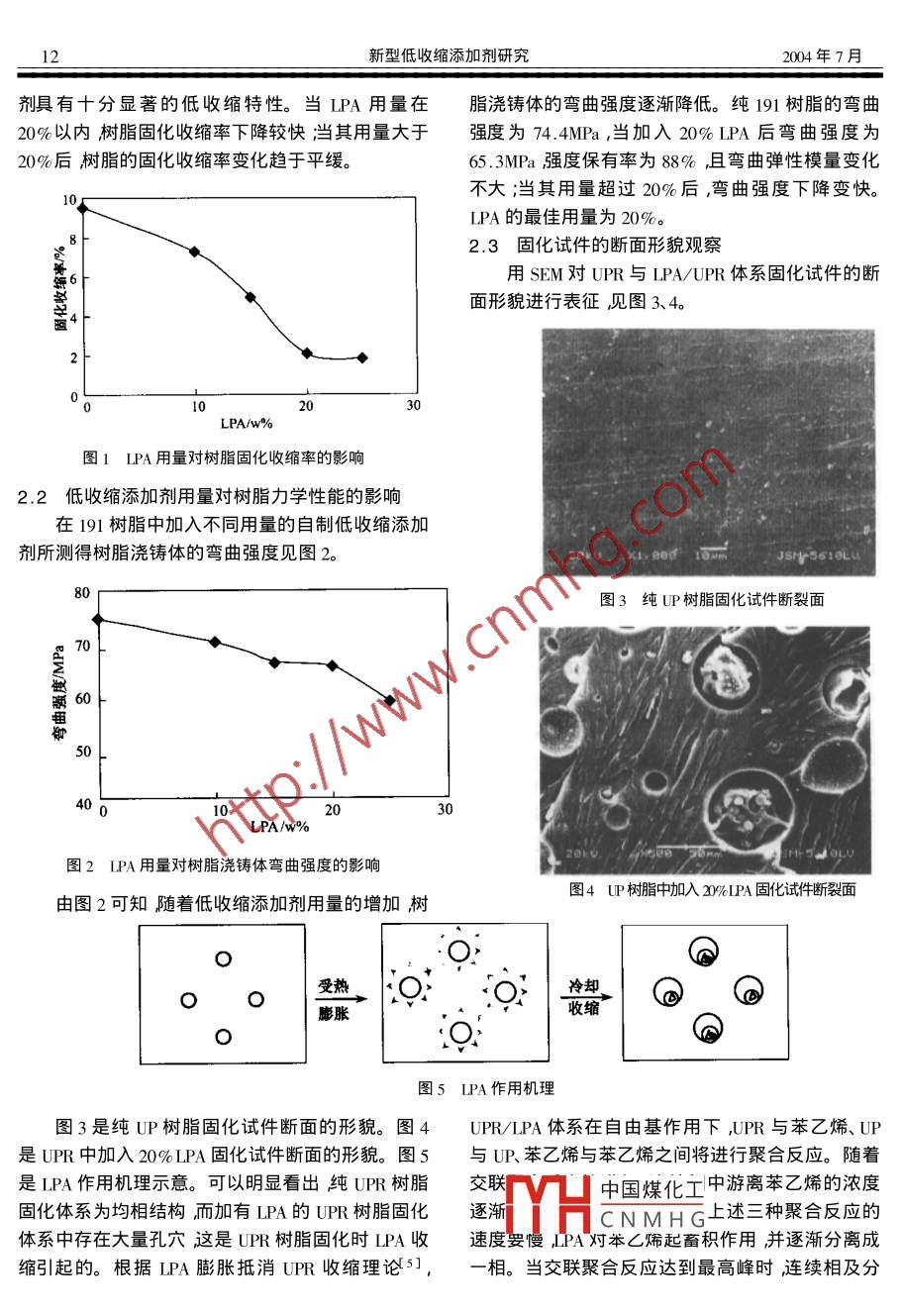 2004年第4期玻璃鋼/復(fù)合材料1新型低收縮添加劑研究段華軍,王鈞,楊小利(武漢理工大學(xué),武漢430070)摘要:本文研究了 自制低收縮添加劑用量對(duì)不飽和聚酯樹(shù)脂固化收縮率與力學(xué)性能的影響。結(jié)果表明在不飽和聚酯樹(shù)脂中加入20%的該類(lèi)低收縮添加劑樹(shù)脂的固化收縮率為2.1% ,彎曲強(qiáng)度保有率為88% ,彎 由模量沒(méi)有明顯變化;并利用SEM對(duì)加有低收縮添加劑的樹(shù)脂固化試件的斷面形貌進(jìn)行了表證分析了低收縮添加劑的作用機(jī)理。關(guān)鍵詞:低收縮添加劑;固化收縮率;不飽和聚酯樹(shù)脂;機(jī)理中圖分類(lèi)號(hào): TQ327.1文獻(xiàn)標(biāo)識(shí)碼: A文章編號(hào): 1003 - 0999 ( 2004) 04-0011-03不飽和聚酯樹(shù)脂( UPR )由于工藝性能良好適機(jī)理。合于多種成型工藝如手糊、模壓、拉擠和注射等,但1實(shí)驗(yàn)部分在.上述成型過(guò)程中存在一個(gè)共同缺陷-制品的固化1.1 原材料及LPA配制收縮率大。眾所周知,UPR體積收縮率一般為 6~191不飽和聚酯樹(shù)脂、苯乙烯、過(guò)氧化甲乙酮、10%。在UPR中加入適量的低收縮添加劑或低輪環(huán)烷酸鈷及熱塑性聚合物WD等均為工業(yè)品原料。廓添加劑(LPA)可顯著降低制品的收縮率。因而,WD為無(wú)色透明的顆粒狀聚合物溶于苯乙烯。為對(duì)低收縮率添加劑的制備及機(jī)理研究引起了人們廣了增加WD在樹(shù)脂中的相容性先將WD與本乙烯泛的關(guān)注1~3]。配成-定濃度的溶液配制過(guò)程需要邊加熱邊攪拌,LPA的研究和發(fā)展經(jīng)歷了以下幾個(gè)階段:①非加熱溫度為50~ 60C ,時(shí)間約0.5~ 1h?;靹蚝蟮臉O性低收縮添加劑,以聚苯乙烯( PS )為代表此類(lèi)低低收縮添加劑為無(wú)色透明的粘稠液體。收縮添加劑與樹(shù)脂的相容性差在樹(shù)脂固化前與樹(shù)1.2測(cè)試脂為兩相體系較簡(jiǎn)單的利用熱塑性塑料的受熱膨先將樹(shù)脂與-定量低收縮添加劑混勻然后加脹性來(lái)抑制樹(shù)脂的固化收縮;②非極性低收縮添加入固化劑并攪勻。在經(jīng)過(guò)標(biāo)定的定量容器中加入計(jì)劑與極性低收縮添加劑之間的過(guò)渡類(lèi)型。以聚甲基量的樹(shù)脂膠液測(cè)得樹(shù)脂膠液固化前的體積V,,用丙烯酸甲酯(PMMA)為代表此類(lèi)低收縮添加劑由排水法測(cè)得膠液固化后的體積V2則該樹(shù)脂體系的于其極性增加在樹(shù)酯中的穩(wěn)定性有所提高固化時(shí)固化體積收縮率為( V1- V2 )/V; x 100%樹(shù)脂澆鑄體與樹(shù)脂的分相結(jié)構(gòu)得以改善玻璃鋼制品的收縮率的彎曲強(qiáng)度及彎曲彈性模量的測(cè)試按GB2570-81.得到控制③極性低收縮添加劑。以聚醋酸乙烯酯進(jìn)行。設(shè)備為深圳瑞格爾儀器有限公司的RGT-30(PVAcf4]為代表此類(lèi)低收縮添加劑與樹(shù)脂相容性型微機(jī)控制電子萬(wàn)能材料試驗(yàn)機(jī)。樹(shù)脂澆鑄體試件好樹(shù)脂固化前與LPA為一相體系,固化后均勻分的彎曲強(qiáng)度測(cè)試完畢后,用掃描電鏡觀察其斷裂面相具有十分優(yōu)良的低收縮效果能使玻璃鋼制品的形貌。設(shè)備為日本電子株式會(huì)社的JSM-5610LV型.收縮率達(dá)到0.05%以下或達(dá)到零收縮缺點(diǎn)是制品掃描電子顯微鏡。的機(jī)械強(qiáng)度差;④組合型LPA。此類(lèi)低收縮添加劑2結(jié)果與 討論的代表有嵌段型的醋酸-苯乙烯聚合物、接枝型的2.1 低收縮添加劑用量對(duì)樹(shù)脂固化收縮率的影響芯殼聚合物等,它們?cè)趦?nèi)著色、低收縮、力學(xué)強(qiáng)度等在191樹(shù)脂中加入不同用量的自制低收縮添加方面具有良好的綜合性能。本文自制的低收縮添加劑所測(cè)得的固化收縮率變化見(jiàn)圖1。劑屬于組合型LPA。本文主要研究了自制低收縮添從圖1可以明顯看出隨著低收縮添加劑用量加劑用量對(duì)UPR固化收縮率與力學(xué)性能的影響并的增加樹(shù)脂的固化收縮率呈下降趨勢(shì)。純191樹(shù)利用SEM對(duì)加有低收縮添加劑的樹(shù)脂固化試件的脂的中國(guó)煤化工加入20%LPA后其固.斷面形貌進(jìn)行了表征分析了低收縮添加劑的作用化收YHCNMHGg可見(jiàn),低收縮添加收稿日期: 2004-01-17作者簡(jiǎn)介:段華軍(1974- ),男,講師,碩士。.FRP/CM 2004.No.412新型低收縮添加劑研究2004年7月劑具有十分顯著的低收縮特性。當(dāng)LPA用量在脂澆鑄體的彎曲強(qiáng)度逐漸降低。純191樹(shù)脂的彎曲20%以?xún)?nèi)樹(shù)脂固化收縮率下降較快;當(dāng)其用量大于強(qiáng)度為74.4MPa ,當(dāng)加入20%LPA后彎曲強(qiáng)度為20%后樹(shù)脂的固化收縮率變化趨于平緩。65.3MPa強(qiáng)度保有率為88% ,且 彎曲彈性模量變化不大;當(dāng)其用量超過(guò)20%后,彎曲強(qiáng)度下降變快。105LPA的最佳用量為20%。2.3固化試件的斷面形 貌觀察號(hào)用SEM對(duì)UPR與LPA/UPR體系固化試件的斷面形貌進(jìn)行表征,見(jiàn)圖3、4。02030LPA/W%圖1 LPA用量對(duì)樹(shù)脂固化收縮率的影響2.2低收縮 添加劑用量對(duì)樹(shù)脂力學(xué)性能的影響在191樹(shù)脂中加入不同用量的自制低收縮添加.劑所測(cè)得樹(shù)脂澆鑄體的彎曲強(qiáng)度見(jiàn)圖2。20ku X1:909 10Mm 2 JSMr5618Lu80「圖3純UP樹(shù)脂固化試件斷裂面0t50 t◆.40010LPA/w%20kUmphtee F 百mEM5d OL圖2LPA用量對(duì)樹(shù)脂澆鑄體彎曲強(qiáng)度的影響圖4 UP樹(shù)脂中