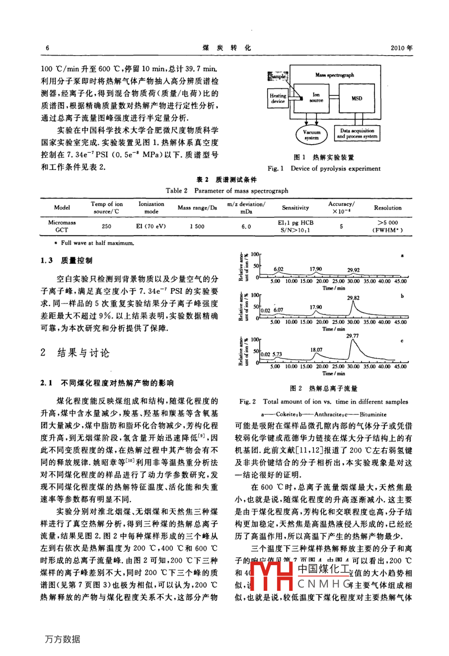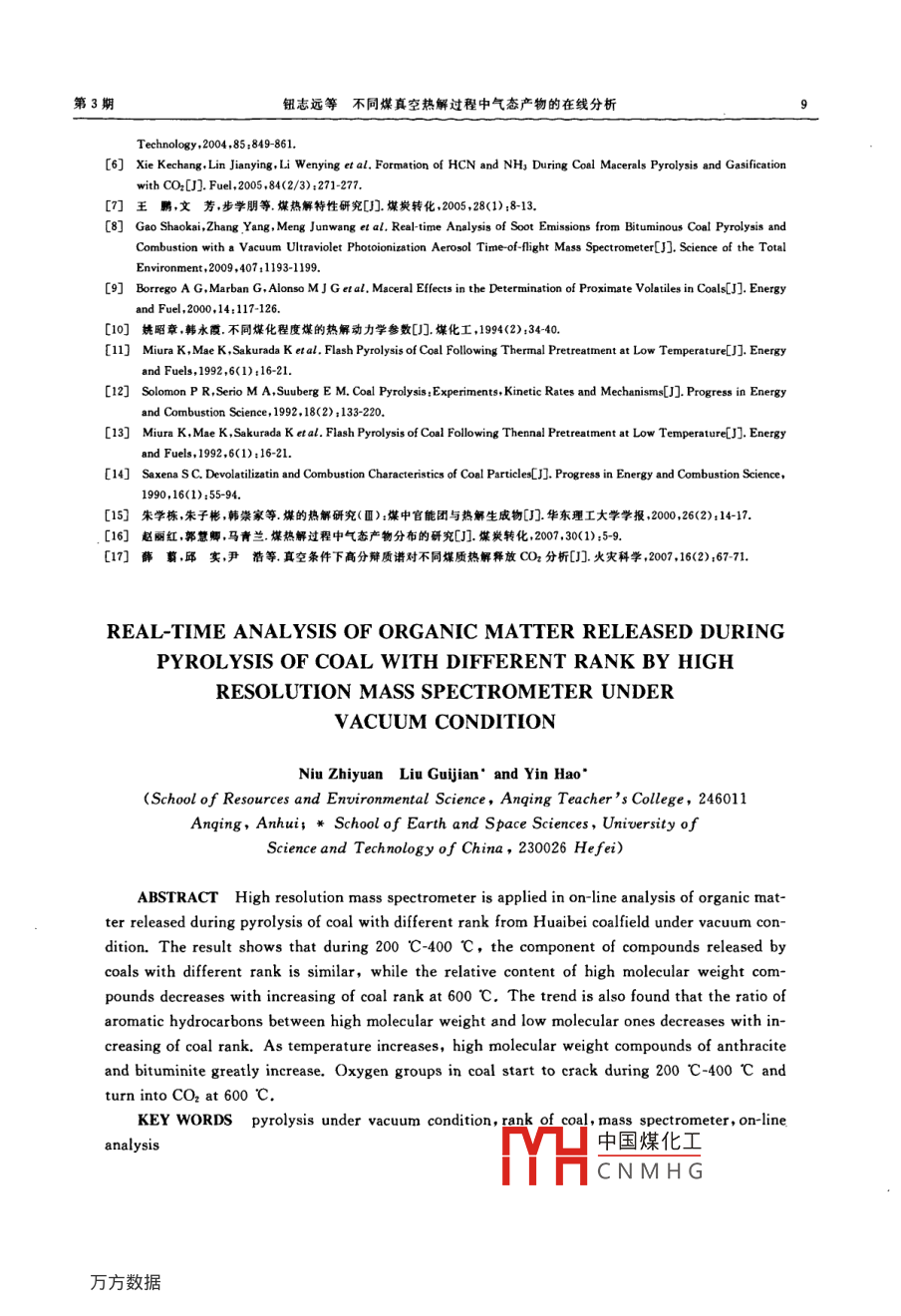 第33卷第3期煤炭轉(zhuǎn)化Vol 33 No. 32010年7月COAL CONVERSIONJul.2010不同煤真空熱解過(guò)程中氣態(tài)產(chǎn)物的在線分析鈕志遠(yuǎn)》劉桂建2尹浩3摘要利用高分辨質(zhì)譜對(duì)在真空熱解過(guò)程中淮北煙煤、無(wú)煙煤和天然焦形成產(chǎn)物進(jìn)行實(shí)時(shí)在線檢測(cè),結(jié)合煤質(zhì)結(jié)構(gòu)和特征,通過(guò)圖譜分析了煤種和熱解溫度對(duì)熱解產(chǎn)物的釋放規(guī)律.結(jié)果表明,較低熱解溫度時(shí),熱解產(chǎn)物組成隨煤化程度變化較小;較高溫度時(shí),隨煤化程度的升高,高分子量產(chǎn)物相對(duì)含量逐漸減少;隨著溫度的升高,煙煤和無(wú)煙煤高分子量產(chǎn)物所占比例明顯增加;含氧基團(tuán)在200℃~400℃開(kāi)始釋放,到600℃則主要生成CO2關(guān)鍵詞真空熱解,煤種,質(zhì)譜,在線分析中圖分類號(hào)TQ533譜檢測(cè)器,在線檢測(cè)離子化結(jié)果,反映了煤熱解產(chǎn)物0引言的即時(shí)信息,補(bǔ)充和完善了對(duì)熱解過(guò)程中連續(xù)、動(dòng)態(tài)測(cè)定熱解產(chǎn)物的理論與技術(shù)煤的熱解作用是煤利用過(guò)程中的一個(gè)重要工藝技術(shù),在煤熱解和媒轉(zhuǎn)化過(guò)程一系列成果研究中,不1實(shí)驗(yàn)部分僅對(duì)煤的熱加工工藝有直接的指導(dǎo)作用,能夠更有效地利用煤炭資源,而且對(duì)深入了解煤的結(jié)構(gòu)組成能夠提供可靠的理論依據(jù)在煤熱解的條件上,真空1.1樣品環(huán)境可以使熱解產(chǎn)生的氣體快速析出,提高熱解效實(shí)驗(yàn)樣品采自淮北煤田掘進(jìn)工作面,采用刻槽率;而且相對(duì)惰性氣體氣氛分子密度小,碰撞機(jī)會(huì)取樣法,現(xiàn)場(chǎng)密封.選取天然焦、無(wú)煙煤和煙煤三個(gè)少,避免二次反應(yīng),更接近理想狀況.有研究表明,樣品,每個(gè)重約2kg,四分法取適量樣品作磨碎處200℃下真空熱解低變質(zhì)煤的脫水效果明顯好于非理,過(guò)60目篩,四分法篩取后,裝人潔凈樣品瓶中待真空系統(tǒng).2也有實(shí)驗(yàn)發(fā)現(xiàn),真空條件下,200℃煤用表1為三種煤樣品的元素分析與工業(yè)分析液化程度(15.7%)明顯高于280℃非真空系統(tǒng)的液表1不同煤種煤的元素分析與工業(yè)分析(%”化程度(9.5%).3Roy等利用在真空條件下對(duì)不Table 1 Proximate and ultimate analysis同煤化程度的加拿大煤的熱解產(chǎn)物進(jìn)行了分析,但of different ranks of coals(%.)其主要對(duì)熱解氣熱值、焦和焦油產(chǎn)率及轉(zhuǎn)化率等指Proximate analysisUltimate analysis, d標(biāo)進(jìn)行的研究討論,未涉及分子層面的產(chǎn)物解析.目Bituminite1.2624.6414.5159.5781.34.640.920.48前在熱解產(chǎn)物的分子層面的研究多數(shù)是采用先收集 Anthracite2.3l1.7813.14727487.43.980.950.27熱解產(chǎn)物,然后再利用色譜或質(zhì)譜分析,這種先 Cokeit5.734.756.9482.5891.81.860.520.50捕集后檢測(cè)的方法可能會(huì)因?yàn)闄z測(cè)前組分間的反應(yīng),而無(wú)法得到熱解過(guò)程中熱解產(chǎn)物變化規(guī)律的真實(shí)信息因此有研究利用真空紫外光電離飛行時(shí)1.2實(shí)驗(yàn)過(guò)程及條件間質(zhì)譜( VUV-TOF)在線檢測(cè)了煙煤熱解煙塵中的分別取約1.00mg煤樣放入石英進(jìn)樣器中,在組分,取得了較好的效果.本實(shí)驗(yàn)室在高真空條件下計(jì)算機(jī)控制下按以下升溫程序?qū)悠愤M(jìn)行熱解:對(duì)不同淮北煤樣品進(jìn)行了不同溫度階段的熱解實(shí)30℃保持4min抽真空,100℃/min升至200℃驗(yàn),利用分子泵即時(shí)將熱解氣體產(chǎn)物抽入高分辨質(zhì)停中國(guó)煤化工0℃,停留國(guó)家自然科學(xué)基金資助項(xiàng)目(40873070)和安徽省優(yōu)秀青年基金資助項(xiàng)目CNMHG1)講師安慶師范學(xué)院資源與環(huán)境學(xué)院,246011安徽安慶;2)教授博土生導(dǎo)卿5中國(guó)科字不大手地球與空間學(xué)院,230026合肥收稿日期:201003-10修回日期:20100424煤炭轉(zhuǎn)化2010年100℃/min升至600℃,停留10min,總計(jì)39.7min利用分子泵即時(shí)將熱解氣體產(chǎn)物抽入高分辨質(zhì)譜檢測(cè)器,經(jīng)離子化,得到混合物質(zhì)荷(質(zhì)量/電荷)比的質(zhì)譜圖,根據(jù)精確質(zhì)量數(shù)對(duì)熱解產(chǎn)物進(jìn)行定性分析,通過(guò)總離子流量圖峰強(qiáng)度進(jìn)行半定量分析實(shí)驗(yàn)在中國(guó)科學(xué)技術(shù)大學(xué)合肥微尺度物質(zhì)科學(xué)systemproceas syste國(guó)家實(shí)驗(yàn)室完成.實(shí)驗(yàn)裝置見(jiàn)圖1.熱解體系真空度控制在7.34ePSI(0.5e-MPa)以下.質(zhì)譜型號(hào)圖1熱解實(shí)驗(yàn)裝置和工作條件見(jiàn)表2.Fig 1 Device of pyrolysis experiment表2質(zhì)譜測(cè)試條件Table 2 Parameter of mass spectrographModelMass range/Da1/z deviation/SensitivityAccuracy/Micromass250El(70 ev)1500El:l pg HCB>5000FwHM·)Full wave at half maximum.1.3質(zhì)量控制空白實(shí)驗(yàn)只檢測(cè)到背景物質(zhì)以及少量空氣的分50010001500200025.003000350040004500子離子峰,滿足真空度小于7.34e-PsI的實(shí)驗(yàn)要求同一樣品的5次重復(fù)實(shí)驗(yàn)結(jié)果分子離子峰強(qiáng)度差距最大不超過(guò)9%.以上結(jié)果表明,實(shí)驗(yàn)數(shù)據(jù)精確500100015002000250030003500可靠,為本次研究和分析提供了保障Time/min2結(jié)果與討論2.1不同煤化程度對(duì)熱解產(chǎn)物的影響圖2熱解總離子流量煤