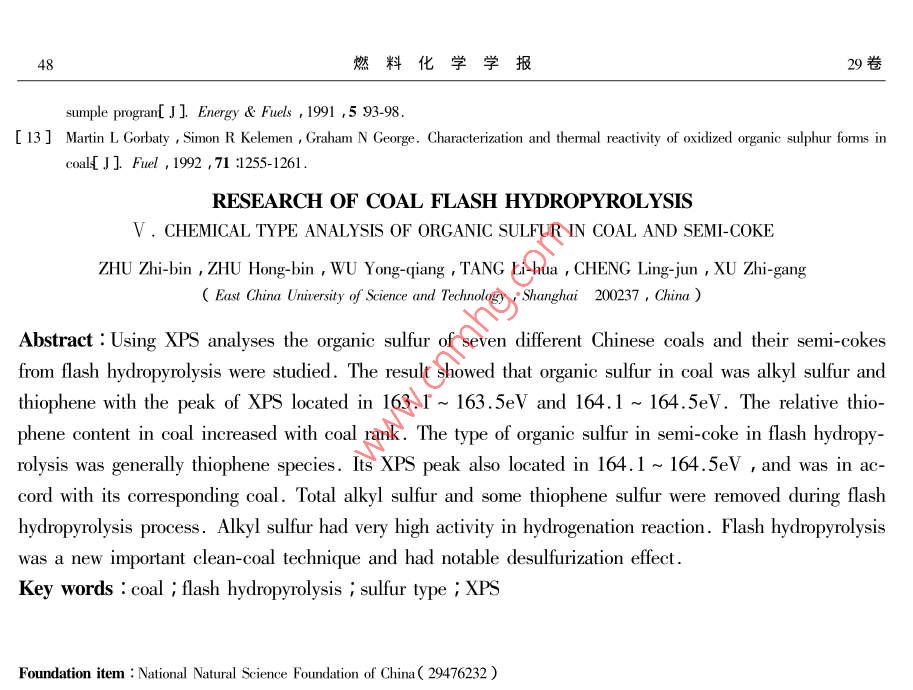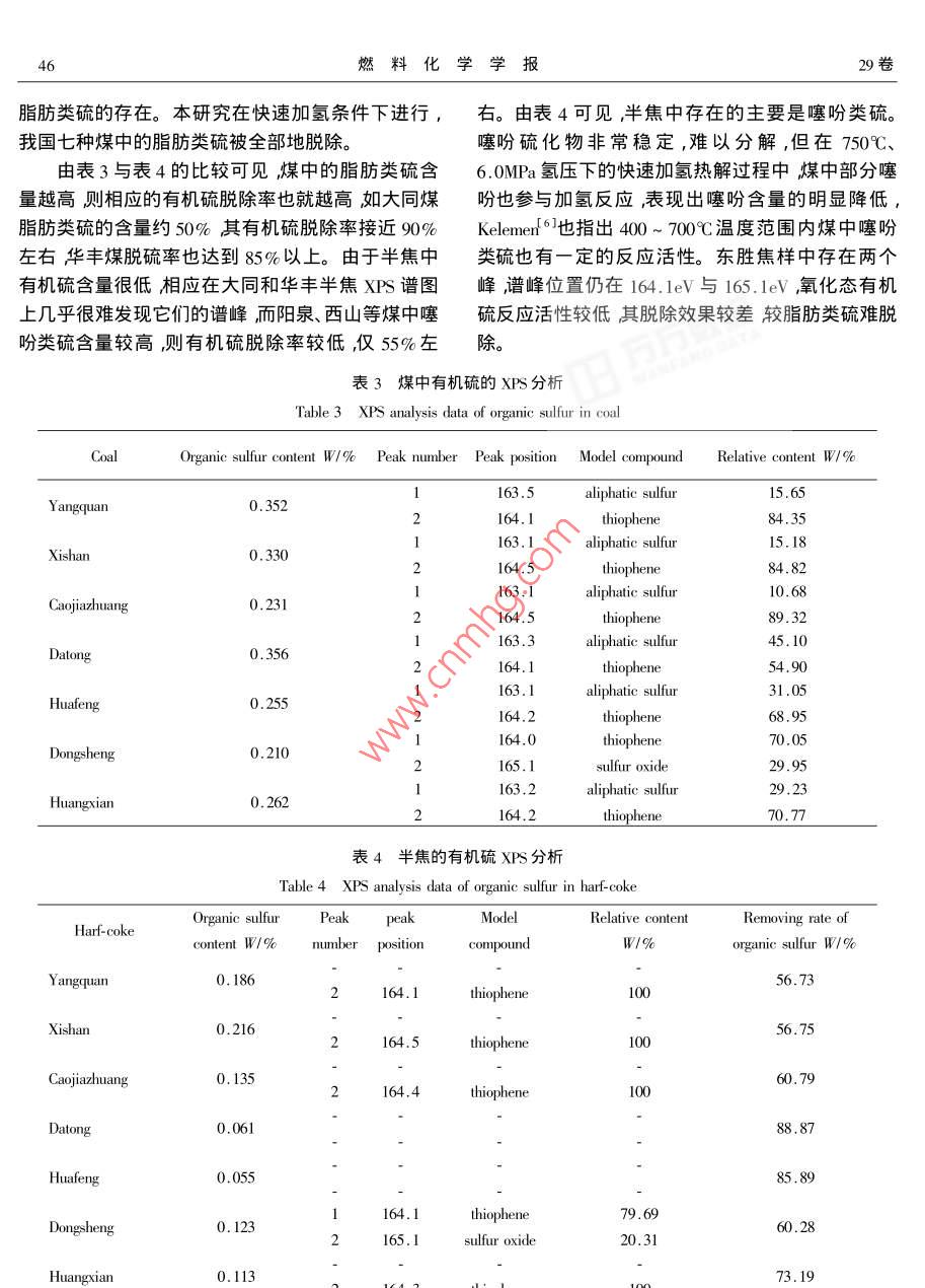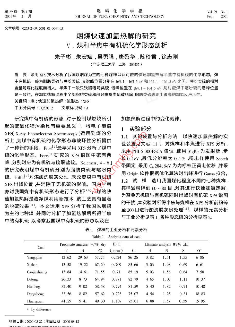 第29卷第1期燃料化學(xué)學(xué)報(bào)Vol, 29 No I201年2月JOURNAL OF FUEL CHEMISTRY AND TECHNOLOGYFeb. 2001文章編號(hào):0253-240X2001)1004405煙煤快速加氬熱解的研究Ⅴ.煤和半焦中有機(jī)硫化學(xué)形態(tài)剖析朱子彬,朱宏斌,吳勇強(qiáng),唐黎華,陳玲君,徐志剛(華東理工大學(xué),上海200237)摘要∶采用ⅹ技術(shù)分析了我國(guó)以煙煤為主的七種煤樣以及對(duì)應(yīng)的快速加氬熱解半焦中有機(jī)硫的化學(xué)形態(tài)。煤中有機(jī)硫一般為脂肪類硫與噻吩類硫其譜峰位置分別在163.1-163.5V和164.~-164.5V之間。噻吩類硫的相對(duì)含量隨煤化程度而増大。半焦中一般只殘留噻吩類硫溍峰位置在164.1-164.5-與對(duì)應(yīng)煤中噻吩硫的譜峰位置是一致的。在加氫熱解過(guò)程中全部脂眆類硫和部分噻吩類硫被脫除脂眆類硫表現(xiàn)岀很髙旳加氫反應(yīng)活性關(guān)鍵詞:煤;快速加氫熱解;硫形態(tài);ⅹ中圖分類號(hào):TQ530.2文獻(xiàn)標(biāo)識(shí)碼:A研究煤中有機(jī)硫的形態(tài)對(duì)于控制煤燃燒所引加氬熱解過(guò)程中的變化規(guī)律。起的硫氧化物污染具有重要意文。將電子能譜XPs X-ray Photoelectron Spectros運(yùn)用到煤的分1實(shí)驗(yàn)部分1.1實(shí)驗(yàn)裝置與分析方法煤快速加氫熱解的實(shí)析上為煤中有機(jī)硫的化學(xué)形態(tài)非破壞性分析提供驗(yàn)裝置見(jiàn)文獻(xiàn)11對(duì)煤樣和半焦進(jìn)行XFS分析了一種新的手段。Fm「2最早采用XPS分析了煤中采用PH5300FSCA譜儀使用MgKa為發(fā)射源,步硫的化學(xué)形態(tài)。Pem31研究的X譜圖中硫有兩長(zhǎng)O.leV,最低分辨率為0.1%粉末樣使用 Scotch峰分別對(duì)應(yīng)為有機(jī)硫與硫酸鹽硫。 Kelemen[4-6]帶固定采用C,284.6eV為內(nèi)標(biāo)校正荷電位移并采的研究表明煤中有機(jī)硫分別為脂肪類硫與噻吩類硫。Hit!φ對(duì)煤酸洗脫灰處理未改變煤中有杋硫用orin軟件根據(jù)優(yōu)化算法對(duì)岀峰進(jìn)行Gaus擬合。ⅹS出峰位置,并消除了無(wú)機(jī)硫的影響。國(guó)內(nèi)學(xué)者1.2試樣選用我國(guó)煤化程度不同的七種煤樣亦對(duì)我國(guó)煤中有機(jī)硫形態(tài)進(jìn)行了分柝3。煤的快其樣品粉碎到60~80目對(duì)其進(jìn)行快速加氫熱解。速加氫熱解是潔凈煤利用新技術(shù),該工藝具有顯著為避免無(wú)機(jī)硫與有機(jī)硫同時(shí)岀峰對(duì)有機(jī)硫ⅹS譜圖的脫硫效果"。本文運(yùn)用ⅹPS分析了我國(guó)以煙煤的干擾本實(shí)驗(yàn)對(duì)所得半焦與煤樣在ⅫS分析前粉碎為主的七種煤并同時(shí)分析了加氫熱解后所得半焦至200目進(jìn)行酸洗脫灰份處理以。煤樣的元素分析中的有機(jī)硫以考察我國(guó)煤中有機(jī)硫的形態(tài)以及在與工業(yè)分析見(jiàn)表1各種形態(tài)硫的分析見(jiàn)表2。表1煤樣的工業(yè)分析和元素分析Table 1 analysis data of coalProximate analysis W/% dry H/CUltimate analysis w/% dafatom) CHS12.6229.6357.750.52486.263.821.511.556.8613.5819.2214.6171.550.7185.195.031.560.647.588.7364.940.77182,794.651.081.1110.3732.409.0258.580.79481.595.401.820.7110.4833.568.8257.620.72375.074.541.250.3118.8huangxian41.299.4149.301.10775.016.881570.591595關(guān) by difference收稿日期:20005-22;修回日期:20008-121期朱子彬等:煙煤快速加氫熱解的研究Ⅴ45表2煤樣中的各種形態(tài)硫分析Table 2 Analysis of sulfur type in coalInorganic sulfuOrganic sulfurTotal sulfurCoalsulphate sulfur pyrite sulfur relative content organic sulfur relative contentW/%W/%2.4567.773.5232.2310.920.631.6240.543.301.182.0258.182.3164.933.5635.0710.151.702.2060,472.5539.530.160.542.102,800.1749.442實(shí)驗(yàn)結(jié)果與討論般噻吩類硫的含量較高脂肪類硫含量較低我國(guó)2.1煤中的有機(jī)硫化學(xué)形態(tài)表3為煤中有機(jī)硫煤的分析與 george!的實(shí)驗(yàn)結(jié)果相吻合。例如西含量與XPS譜圖數(shù)據(jù)。煤樣的ⅹ譜圖如圖1所山、曹家莊與陽(yáng)泉煤的噻吩類硫都在85%左右,東示。由圖1和表3可見(jiàn)煤中有機(jī)硫一般存在兩個(gè)勝、黃縣、華豐和大同等煤中的噻吩硫在70%或峰其峰位置均分別在163.1~163.5eV和164.1~70%以下。東勝煤的兩個(gè)出峰分別在164.0eV與164.5cV兩處。根據(jù)文獻(xiàn)←1B3可知前者對(duì)應(yīng)脂肪165.leV前者對(duì)應(yīng)于噻吩類硫,后者應(yīng)為氧化態(tài)的類硫脂肪類、硫醚和硫醇等)后者對(duì)應(yīng)噻吩類硫。有機(jī)硫。煤中有杋硫形態(tài)與煤化程度有關(guān)煤化程度高的煤370105062163164165166160706016264166168Binding energy E/evBinding energy E/eVBinding cncrgy E/cVtshan coaCaojiazhuang coal8016640160162164166rgy ElevBinding encrgy E/cVBinding cnergy F/eVBinding energy evHuangxian coal圖1煤中有機(jī)硫的XFS譜圖Figure 1 XPs of organic sulfur in coal2.2半焦中有機(jī)硫化學(xué)形態(tài)表4為加氫熱解半硫與煤樣中噻吩類硫?qū)绶逦恢檬且恢碌?。這說(shuō)明焦中有機(jī)硫含量和ⅹⅣS譜圖數(shù)據(jù),圖2為半焦的加氫熱解過(guò)程中脂肪類硫具有較高的反應(yīng)活性易XⅣSs譜圖。由圖、表可見(jiàn)半焦中有機(jī)硫一般只岀現(xiàn)被脫除而噻吩類硫相對(duì)穩(wěn)定,噻吩仍殘留在半焦燃料化學(xué)學(xué)報(bào)卷脂肪類硫的存在。本研究在快速加氬條件下進(jìn)行,右。由表4可見(jiàn),半焦中存在的主要是噻吩類硫。我國(guó)七種煤中的脂肪類硫被全部地脫除噻吩硫化物非常穩(wěn)定,難