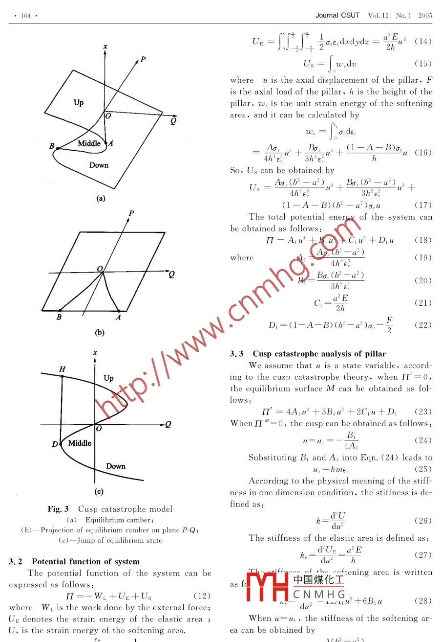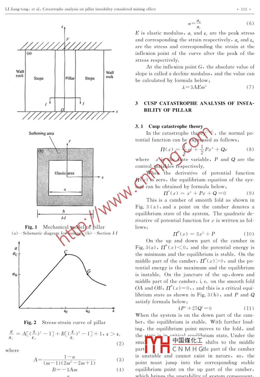 Vol.12 No. 1J. CENT. SOUTH UNIV. TECHNOL.Feb.2005Article ID: 1005 - 9784(2005)01 - 0102 - 05Catastrophe analysis on pillar instability considered mining effectLI Jiang -teng(李江騰), CAO Ping(曹平)(School of Resources and Safety Engineering,Central South University, Changsha 410083,China)Abstract: The instability of the pillar was discussed based on the potential energy principle and the cusp catastro-phe theory, and a simplified mechanical model of the pillar was established considering the mining effect. The neces-sary-sufficient conditions, the jump value of displacement of pillar and the released energy expressions were de-duced. The results show that the instability of the pillar is related to the properties of the rock, the external forceand the relative stiffness of the elastic area to the plastic area. The instability of system is like to occur with the en-larging of the softening area or the decreasing of E/A. The calculation done shows that the estimated results corre-spond to practical experience.Key words: pillar; potential energy; cusp catastrophe; plastic area; relative stiffness; stabilityCLC number: TD324. 1Document code: A1 INTRODUCTIONceed the yield stress due to mining effect, such asthe shock,the impact load and the repeat load,At present, underground mining is the mainwhich make the state of rock changes from elasticapproach for the exploitation of mineral resources.state to plastic state. But, in the middle of the pil-The geologic condition will deteriorate with the ex-lar, the state of rock is still elastic state, and thesetending of the mining depth, which affects therocks in elastic state form elastic area3l. The sof-safety of the mine and the mining layout of oretening area is enlarged abruptly when the elasticbody. Those pillars support the stope, and theirstrain energy stored in elastic area is released, andstability is the most importants. At present, ththe instability of the pillar occurs consequently.analysis of the instability of pillar is developingFor simplifying, a foursquare pillar is only takenfrom the simple strength theory to the instabilityinto account in this work,and the softening areaof the mechanics equilibrium system. However, assize in pillar periphery is constant along height.material properties of rock mass and instabilityThe simplified mechanical model is shown inprocess are quite complicated, it is difficult to sim-Fig. 1.ulate mathematically the occurrence and develop-ment dynamic process by using a uniform model,2.2 Constitutive relationand it is also impossible to arrive at a uniform con-A lot of experiment results show that the me-clusion2. As the ratio of highness to width ischanics properties of rock vary with the deforma-big,and the stability of pillars declines distinctly.tion increasingl4. At the beginning of the load,A tiny disturbance in horizontal direction will re-these initial tiny cracks in the rock close under thesult in the instability of system under certain con-compressive stress, and the rock is in the elasticditions. The catastrophe theory is just a powerfulstage with the increasing of the load, and when thetool for the analysis of the instability phenomena.stress exceeds the elastic limit, these tiny cracks inIn this paper, on the basis of the potential en-rock is propagated quickly until the stress in rockergy principle and the cusp catastrophe theory thereaches the peak stress. Then the mechanics prop-instability of pillars concerning mining effect, a cusperties of rock are changed evidently, and the abilitycatastrophe model of instability of pillars is estab-of resisting deformation is declined with the in-lished. The quantifying of the instability of the systemcreasing of the deformation, that is to say,theis discussed elementarily by an example.strain softening is brought consequently. The2 MECHANICAL MODEL AND CONSTITUTIVEstress- strain curve is shown in Fig. 2.RELATIONAccording to Refs. [5,6], the constitutive re-latifollows:2.1 Mechanical modelelas中國(guó)煤化工There is a softening area(i. e. plastic area) in:TYHC NMH Gee(1)the pillar periphery where the stresses of rock ex-softening stage:①Foundation item: Projeet( 50274074) supported by the National Natural Science Foundation of ChinaReceived date:, 2004 - 02 - 10; Accepted date: 2004 - 10- 09Correspotsponde格.指Jiang teng, Associate professor, PhD ceandidate; Tel: + 86-731 8879612; E mail: ljt@ 21cn. com .LI Jiang -teng. et al: Catastrophe analysis on pillar instability considered mining effectn= Os(6)σ。E is elastic modulus, σc and Ec are the peak stress .Fand corresponding the strain respectively, σg andεgare the stress and corresponding the strain at the(a)inflexion point of the curve after the peak of thestress respectively.At the inflexion point G, the absolute value ofWallslope is called a decline modulus, and the value canrockStopePillarbe calculated by formula below:λ= 3AEm2(7)3 CUSP CATASTROPHE ANALYSIS OF INSTA-BILITY OF PILLAR .3.1 Cusp catastrophe theorySoftening areaIn the catastrophe theory[7.8], the normal potential function can be expressed as follows:IT(x) =二x+Px2+ Qx .(8)where x is the state variable, P and Q are thecontrol variables respectively.ElasticareaWhen the derivative of potential functionI(x) is zero,the equilibrium equation of the sys-tem can be obtained by formula below :IT'(x) =x°+Px +Q =0(9)This is a camber of smooth fold as shown inFig. 3 (a), and a point on the camber denotes abequilibrium state of the system. The quadratic de-1-rivative of potential function for x is written as fol-Fig. 1.Mechanical model of pillarlows:(a) - Schematic diagram for mining; (b)- Section I III"(x) = 3x2+ P(10)On the up and down part of the camber inσ|Fig. 3(a),nI” (x)<0,and the potential energy isσc tthe minimum and the equilibrium is stable. On themiddle part of the camber, I (x)>0,and the po-tential energy is the maximum and the equilibrium\GσG tis instable. On the juncture of the up, down andmiddle part of the