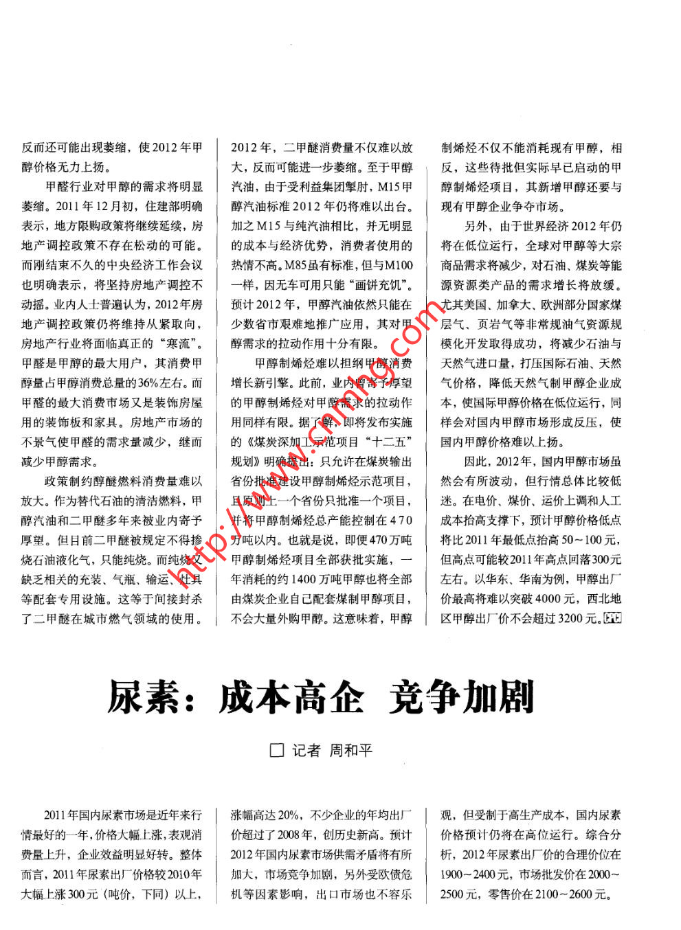 HHI行業(yè)聚焦內市場有望形成一輪連續(xù)升溫行.上減下增短期市場波動胺、苯乙烯、硝基氯苯、苯酚等生產青。由于2011年焦化行業(yè)的疲軟,企業(yè)在2011年下半年的震蕩整理中,國內市場也因粗苯價格的堅挺焦化粗苯資源大幅下降,造成焦化許多產品進入虧損狀態(tài),風險得到了和純苯替代品產量的下降,保持穩(wěn)苯原料的減少,這也是2011年石油較好的釋放。加之運輸成本的不斷加中求進的市場走勢。如因焦化廠的苯產銷量大幅增長的主要原因之- -。大等因素,純苯短期內將會形成-一個限產嚴重,焦化苯、加氫苯產量明2012年,焦化粗苯仍會因為資源緊窄幅震蕩、修復底部、積蓄能量的過顯下降,對整體純苯市場的溫和回張而延續(xù)高位運行,成為純苯市場程,不會出現(xiàn)過大的調整現(xiàn)象。升創(chuàng)造了條件。另因2011年下半年的基礎支撐因素。但是下游增長的純苯的成本、替代品、下游產品純苯下游企業(yè)開工率出現(xiàn)了一輪明量能一旦釋放,可能會出現(xiàn)生產與以及國際國內宏觀環(huán)境等綜合影響顯下降現(xiàn)象,在2012年將陸續(xù)好需求的不銜接現(xiàn)象,造成市場的短因素,將是決定2012年純苯市場整轉,需求出現(xiàn)平穩(wěn)增長。但純苯產期炒作因素增強,特別是上半年的體走向的基礎,并且今后對下游整個量相比2011年不會再次大幅增長,恢復性整理階段,難以避免行情再產業(yè)鏈影響能力有望進-步加強。如預計增幅在10%左右。同時,因亞次震蕩的可能性。果上半年市場能夠整理到位,下半年洲貨源的減少,國家外貿政策的支但是,國內焦化苯、加氫苯和精在產銷量、需求量、出口量上仍會有持等利好因素的推動,出口量必然制苯新增產能因焦化企業(yè)限產有個一個穩(wěn)步增長過程,并且價格成交平再次平穩(wěn)增長,綜合實現(xiàn)2012年產恢復期,在2012年上半年不會有太臺也將同步提高。預計2012年,國銷量、需求量、出口量三方面的穩(wěn)大增長,短期內對以石油苯為代表性內純苯市場有望走出一輪先調后穩(wěn)中求進。的純苯市場影響有限。另外,下游苯再上揚的總體運行軌跡。C甲醇:內外交困難有起色口記者陳繼軍雖然2011年“金九”時節(jié),華甚至可能遭遇“十一五”以來最為嚴2012年仍有約800萬噸新增產能。屆東、華南地區(qū)甲醇出廠價上沖至重的“寒流”。時,全國甲醇產能將達5500萬噸,而4300元(噸價,下同),創(chuàng)2008年全預計2012年供大于求將打壓甲預測的甲醇需求量不足2500萬噸。同.球金融危機以來新高,但年初市場醇價格下行。雖然近幾年國內甲醇裝時,中東等地數(shù)套新建大型甲醇裝置供應寬裕,年底西安、成都等地液化置平均開工率未超過70%,但依然難也將于2012年建成投產。受歐債危氣爆炸事故又引起各地質檢部門加以遏制各地上馬甲醇項目的熱情。機、美國經濟復蘇緩饅以及中東地區(qū)大對二甲醚非法摻燒的查處打擊力2009年國家4萬億元投資計劃中,西甲醇需求量小等因素影響,這些新增度,致使甲醇需求量驟然萎縮,價格部地區(qū)新.上甲醇項目不在少數(shù)。這些甲醇主要銷售目標依然鎖定中國、印持續(xù)快速下跌,全年甲醇市場行情項目大多在2011年或2012年建成投度等新興經濟體國家,將進-步加劇比較低迷。但這并沒有為2012年拓產,將再度增加國內甲醇產能,加劇國內供大于求的矛盾。展.上漲空間,相反,綜合各種因素分供大于求矛盾,打壓甲醇價格下行。在供給量大幅增加的情況下,析,2012 年甲醇市場難有上佳表現(xiàn),目前,全國甲醇產能已達4700萬噸,國內甲醇需求量不僅難以有效放大,22 |中國石油和化I 2012 .02反而還可能出現(xiàn)萎縮,使2012年甲2012年,二甲醚消費量不僅難以放制烯烴不僅不能消耗現(xiàn)有甲醇,相醇價格無力上揚。大,反而可能進一步萎縮。 至于甲醇反,這些待批但實際早已啟動的甲甲醛行業(yè)對甲醇的需求將明顯汽油,由于受利益集團掣肘,M15甲醇制烯烴項目,其新增甲醇還要與萎縮。2011年12月初,住建部明確醇汽油標準2012年仍將難以出臺?,F(xiàn)有甲醇企業(yè)爭奪市場。表示,地方限購政策將繼續(xù)延續(xù),房加之M15與純汽油相比,并無明顯另外,由于世界經濟2012年仍地產調控政策不存在松動的可能。的成本與經濟優(yōu)勢,消費者使用的將在低位運行,全球對甲醇等大宗而剛結束不久的中央經濟工作會議熱情不高。M85雖有標準,但與M100商品需求將減少,對石油、煤炭等能也明確表示,將堅持房地產調控不一樣,因無車可用只能“畫餅充饑”。源資源類產品的需求增長將放緩。動搖。業(yè)內人士普遍認為, 2012年房預計2012年,甲醇汽油依然只能在尤其美國、加拿大、歐洲部分國家煤地產調控政策仍將維持從緊取向,少數(shù)省市艱難地推廣應用,其對甲層氣、頁巖氣等非常規(guī)油氣資源規(guī)房地產行業(yè)將面臨真正的“寒流” 。醇需求的拉動作用十分有限。?;_發(fā)取得成功,將減少石油與甲醛是甲醇的最大用戶,其消費甲甲醇制烯烴難以擔綱甲醇消費天然氣進口量,打壓國際石油、天然醇量占甲醇消費總量的36%左右。而增長新引擎。此前,業(yè)內曾寄予厚望氣價格,降低天然氣制甲醇企業(yè)成甲醛的最大消費市場又是裝飾房屋的甲醇制烯烴對甲醇需求的拉動作本,使國際甲醇價格在低位運行,同用的裝飾板和家具。房地產市場的用