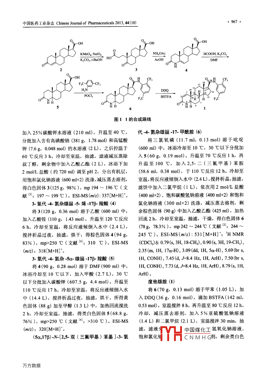 ●966●中國醫(yī)藥工業(yè)雜志Chinese Joumal of Pharmaceuticals 2013, 44(10)度他雄胺的合成孫潔,孔迪,鄒江,楊琰(華潤賽科藥業(yè)有限責(zé)任公司,北京100124)摘要:孕烯醇酮經(jīng)C-4,5位氧化開環(huán)、成環(huán)及還原氫化得到3氧代-4氮雜-5a-雄甾-17β-羧酸,再經(jīng)C-20位酰胺化得到(Sa,17B)-N-[2,5.雙(三氟甲基)苯基]-3-氧代4-氮雜雄甾-17-甲酰胺(6) ,最后進(jìn)行C-1,2位氧化脫氫制得度他雄胺,總收率為36%。關(guān)鍵詞:度他雄胺; 5a- 還原酶抑制劑;合成中圖分類號(hào): R977.1*2文獻(xiàn)標(biāo)志碼: A文章編號(hào): 1001-8255 (2013) 10-0966-03Synthesis of DutasterideSUN Jie, KONG Di, Z0U Jiang, YANG Yan(China Resources Saike Pharmaceutical Co, Ltd, Beijing 100124)ABSTRACT: Dutasteride, the 5a-reductase inhibitor, was synthesized from 4-androsten-3-one-5-ene-17B-carboxylic acid via oxidative ring-opening reaction, cyclization and reduction to give 3-0x0-4-aza-5a- androstane-17β-carboxylic acid, which was subjected to amidation and oxidation with an overall yield of 36%.Key Words: dutasteride; 5a-reductase inhibitor; synthesis度他雄胺(dutasteride, 1), 化學(xué)名為(5a,17β)-環(huán)、 A環(huán)環(huán)合、還原氫化及C-1,2位脫氫制成3-氧N-[2,5-雙(三氟甲基)苯基]-3-氧代-4-氮雜雄代-4-氨雜-5a-雄甾-1-烯-17β-羧酸,最后進(jìn)行甾-1-烯-17-甲酰胺,是英國GlaxoSmithKline公C-20位酰胺化反應(yīng)得1,總收率約31.2% 4。司研制的雙重5a-還原酶抑制劑,2003 年6月經(jīng)美本研究對(duì)方法②進(jìn)行了工藝改進(jìn)(圖1)。用2國FDA批準(zhǔn)上市,商品名Avodart,用于預(yù)防和治經(jīng)C-4,5位氧化開環(huán)、A環(huán)環(huán)合及還原氫化制得3-療良性前列腺增生"。氧代-4-氮雜-5a-雄甾-17β-羧酸(5)。5在甲醇、1的合成可以孕烯酮酸(2)為物料,以如下方乙酸乙酯、二氯甲烷等常規(guī)溶劑中溶解性較差,不法合成:①將2先制成酰氯,與2,5-二 (三氟甲利于進(jìn)行2,3-二氯-5,6-二氰基-1,4-苯醌(DDQ)/基)苯胺進(jìn)行酰胺化,而后經(jīng)C-4,5位氧化開環(huán)、N,O-雙(三甲基硅烷基)三氟乙酰胺(BSTFA)/甲.A環(huán)環(huán)合、還原氫化,最后經(jīng)過C-1,2位氧化脫氫苯條件下的脫氫反應(yīng),產(chǎn)品收率低于40%;但5具得到1,總收率為14.6% (2]。 該路線第-一步 反應(yīng)收有酸性基團(tuán),易溶于堿性試劑,本研究改用吡啶1率64%,產(chǎn)物需經(jīng)柱色譜分離;還原氫化用氧化鉑POCI3堿性體系進(jìn)行C-20位酰胺化反應(yīng),收率可作催化劑,收率僅54%;后有文獻(xiàn)(3]改用氰基硼達(dá)75%以上,產(chǎn)品純度大于98%。最后進(jìn)行DDQ氫化鈉,收率雖提高至92%,但氫化劑價(jià)格昂貴。脫氫氧化制得1。改造后的工藝原料與試劑均易得,②先進(jìn)行甾體母核A環(huán)的改造,經(jīng)C-4,5位氧化開操作簡單,生產(chǎn)成本較低,適于工業(yè)化生產(chǎn),總收率為36.3%。收稿日期: 2013-04-12實(shí)驗(yàn)部分作者簡介:孫潔(1984-), 男,碩士,從事藥物化學(xué)研究。Tel: 015822869702A-失碳.中國煤化工-羧二酸(3)E-mail: sunjic198457@163.com將2(120:MYHCNMHG醇(600ml),.中國醫(yī)藥工業(yè)雜志Chinese Jourmal of Pharmaceuticals 2013, 44(10)●967●D、C-O0H-OHKMnO, NalO,NH,OAcHCOOH, K.2CO,K,CO, 1BuOH HOAcOHDMFo34Q9導(dǎo)CF,9z號(hào) CF,F,CK )-cr;HNDDQPOCl,,BSTFAJ°AJR" F,C5o個(gè)含0個(gè)含圖1 1 的合成路線加入25%碳酸鉀水溶液(210ml),升溫至40 C,代 4氮雜雄甾-17-甲酰胺(6)分批加入含有高碘酸鈉(381 g,1.78 mol)和高錳酸將三氯氧磷(11.7 ml, 0.13 mol)溶于吡啶鉀(7.6g, 0.048 mol)的水溶液(2L),之后控溫于(600 ml)中,冰浴冷卻至10 C, 30 C以下分批加60 C反應(yīng)3h。冷卻至室溫,抽濾,濾液減壓蒸除入5(60g, 0.19 mol)。升溫至70 °C反應(yīng)1h,再叔丁醇,剩余物中加入乙酸乙酯(2L),冰浴下加升溫至100 C,加入2,5-二(三氟甲基)苯胺2 mol/L鹽酸(約720 m1)調(diào)至pH 2,分出有機(jī)層,(58.6 ml, 0.38 mol),于110 C反應(yīng)12 h。冷卻至用飽和氯化鈉溶液(600 mlx2)洗滌,減壓蒸去溶劑,室溫,將反應(yīng)液傾倒入水中(2.4 L) ,攪拌析晶,抽濾, .得白色固體3(125g, 98%), mp194~ 196C (文濾餅中加入二氯甲烷(1 L),依次用2 mol/L鹽酸獻(xiàn)[5]: 197~ 199 C )。ESI-MS (mlz): 337[M+H]*。(400 mlx2)、飽和碳酸氫鈉溶液(400 mlx2)和飽和3-氧代4-氮雜雄甾-5-烯-17β-羧酸(4)氯化鈉溶液(300 m1x2)洗滌,減壓蒸去溶劑,剩將3(120g,0.36 mol)溶于乙酸(600 ml)中,余棕色固體(90 g)中加入乙酸乙酯(425 ml),加熱加入乙酸銨(110g,1.43 mol),升溫至120 C反應(yīng)回流2h,冷卻至室溫,抽濾,干燥,得白色固體66h。冷卻至室溫,將反應(yīng)液傾倒入水中(2.4 L),(78g, 78.3%), mp242~ 244C (文獻(xiàn)2: 244~攪拌析晶過夜,抽濾,烘干,得棕色固體4(94 g,245 C )。ESI-MS (m/z): 531[M+H]*; 'H NMR83%),mp>250 C (文獻(xiàn)[6]: 310 C )。ESI-MS .(CDCl,) 8: 0.79(s, 3H, 18-CH), 0.90(s, 3H, 19-CH3),(m/z2): 318[M+H]*。2.35 (m, 1H, 17a-H), 3.09(dd, lH, 5a-H), 5.69(br s,3-氧代-4-氮雜-50x-雄甾-17β-羧酸(5)1H, CONH), 7.45(d, J=8.4 Hz, 1H, ArH), 7.50(br s,將4(90g,0.28 mol)溶于DMF (900 ml)中,1H, CONH), 7.73(d, J=8.4 Hz, lH, ArH), 8.79(s, 1H,冰浴冷卻至10 C以下,加入甲酸(2.7 L),30 CArH)。以下分批加入碳酸鉀(607.5 g, 4.4 mol)。升溫至度他雄胺(1)110 C反應(yīng)17 h。冷卻至室溫,將反應(yīng)液傾倒入水將6(70g, 0.13 mol)溶于甲苯(1.05 L),加中(14.4 L),攪拌析晶過夜,抽濾,烘干,所得黃入DDQ(36g, 0.16 mol),滴加BSTFA(142 ml,色固體(88 g)加至甲醇(1.3 L)中,加熱回流攪洗0.53 mol),室溫?cái)嚢?h,再升溫至80 C反應(yīng)12 h。2h,冷卻至室溫,抽濾,得類白色固體5(68.8