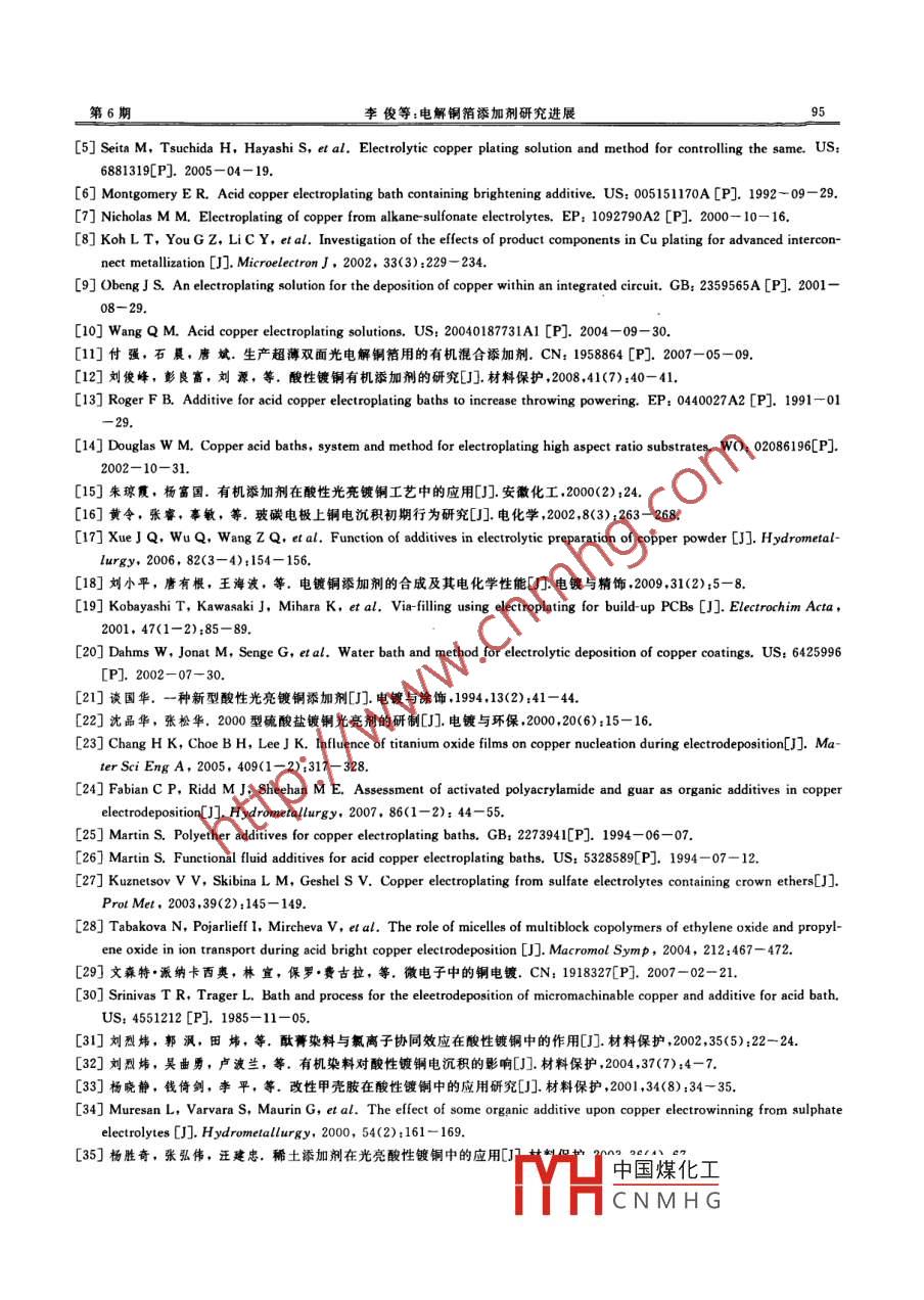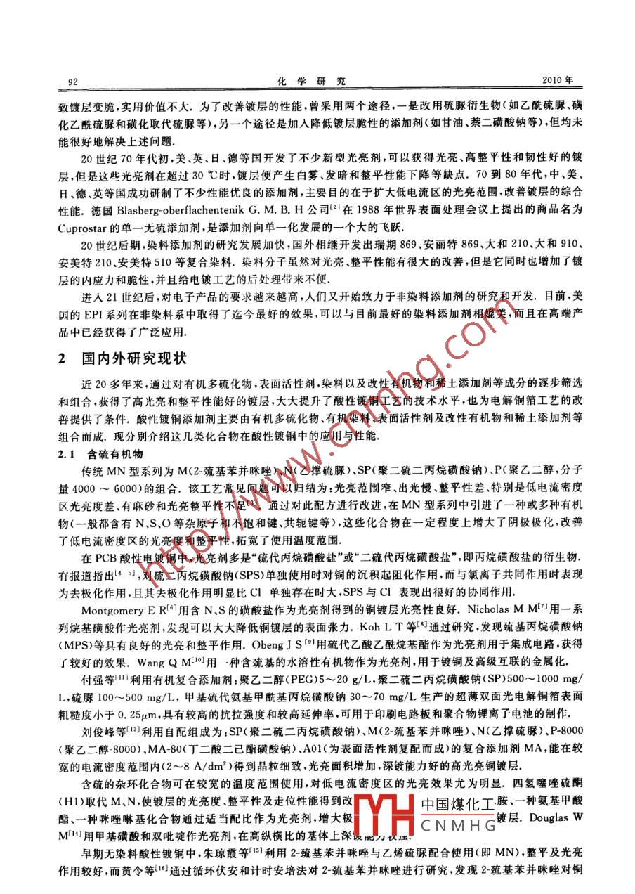 第21卷第6期化學(xué)研究中國科技核心期刊2010年11月CHEMICAL RESEARCHhxyj@ henu. edu. cn電解銅箔添加劑研究進(jìn)展李俊,張震"(華南理工大學(xué)化學(xué)與化工學(xué)院,廣東省高等學(xué)校新能源技術(shù)重點(diǎn)實(shí)驗(yàn)室,廣東廣州510640)摘要:介紹了 電解制箔添加劑的研究現(xiàn)狀和進(jìn)展;指出隨著信息產(chǎn)業(yè)的不斷發(fā)展,對(duì)電子產(chǎn)晶印刷電路板(PCB)制作的要求不斷提高,而對(duì)關(guān)鍵的電解銅箔技術(shù)所用的添加劑的要求也8益苛刻.同時(shí)就電解銅箔添加劑的發(fā)展趨勢(shì)進(jìn)行了展櫬,以期為今后國內(nèi)電解銅箔行業(yè)的發(fā)展提供參考.關(guān)鍵詞:電解銅箱;添加劑;研究進(jìn)展中圈分類號(hào):TQ 153文獻(xiàn)標(biāo)識(shí)碼:A文章編號(hào):1008 - 1011(2010)06-0091-05Research Progress of Additives for Electrolyzing Copper FoilLI Jun, ZHANG Zhen"(School of Chemistry and Chemical Engineering, Key Laboralory of New Energy Technology for GuangdongUniversities, South China University of Technology, Guangzhou 510640, Guangdong, China)Abstract:A review is given about the current status and research progress of additives for elec-trolyzing copper foil. It is pointed out that with continuous development of information indus-try, the requirements for printing circuit board (PCB) in electronics are becoming increasinglystrict, so are the requirements for the additives used for electrolyzing Cu foil--the key tech-nology of manufacturing PCB. At the same time, perspectives are suggested concerning the de-velopment trend of the additives for electrolyzing Cu foil, which, hopefully, is to contribute tothe advance of domestic Cu foil electrolysis industry.Keywords : electrolyzing copper foil; additive; research progress隨著印刷電路板(PCB)向高密度互連技術(shù)為主體的“密、薄、平"方向發(fā)展,電解銅箔的厚度也由35μm向18μm,12 μm以及9 pm以下的超薄化發(fā)展,18 pμm銅箔所占比例迅速提高,12 μm,9 μm銅箔的需求漸增,而這對(duì)電解銅箔添加劑也提出了更高的要求.本文介紹了電解銅箔添加劑的研究現(xiàn)狀,以期為今后國內(nèi)電解銅箔添加劑的發(fā)展提供參考.1發(fā)展歷程酸性鍍銅操作條件易于控制,廢水處理簡(jiǎn)單,如果選擇合適的添加劑就可以得到好的銅沉積層、電解銅箔采用的是硫酸鹽酸性鍍銅工藝,而其添加劑的研究則可以追溯到1940年,硫酸鹽鍍銅用于工業(yè)生產(chǎn)已有140多年.第一個(gè)電鍍銅的專利是于1840 年申請(qǐng)的1.國外在20世紀(jì)40年代首先提出用硫脲及其衍生物作為中國煤化工硫氰酸胺產(chǎn)物,導(dǎo)收稿日期:2010-08- 03.YHCNMHG基金項(xiàng)目:廣東省教自部產(chǎn)學(xué)研合作項(xiàng)(200909020006);廣東省科技計(jì)劃高新技術(shù)產(chǎn)業(yè)化項(xiàng)目02009010100009).作者簡(jiǎn)介:李俊(1985 - ),男,碩士生,研究方向:制的電沉積. .通訊聯(lián)系人. E-mail:chzzhang@ scut. edu, cn.92化學(xué)研究2010年致鍍層變脆,實(shí)用價(jià)值不大.為了改善鍍層的性能,曾采用兩個(gè)途徑,一是改用硫脲衍生物(如乙酰硫脲、磺.化乙酰硫脲和磺化取代硫脲等),另一個(gè)途徑是加人降低鍍層脆性的添加劑(如甘油、萘二磺酸鈉等),但均未能很好地解決上述問題.20世紀(jì)70年代初,美.英、日、德等國開發(fā)了不少新型光亮劑,可以獲得光亮、高整平性和韌性好的鍍層,但是這些光亮劑在超過30心時(shí).鍍層便產(chǎn)生白霧、發(fā)暗和整平性能下降等缺點(diǎn).70到80年代,中、美、日、德、英等國成功研制了不少性能優(yōu)良的添加劑,主要目的在于擴(kuò)大低電流區(qū)的光亮范圍,改善鍍層的綜合性能.德國BlasbergoberflachentenikG.M.B.H公司2在1988年世界表面處理會(huì)議上提出的商品名為Cuprostar 的單一無硫添加劑.是添加劑向單一化發(fā)展的一個(gè)大的飛躍.20世紀(jì)后期,染料添加劑的研究發(fā)展加快,國外相繼開發(fā)出瑞期869.安麗特869、大和210、大和910、安美特210、安美特510等復(fù)合染料.染料分子雖然對(duì)光亮、整平性能有很大的改善,但是它同時(shí)也增加了鍍層的內(nèi)應(yīng)力和脆性,并且給電鍍工藝的后處理帶來不便.進(jìn)入21世紀(jì)后,對(duì)電子產(chǎn)品的要求越來越高,人們又開始致力于非染料添加劑的研究和開發(fā),目前,美國的EPI系列在非染料系中取得了迄今最好的效果,可以與目前最好的染料添加劑相媲美,而且在高端產(chǎn)品中已經(jīng)獲得了廣泛應(yīng)用.2國內(nèi)外研究現(xiàn)狀近20多年來,通過對(duì)有機(jī)多硫化物,表面活性劑,染料以及改性有機(jī)物和稀土添加劑等成分的逐步篩選和組合,獲得了高光亮和整平性能好的鍍層,大大提升了酸性鍍銅工藝的技術(shù)水平,也為電解銅箔工藝的改善提供了條件.酸性鍍銅添加劑主要由有機(jī)多硫化物.有機(jī)染料.表面活性劑及改性有機(jī)物和稀土添加劑等組合而成.現(xiàn)分別介紹這幾類化合物在酸性鍍銅中的應(yīng)用與性能.2.1含硫有機(jī)物傳統(tǒng)MN型系列為M(2巰基苯并咪唑)、N(乙撐硫脲)、SP(聚二硫二丙烷磺酸鈉)、P(聚乙二醇,分子量4000~6000)的組合.該工藝常見問題叮以歸結(jié)為:光亮范圍窄、出光慢、整平性差、特別是低電流密度區(qū)光亮度差、有麻砂和光亮整平性不足".通過對(duì)此配方進(jìn)行改進(jìn),在MN型系列中引進(jìn)了一種或多種有機(jī)物(一般都含有N,S.0等雜原子和
