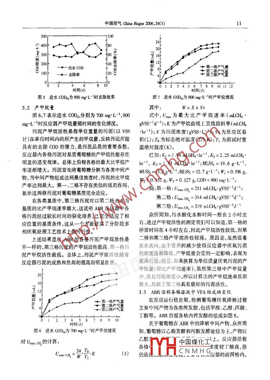 中國(guó)招氣China Biogas 2006,24(1))ABR工藝處理生活污水研究楊琦,尚海濤(中國(guó)地質(zhì)大學(xué)水資源與環(huán)境學(xué)院,北京10083)摘要: 本文對(duì)折流擋板厭氧反應(yīng)器處理生活污水進(jìn)行了研究。反應(yīng)器沿流向分為三格,實(shí)驗(yàn)溫度為25 C,水力停留時(shí)間12小時(shí),pH在7~7.6。實(shí)驗(yàn)結(jié)果表明:COD的去除率可維持在70%左右,產(chǎn)氣主要含有甲烷、二氧化碳和氫氣,每格最大產(chǎn)甲烷活性依次為211 mLCH.*g5S-'d-,314 mLCH4 . gVSS-'d-',319 mLCH.gVSS-'d-';出水產(chǎn)物為乙酸和丙酸;每格優(yōu)勢(shì)菌種依次為桿菌球菌甲烷絲狀菌和甲烷八疊球菌。填料掛膜量(濕重)沿著流向逐漸降低,平均為4.27 g"cm~3。關(guān)鍵詞:厭氧擋板反應(yīng)器;產(chǎn)甲浣活性;生活污水中圖分類號(hào): S216.4; X703文獻(xiàn)標(biāo)識(shí)碼: A文章編號(hào): 1000 - 1662006)01 - 090 - 06The Study oo Anaerobic BaMed Reactor Treating Municipal Wastewater / YANG Qi, SHANG Hai-ta0/(School of waterResources & Environment, Chnina University of Gesienees, Beijing 10083, China)Ahstract: In this study the anaerobic bafled reactor (ABR) was used to treat municipal wastcwater. ABR was separated to threesequential urits, and worked at the condition of pH 7.0~ 7.6, lemperature 25 C, HRT 12 h, and glucose as substrate. The re-sults indicated: COD renoral eficiency could remain at 70% , the product gas was mainly composed of methanc, carbon dioxideand hyrogen, the maximal methane producing acininy senuenially were 211 mLCH *gVSS-'d-' ,314 mLCH."gVSS-ld-1 ,319mLCH, . gVSS ~'d-1 ;The main components of efluent were acctic acid uand propanoic acid; The dominant microrguisus sequen-tally were Bailus,Cocus ,Methanothrix and Methanosaet. The mass of allached bio- menbrane decreased along the flow, andthe avenge mass o atached bio membrane in terms of wet weight was 4.27 g*cm~ 3 .Key words; Anaerobic bafled reactor; Methane producing activity; Municipal wastewater污泥以葡萄糖為基質(zhì)條件下的產(chǎn)甲烷活性,以及污1前言泥對(duì)不同基質(zhì)條件下所表現(xiàn)出來(lái)的產(chǎn)甲烷活性的區(qū)城市生活污水的處理方法有很多種,生物處理別,探討ABR反應(yīng)器處理生活污水的可能性。同時(shí)法以其運(yùn)行管理費(fèi)用低廉及較好的處理效果,在污對(duì)厭氧反應(yīng)器掛膜生物量進(jìn)行了考察。水(尤其是生活污水)處理領(lǐng)域中一直占主導(dǎo)地位。2研究方法,ABR反應(yīng)器具有許多獨(dú)特的優(yōu)點(diǎn),如結(jié)構(gòu)簡(jiǎn)單,系統(tǒng)的穩(wěn)定性好,耐沖擊負(fù)荷,出水水質(zhì)好等,但國(guó)內(nèi)2.1 試驗(yàn)工藝流程外對(duì)ABR反應(yīng)器處理生活污水的研究較少。此外,ABR反應(yīng)器裝置如圖1所示。反應(yīng)器的制作材對(duì)于反應(yīng)器的構(gòu)造,工藝流程,設(shè)計(jì)參數(shù),運(yùn)行控制料為有機(jī)玻璃,反應(yīng)器有效容積為218.5L,平分為3參數(shù)等方面的研究還有待于深人。特別是ABR反格,反應(yīng)區(qū)填充一種稱為三維立體蟬窩狀填料的介應(yīng)器所特有的推流式特性,以及由此所引起的微生質(zhì)。為便于試驗(yàn)操作,反應(yīng)器蓋板未與反應(yīng)器粘合。物分相特性的研究尚屬空白。因此,研究反應(yīng)器內(nèi)當(dāng)需要測(cè)定氣體產(chǎn)量時(shí),可用玻璃膠將蓋板與反應(yīng)部微生物相的生態(tài)分布,種群演變,代謝活性等,已器密封為- -體。進(jìn)水由蠕動(dòng)泵注人反應(yīng)器,以折流成為一個(gè)有待解決的重要課題。同時(shí),這方面的研方式通過(guò)反應(yīng)區(qū),原水中的有機(jī)物被填料上的生物究也有助于加深對(duì)厭氧降解機(jī)理的認(rèn)識(shí)。膜在厭氧條件下水解酸化、產(chǎn)甲烷。本文通過(guò)研究ABR反應(yīng)器處理生活污水沿程2.2試驗(yàn) 基質(zhì)各類揮發(fā)酸(VFA)組成變化,產(chǎn)氣組成的變化,每格中國(guó)煤化工D濃度:300 mg*fYHCNMHG收稿日期: 2005-07-19修回日期: 205-11-20作者簡(jiǎn)介:楊琦(1966- ),男,刪教授,主要從事水污染防治研究。Fiail:;q@ cugb. edu.cn10中國(guó)沼氣China Biogas 2006,24(1)熱導(dǎo)池(TCD)。揮發(fā)性有機(jī)酸:檢測(cè)項(xiàng)目包括乙酸、進(jìn)水出水丙酸、丁酸,所用的儀器為北京分析儀器廠的SP -2305A型氣相色譜儀檢測(cè)器為FID。填料層.3結(jié)果與討論3.1 COD 去除效果污泥床圖2,3,4,5表示反應(yīng)器運(yùn)行穩(wěn)定后,在水力停圖1 ABR 反應(yīng)器裝置示意圖留時(shí)間12小時(shí)條件下,連續(xù)運(yùn)行期間監(jiān)測(cè)的有機(jī)物L(fēng)-' ,500 mg:L-1,700 mg"L', 900 mg.L-'其水質(zhì)見(jiàn)去除情況。即當(dāng)進(jìn)水C0Dc分別為300 mg'L-'(污表1,其中主要營(yíng)養(yǎng)元素BOD3:N:P= 200:5:1。所泥負(fù)荷為0.06 kg COD. kgMLSS-'d1),500 mg*L-I有配水均為自來(lái)水。自來(lái)水為地下水,硬度較高,具(污泥負(fù)荷為0. 10 kg COD kgMLSS-+d-I), 700 mg.有較高的鈣鎂離子濃度。因自來(lái)水本身的堿度約L-(污泥負(fù)荷為0.14 kg COD kgMISS-'d-1) ,900 mg250 mg* L'(本實(shí)驗(yàn)中堿度均以碳酸鈣計(jì)),而厭氧(污泥負(fù)荷為0.18 kg C0OD kgMLSS-'d-')時(shí)反工藝要求的堿度-般為1500 mg'L-', 因此,在配水應(yīng)器的去除效率和出水值。當(dāng)COD濃度較低時(shí),其中加入碳酸鈉來(lái)提高堿度,以保證實(shí)驗(yàn)的順利進(jìn)行。處理效率在70% ~ 80%之間,當(dāng)COD濃度較高時(shí),每克碳酸鈉堿
