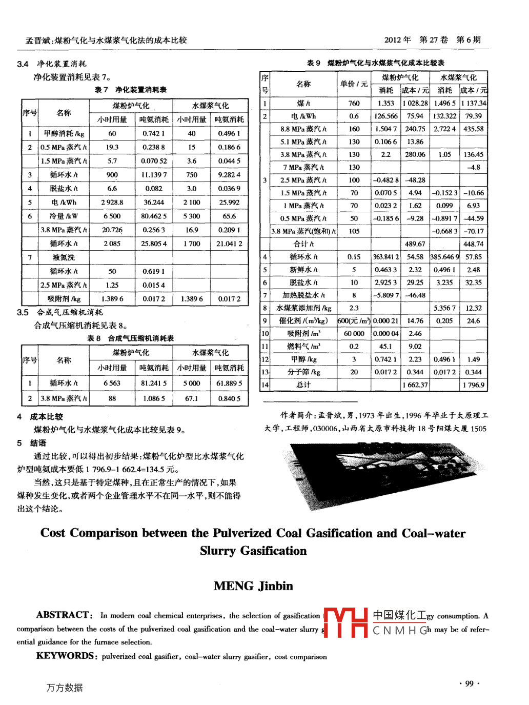 山西科技 SHANXI SCIENCE AND TECHNOLOGY2012年第27卷第6期●百業(yè)科技收稿日期:2012-09-20煤粉氣化與水煤漿氣化法的成本比較孟晉斌(太化集團(tuán)公司焦化廠,山西太原,030006摘要:在現(xiàn)代煤化工企業(yè)中,氣化爐型的選擇對于企業(yè)降低消耗有著重要意義。通過對煤粉氣化與水煤漿氣化兩種爐型生產(chǎn)成本的對比,可以給企業(yè)選擇爐型提供一定的借鑒。關(guān)鍵詞:煤粉氣化爐;水煤漿氣化爐;成本比較中圖分類號:TQ54文獻(xiàn)標(biāo)識碼:A文章編號:1004-6429(2012)060097-04我國是一個產(chǎn)煤、用煤大國,煤炭在我國能源體系中占有重水煤漿氣化工藝是將煤加水磨成質(zhì)量分?jǐn)?shù)為60%-65%的要的地位?,F(xiàn)代煤化工以煤炭為基礎(chǔ)生產(chǎn)重要的化工原料及與水煤漿,用純氧作氣化劑,在高溫高壓下進(jìn)行氣化反應(yīng),氣化壓我們生活密切相關(guān)的化工產(chǎn)品。作為煤化工源頭的氣化方式,對力在3.0MPa-8.5MPa之間,氣化溫度1400℃,液態(tài)排渣,煤氣于煤化工健康有序高效節(jié)能的發(fā)展有著非常重要的作用。為了成分CO+H2占80%左右,不含焦油、酚等有機(jī)物質(zhì),對環(huán)境無污進(jìn)一步降低成本,我們將現(xiàn)階段效率較高的兩種氣化方式(煤粉染,碳轉(zhuǎn)化率為96%-%,氣化強(qiáng)度大,爐子結(jié)構(gòu)簡單,能耗低,爐氣化、水煤漿氣化)做一比較,從而選擇最優(yōu)的一種作為我們運(yùn)轉(zhuǎn)率高,而且煤種適應(yīng)范圍較寬。在今后的氣化方式。1.12缺點(diǎn)1兩種氣化方式的特點(diǎn)水煤漿氣化爐由噴嘴、氣化室、激冷室(或廢熱鍋爐)組成1.1水煤漿氣化爐的優(yōu)缺點(diǎn)其中噴嘴為三通道,工藝氧走一、三通道,水煤漿走二通道,介于1.1.1優(yōu)點(diǎn)兩股氧射流之間。水煤漿氣化噴嘴經(jīng)常面臨噴口磨損的問題,主16m;γ為頂板巖石容重,一般取y=24um3;k為頂板破碎常數(shù),F2=Sq=645×0.28=1806MN=1806kl125-1.5,取14;g為頂板周期來壓不動載系數(shù),與頂板巖石性質(zhì)根據(jù)支護(hù)強(qiáng)度的計(jì)算,結(jié)合本礦井煤層頂?shù)装迩闆r和煤層有關(guān)(老頂級別I:g=11,老頂級別Ⅱ:g=13,老頂級別Ⅲ:=1.5~賦存條件,3-1煤工作面選用zY108002863D型掩護(hù)式液壓支17,老頂級別Ⅳ:g=18-2),本設(shè)計(jì)取=1.8;B為附加阻力系數(shù),架,支撐高度2.8m-6.3m,工作阻力10800kN,推移行程0.865B=16;a為煤層傾角,取a=2°。m,支架中心距175m,支護(hù)強(qiáng)度1.1MPa-1.14MPa,對底板比壓則:3-1煤支護(hù)強(qiáng)度為:248MPa-274MPa;2-1煤工作面選用zY28001023型液壓支g=58×2×1.8×1.6×1037(14-1)cos2°=1.00MPa)架,支架形式為掩護(hù)式,支撐高度10m-2.3m,工作阻力28002-1煤支護(hù)強(qiáng)度為:kN,推移行程0865m,支架中心距1.5m,初撐力2533kN,對底q=1.6×24×18×1.6×103(14-1)cos29=0.28(MPa)板比壓170MPa。342支架初撐力和工作阻力的確定兩層煤支架移架方式均采用國外引進(jìn)電液控制閥并要求與支架初撐力和工作阻力的計(jì)算公式為釆煤機(jī)實(shí)現(xiàn)聯(lián)動能顯示支架工作狀態(tài)和故障情況,具有隨機(jī)操S=A(L+c)作和成組操作功能,移架時長低于10s。支架采用整體頂梁鋼式中:A為支架中心距,3-1煤A=1.75m,2-1煤A=1.50m;性結(jié)構(gòu)。L為支架頂梁長,3-1煤L=4.5m,2-1煤L=40m;c為梁端距,c=4結(jié)論02m-035m,取c=0.3m通過對五陽煤礦礦井液壓支架設(shè)備選型以及液壓支架選型則:3-1煤的支架初撐力:原則的探討,得出結(jié)論:該礦井3-1煤綜采工作面選用ZY10800S3P=A(L+c)=175×(4540.3)=84m228/63D型掩護(hù)式液壓支架,2-1煤綜采工作面選用ZY2800/102-1煤支架初撐力:23型液壓支架。中國煤化工S2=A(L+c)=150×(40+0.3)=645m2CNMHG3-1煤工作阻力:作者簡介:郭鵬,男,1984牛出生,2007平畢業(yè)于長治職業(yè)Fy=Sq=84×1.00=8400MN=8400kN技術(shù)學(xué)院,助理工程師,048100,山西省晉城市2-1煤工作阻力(下轉(zhuǎn)第103頁)97山西科技 SHANXI SCIENCE AND TECHNOLOGY2012年第27卷第6期要是由于水煤漿在較高線速下(約30m/s)對金屬材質(zhì)的沖刷腐表3氨合成裝置蝕。噴嘴、氣化爐激冷環(huán)等為水煤漿氣化的技術(shù)關(guān)鍵。另外水序號裝置名稱主要功能煤漿氣化爐的維修費(fèi)用高。壓縮裝置將合成氣和循環(huán)氣壓力升至氨合成壓力1.13主要設(shè)備合成裝置生產(chǎn)液氨主要設(shè)備包括磨機(jī)、煤漿泵、燒嘴、氣化爐、碳洗塔、激冷環(huán)空分裝置消耗見表4破渣機(jī)、安全及環(huán)??刂蒲b置等。表4空分裝置消耗表1.2粉煤氣化爐(航天爐)的優(yōu)缺點(diǎn)65萬m為空分2×4萬m/h空分序號名稱2.1優(yōu)點(diǎn)小時用量|噸氨消耗小時用量噸氨消耗煤粉氣化為高溫煤氣化,高效節(jié)能,其碳轉(zhuǎn)化率高(≥99%)、88MPa蒸汽A121.61.50472202.7224冷煤氣效率高(≥82%),其有效氣成分高(≥90%);其煤種的適1|3.8MPa蒸汽A05207應(yīng)范圍廣,燃料可以多元化,煤種可以本地化,環(huán)保性能好,排放l.0MPa蒸汽A187002320.099電/kWh的污染物少,具有自主知識產(chǎn)權(quán),工藝成熟可靠,主要設(shè)備全部69495134016.587盾環(huán)水A15720194.5861974324436國產(chǎn)化。122缺點(diǎn)32氣化裝置消耗需將煤磨碎至100目以下,并且需要將煤的水分降到2%,氣化裝置消耗見表5。這兩項(xiàng)都需要比較高的能耗航天爐在國內(nèi)運(yùn)行時間比較短,還表5氣化裝置消耗表沒有形成比較成熟的操作經(jīng)驗(yàn)。名稱煤粉爐氣化水煤漿氣化123主要設(shè)
