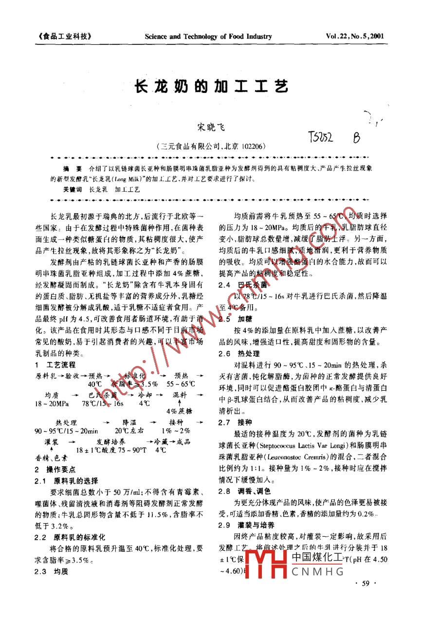 食品工業(yè)科技) Science and Technology of Food IndustryVo.22,No5,200長(zhǎng)龍奶的加工工藝宋曉飛52B(三元食品有限公司,北京102206)摘要介紹了以乳鏈球菌長(zhǎng)亞種和腸膜明串珠菌乳脂亞種為發(fā)酵劑得到的具有粘稠度大、產(chǎn)品產(chǎn)生拉絲現(xiàn)象的新型發(fā)酵乳“長(zhǎng)龍乳(IngM)"的加工工藝,并對(duì)工藝要求進(jìn)行了探討關(guān)鍵詞長(zhǎng)龍乳加L工藝長(zhǎng)龍乳最初源于瑞典的北方,后流行于北歐等均質(zhì)前需將牛乳預(yù)熱至55~65℃,均質(zhì)時(shí)選擇些國(guó)家:由于在發(fā)酵過程中特殊菌種作用,在菌種表的壓力為18-20MPa。均質(zhì)后的牛乳,乳脂肪球直徑面生成一種類似糖蛋白的物質(zhì),其粘稠度很大,使產(chǎn)變小,脂肪球總數(shù)量增減緩了脂肪上浮。另一方面,品產(chǎn)生拉絲現(xiàn)象,故將其形象稱之為“長(zhǎng)龍奶”。均質(zhì)后的牛乳口感細(xì)膩,質(zhì)地滑潤(rùn),更利于營(yíng)養(yǎng)物質(zhì)發(fā)酵劑由產(chǎn)粘的乳鏈球菌長(zhǎng)亞種和產(chǎn)香的腸膜的吸收。均質(zhì)可以增強(qiáng)酪蛋白的水合能力故而可以明串珠菌乳脂亞種組成,加工過程中添加4%蔗糖,提高產(chǎn)品的粘稠度和穩(wěn)定性。經(jīng)發(fā)酵凝固而制成?!伴L(zhǎng)龍奶”除含有牛乳本身固有2.4巴氏殺菌的蛋白質(zhì)、脂肪、無(wú)機(jī)鹽等豐富的營(yíng)養(yǎng)成分外,乳糖經(jīng)以78℃∥15~16s對(duì)牛乳進(jìn)行巴氏殺菌,然后降溫細(xì)菌發(fā)酵被分解成乳酸,適于乳糖不適癥者食用。產(chǎn)至4℃?zhèn)溆?。品最終pH為4.5,可改善食用者腸道環(huán)境,有助于消2.5加糖化。該產(chǎn)品在食用時(shí)其形態(tài)與口感不同于目前市場(chǎng)按4%的添加量在原料乳中加入蔗糖,以改善產(chǎn)常見的酸奶,易于引起消費(fèi)者的興趣,可以豐富市場(chǎng)品的風(fēng)味,增強(qiáng)適口性,提高甜度和固形物的含量。乳制品的種類2.6熱處理1工藝流程對(duì)混料進(jìn)行90-95℃、15-20min的熱處理,殺原料乳→驗(yàn)收→預(yù)熱標(biāo)準(zhǔn)化→預(yù)熱亠滅有害菌鈍化解脂酶,為菌種的正常發(fā)提供良好40℃含脂率≥3.5%55-65℃環(huán)境同時(shí)可以促進(jìn)酪蛋白膠團(tuán)中k酪蛋白與清蛋白巴氏殺菌→冷卻亠混料18-20MPa78℃/15-16s4℃中β乳球蛋白結(jié)合,從而改善產(chǎn)品的粘稠度、減少乳蔗糖清析出熱處理2.7接種9095℃/15-20min20℃左右1%~2%最適的接種溫度為20℃,發(fā)酵劑的菌種為乳鏈香精18:1℃酸度75-90T4→成品灌裝→發(fā)酵培養(yǎng)球菌長(zhǎng)亞種( Steptococcus Lactis Var Longi)和腸膜明串珠菌乳脂亞種( Leuconostoc Crerrris)的混合,二者混合2操作要點(diǎn)比例約為1:1。接種量為1%-2%,接種時(shí)應(yīng)在攪拌2.1原料乳的情況下緩慢加入。要求細(xì)菌總數(shù)小于50萬(wàn)/ml;不得含有青霉素、2.8調(diào)香、調(diào)色噬菌體、殘留清洗液和消毒劑等阻礙發(fā)酵劑正常發(fā)酵為更充分體現(xiàn)產(chǎn)品的風(fēng)味,使產(chǎn)品的色澤更易被接的物質(zhì);牛乳總固形物含量不低于1.5%,含脂率不受,可適當(dāng)添加香精、色素,香精的添加量約為0.2%低于3.2%。2.9灌裝與培養(yǎng)2.2原料乳的標(biāo)準(zhǔn)化因終產(chǎn)品粘度較高,對(duì)灌裝一定影響,故采用后將合格的原料乳預(yù)升溫至40℃,標(biāo)準(zhǔn)化處理,要發(fā)酵工沭處理之后的牛乳講行分裝并于18求含脂率≥3.5%?!?℃保中國(guó)煤化工T(pH在4502.3均質(zhì)4.60CNMHG《食品工業(yè)科技》Science and Technology of Food Industryvol22,No,5,2001l2.10冷藏國(guó)家衛(wèi)生標(biāo)準(zhǔn)。發(fā)酵結(jié)束后應(yīng)立即降溫全4℃左右,避免乳清析4結(jié)論出及后酸化過度。低溫條件下保質(zhì)期約為1周左右。該產(chǎn)品同其它發(fā)酵乳相比,以甜味為主,酸度適3產(chǎn)品質(zhì)量標(biāo)準(zhǔn)中,組織狀態(tài)粘稠,穩(wěn)定性能好,而且加工T藝簡(jiǎn)單,3.1慼官指標(biāo)取用時(shí)粘拉成絲,形象有趣,在食用中凵感幼滑新穎。色澤乳白色;組織狀態(tài)表面亮澤,光滑細(xì)膩,該產(chǎn)品突破了目前市場(chǎng)上酸奶的傳統(tǒng)感受,適合大眾微量乳清析出;口感光滑細(xì)膩酸甜適中,具有純?nèi)榈那笮虑笞冃睦?更適合兒童口味,有很高的市場(chǎng)潛酸菌發(fā)酵酸奶特有的風(fēng)味力32理化指標(biāo)參考文獻(xiàn)蛋白質(zhì)≥2.95%,脂肪含量≥3.5%,pH在4.50460,砷(以As計(jì))≤0.5mg/kg,銅(以Cu計(jì))≤1顧瑞霞主編乳與乳制品的生理功能特性中國(guó)輕工業(yè)出50mg/kg,鉛(以P計(jì))≤1.0mg/kg,食品添加劑按版社,2000GB27608】的規(guī)定2瑞典利樂公司編,乳品手冊(cè),19853.3微生物指標(biāo)3工懷寶主編.奶類食品的營(yíng)養(yǎng).北京師范大學(xué)出版社,1999乳酸菌數(shù)量在10-103個(gè)/ml,其余符合相關(guān)的Komitopoulou, E.Int J Food Sci. Technol., 1999(34)……蝦條、魷魚卷機(jī)、空心面、旺旺雪米餅機(jī)、貝殼酥新民市佩氏膨化機(jī)械研究所機(jī)、泡司機(jī)、80型擠壓機(jī),生產(chǎn)方管、貝殼、薯?xiàng)l、卡迪那、圓圓、直迺車等食品?!厦?、面加工機(jī)械冷面機(jī)、米粉米線機(jī)。專業(yè)生產(chǎn)多功能大中小型膨化機(jī),能生產(chǎn)球型、條型、圊型、梅花型等四十多種花樣產(chǎn)品?;ㄉ?、豆制品加工機(jī)械:地址:遼寧新民市西大街膨化機(j