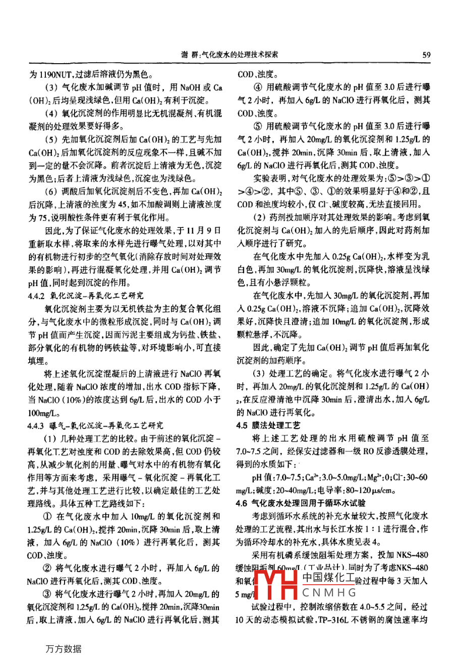 第38卷第3期安徽化工2012年6月ANHUI CHEMICAL INDUSTRYn302357氣化廢水的處理技術(shù)探索謝群(中石化安慶分公司化肥部安徽安慶246001)摘要對氣化裝置廢水進(jìn)行采樣分析,了解現(xiàn)有廢水處理效果。取樣后,在實驗室中進(jìn)行各種實驗分析影響處理因子后,制定廢水處理方案,對氣化裝置廢水處理和利用進(jìn)行初步探索。關(guān)鍵詞:氣化裝置廢水;實驗;處理方案;探索dol:103969isn.1008-553X20203.021中圖分類號:X703文獻(xiàn)標(biāo)識碼:A文章編號:1008-553X(2012)03-0057-041概述31混凝實驗本公司氣化裝置采用殼牌技術(shù)生產(chǎn)合成氣,煤中的用100mL量筒取6個水樣至6個1000mL燒杯碳在高溫下部分氧化反應(yīng)生成以CO和H2為主的氣中投入不同濃度的混凝劑將水樣置于ZR46型混凝體。氣化裝置的廢水經(jīng)混凝沉淀,部分清水內(nèi)部循環(huán)剩實驗攪拌器下?;炷龑嶒灁嚢杵饕?00min的速度攪拌余少量的水進(jìn)行兩級氧化處理。氣化廢水氨氮含量低,30s,150rmin的速度攪拌5min,l80rmin的速度攪拌懸浮物含量高,尤其是對于粒徑極小的粉煤灰,極難去10min。攪拌過程中注意觀察并記錄“礬花”形成的過除此外還含有少量的重金屬。廢水中的CN通過兩級程。攪拌過程完成后停機(jī)靜沉15min,觀察并記錄“礬氧化去除但因處理能力有限,處理后廢水難以達(dá)標(biāo)。為花”沉淀的過程。取上清液約100mL置于6個洗凈的了使氣化廢水處理后的水質(zhì)達(dá)到回用指標(biāo)結(jié)合現(xiàn)有工125mL燒杯中,并分別用濁度儀測出剩余濁度。藝條件,開發(fā)合適的處理工藝。32氧化實驗2實驗部分用500mL量筒取水樣至500mL燒杯中,投入不同21實驗用水濃度的氧化劑,將水樣置于ZR4-6型混凝實驗攪拌器實驗用水為氣化廢水沉淀池進(jìn)出口及污水預(yù)處理下,混凝實驗攪拌器以150mmin的速度攪拌5mn后停裝置第二反應(yīng)池出口的水。機(jī)取水樣100mL,測定其COD22水質(zhì)分析方法4結(jié)果與討論采用電感耦合等離子直讀光譜儀(lCP)、X熒光光41水質(zhì)分析譜和常規(guī)的堿度、硫酸根、氯離子pH等測定方法氨氮現(xiàn)場采樣,采樣點分別為氣化廢水沉淀池進(jìn)口氣化含量采用凱氏定氮法測量化學(xué)需氧量采用國家標(biāo)準(zhǔn)法廢水沉淀池出口以及第二反應(yīng)池出口,具體的水質(zhì)分析(CBI19|4-89)測量。數(shù)據(jù)見表1。表2是對氣化廢水金屬離子的全分析,表33實驗方法是氣化廢水重點考查的幾個水質(zhì)指標(biāo)的分析。表1氣化廢水沉淀池進(jìn)出口水質(zhì)分析結(jié)果時向取樣點電導(dǎo)率氨氮(mg/L)(mg/L)(mg/L)(mg/L)沉淀池進(jìn)口428.108964152768.2225414042080007-02沉淀池出口526212.1428407141.98788155431.367660二反應(yīng)池出口34412022562249825756813.720410484由表1分析數(shù)據(jù)可知,氣化廢水中的懸浮物含量較化學(xué)氧化法處理。堿度較高,其 Langumiur指數(shù)大于高,需經(jīng)適當(dāng)?shù)幕炷恋硖幚?COD含量較高,可采用2.0TH中國煤化工用于工藝用水需進(jìn)CNMHG收稿日期:2012-03-05作者簡介:謝群(1%65-),男,1988年畢業(yè)于撫順石油學(xué)院環(huán)境工程專業(yè),工程師現(xiàn)從事煤化工安全環(huán)保技術(shù)工作,13966626242,056-5376894,總第177期2012年第3期(第38卷)安徽化工表2氣化廢水水質(zhì)分析數(shù)據(jù)單位:mgL指標(biāo)沉淀池進(jìn)口1296<0.051.6580051634<0.05005005<0051.524沉淀池出口00520.99<0.050.05<005<0051306第二反應(yīng)池出日0.328005161640.0514040.05<0.05<005<0051.091指標(biāo)MgPPb沉淀池進(jìn)口18111.154<005<005358006<0.050.1沉淀池出口20562703<005005309.9-0.050073<0.050.218第二反應(yīng)池出口1.871220050567394000058000168表3水質(zhì)分析數(shù)據(jù)COD(mN/L)油量(m/)CN(mg硫化物(mgl調(diào)節(jié)池0939第二反應(yīng)池出口l.10.572含氰廢水出口行除鹽處理后的氣化廢水的COD和濁度均有很大程度的降低,基42混凝實驗本滿足回用要求針對水樣,進(jìn)行初步的混凝篩選實驗(2)復(fù)合氧化劑的比例對處理效果的影響421pH對原廢水濁度的影響對復(fù)合氧化劑的比例D1D2)在pH值為3.0時對氣化廢水的濁度在pH值為1-1的范圍內(nèi)呈現(xiàn)凸COD的降解效果進(jìn)行初步優(yōu)化,由此可確定Dl和D2形提高或降低pH值均可使水的濁度降低但在酸性的用量比例為1:5。范圍內(nèi),氣化廢水的濁度隨著pH值下降的幅度明顯高(3)復(fù)合氧化劑的反應(yīng)時間對處理效果的影響于堿性水的范圍。在pH值為30時,研究了復(fù)合氧化劑的反應(yīng)時間4.2.2不同混凝劑對氣化廢水濁度的影響對COD的降解效果。結(jié)果表明,在60min前COD變化(1)有機(jī)高分子絮凝劑PAM較大,60min后COD變化不大。綜合考慮取反應(yīng)時間在不同pH值條件下,與不加PAM相比,加人PAM為6min對氣化廢水的濁度影響不大。(4)與NaCO氧化效果的比較(2)無機(jī)聚合鋁鹽PAC結(jié)合對氧化出水進(jìn)行混凝處理,比較了復(fù)合氧化劑在不同pH值條件下,與不加PAC相比加人PAC和NaCO氧化的效果。復(fù)合氧化劑的處理效果要明顯對氣化廢水的濁度影響不大好于 NaClo氧化處理的效果。(3)硅藻土43.2復(fù)合氧化-混凝處理在不同pH值條件下,與不加硅藻土相比,加入硅(1)在pH值為100時隨著氧化沉淀劑的濃度增藻土有助于降低氣化廢水的濁度,但降低得有限。加,氣化廢水的濁度降低得越多,處理效果越明顯4)復(fù)合混凝處理(2)不投加氧化沉淀劑,僅調(diào)節(jié)pH至1