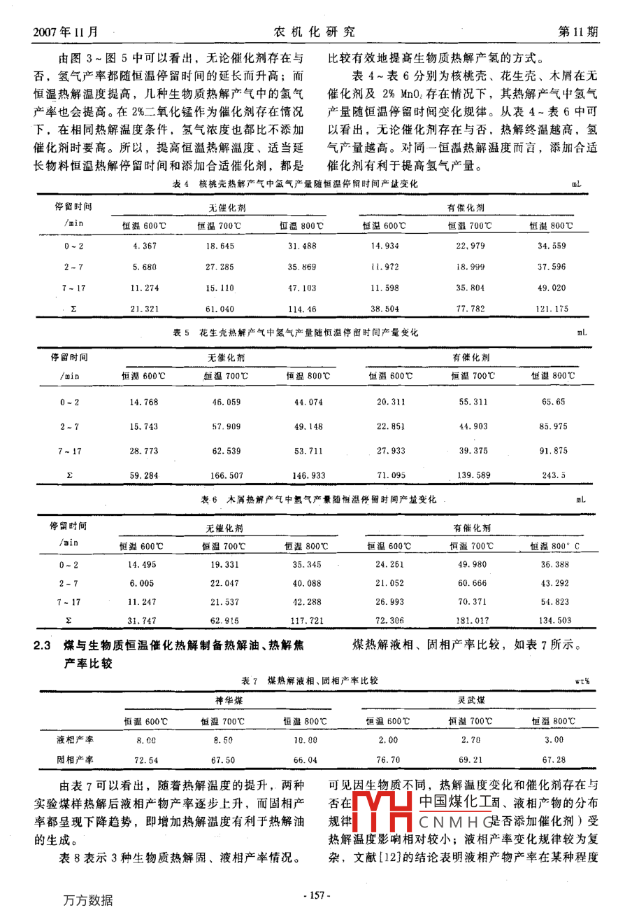 200年1l月農(nóng)機化研究第11期煤與生物質(zhì)恒溫熱解比較研究李鋼,舒新前,畢東東,丁兆軍,張蕾,張磊(中國礦業(yè)大學清潔能源與環(huán)境工程研究所,北京100083)摘要:在實驗室自制固定床熱解反應器中,選擇了兩種煤(神華煤和靈武煤)和3種生物質(zhì)(花生殼核桃殼和木屑〕作為實驗材料,定量化分析比較了恒溫熱解和同溫熱解停留時間對煤與生物質(zhì)熱解產(chǎn)氫及熱解油、熱解焦產(chǎn)率的影響。研究認為:實驗用煤與生物質(zhì)催化熱解表現(xiàn)出基本相同的熱解趨勢,即提高熱解溫度和延長熱解時間(對生物質(zhì)添加合適催化劑)都有利于產(chǎn)氫;對煤而言,提高熱解溫度和延長熱解時間還利于熱解油生成,但對生物質(zhì)而言,效果不很明顯。關鍵詞:農(nóng)業(yè)程;生物質(zhì);試驗;煤;恒溫;熱解;氫氣中圖分類號:S216文獻標識碼:A文章綿號:1003-188X(2007)11-0155—04對恒溫熱解和熱解停留時間對熱解產(chǎn)物影響的定量0引言分析卻不多見。本文主要討論了煤和生物質(zhì)分別在煤是我國最主要的能源,但是長期以直接燃燒600℃,700℃,800℃3個不同恒定溫度下熱解(實利用為主,造成環(huán)境污染??紤]煤所含有的有機組驗開始后,以較髙的升溫速率升至所需溫度后保持分,直接燃燒并不能發(fā)揮其最大潛能,而熱解作為一定時間),研究比較了熱解后產(chǎn)生氫氣的產(chǎn)率、產(chǎn)種煤清潔利用的重要方式可使其產(chǎn)品利用更加有量隨停留時間的變化規(guī)律及熱解油、熱解焦產(chǎn)率分效(因為煤熱解后的產(chǎn)物不但產(chǎn)生含氫可燃氣,還布情況包括熱解油和高活性固體熱解焦)。生物質(zhì)是種可再生資源,其能源化利用亦受到關注,常規(guī)技1實驗概況術有氣化、燃燒和水解等。生物質(zhì)熱解也是一種將選擇神華煤(產(chǎn)地:陜西省神木縣)和靈武煤生物質(zhì)轉(zhuǎn)化為富氦燃料氣的有效轉(zhuǎn)化技術2。(產(chǎn)地:寧夏回族自治區(qū)靈武市)進行試驗。煤樣在對煤和生物質(zhì)的熱解研究中,國內(nèi)外學者目粒度范圍控制在3m左右。工業(yè)分析、元素分析如前對其催化熱解機理、升溫速率影響、混燒方式以表1所示。兩種煤的灰分、硫分較低,屬高揮發(fā)分及反應動力學等已經(jīng)進行了較多地研究-",但是煙煤。表1實驗煤樣的工業(yè)分析和元素分析工業(yè)分析元素分析樣品StdVdafFCd神華煤8,0859,7978.05.0315,76靈武媒6.2434.3661.514.550.7315.39生物質(zhì)選擇核桃殼、花生殼、木屑3種農(nóng)林廢種樣品的水分,都在5%左右。但是灰分則有較大差棄物為原料進行熱解。實驗前對各實驗樣品進行破別,木屑灰分僅1%左右,花生殼3.73%,花生殼灰碎,然后進行預篩分。核桃殼、花生殼粒度范圍控分則高達10%;揮發(fā)分總體較高,都在60%以上。制在3~5mm,木屑粒度范圍控制在0.5~1.0m。核實驗在固定床熱解反應管式爐密閉環(huán)境下進桃殼、花生殼、木屑的工業(yè)分析結(jié)果如表2所示。3行熱解。所有實驗物料統(tǒng)一為20g。具體實驗流程收稿日期:2007-02-26可參考文獻[12,13]。氣體分析裝置為SP2100型氣基金項目:國家自然科學基金重大研究計劃項目(9061004);北相色V凵中國煤化工京市教委重點學科資助項目(XK102900477)作者簡介:李鋼(1978-),男,河北唐山人,博士生,(E-mai1CNMHG載氣:氦氣、氮氣,流速30mL/m通訊作者:舒新前),男,陜西城固人,教授,博士生導師標氣:49.20%H2,14.90%CH4,14.90%c0(e-Mail)shuxinqian@126.com2007年11月農(nóng)機化研究第l1期0.00%C02,0.98%C2H氣產(chǎn)量隨恒溫停留時間的變化色譜柱:GDX502,內(nèi)徑3mm,柱長為5m填充柱600℃-700℃800℃5A分子篩,內(nèi)徑3m,柱長3m填充柱柱箱溫度℃/:70進樣器/℃:100TCD/℃:10橋流/mA:174熱絲/℃停留時間/min色譜柱在運行一段時間后進行活化。圖1神華煤熱解產(chǎn)氣中氫氣產(chǎn)率隨恒溫停留時間變化規(guī)律表2實驗生物質(zhì)樣品的工業(yè)分析wt%60600℃-700℃800℃樣品水分(Mad)灰分(Ad)揮發(fā)分(vdaf)40核桃殼花生殼62.95木屑4.38L.184.35本文中所提到的催化劑指占試驗物料質(zhì)量的MnO2,在進行催化熱解實驗時,催化劑必須均勻停留時間/min地分散在實驗樣品中。圖2靈武煤熱解產(chǎn)氣中氫氣產(chǎn)率隨恒溫停留時間變化規(guī)律從圖1和圖2中可以看出,兩種實驗煤樣表現(xiàn)2實驗結(jié)果分析出相同的熱解趨勢,即恒定熱解溫度提高和在同21氫氣產(chǎn)率、產(chǎn)量隨物料恒溫停留時間的變化恒定熱解溫度下停留時間延長都會有利于氫氣產(chǎn)圖1和圖2分別為神華煤樣與靈武煤樣熱解產(chǎn)生。熱解溫度每升高00℃,則氫氣產(chǎn)率提高10%~氣中氫氣產(chǎn)率隨600℃,700℃,800℃3個恒定溫度20%左右;在恒溫800℃,熱解17min條件下都有最停留時間的變化規(guī)律。表3表示的是熱解產(chǎn)氣中氫大氫氣產(chǎn)量,分別是369.886m和389.233mL表3煤熱解產(chǎn)氣中氫氣產(chǎn)量隨恒溫停留時間產(chǎn)量變化停留時間神華煤靈武煤恒溫600℃恒溫700℃恒溫800℃恒溫600℃恒溫700℃恒溫800℃12966.29297,956120.13728,56595.243132.5726.049281.007369.886240.929389,23322生物質(zhì)熱解后氫氣產(chǎn)率、產(chǎn)量隨物料恒溫停留-700℃-600℃加催化劑700℃加催化劑800℃加催化劑時間的變化圖3-圖5分別是核桃殼、花生殼、木屑在無催化劑及2%的n02存在的情況下,熱解產(chǎn)氣中氫氣產(chǎn)率隨恒溫停留時間的變化規(guī)律?!?00℃停