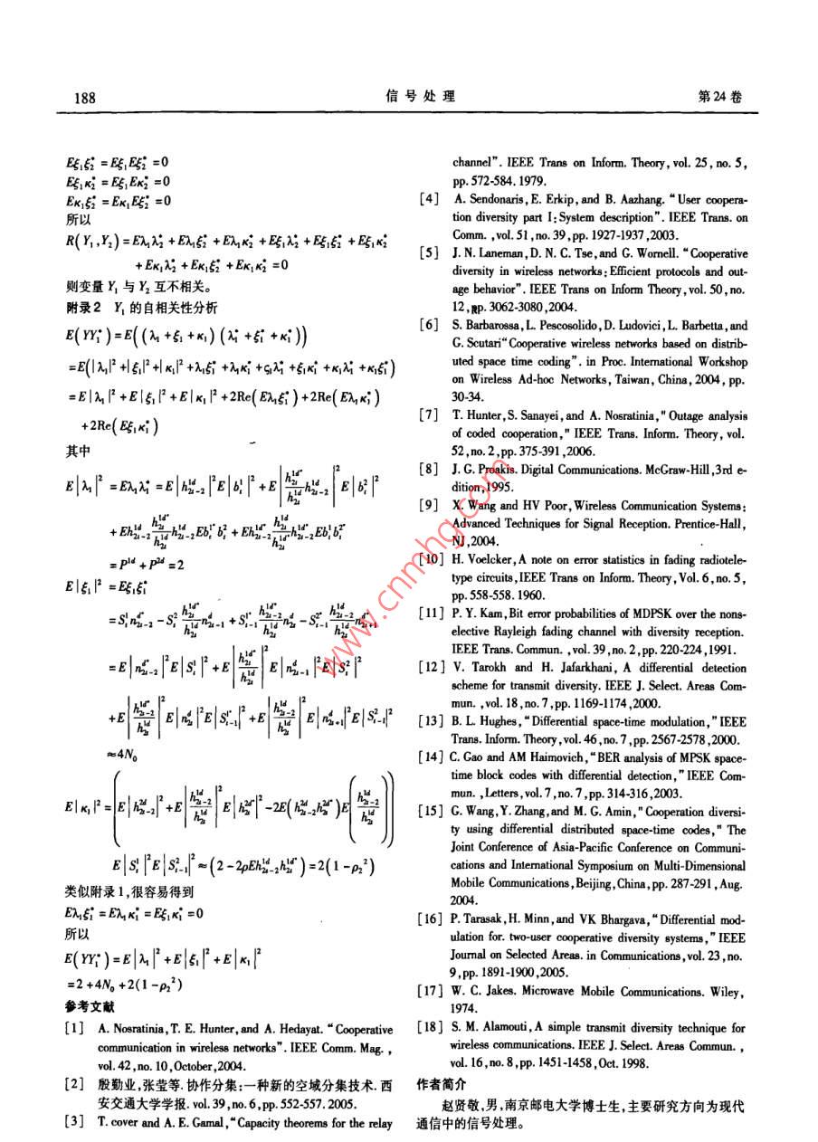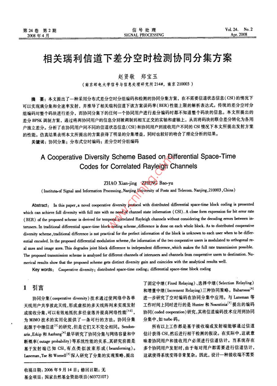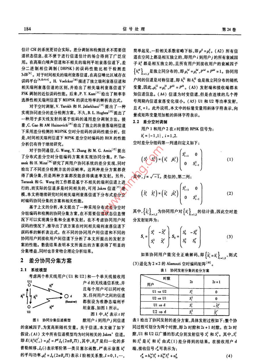 第24卷第2期信號(hào)處理Vol 24. No. 22008年4月SIGNAL PROCESSINGApr. 2008相關(guān)瑞利信道下差分空時(shí)檢測(cè)協(xié)同分集方案趙賢敬鄭寶玉(南京郵電大學(xué)信號(hào)與信息處理研究所214#,南京210003)要:本文提出了一種采用分布式差分空時(shí)分組編碼和檢測(cè)的協(xié)同分集方案,在不需要信道狀態(tài)信息(CS1)的情況下可以實(shí)現(xiàn)滿分集和全速率發(fā)射,并推導(dǎo)了相關(guān)瑞利信道下該方案誤碼率(BER)性能上限的解析表達(dá)式。傳統(tǒng)的差分空時(shí)分組編碼對(duì)整個(gè)碼塊進(jìn)行差分,而協(xié)同分集下的任何一個(gè)協(xié)同用戶進(jìn)行差分編碼時(shí)都不知道整個(gè)碼塊的信息。本文所提出的差分BPSK調(diào)制方案,通過(guò)將兩協(xié)同用戶的信息分別被調(diào)制到相互正交的實(shí)軸和虛軸上,從而將碼塊的聯(lián)合差分轉(zhuǎn)化為各用戶獨(dú)立差分。分析了在協(xié)同用戶間不同的信道狀態(tài)信息(CS)和協(xié)同用戶到接收用戶不同的CS情況下本文所提出發(fā)射方案的性能。仿真結(jié)果表明本文所提出的方案獲得了明顯的分集增益,同時(shí)也較好的吻合了理論分析的結(jié)果。關(guān)鍵詞:協(xié)同分集;分布式空時(shí)編碼;差分空時(shí)分組編碼A Cooperative Diversity Scheme Based on Differential Space-TimeCodes for Correlated Rayleigh ChannelsZHAO Xian-jing ZHENG Bao-yuInstitute of Signal and Information Processing, Nanjing University of Posts and Telecom. Nanjing, 210003, ChinaAbstract: In this paper, a novel cooperative diversity protocol with distributed differential space-time block coding is presentedhich can achieve full diversity with full rate with no need of channel state information( CSI). A close form expression for bit error rate(BEr)of the proposed scheme is derived for temporal correlated Rayleigh channele without considering the decoding errors between in-terusers. In traditional differential space-time block coding scheme, difference is done on each whole block. As to distributed cooperativediversity scheme, traditional difference is not practical for the perfect information of the block is unknown to each user when to be differ-ential encoded In the proposed differential modulation scheme, the information of the two cooperative users is modulated to orthogonal re-al axes and image axes. This degrades joint block difference to independent difference, which makes the full rate transmission possibleThe proposed transmission scheme is analyzed for different channels of interusers and channels from cooperative users to destination. Nu-merical results show that the proposed scheme gets distinct diversity gain and coincides with the analytical results wellKey words: Cooperative diversity; distributed space-time coding; differential space-time block coding了固定中繼( Fixed Relaying)、選擇中繼( Selection Relaying)1引言和增量中繼( Increment Relaying)三種協(xié)同策略。 Babaross協(xié)同分集( cooperative diversity)技術(shù)通過(guò)使網(wǎng)絡(luò)中各單進(jìn)一步研究了空時(shí)編碼在協(xié)同分集中應(yīng)用。與 Laneman等天線用戶共享彼此天線形成虛擬的多天線陣列來(lái)實(shí)現(xiàn)發(fā)射工作時(shí)間上同時(shí)進(jìn)行的是 Hunter和 nosratinia)提是出的編碼或接收分集,可以有效地抵抗多徑衰落并提高網(wǎng)絡(luò)性能3),協(xié)同( coded cooperation)研究其將信道編碼技術(shù)應(yīng)用到協(xié)同為MMo技術(shù)的實(shí)用化提供了一條可行的方法。協(xié)同分集分集中,如 turbo碼。起源于中繼信道的研究但是它們又不完全相同。 Sendon-所有以上工作都是基于接收端或發(fā)射端能夠通過(guò)信道ans,Eip和 aazhang'"最早研究了協(xié)同分集與網(wǎng)絡(luò)容量和中估計(jì)獲得CS然后進(jìn)行相干檢測(cè)的假設(shè)。在實(shí)際中,這就意斷概率( outage probability)等系統(tǒng)性能的關(guān)系,其研究前提是味著協(xié)同用戶和接收用戶必須進(jìn)行信道估計(jì)。當(dāng)系統(tǒng)存在基于發(fā)射端已知CS1,有點(diǎn)類似波束形成( beamforming)。多個(gè)協(xié)同用戶發(fā)射時(shí)由于每對(duì)用戶都需要進(jìn)行信道估計(jì),lateran,Trwe和 Women深人研究了分集的實(shí)現(xiàn)策略提出這就使得系統(tǒng)變得非常復(fù)雜。因此,設(shè)計(jì)一種接收端不需要收稿日期:2006年9月14日;修回日期:無(wú)基金項(xiàng)目:國(guó)家自然基金資助項(xiàng)目(60372107信號(hào)處理第24卷估計(jì)CS的系統(tǒng)更切合實(shí)際。差分調(diào)制和檢測(cè)技術(shù)不需要信簡(jiǎn)單起見(jiàn),階相關(guān)系數(shù)省略下標(biāo)即p=p。(A2)所有信道狀態(tài)信息,在不便于進(jìn)行信道估計(jì)的場(chǎng)合得到了廣泛應(yīng)道在空間上都是相互獨(dú)立的即用戶i到用戶j的所有衰減因用。在高斯白噪聲信道和不相關(guān)的瑞利平坦衰落信道下,差子h都是相互獨(dú)立的,且所有用戶到接收用戶的衰減因子分二進(jìn)制相位調(diào)制( DBPSK)的誤碼性能比相干檢測(cè)差3dB·。對(duì)于時(shí)間相關(guān)的瑞利衰落信道在高信噪比區(qū)域存在{“是獨(dú)立同分布的,即n=P,P=P=1。協(xié)同用誤碼平臺(tái)4。H.Vedk描述了獨(dú)立瑞利衰落信道和戶間的信道是對(duì)稱信道,即2和也是獨(dú)立同分布的隨機(jī)相關(guān)瑞利衰落信道的區(qū)別并給出了相關(guān)瑞利衰落信道下變量因此,p2=p1,P=P。(A3)發(fā)射端和接收端都未FSK調(diào)制